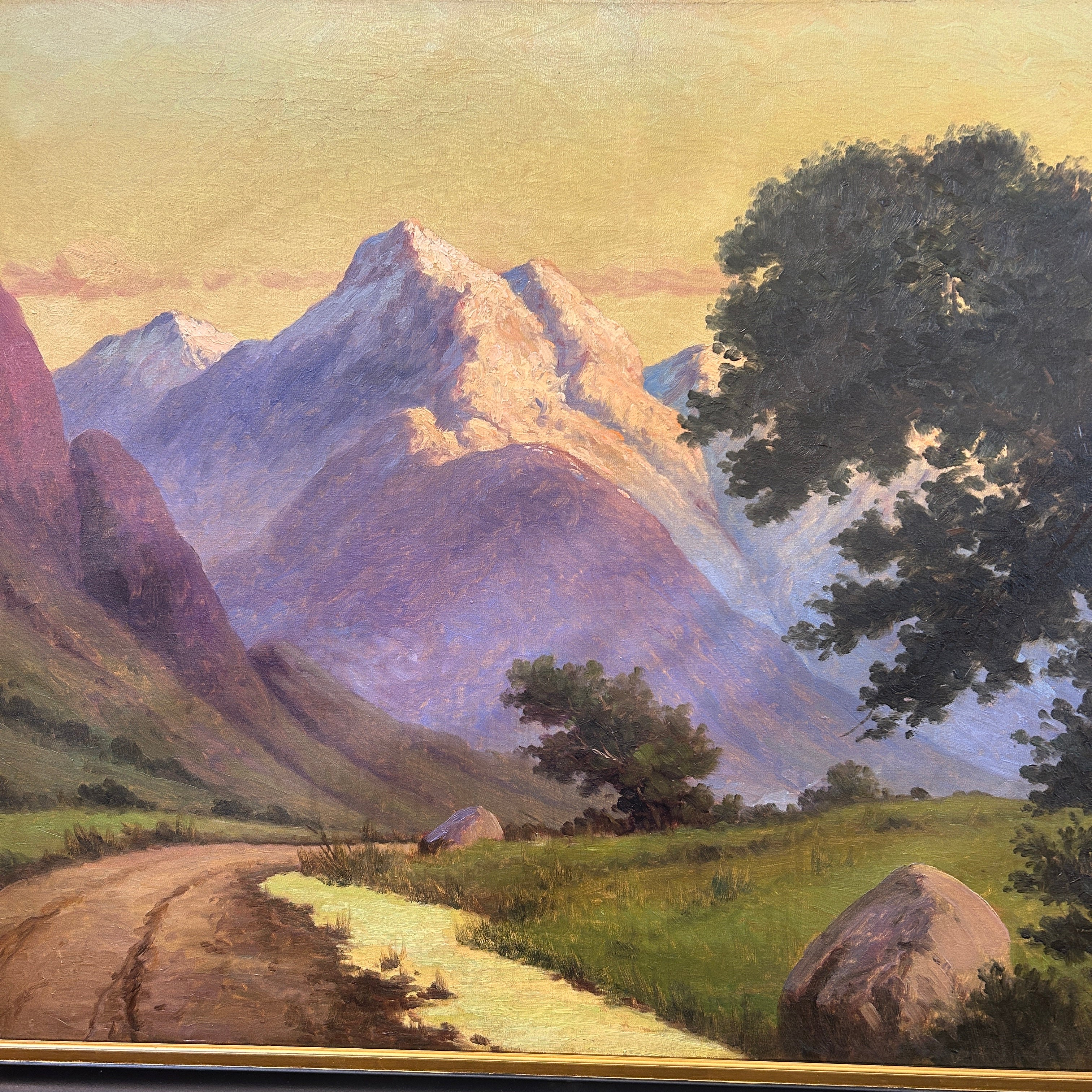 Impresionante y realista pintura del reconocido artista chileno Benito Ramos Catalán. Podemos apreciar un camino rural en dirección a una montaña nevada de la cordillera. El cielo muestra una mezcla de tonos cálidos y fríos que nos evocan las horas crepusculares del día.