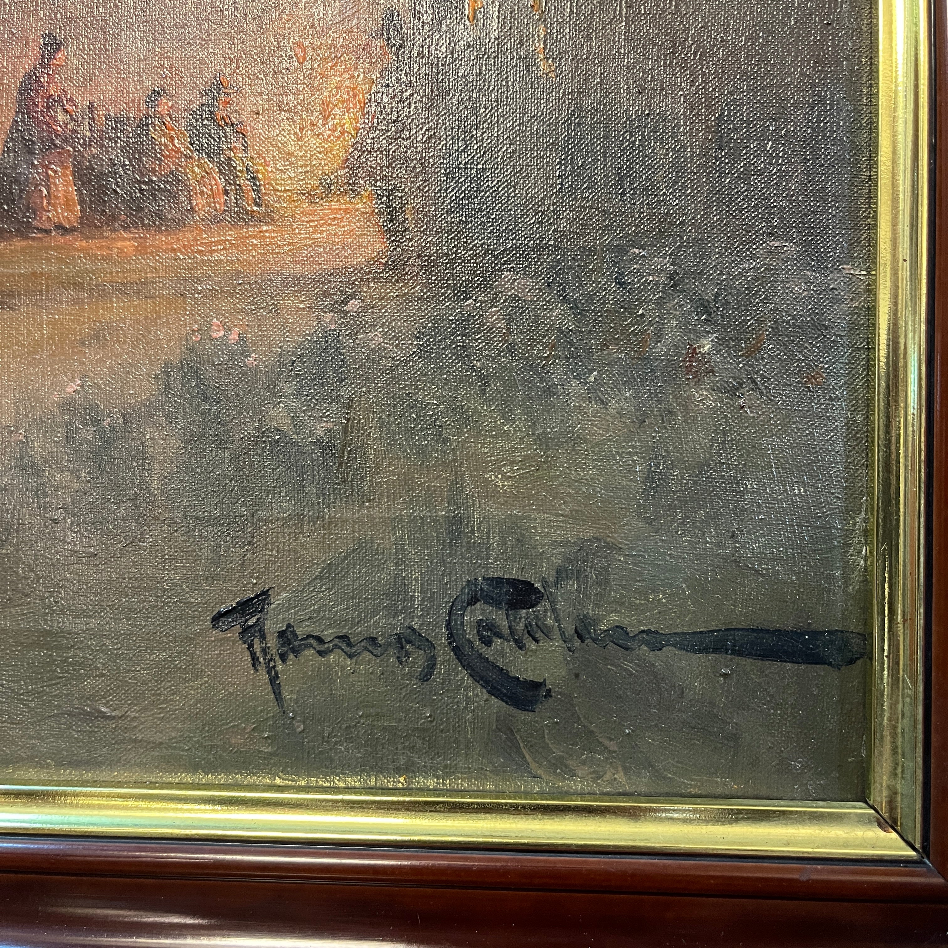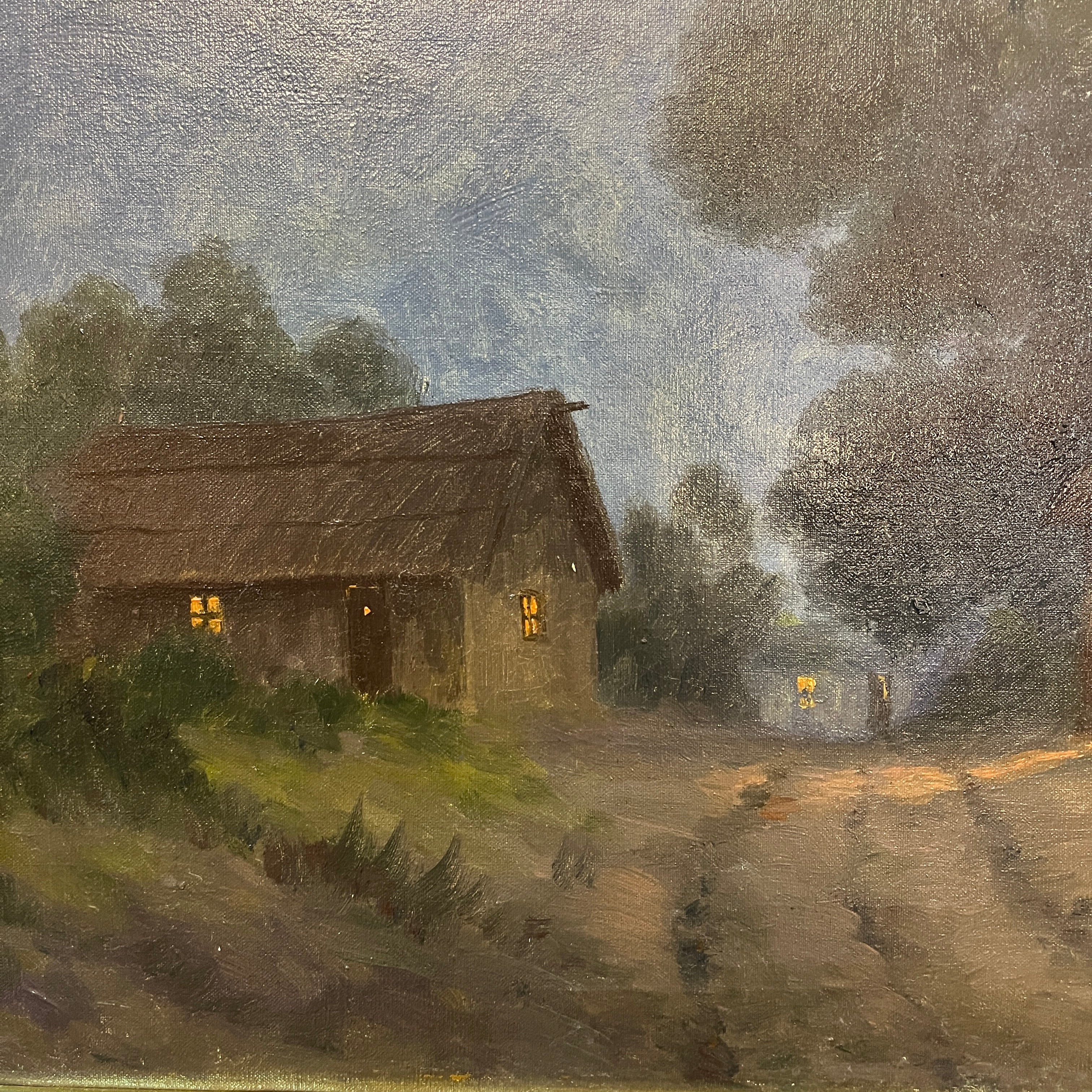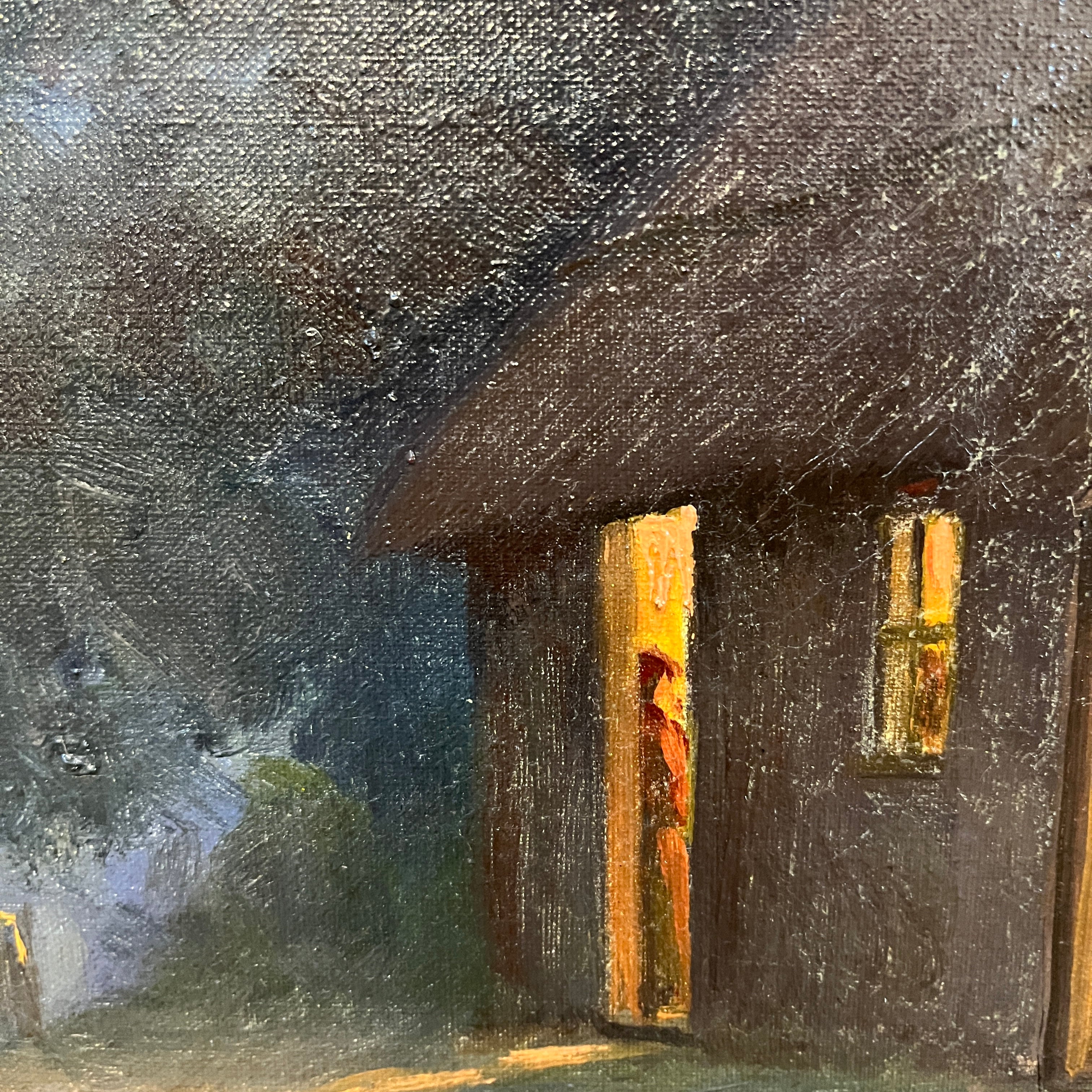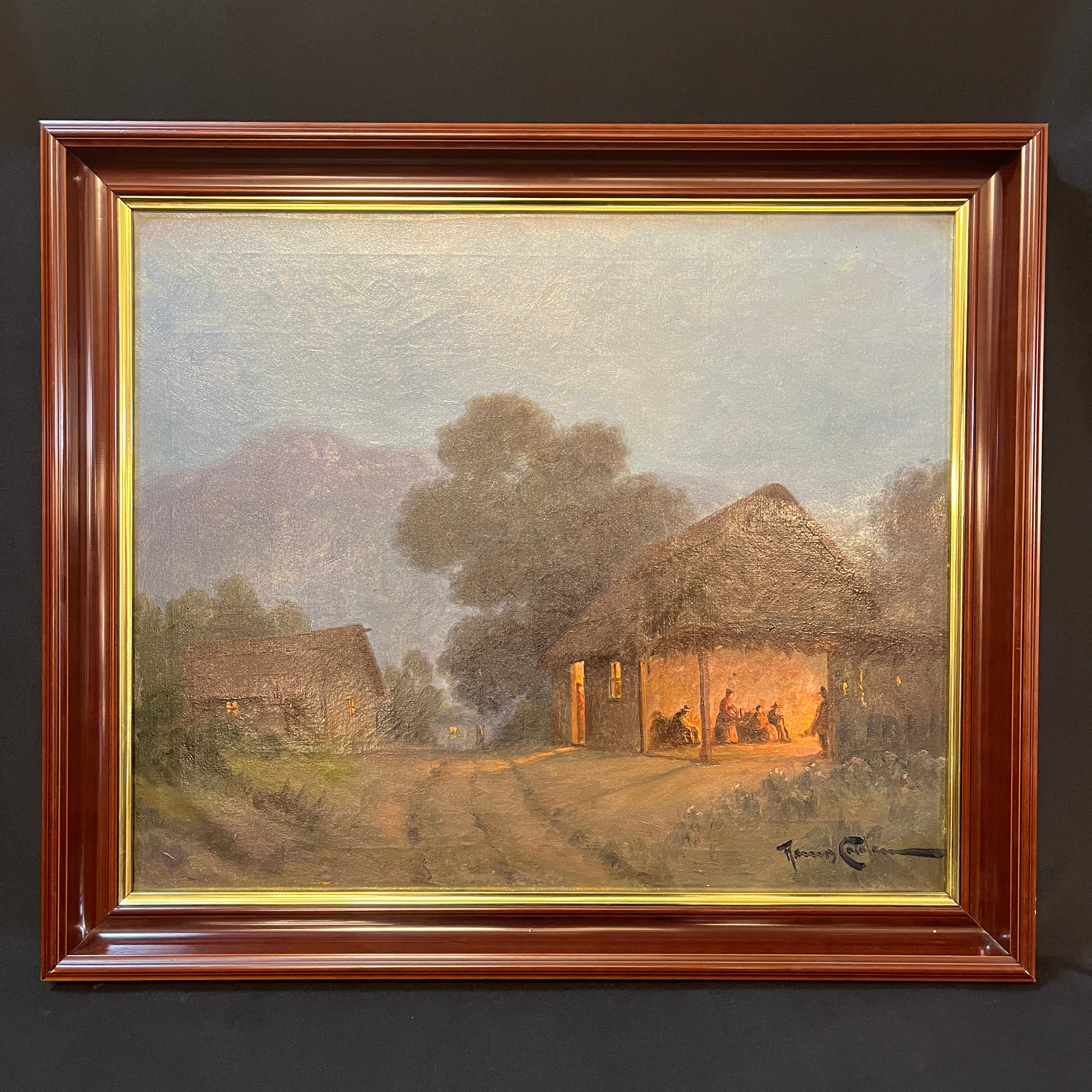 Hermoso paisaje en óleo del reconocido artista chileno Ramos Catalán, nos presenta una rústica casa habitada con hombres y mujeres haciendo fuego en su interior. En el borde de un camino rural de tierra, al fondo podemos ver su querida montaña, la protagonista de gran parte de sus obras. Su afán por retratar escenas del campo chileno de la zona central y, transmitir en sus obrar una serenidad y silencio.