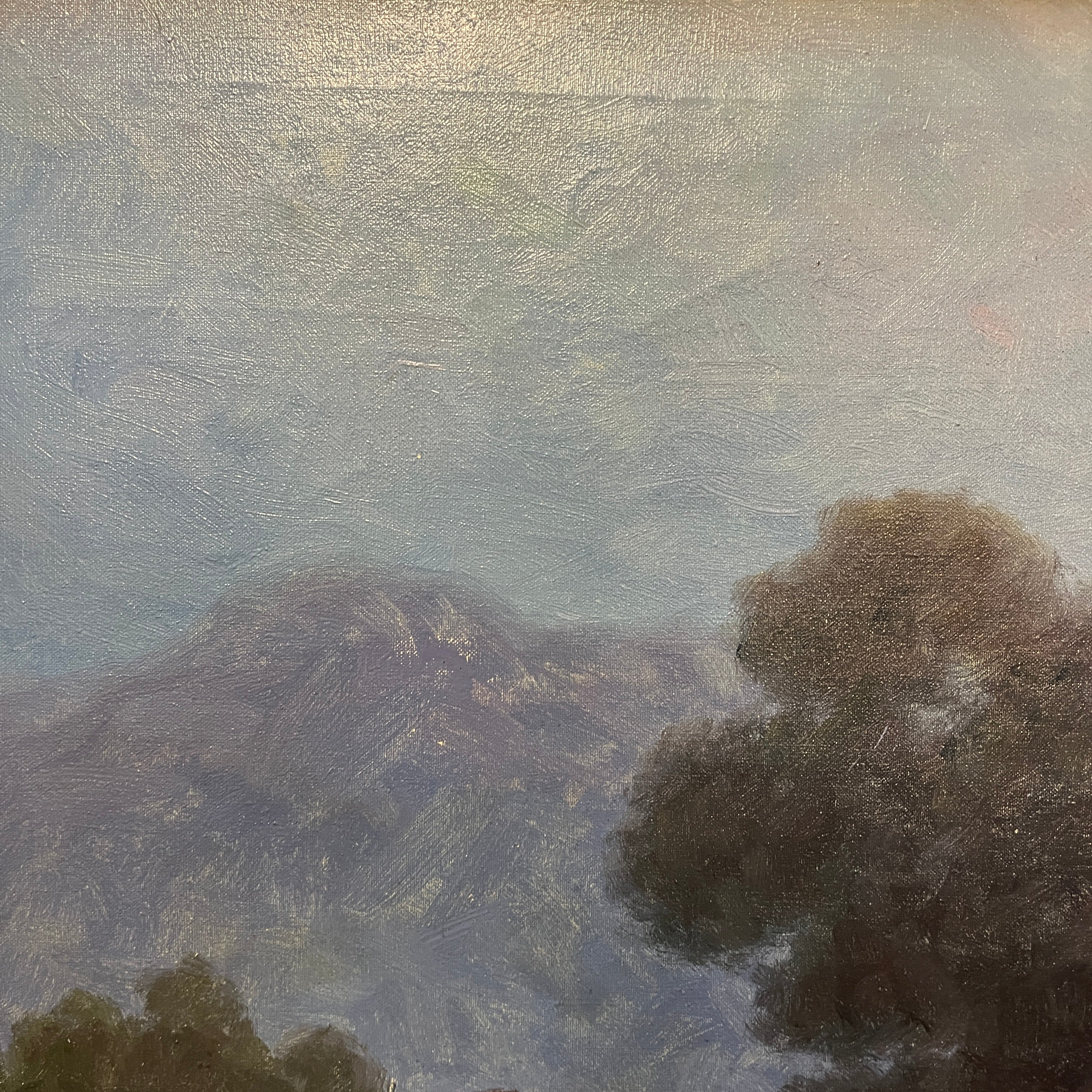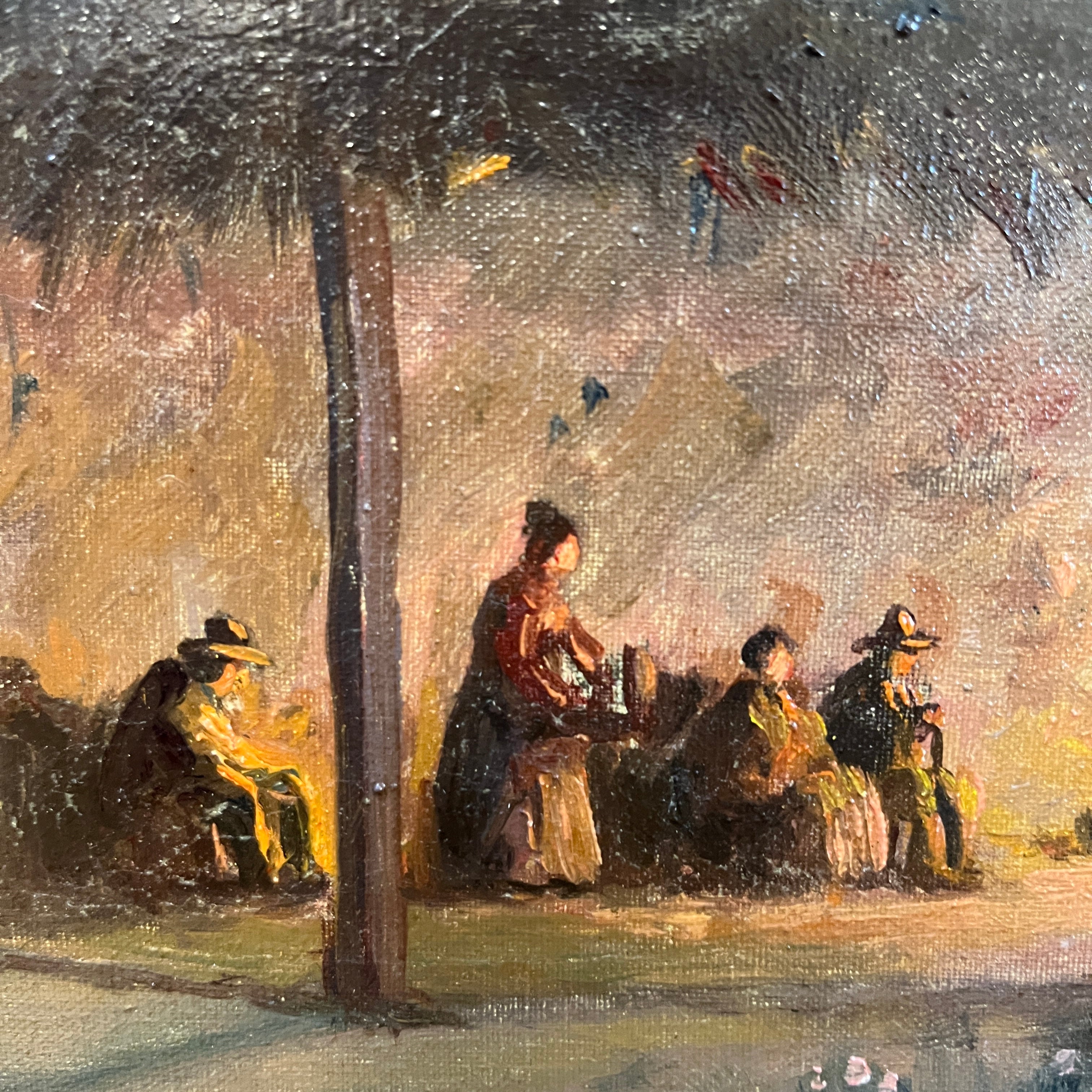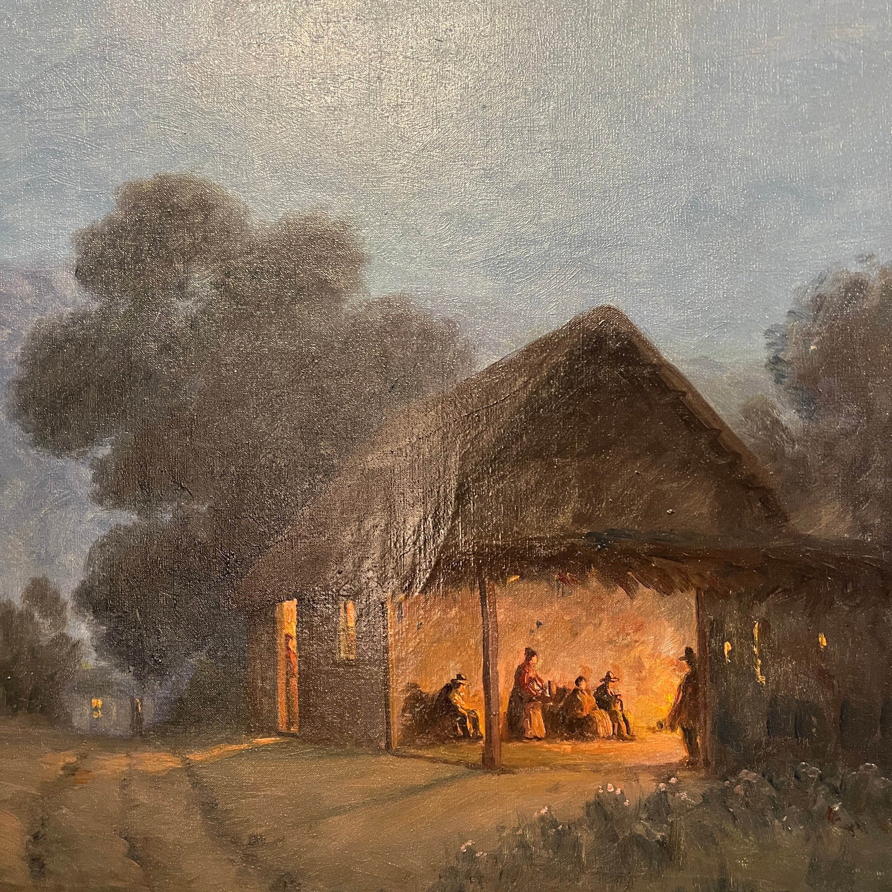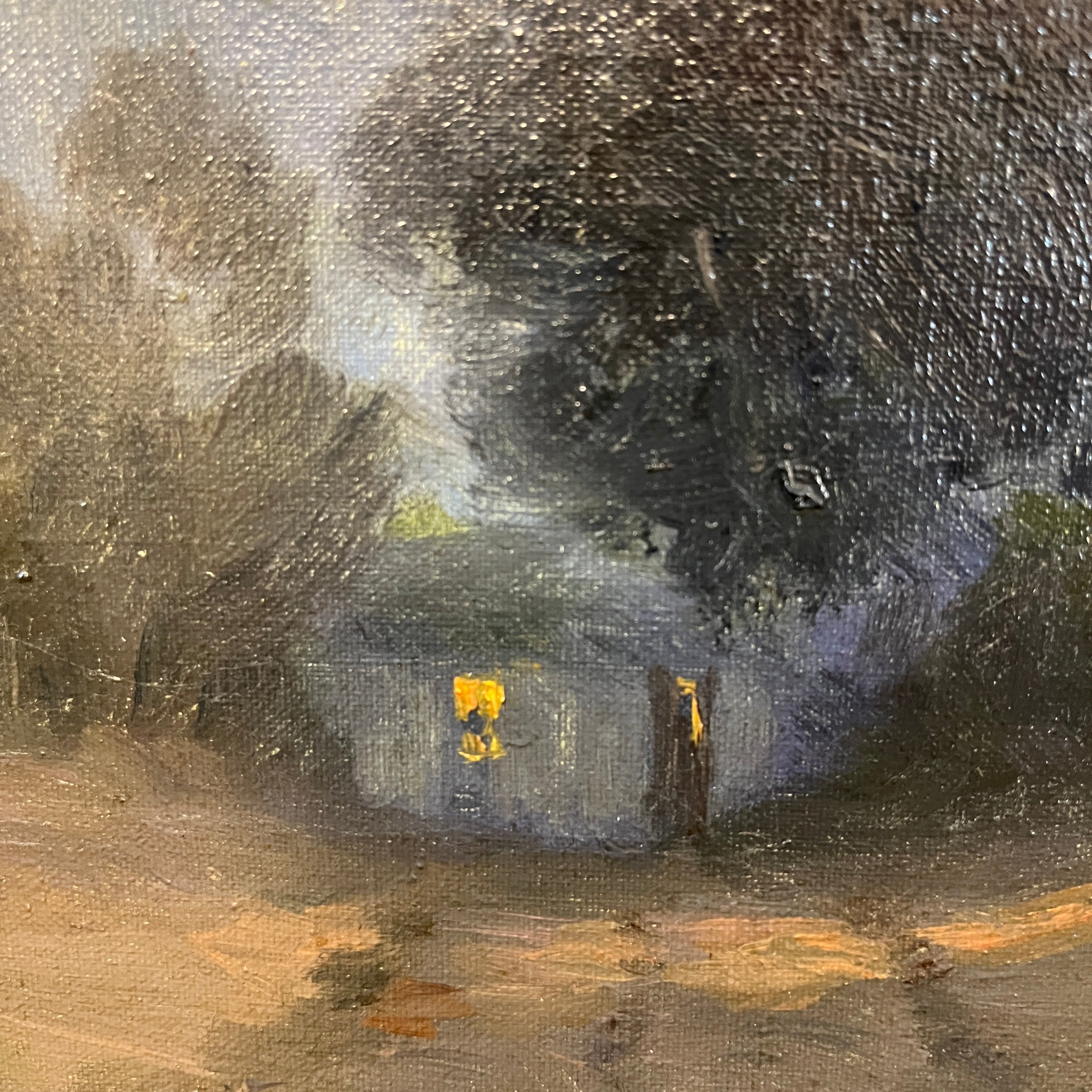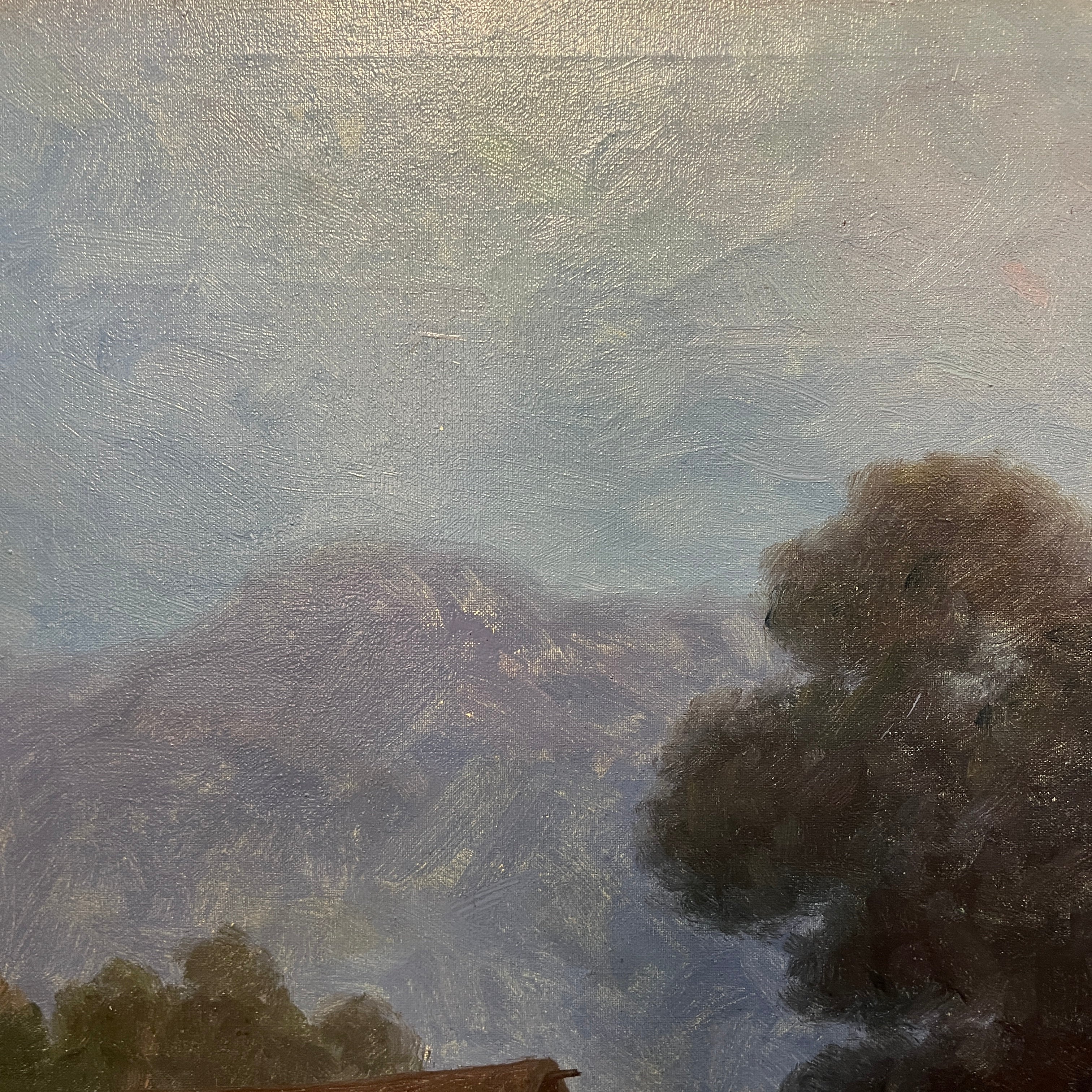Hermoso paisaje en óleo del reconocido artista chileno Ramos Catalán, nos presenta una rústica casa habitada con hombres y mujeres haciendo fuego en su interior. En el borde de un camino rural de tierra, al fondo podemos ver su querida montaña, la protagonista de gran parte de sus obras. Su afán por retratar escenas del campo chileno de la zona central y, transmitir en sus obrar una serenidad y silencio.