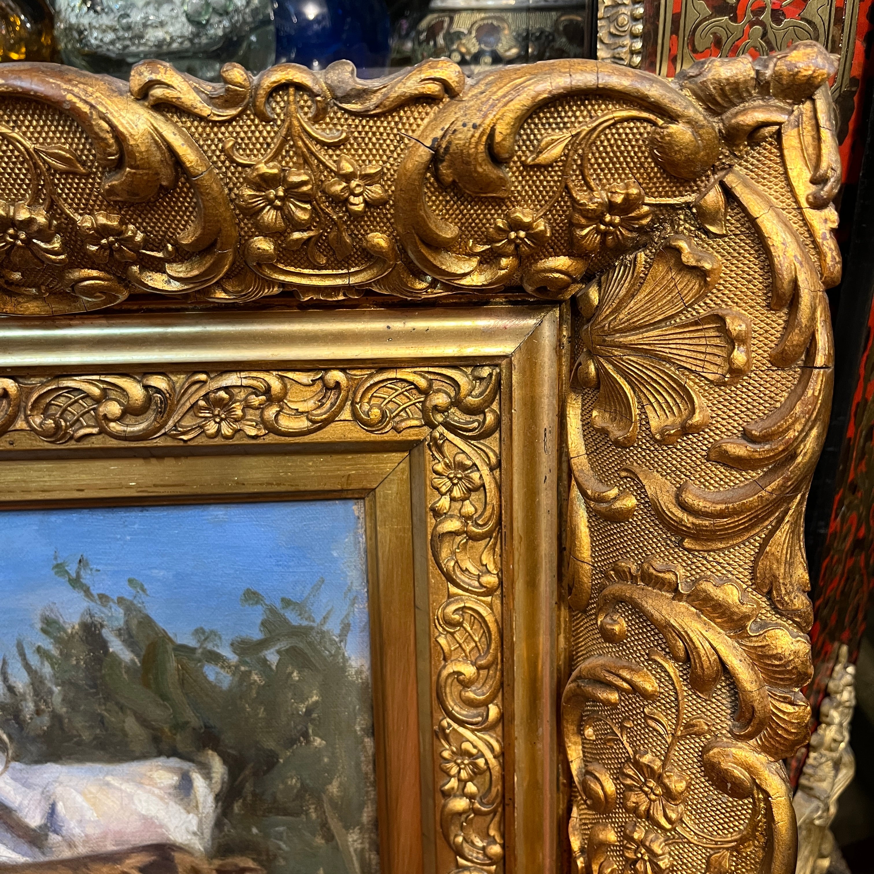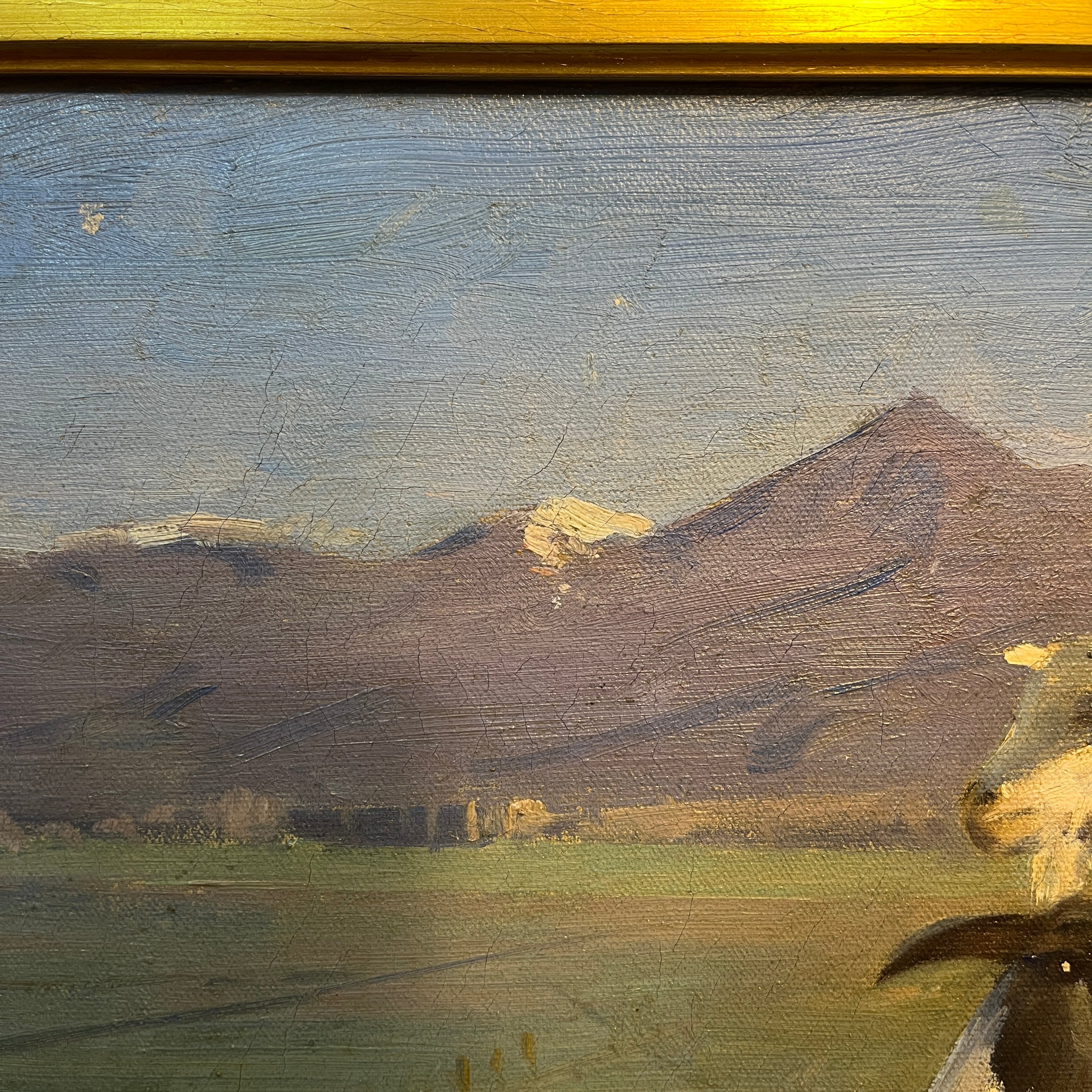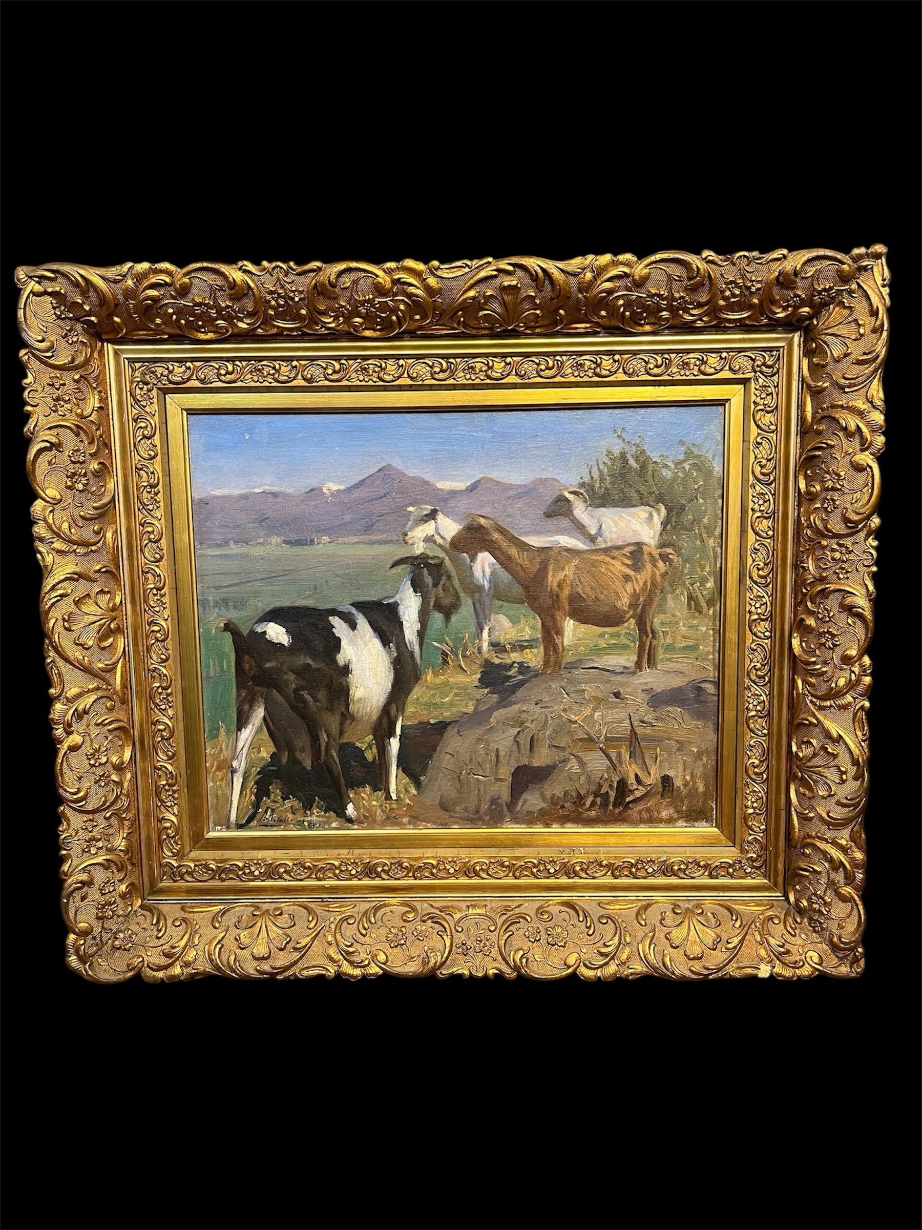 Óleo sobre tela del pintor chileno, premio nacional de Artes 1959, Benito Rebolledo, representando un paisaje rural con cabras, de distinto pelaje, sobre una colina, con un valle y la cordillera de fondo. Originario de Curicó, ciudad en la que vivió hasta su adolescencia, Rebolledo retrató la vida rural, sus paisajes y sus animales. De hecho, la temática de las cabras está presente en varias de sus obras, mostrando una afinidad especial por este animal. La obra está enmarcada en madera tallada con decorados de relieves y terminada de una elegante pintura dorado.
