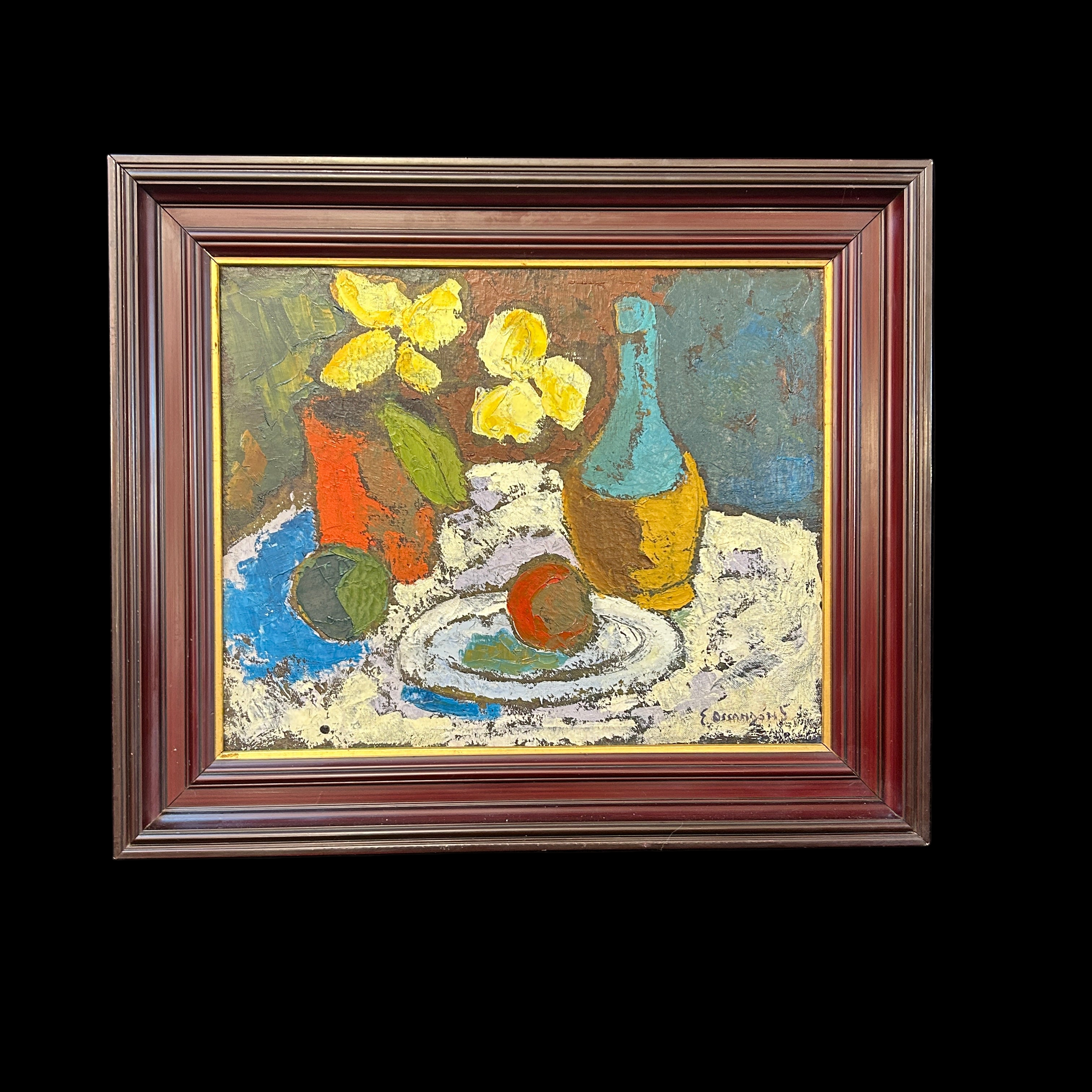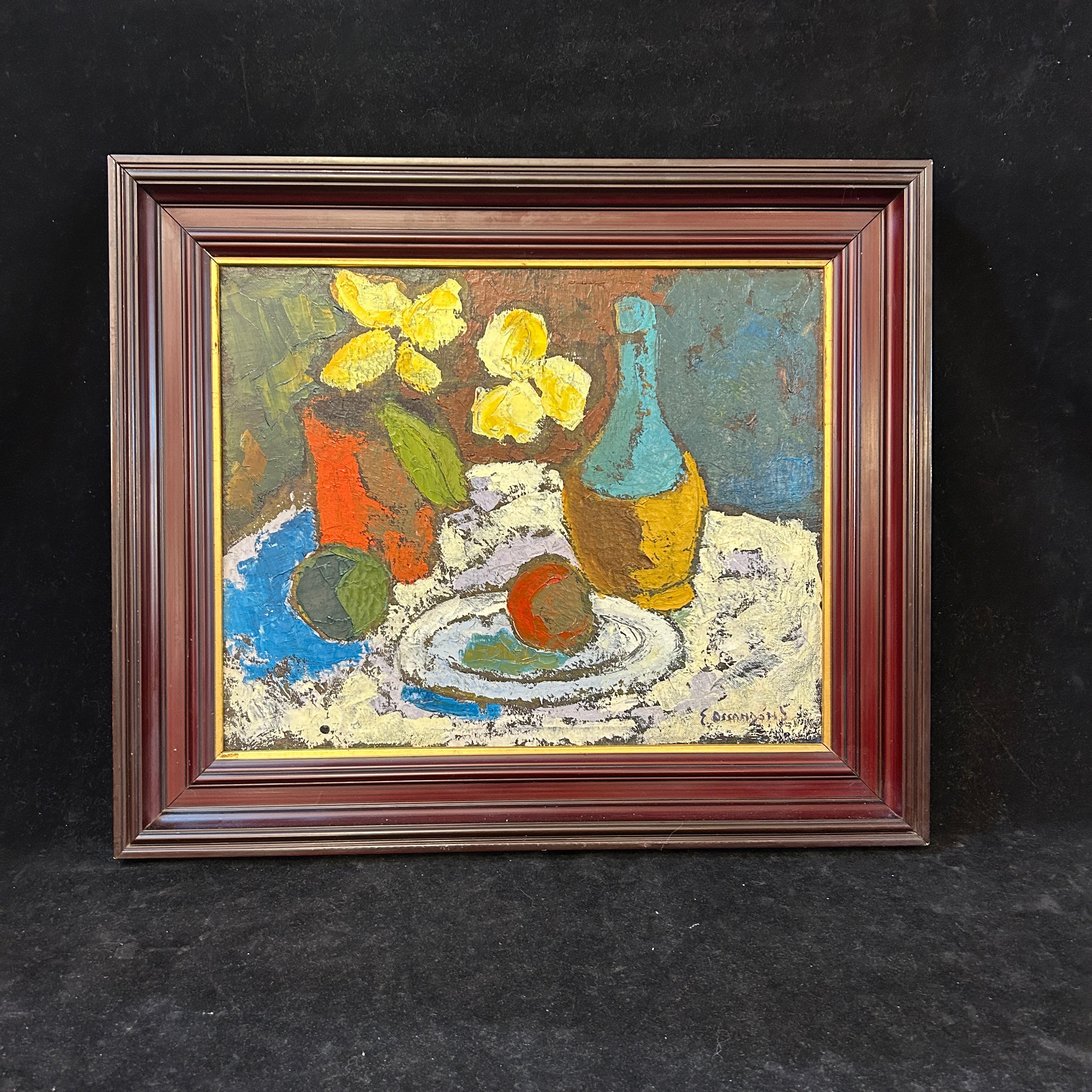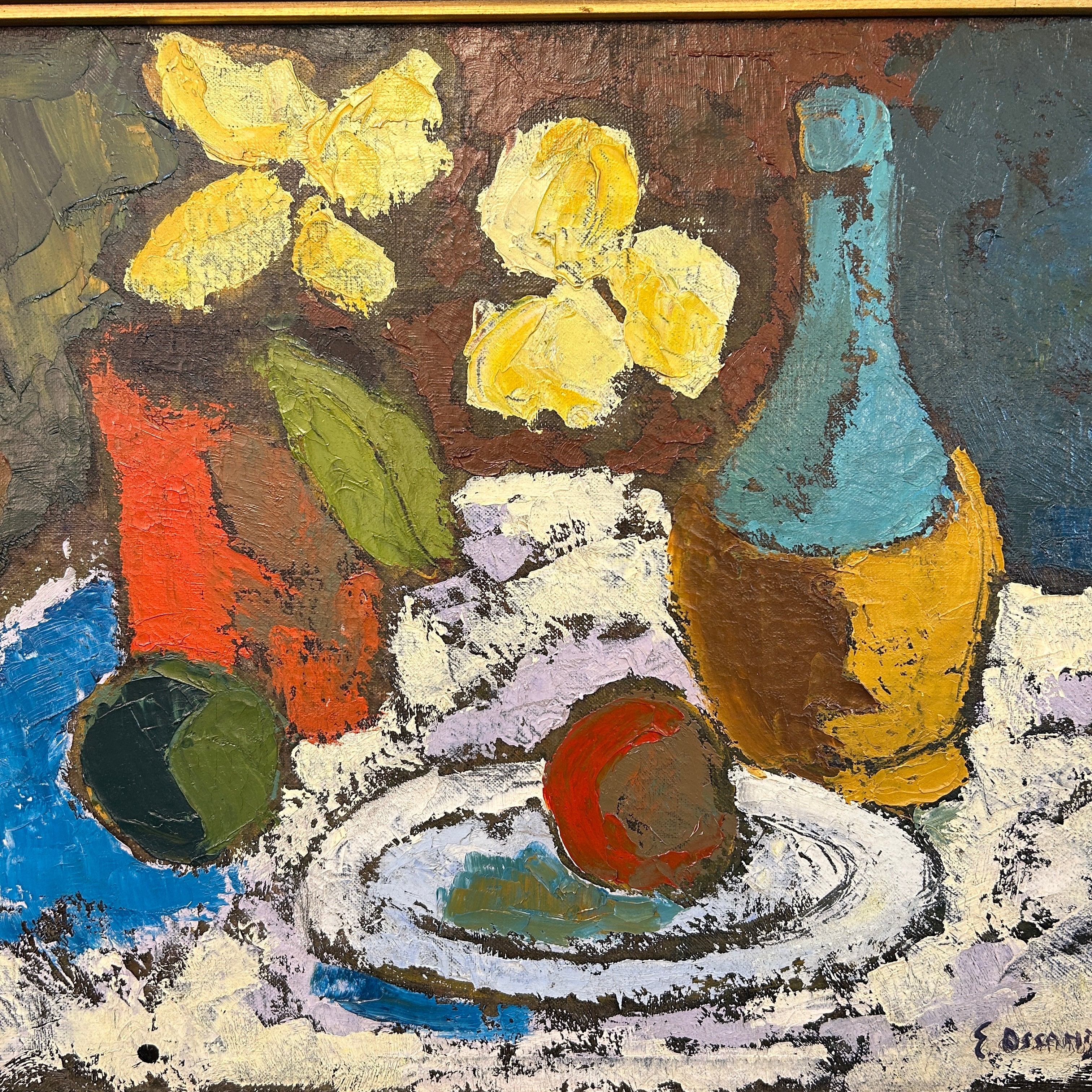 Especial bodegón del pintor chileno Eduardo Ossandón que nos entrega una escena luminosa y de colores vivaces que incluso pueden dar la impresión de ser acrílico. Firmado año 59 (abajo de la N).