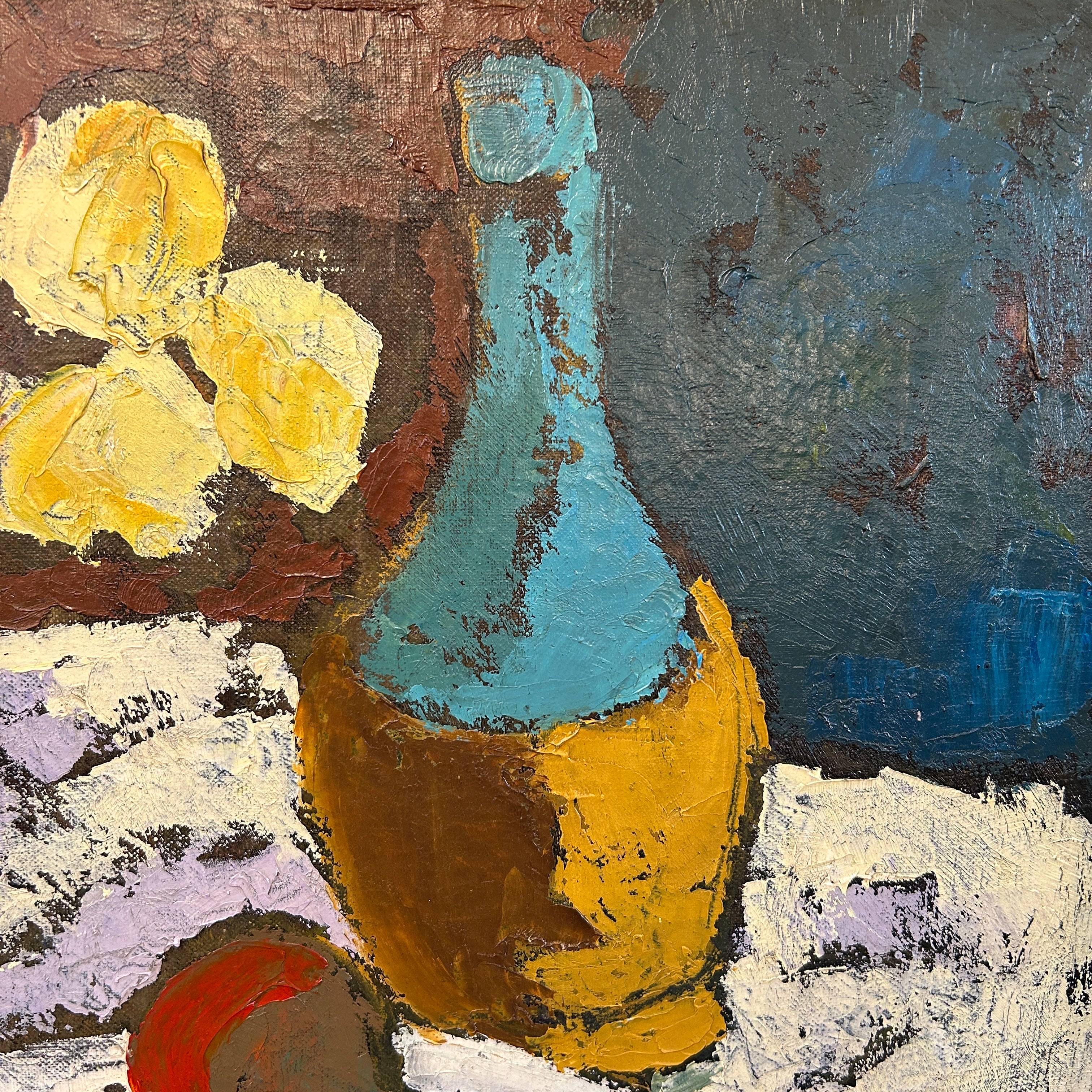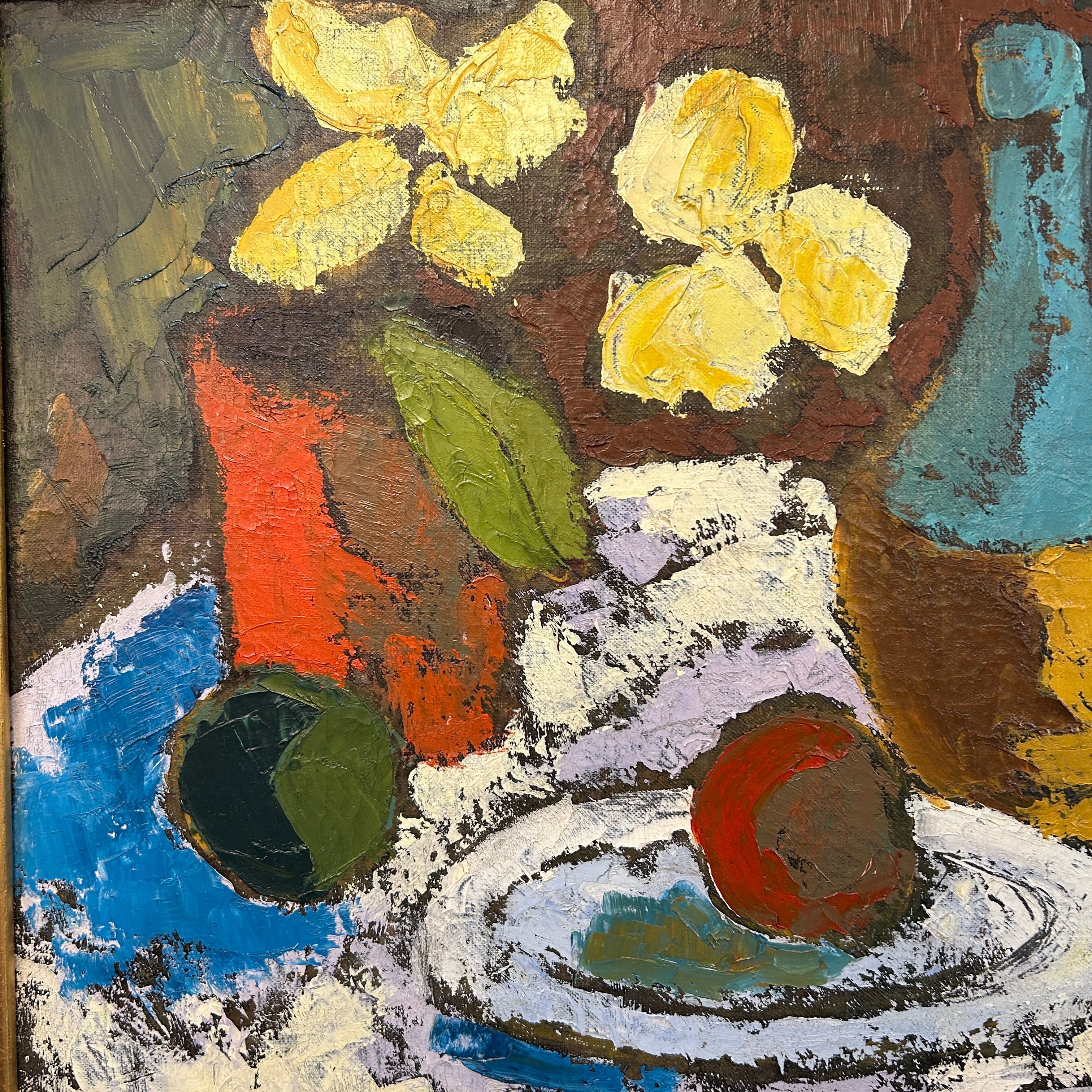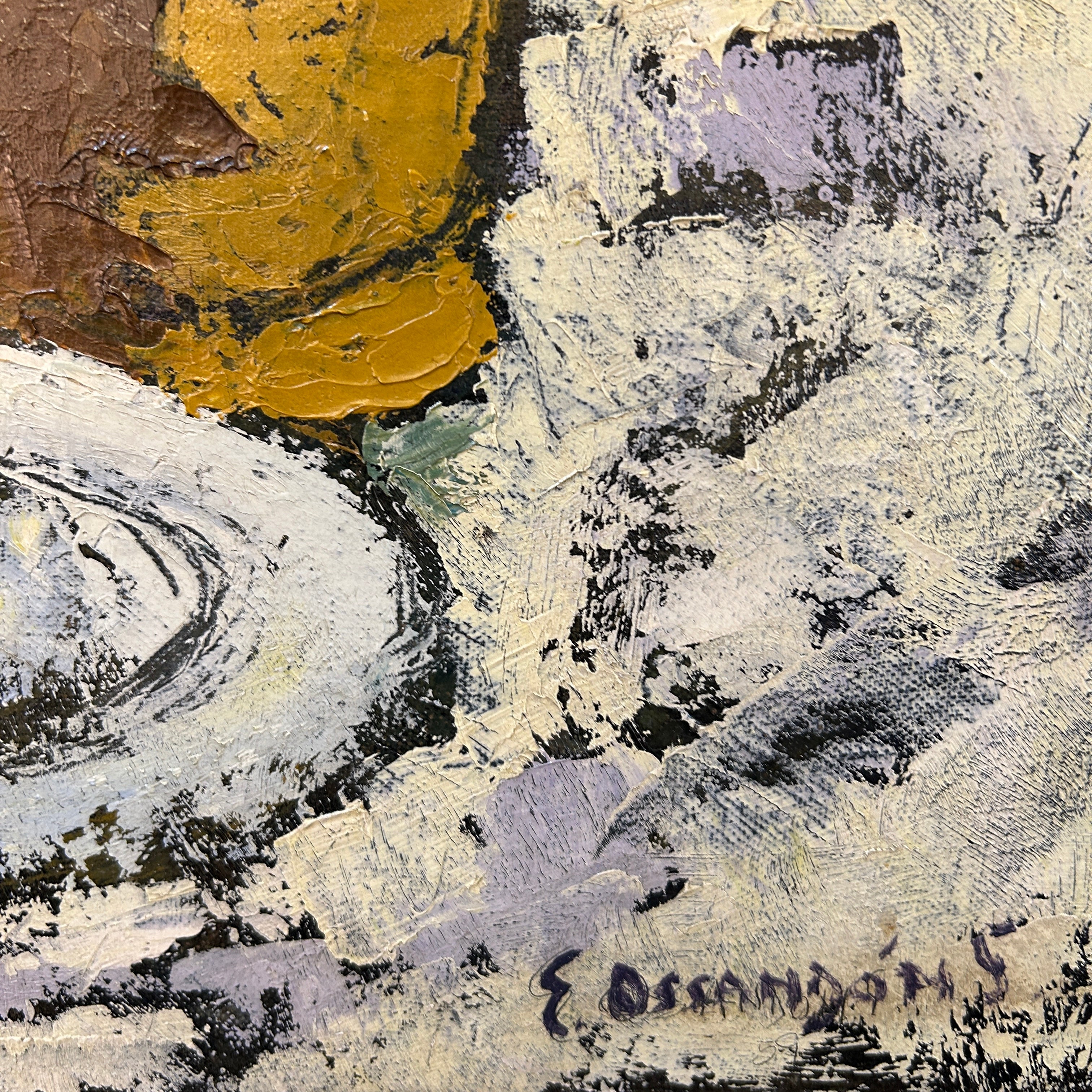 Especial bodegón del pintor chileno Eduardo Ossandón que nos entrega una escena luminosa y de colores vivaces que incluso pueden dar la impresión de ser acrílico. Firmado año 59 (abajo de la N).