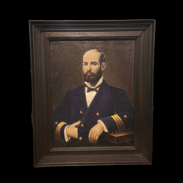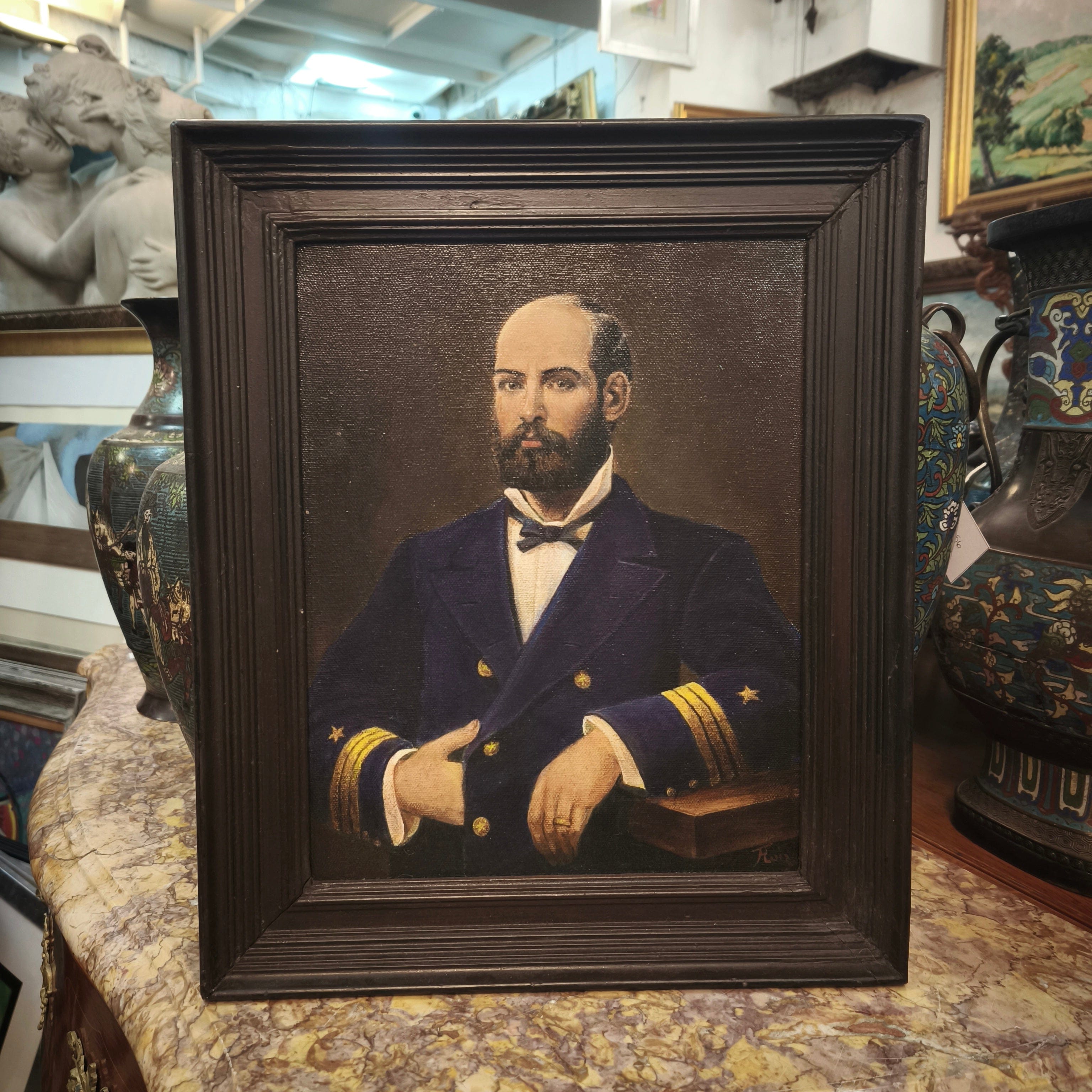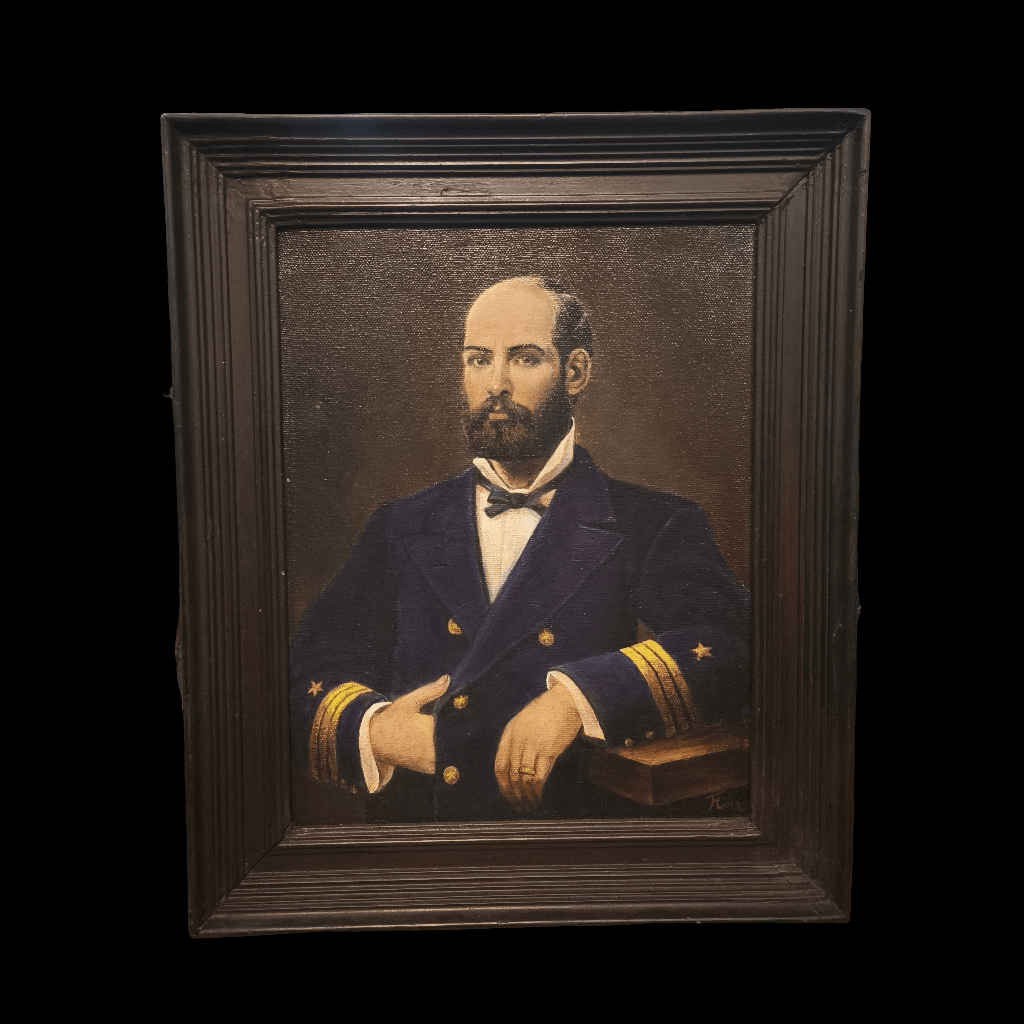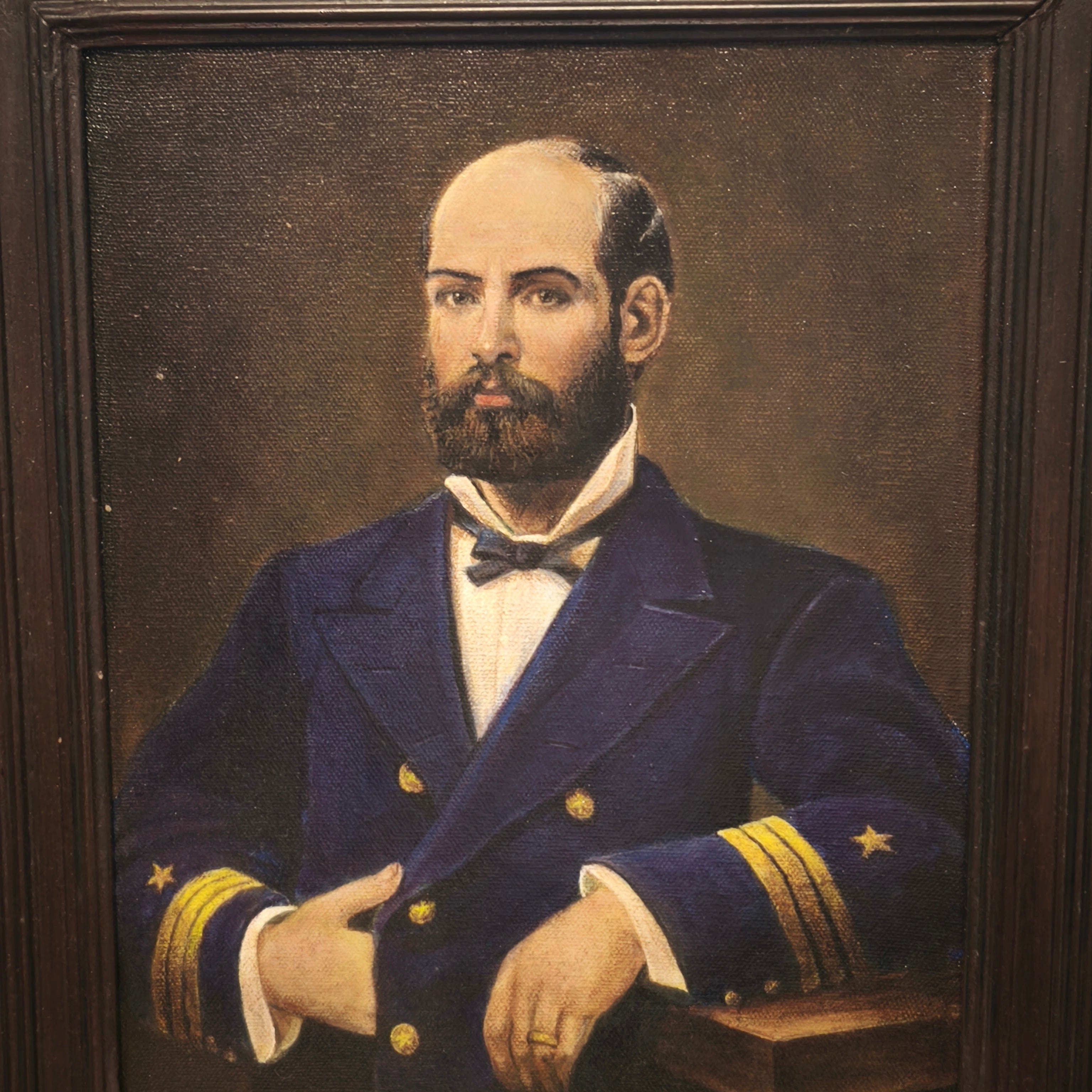 Oleo sobre madera del pintor chileno Fernando Ruiz retratando a Arturo Prat. La obra está enmarcada en un marco de madera de color café.