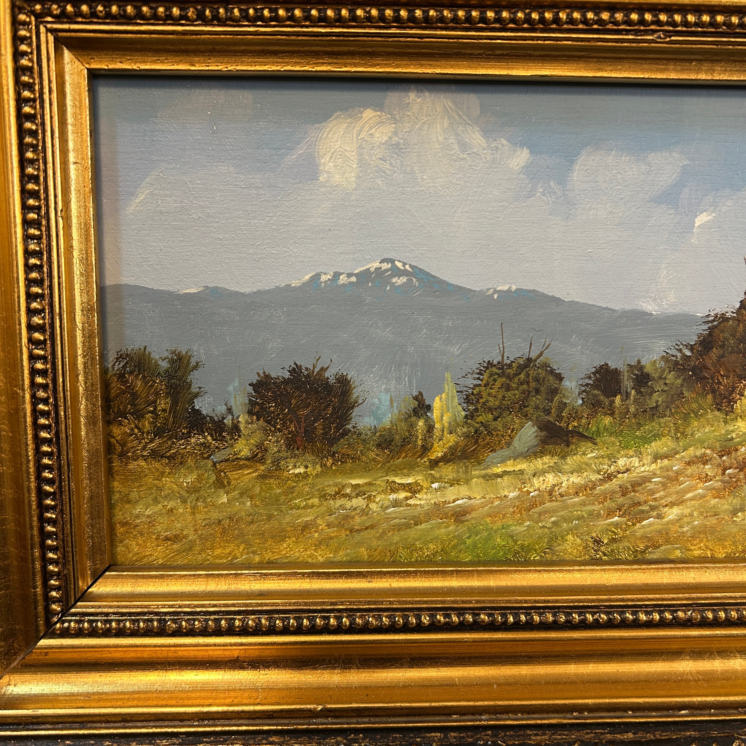 Bello óleo sobre madera del pintor chileno Hugo Zapata. La obra representa un encantador paisaje campestre, con variedad de vegetación nativa. En el fondo se aprecia la imponente cordillera, enmarcada por suaves formaciones nubosas. El cuadro está realzado por un marco de madera tallada con acabado dorado.