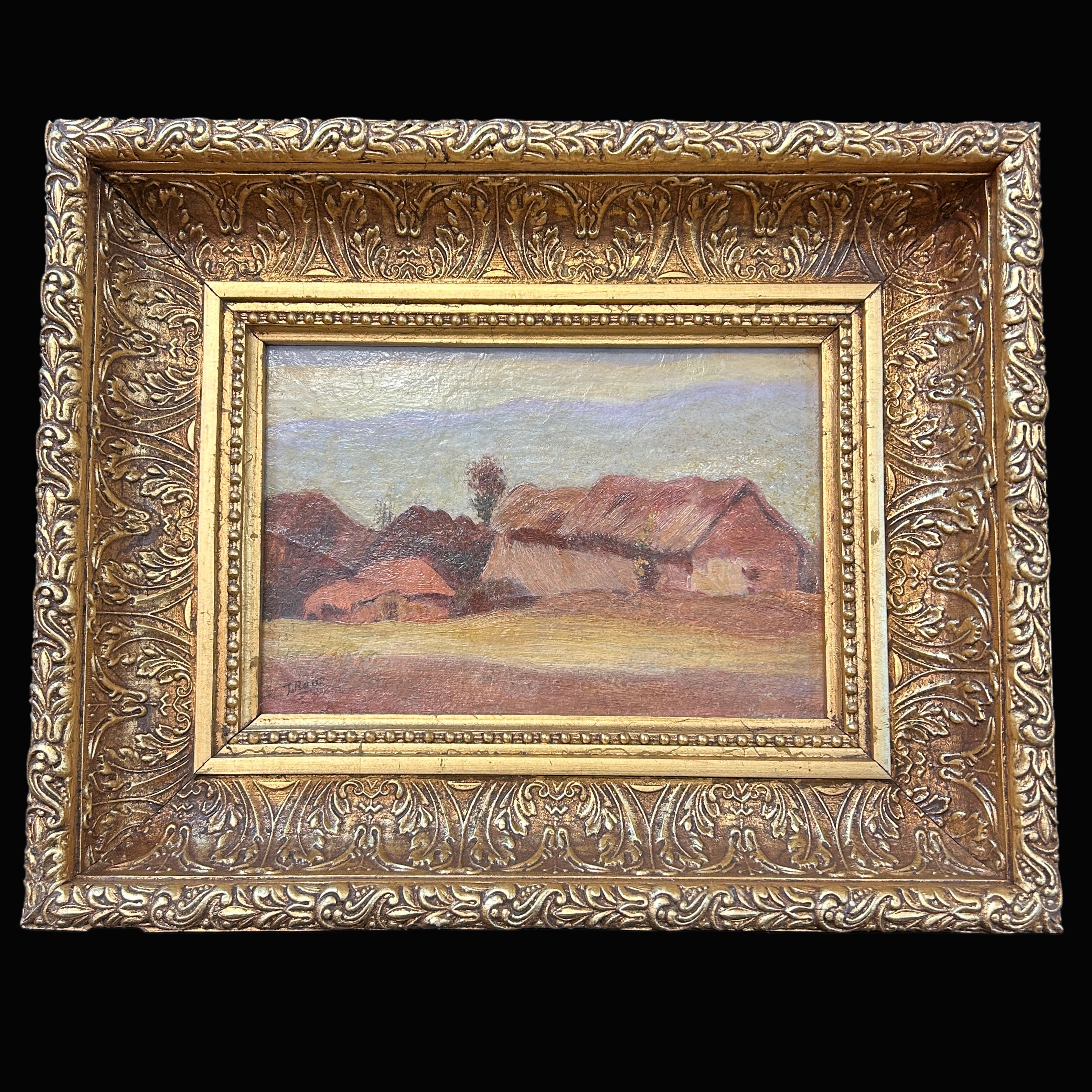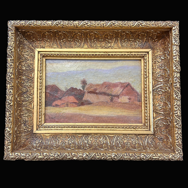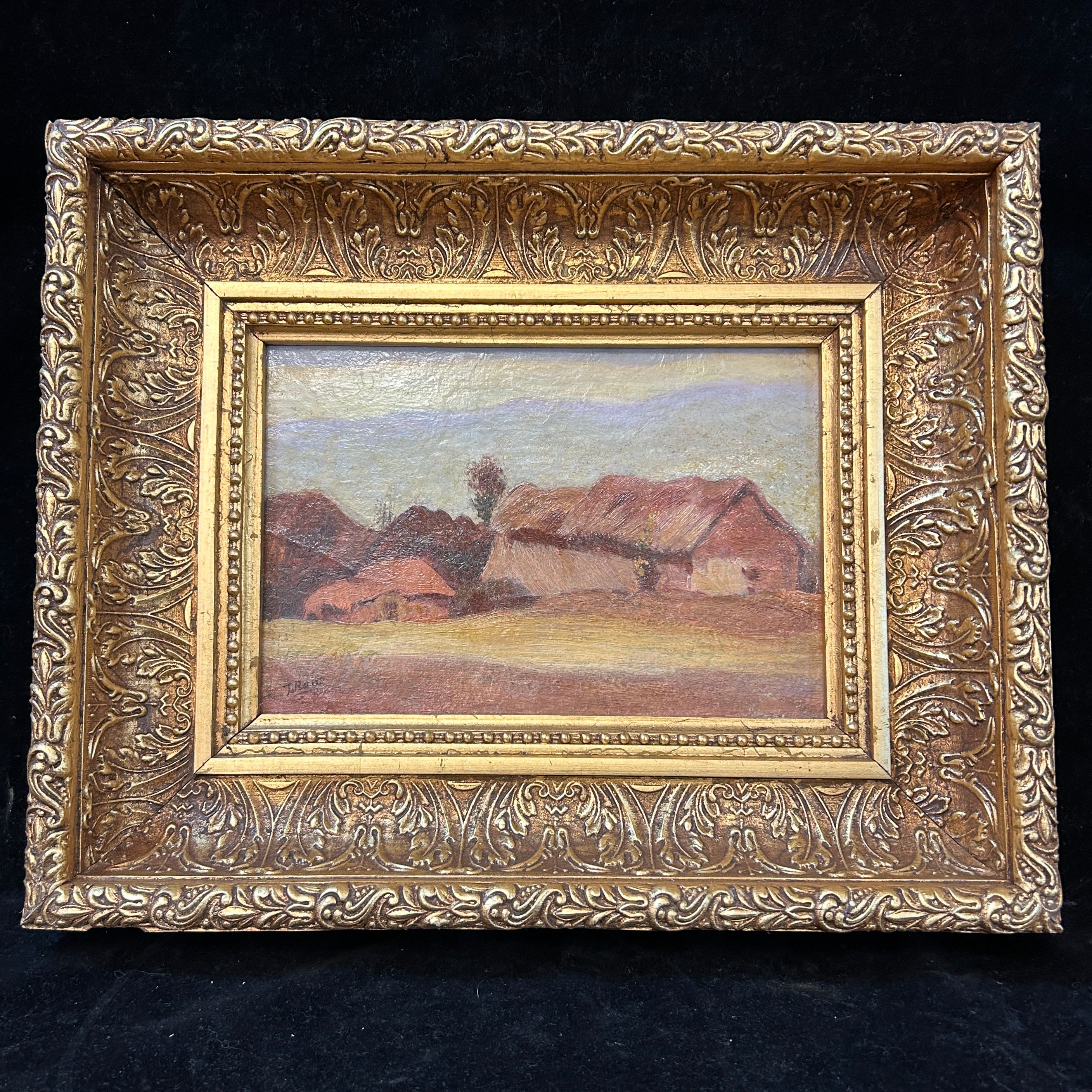 Óleo sobre trupán del artista chileno Israel Roa, representando un paisaje con varias casitas de adobe y techo de paja, en tonos cálidos. La obra tiene un espectacular marco de madera tallado con acabado dorado.