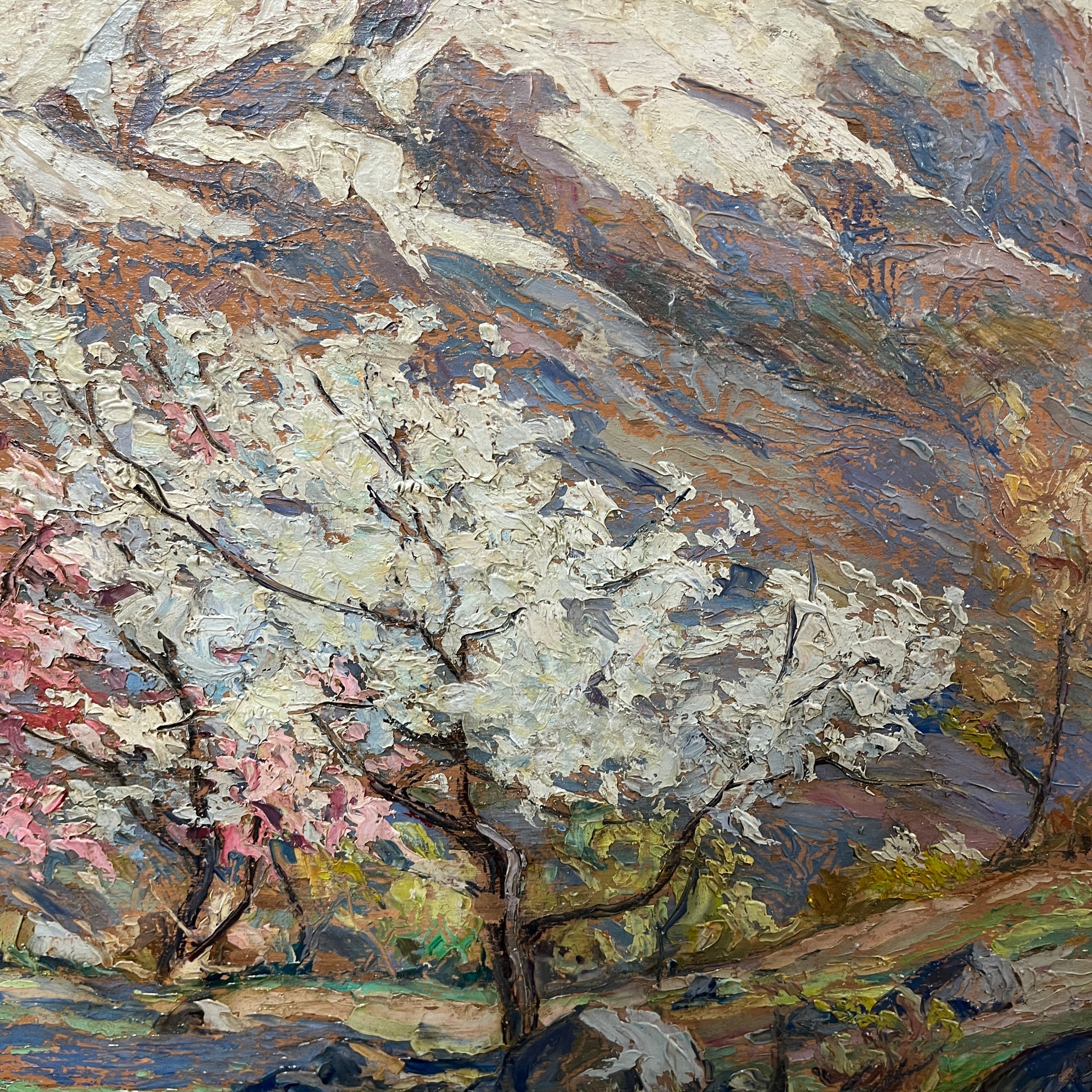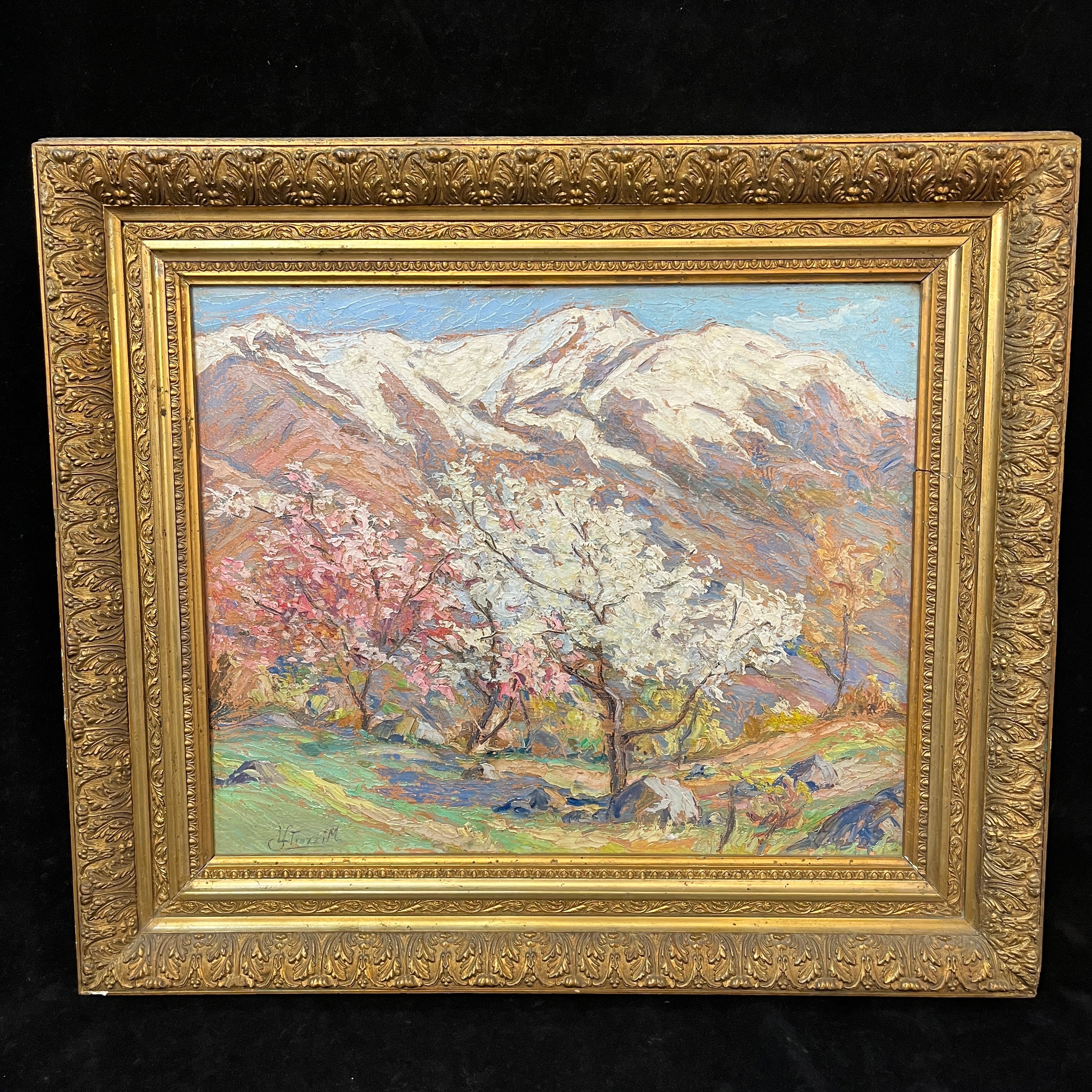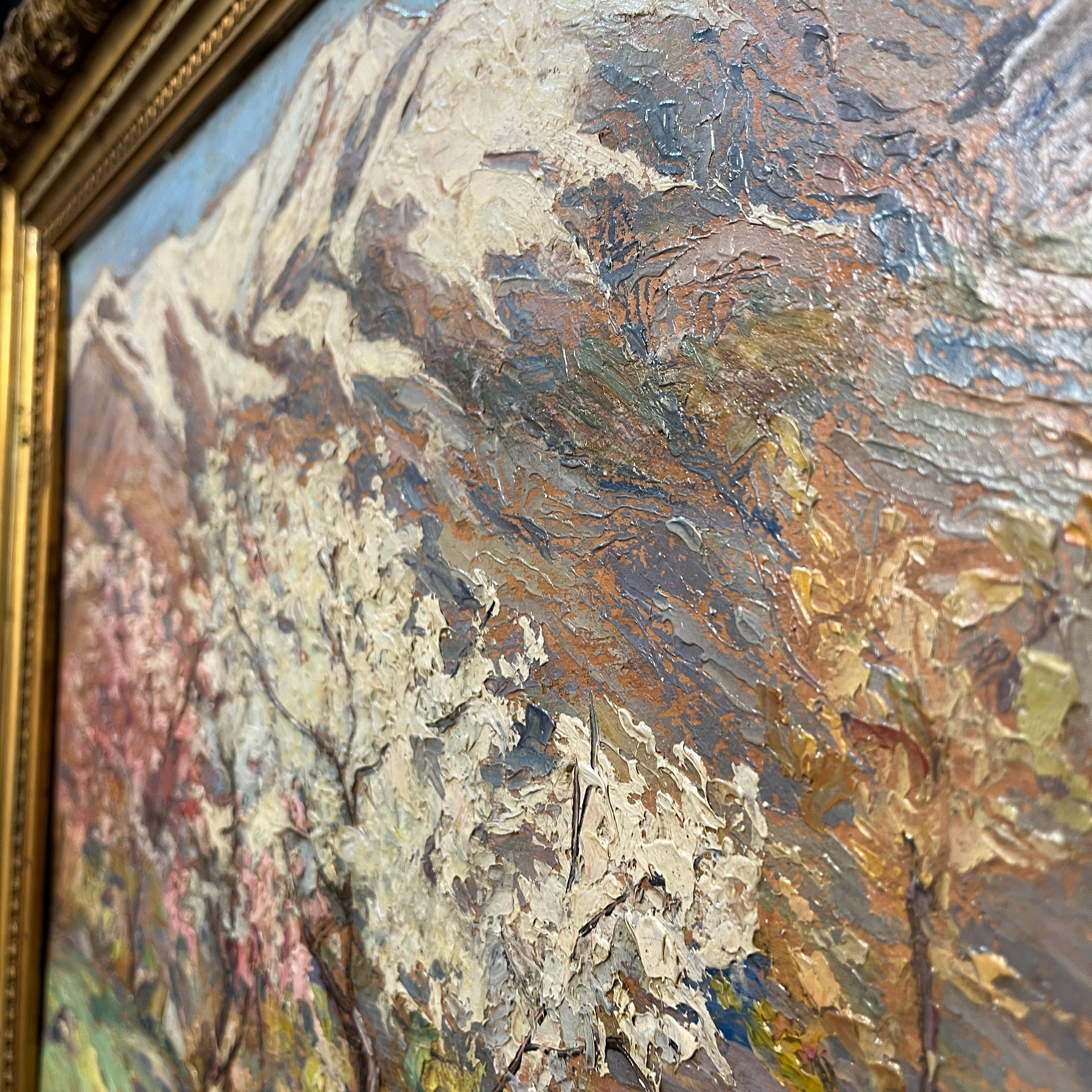 Óleo sobre madera del pintor chileno Luis Strozzi, representando un precioso paisaje con árboles de ciruelo florecidos y la cordillera nevada de fondo. La obra está enmarcada en madera tallada y terminada en elegante pintura dorada.