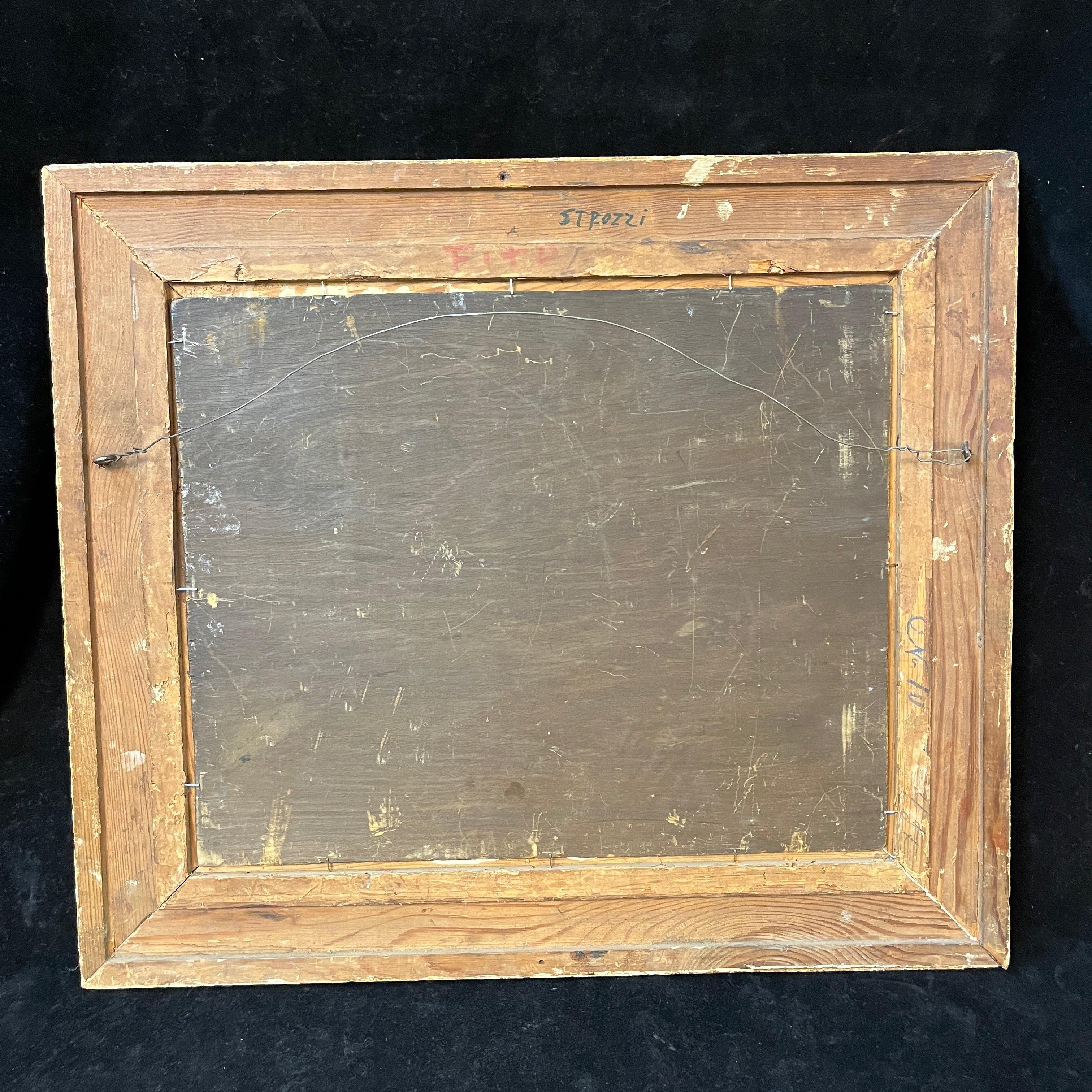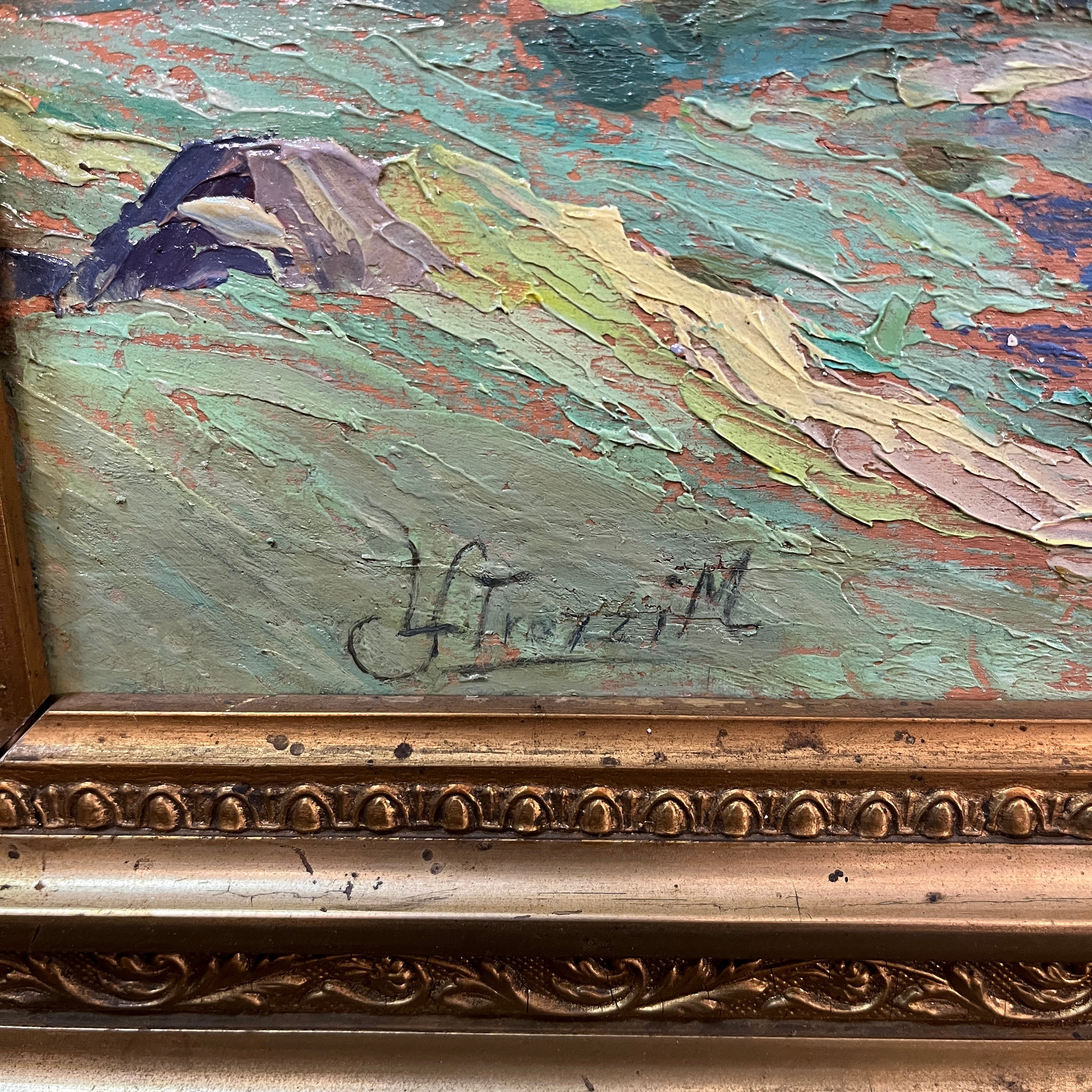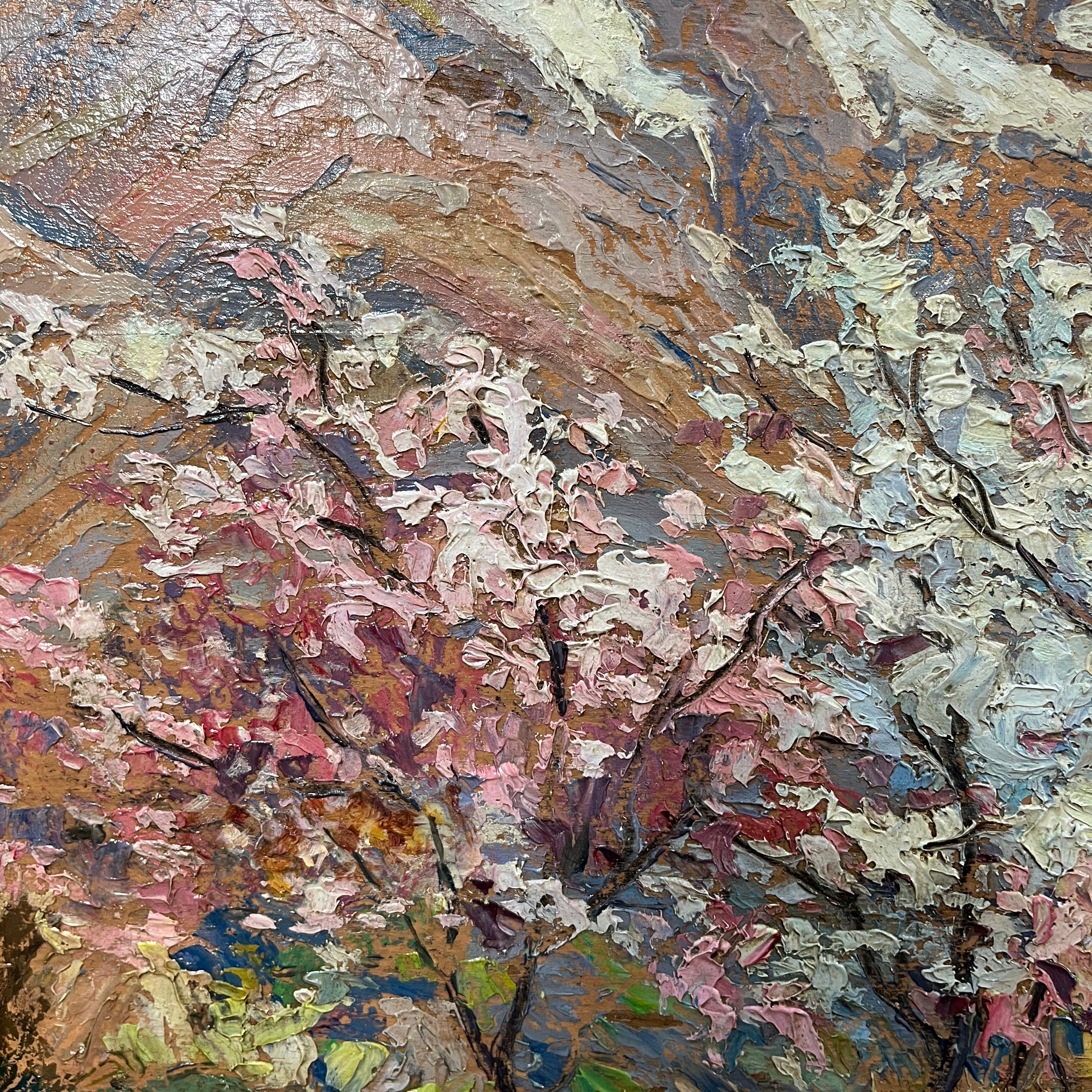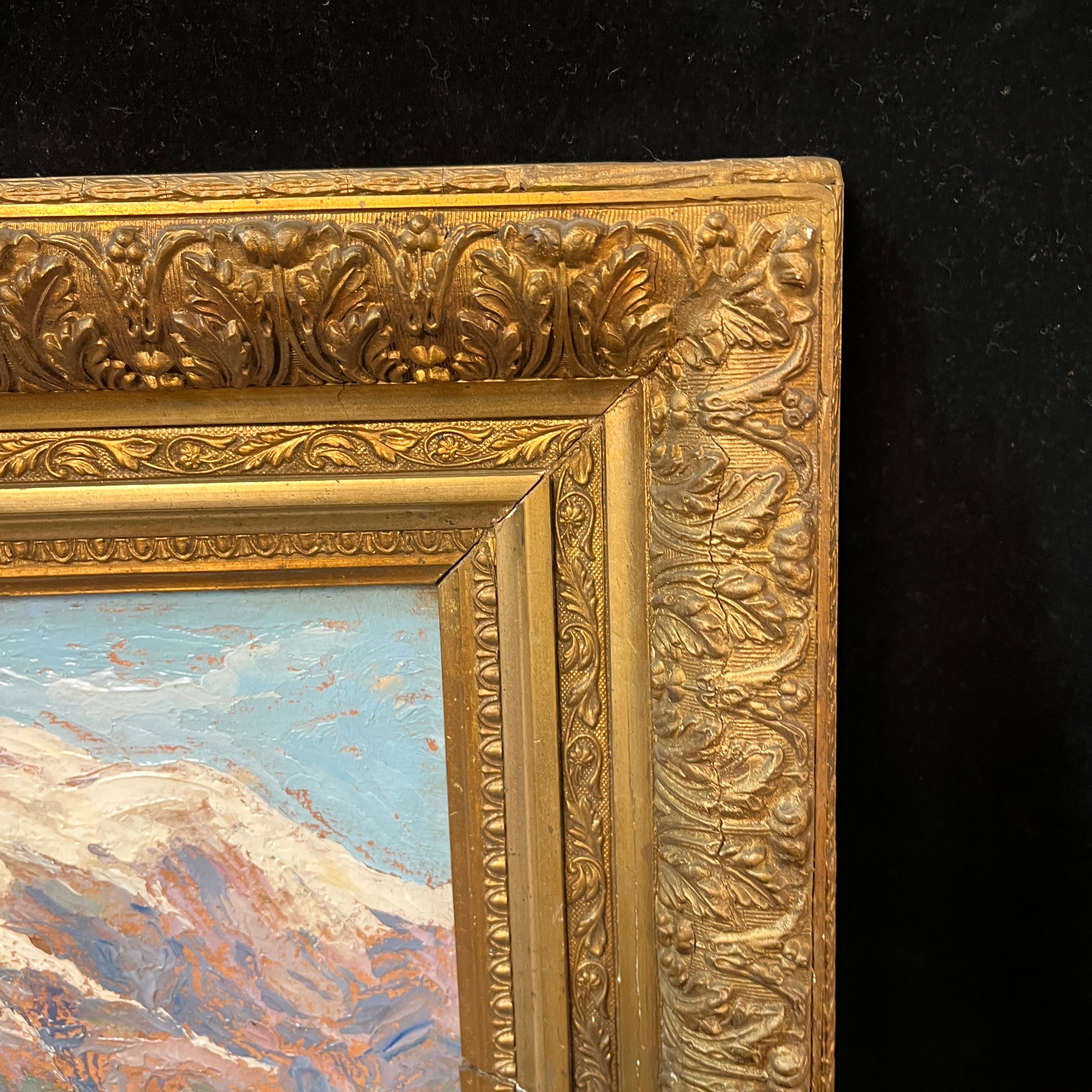 Óleo sobre madera del pintor chileno Luis Strozzi, representando un precioso paisaje con árboles de ciruelo florecidos y la cordillera nevada de fondo. La obra está enmarcada en madera tallada y terminada en elegante pintura dorada.