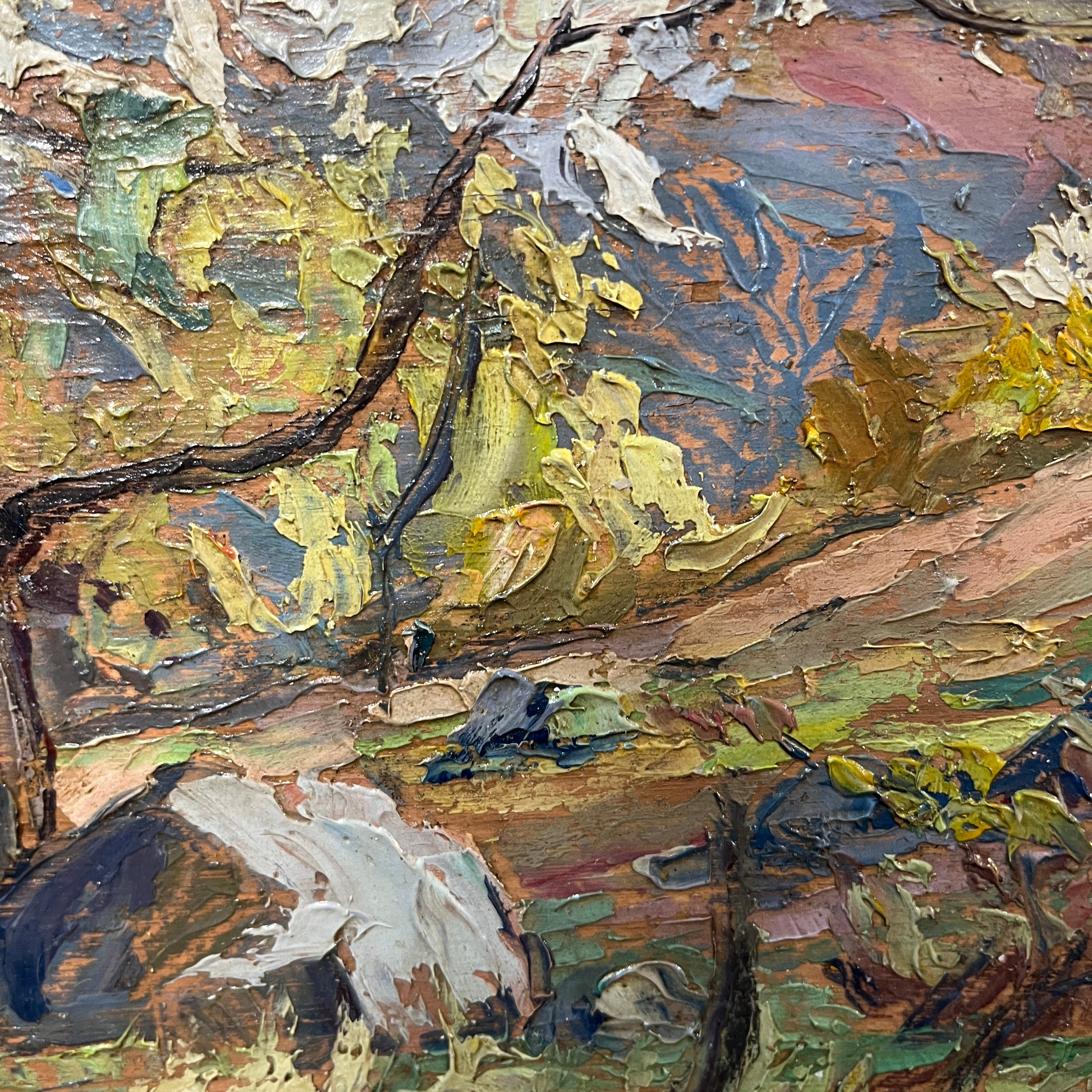 Luis Strozzi - Óleo sobre madera 'Paisaje de cordillera y ciruelos'