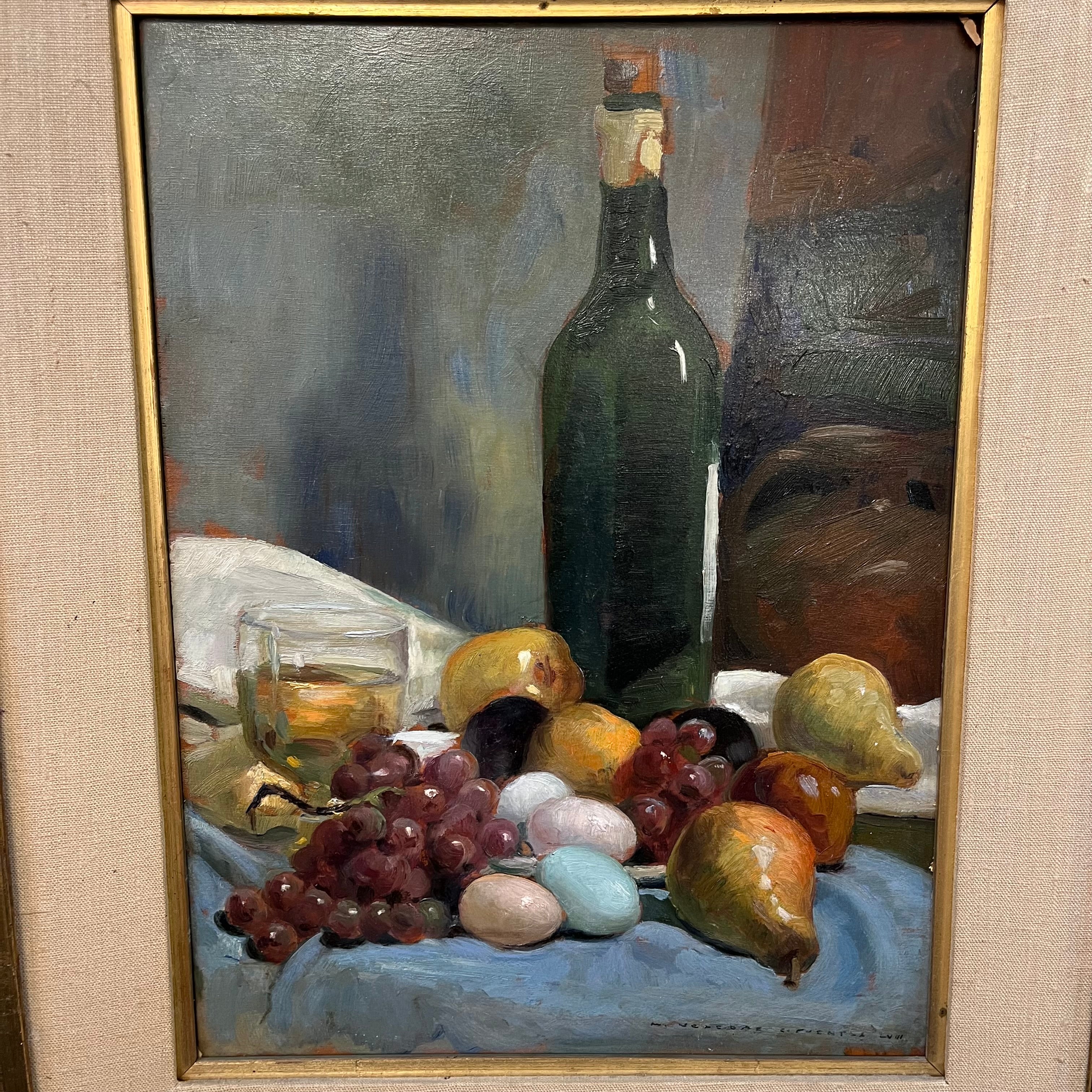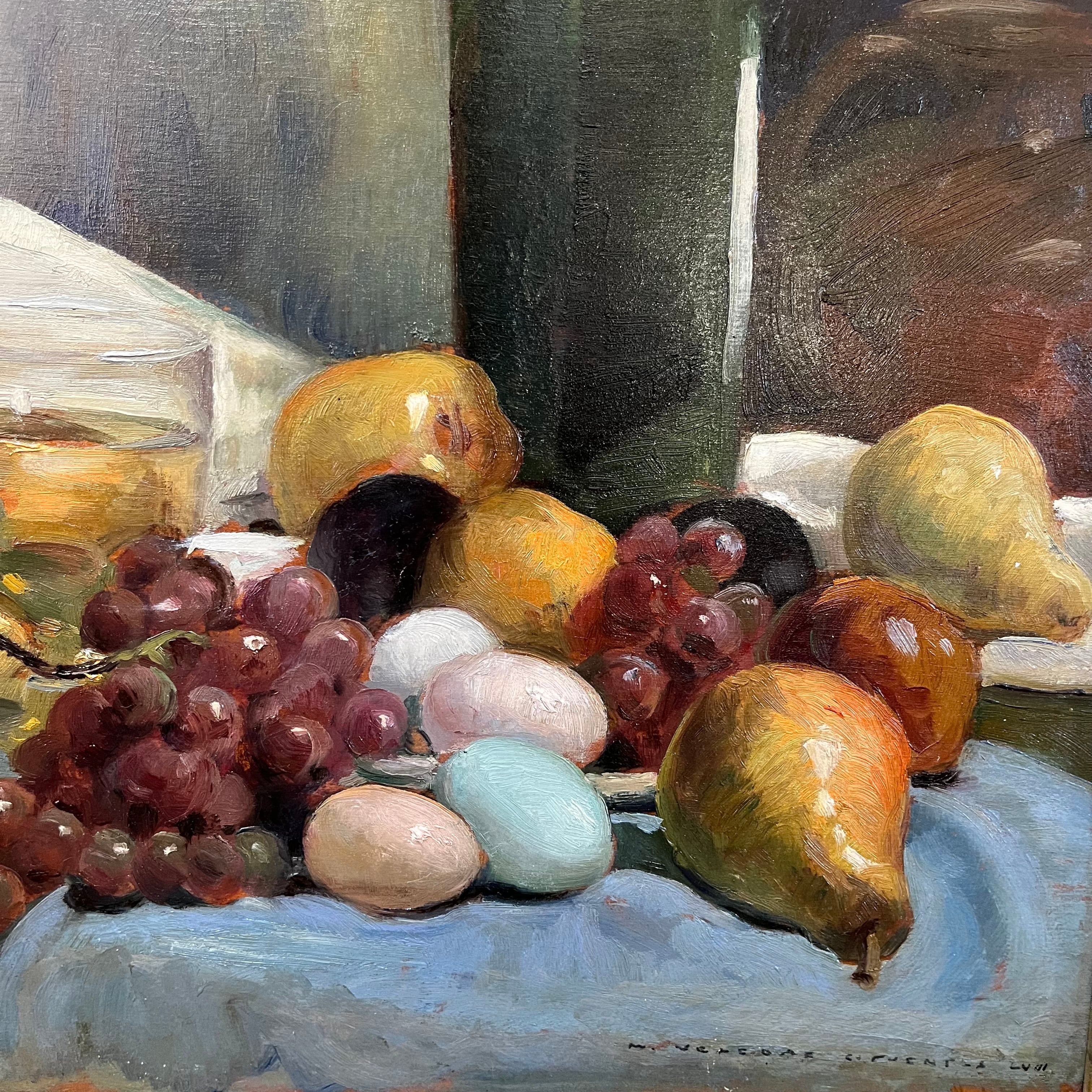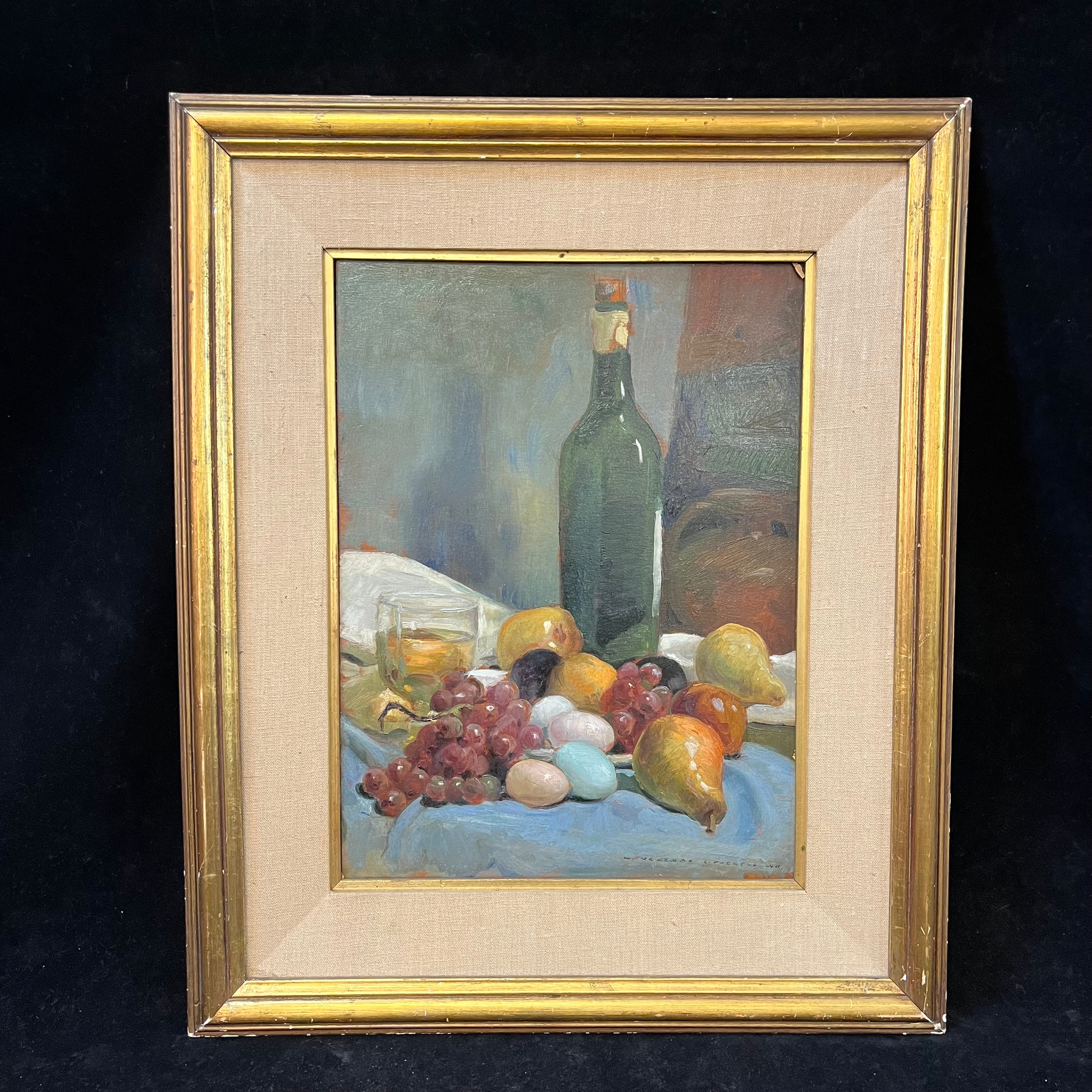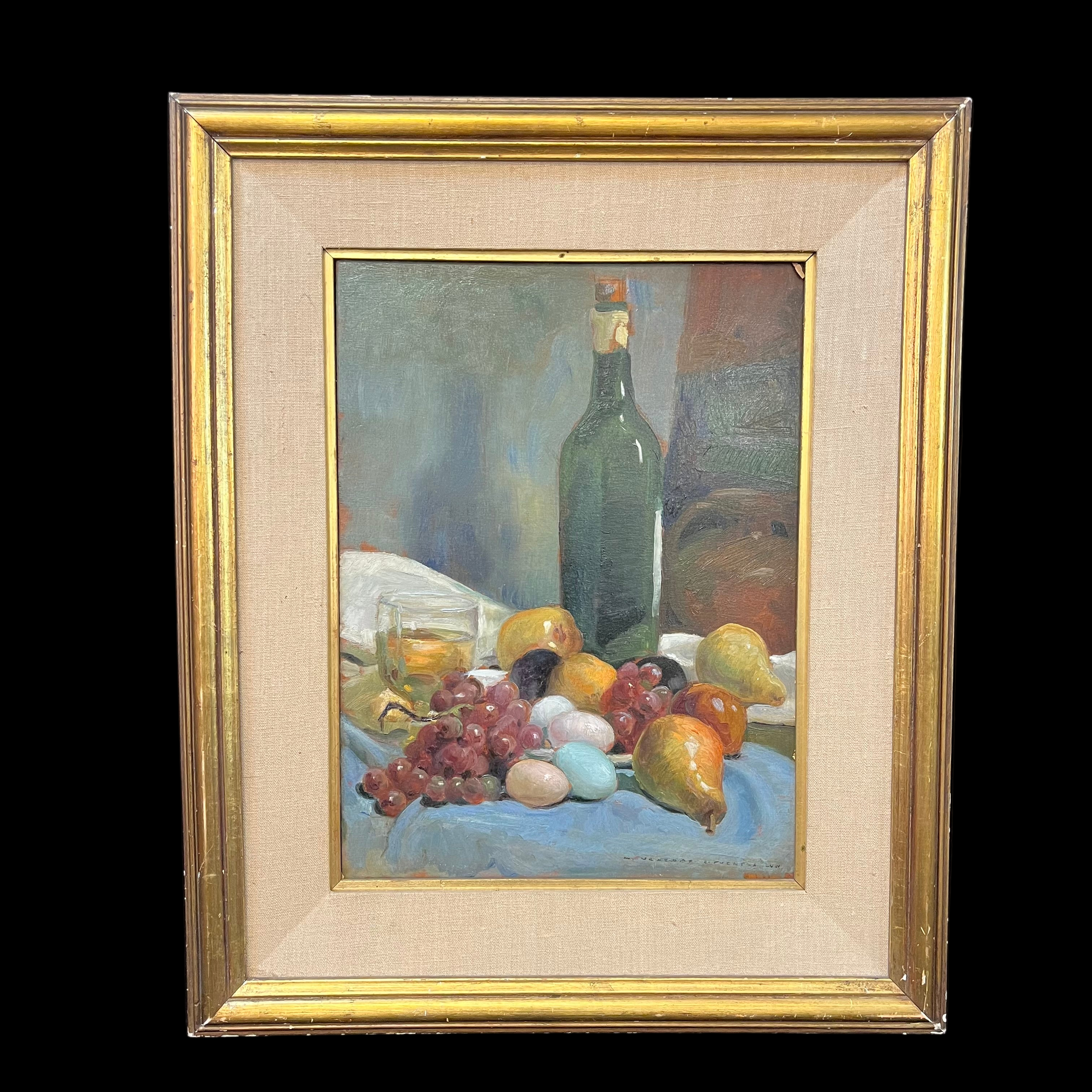 Hermoso bodegón del pintor chileno Miguel Venegas Cifuentes, donde nos encontramos con una combinación de elementos frutas, vinos y coloridos huevos. Se pude apreciar el juego de sombras que entrega un realismo especial a la pintura.
