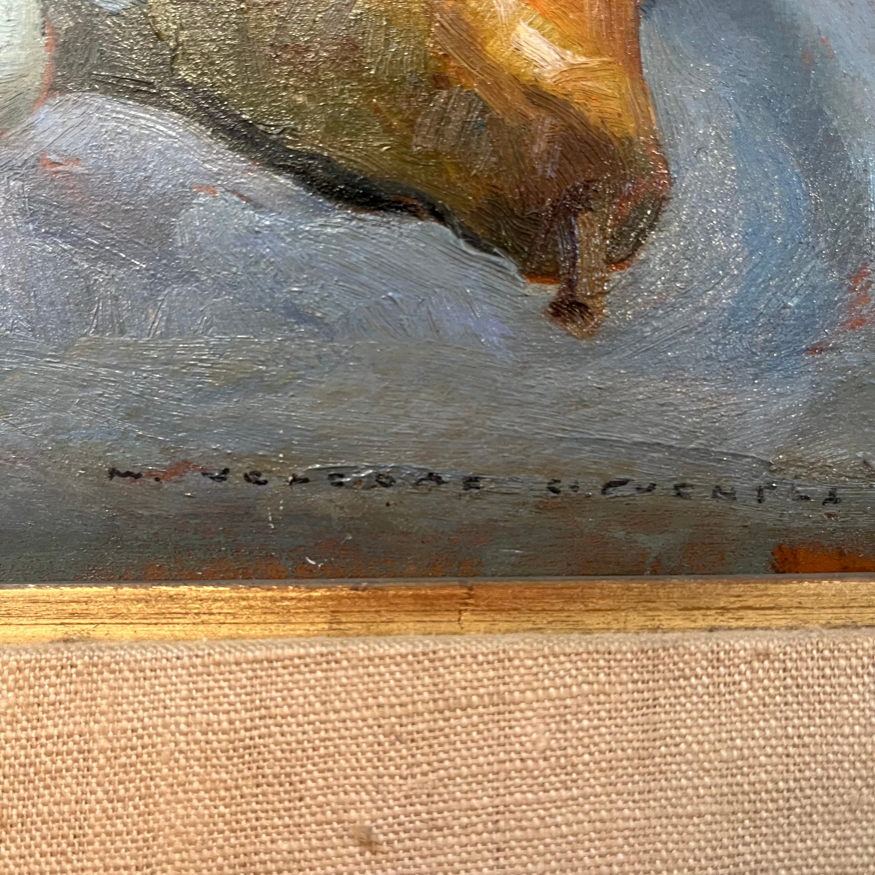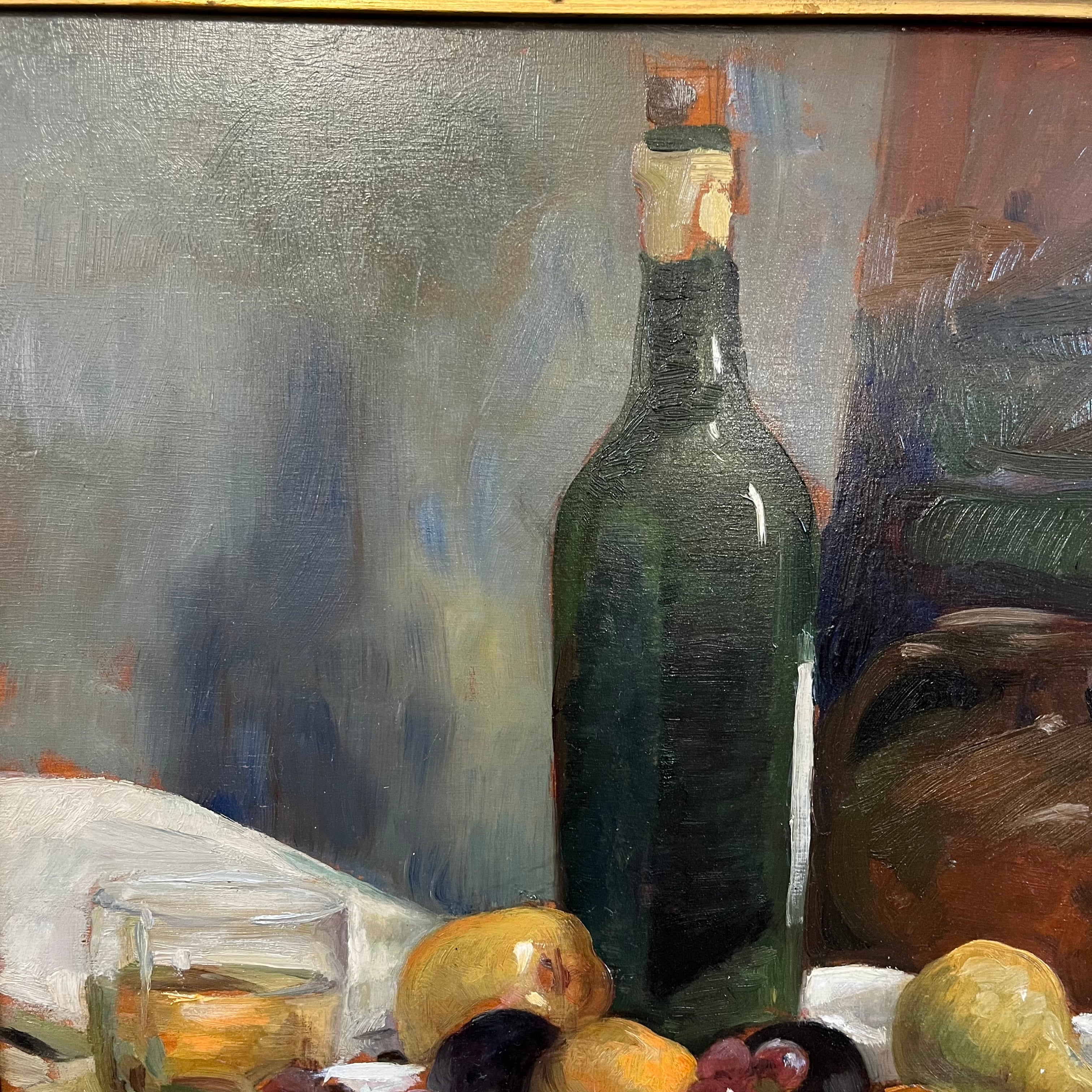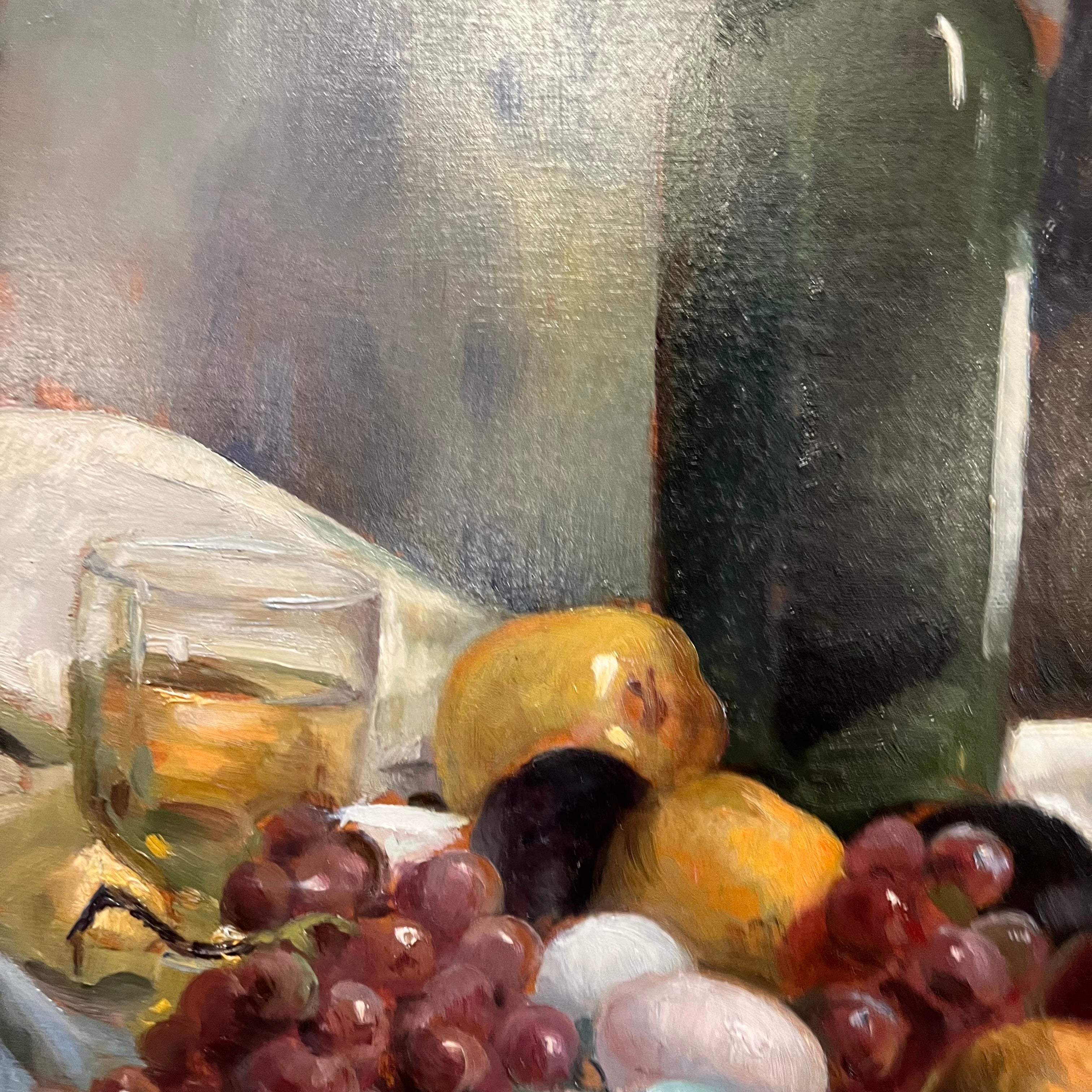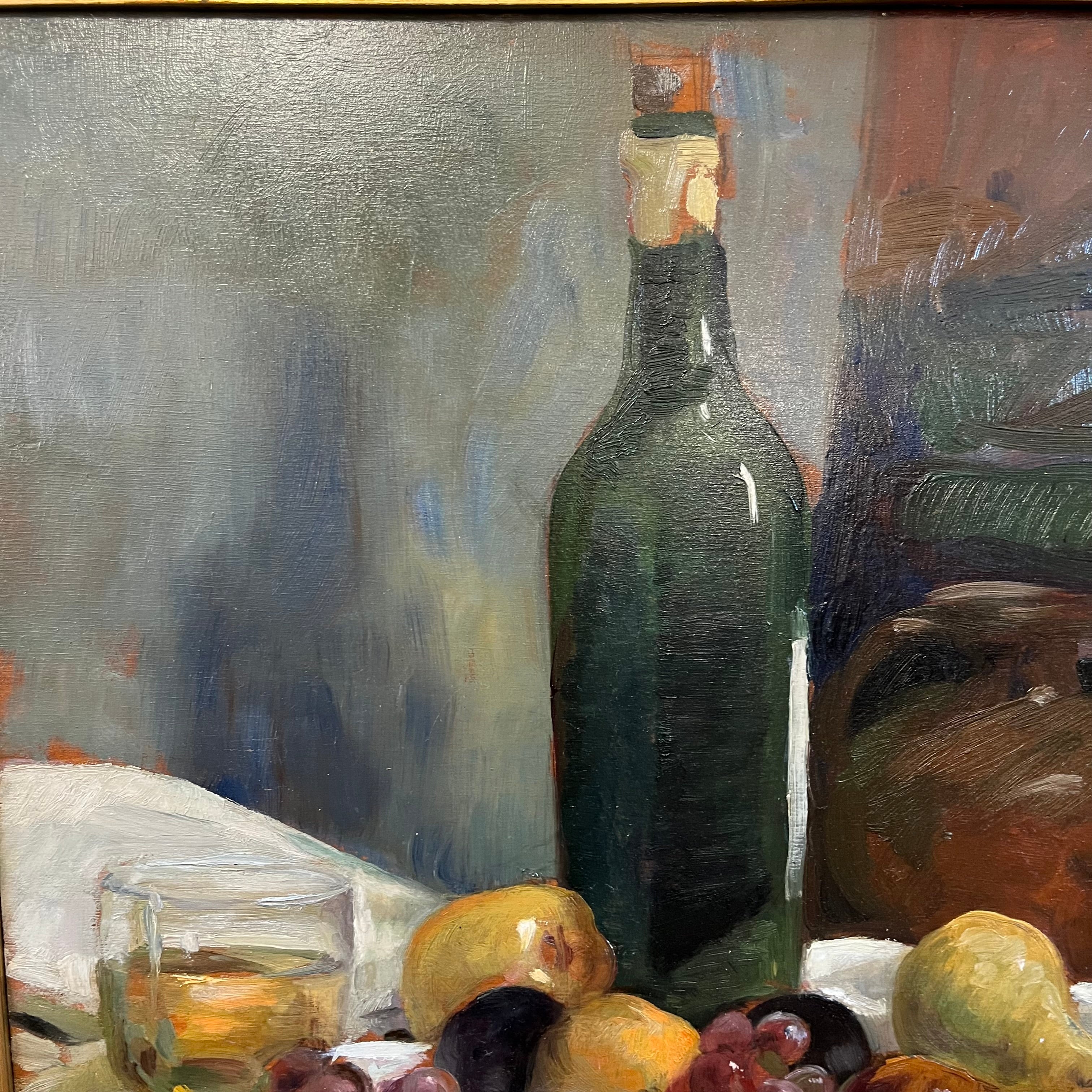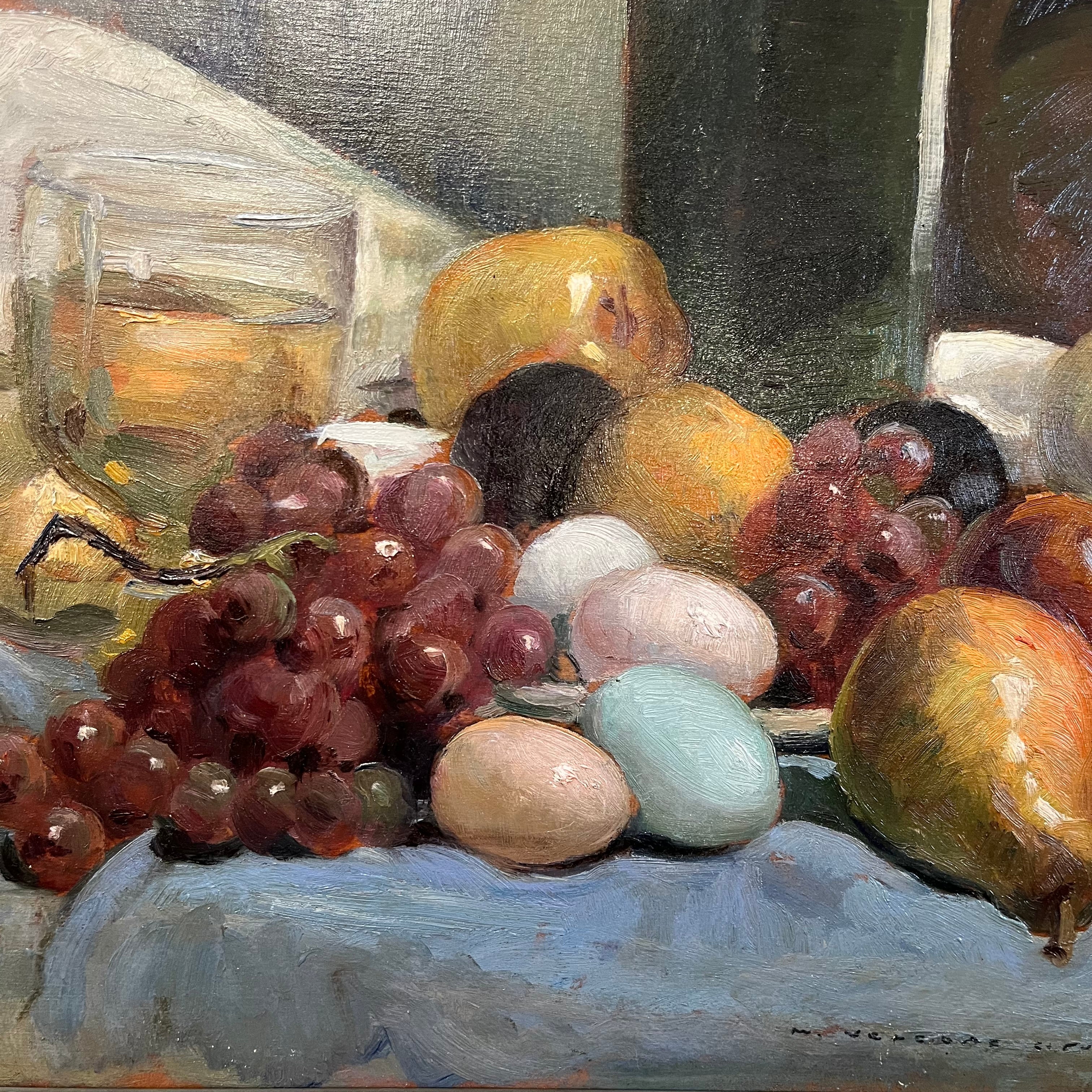 Hermoso bodegón del pintor chileno Miguel Venegas Cifuentes, donde nos encontramos con una combinación de elementos frutas, vinos y coloridos huevos. Se pude apreciar el juego de sombras que entrega un realismo especial a la pintura.