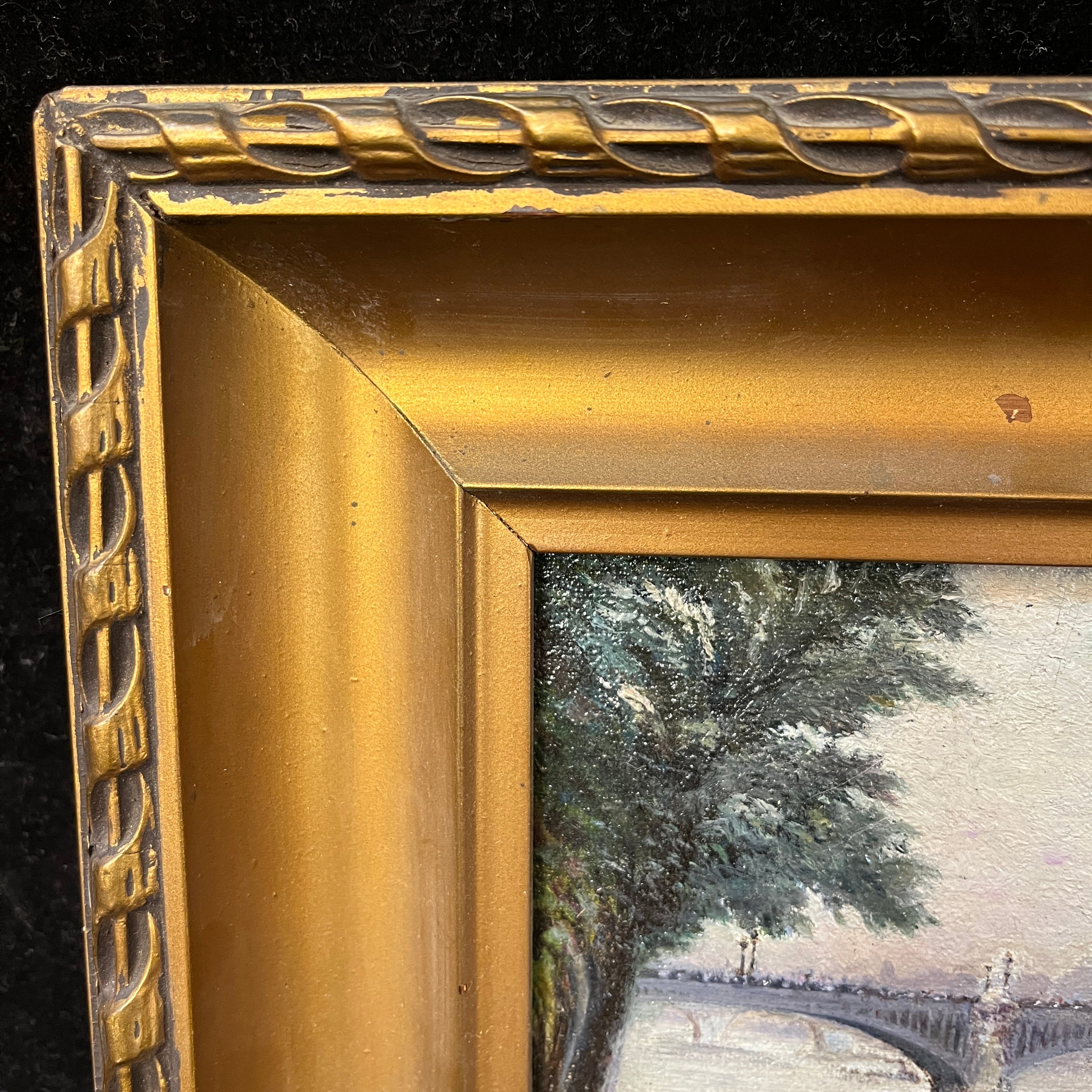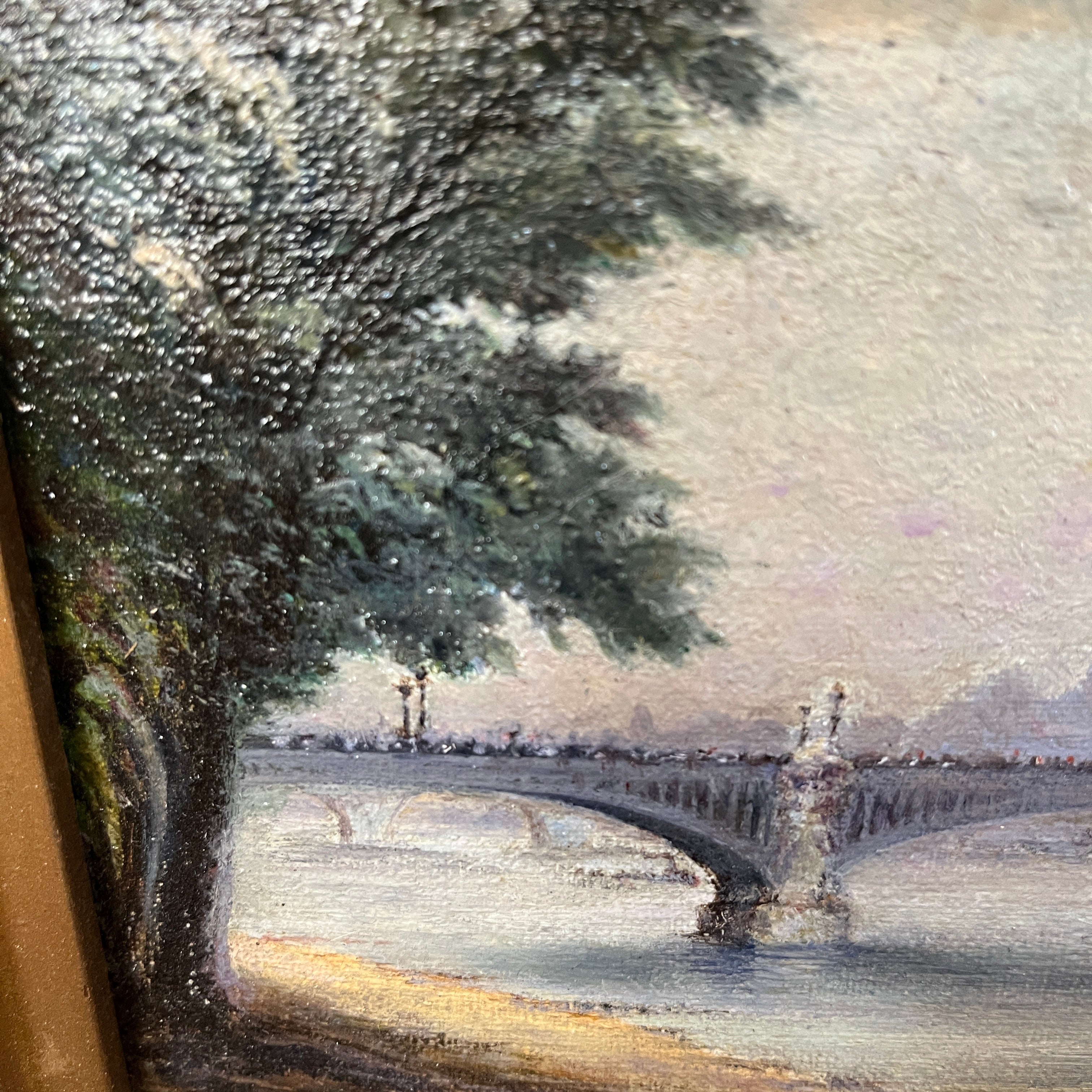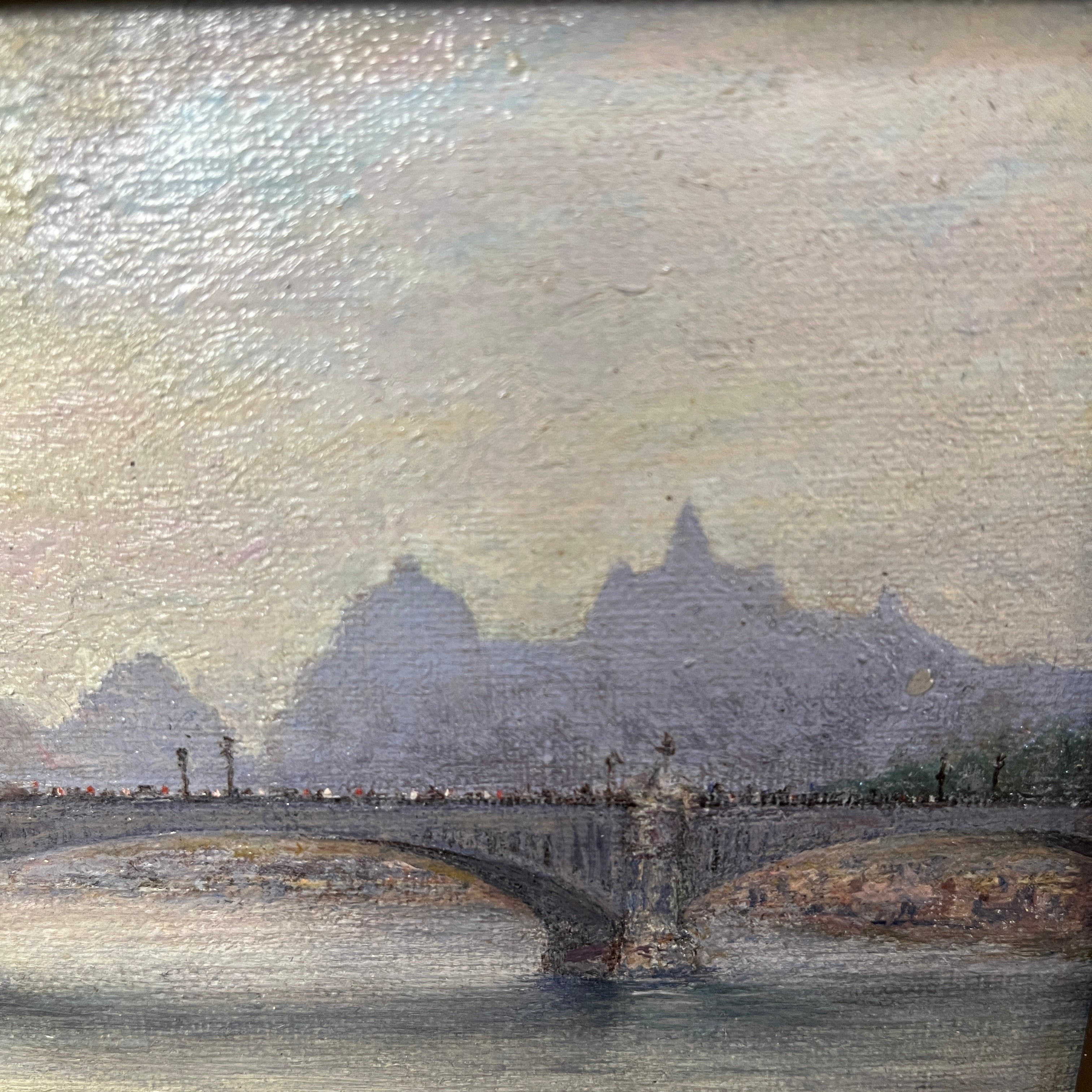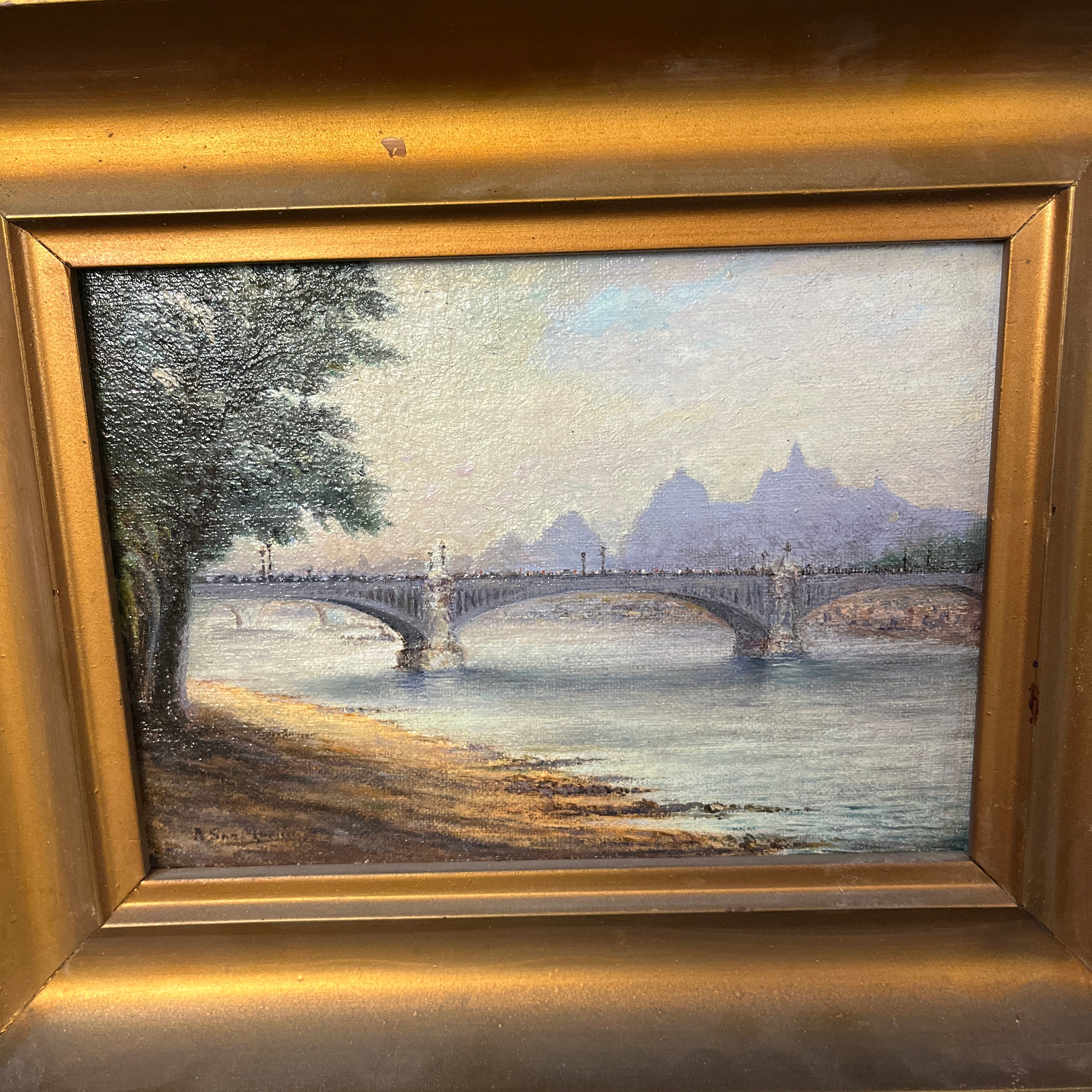 Óleo sobre madera del pintor chileno Rafael San Martín, representando una escena parisina del puente X. La obra de pequeño formato, pintada en 1933, hace una representación detallista y luminosa del paisaje, dándole mucho brillo y reflejo a los elementos. La obra está enmarcada en madera tallada en relieves y terminada de elegante dorado. En el reverso del marco se indica el nombre del artista, el título de la obra, la fecha en la que fue pintada y su título “Paris”, aclarando también que se trata de una copia de otra obra no específicada.