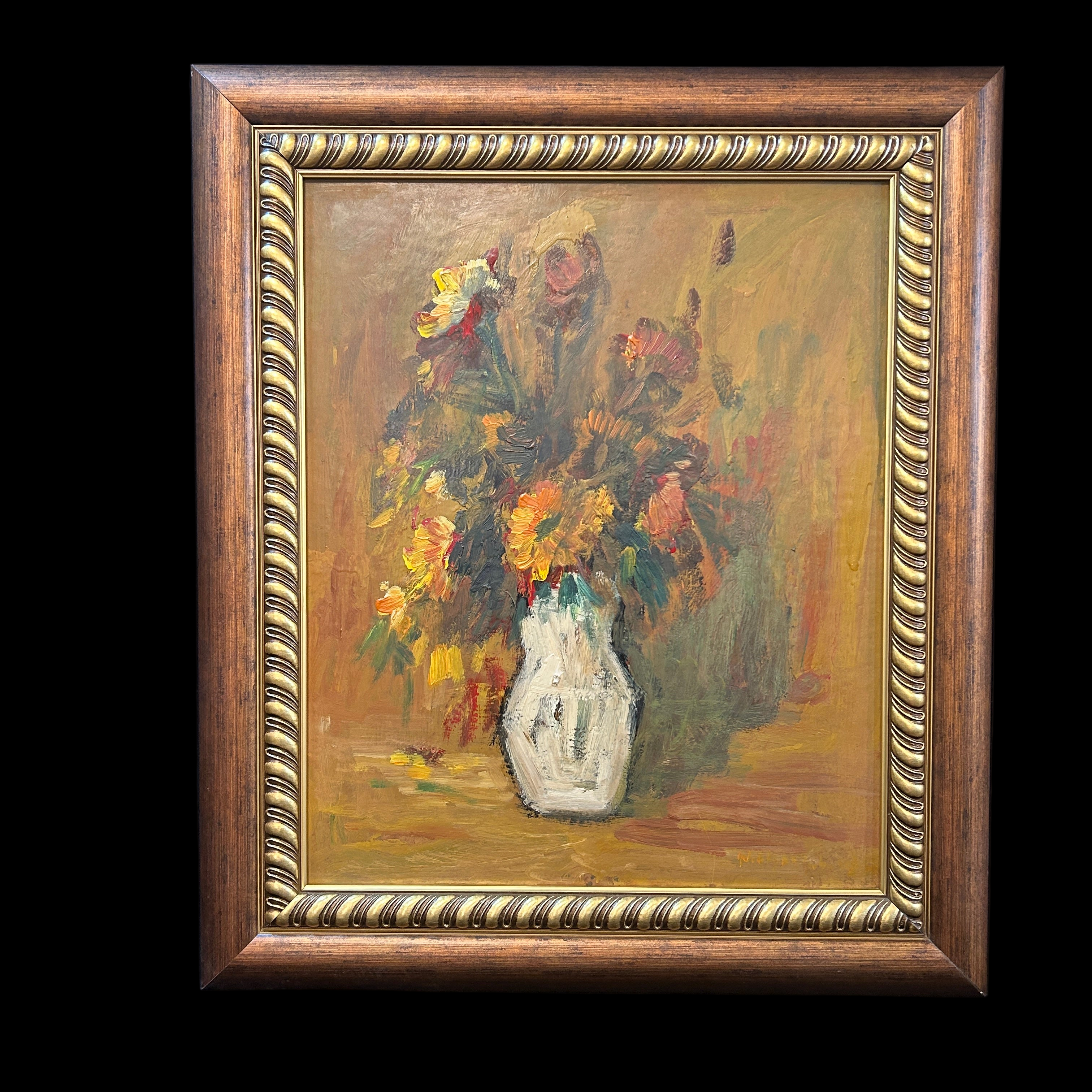 Preciosa naturaleza muerta del talentoso pintos chileno Raúl Ulloa Burgos. La pintura nos entrega un jarrón blanco muy centrado con un buquet de flores multicolor rebalsándolo y algunos pétalos en el suelo. La pintura viene enmarcada con un marco sobrio de madera con una sutil decoración dorada que complementa perfectamente la composición.