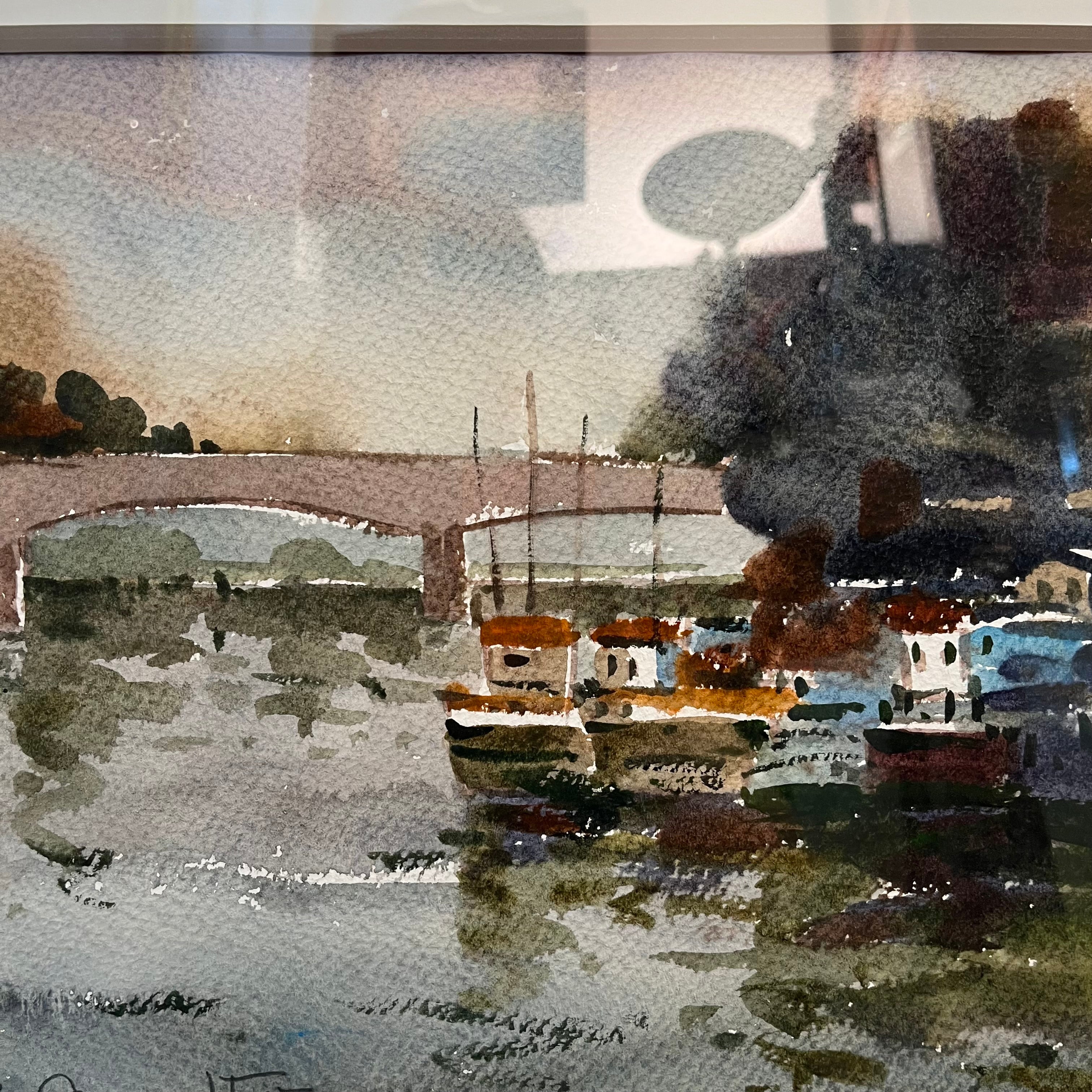 Hermosa acuarela del talentoso Ricardo Anwandter, que retrata lo que pareciera ser el puente Calle Calle de Valdivia. Magníficos tonos verdes, azules y grises más el reflejo de la luz en el agua entregan una atmósfera perfecta de lo que puede ser un día normal en el sur de Chile.