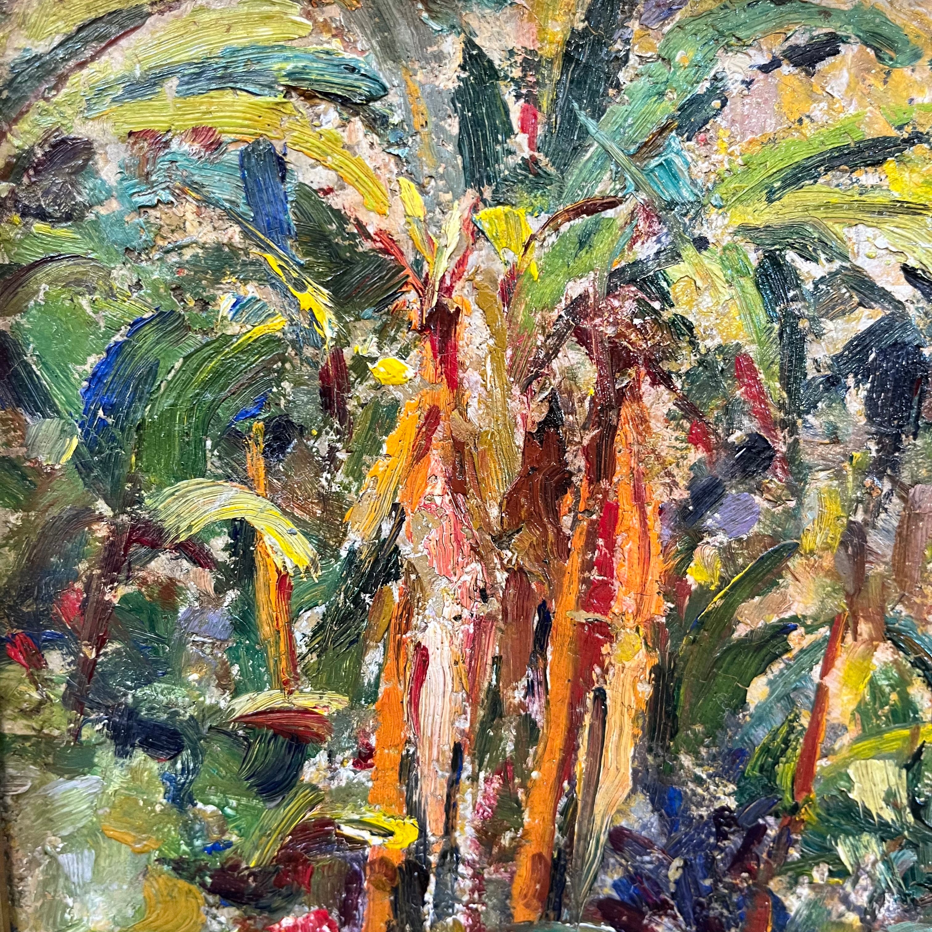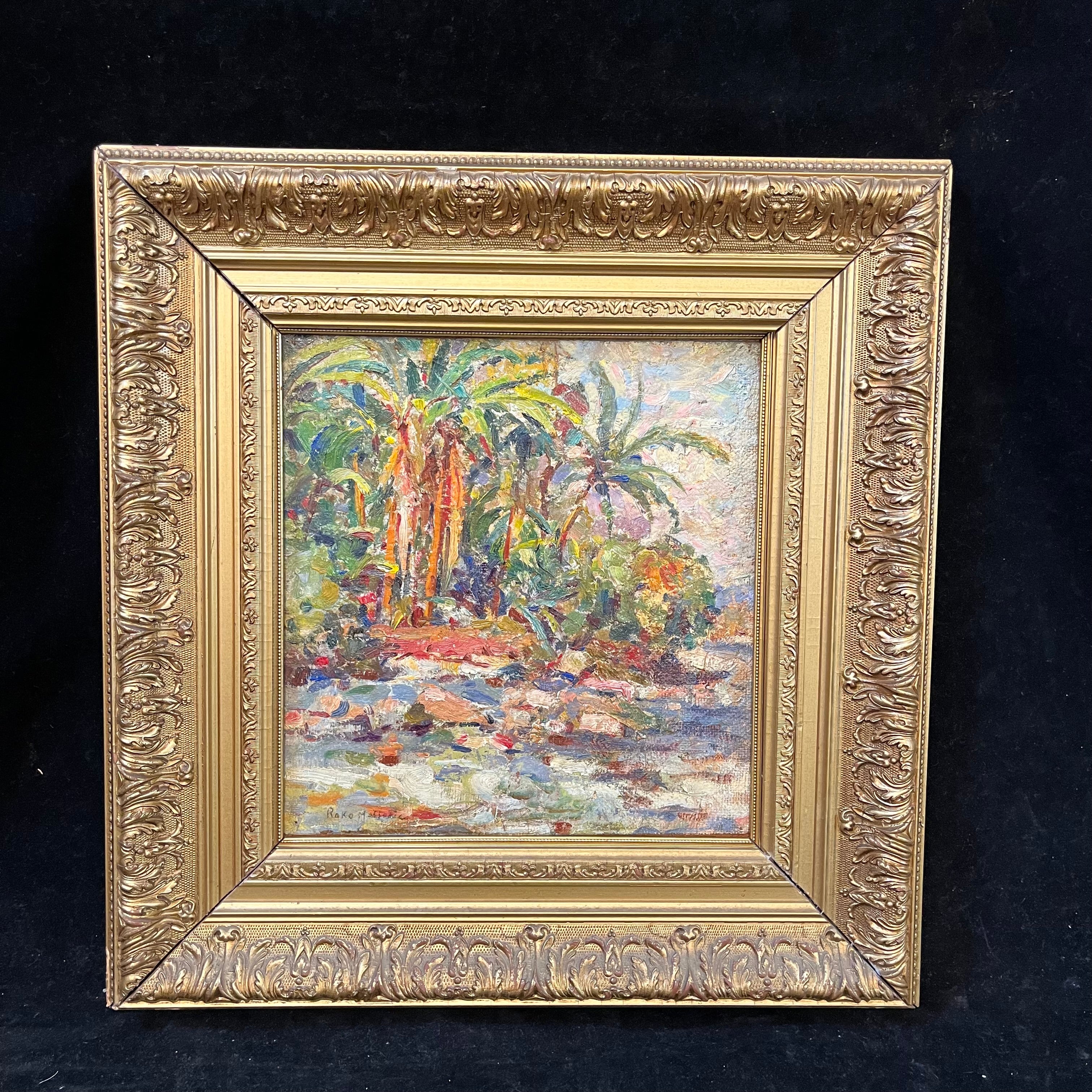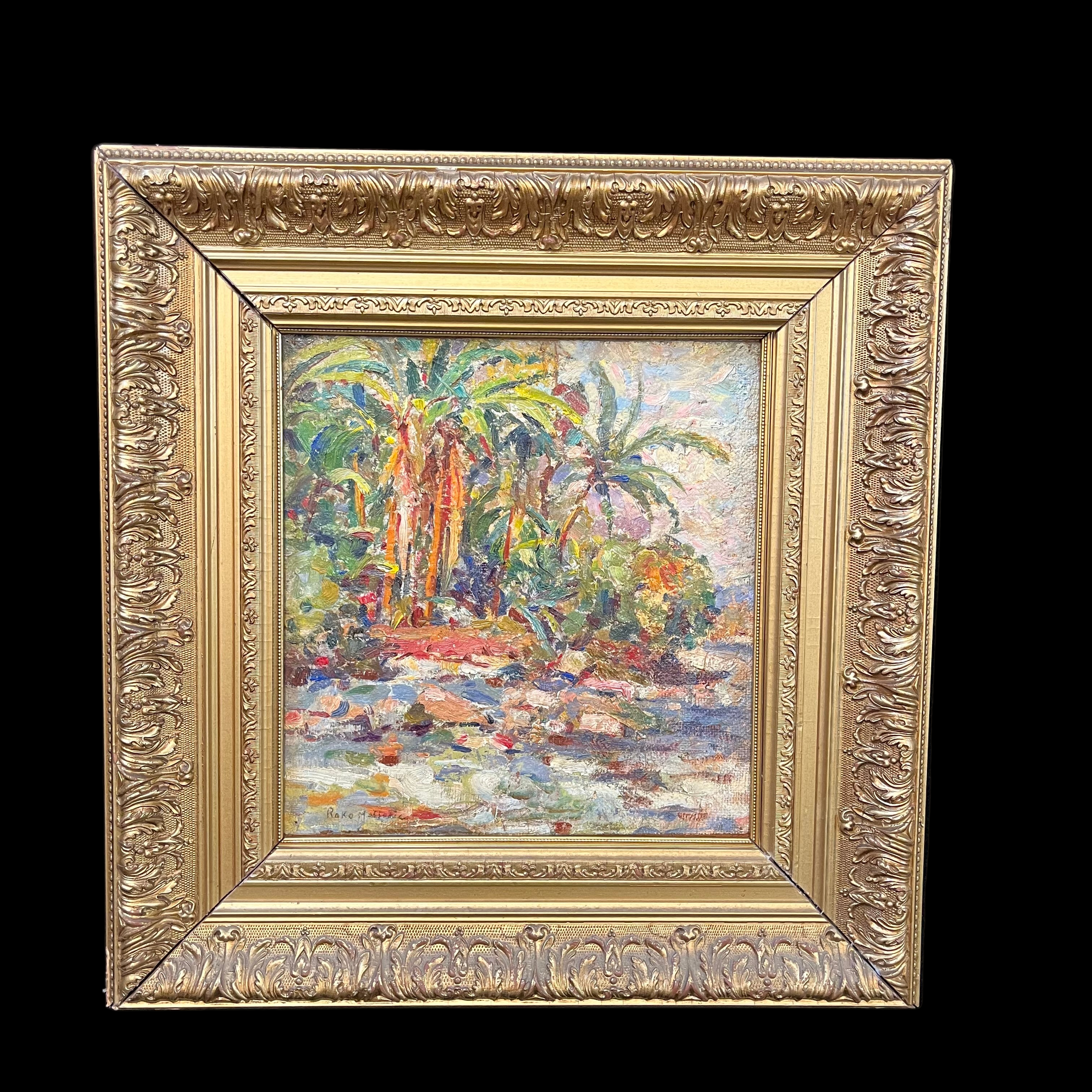 Colorida pintura del artista chileno Roko Matjasic que nos entrega un bello paisaje cargado de vegetación nativa y donde resaltan majestuosas palmas chilenas, con una marcada pincelada y colores provocadores.