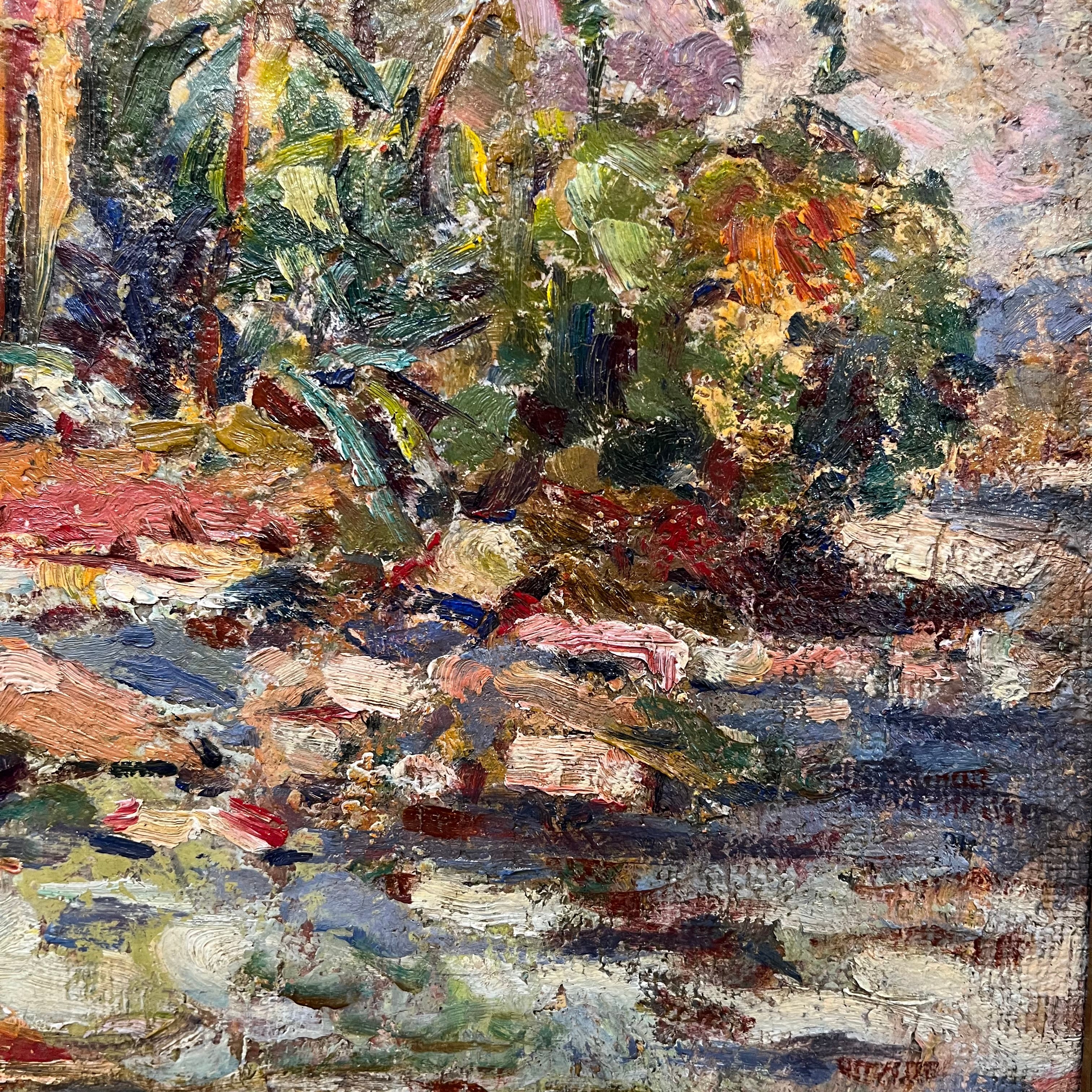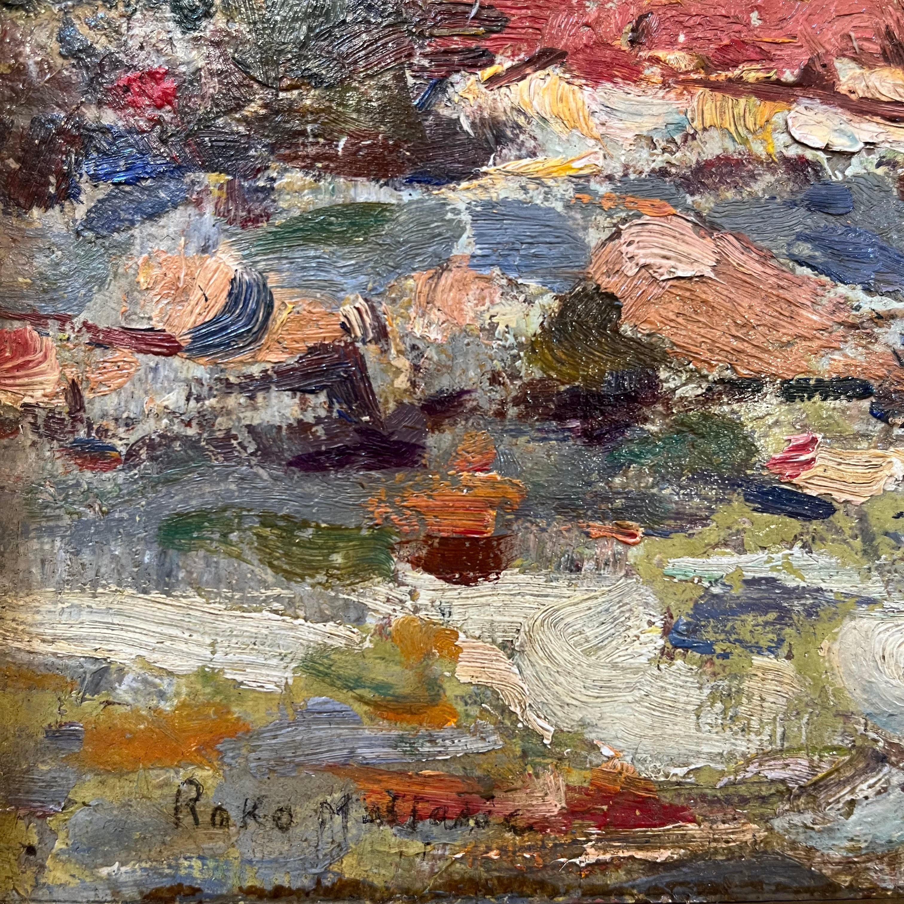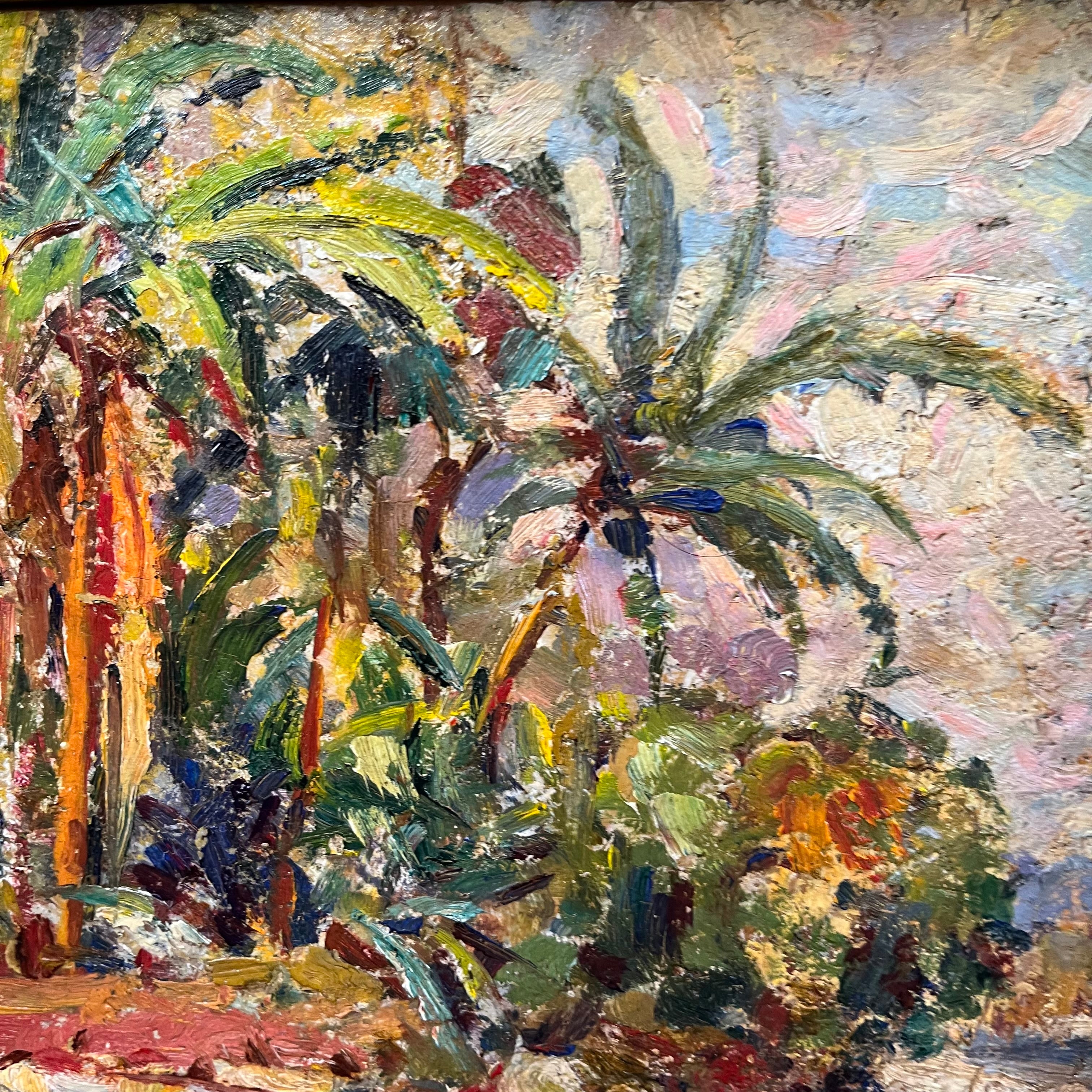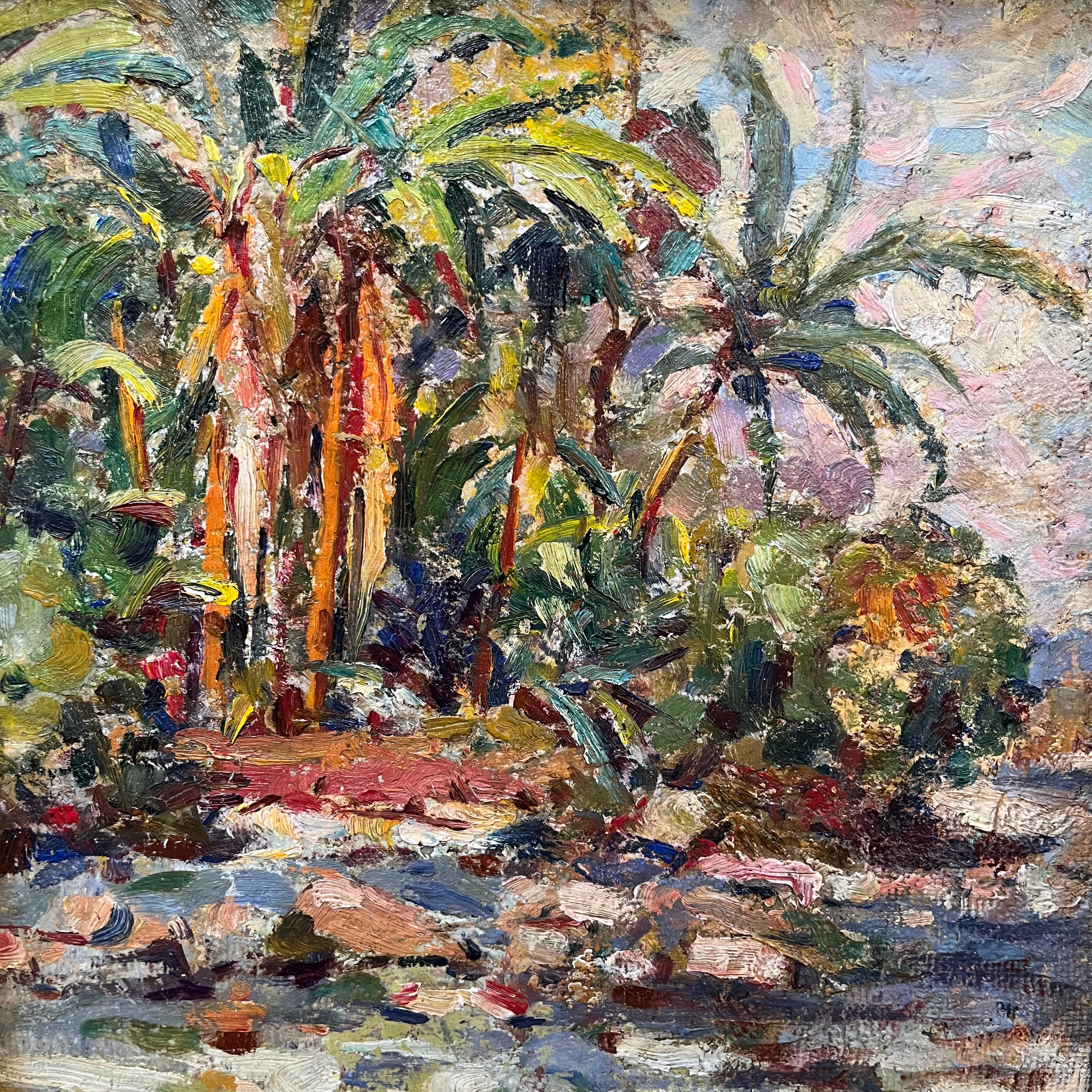 Colorida pintura del artista chileno Roko Matjasic que nos entrega un bello paisaje cargado de vegetación nativa y donde resaltan majestuosas palmas chilenas, con una marcada pincelada y colores provocadores.
