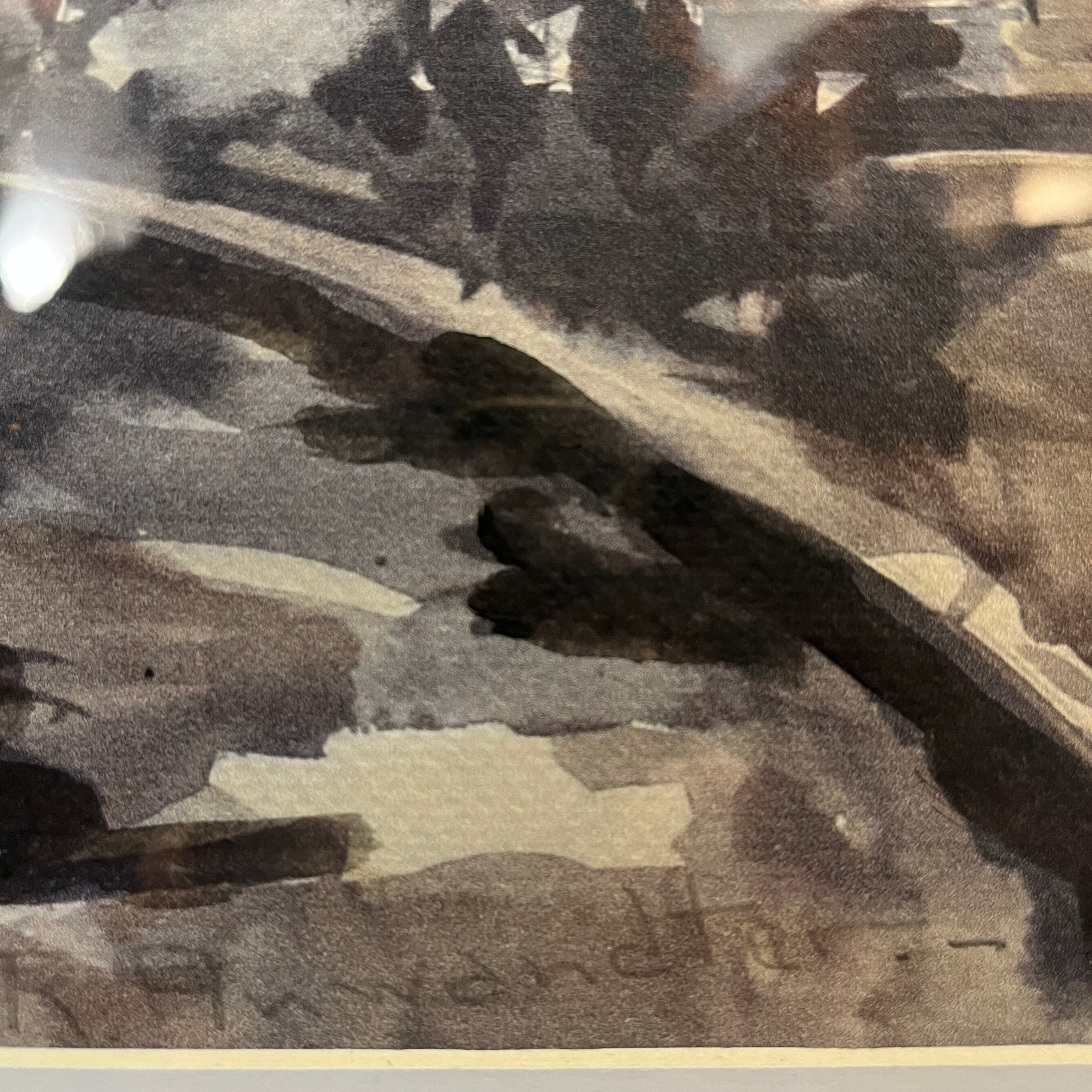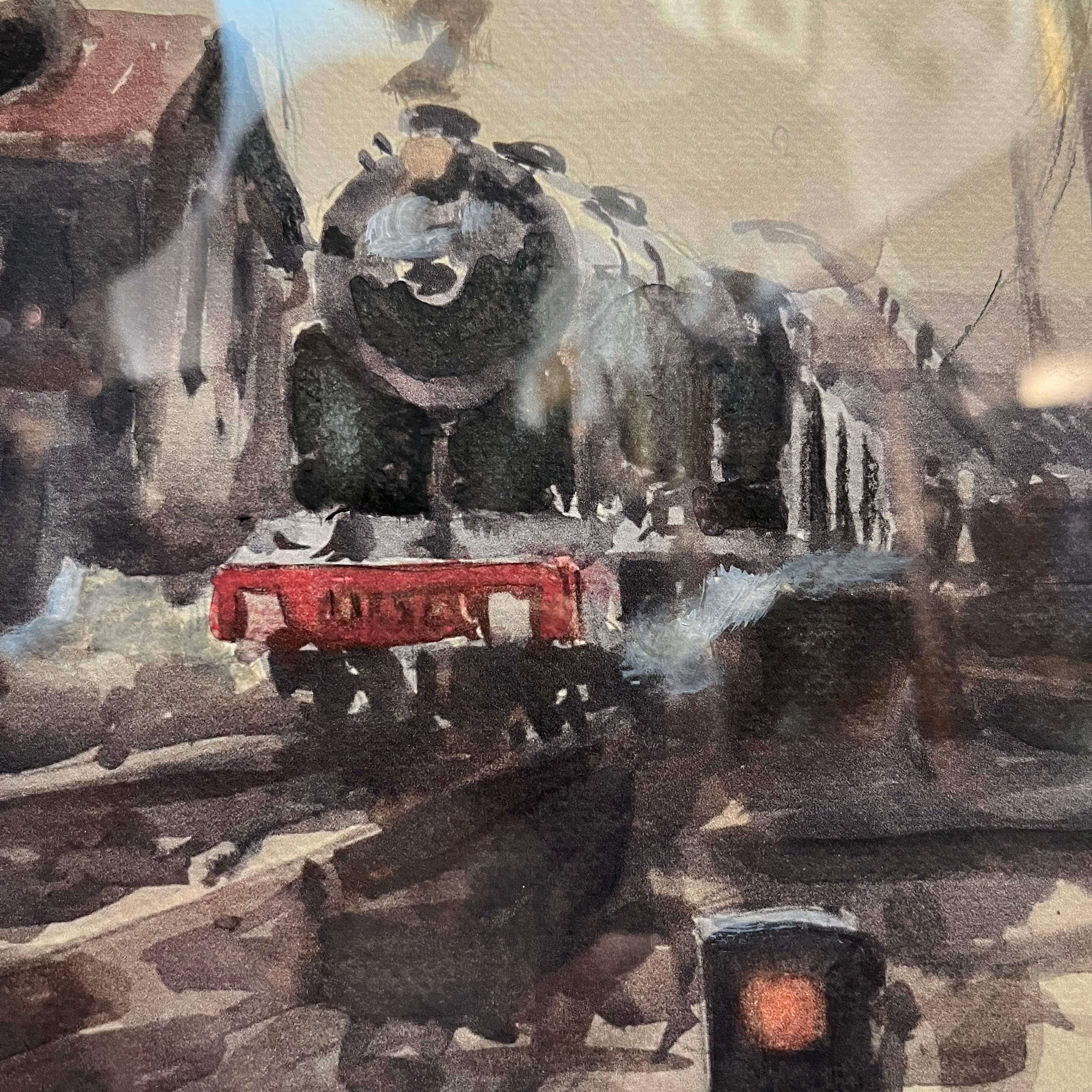 Acuarela sobre papel del artista chileno Ricardo Anwandter. representando unas locomotoras en movimiento, resaltando rojos en un entorno en tonos grises. La obra está enmarcada en madera delgada y vidrio.