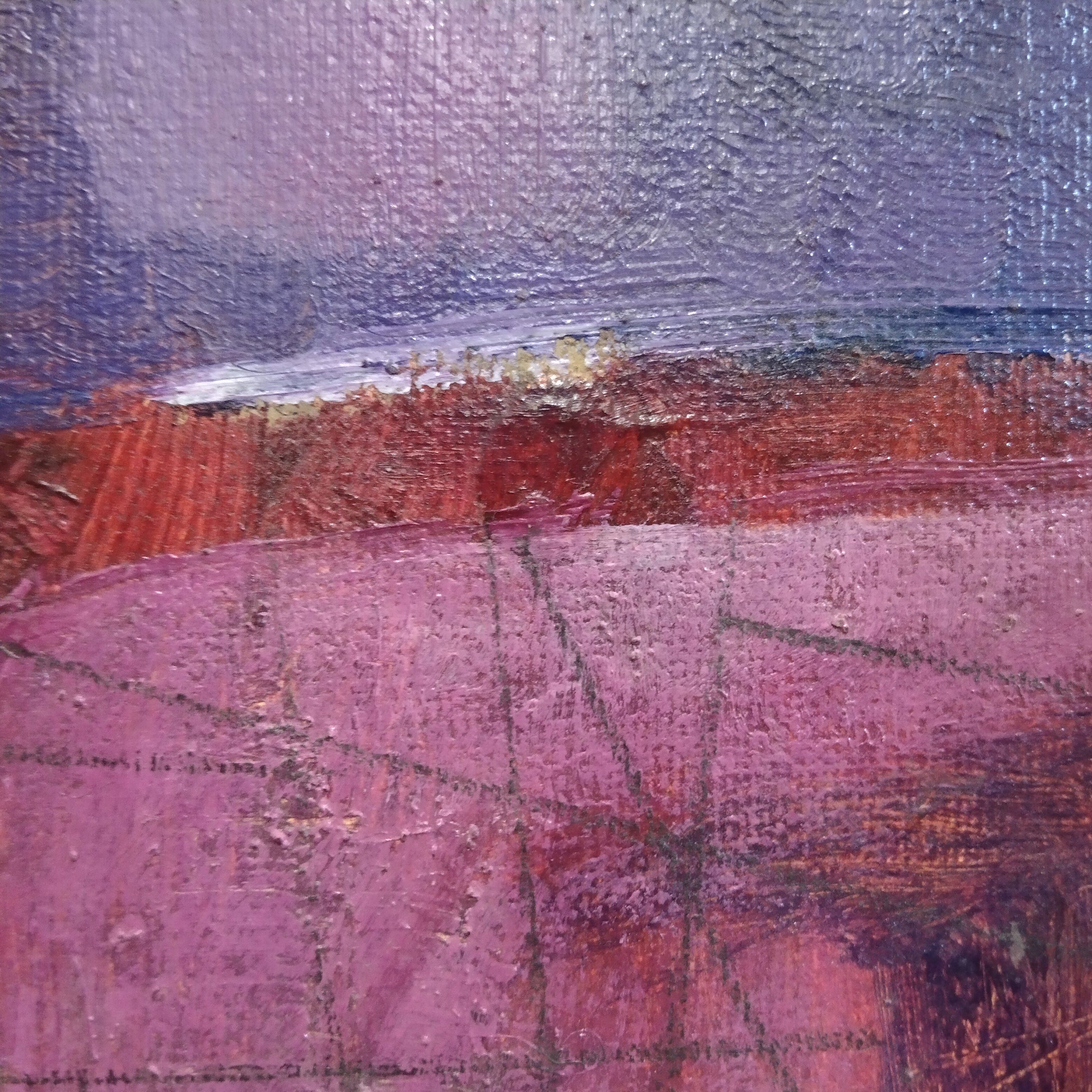 Óleo sobre cartón en pequeño formato de Giancarlo Bertini. El artista chileno utiliza la figura de la vaca -motivo recurrente en su obra- como un símbolo de la humanidad en búsqueda de un camino, migrando en un espacio sin límites.