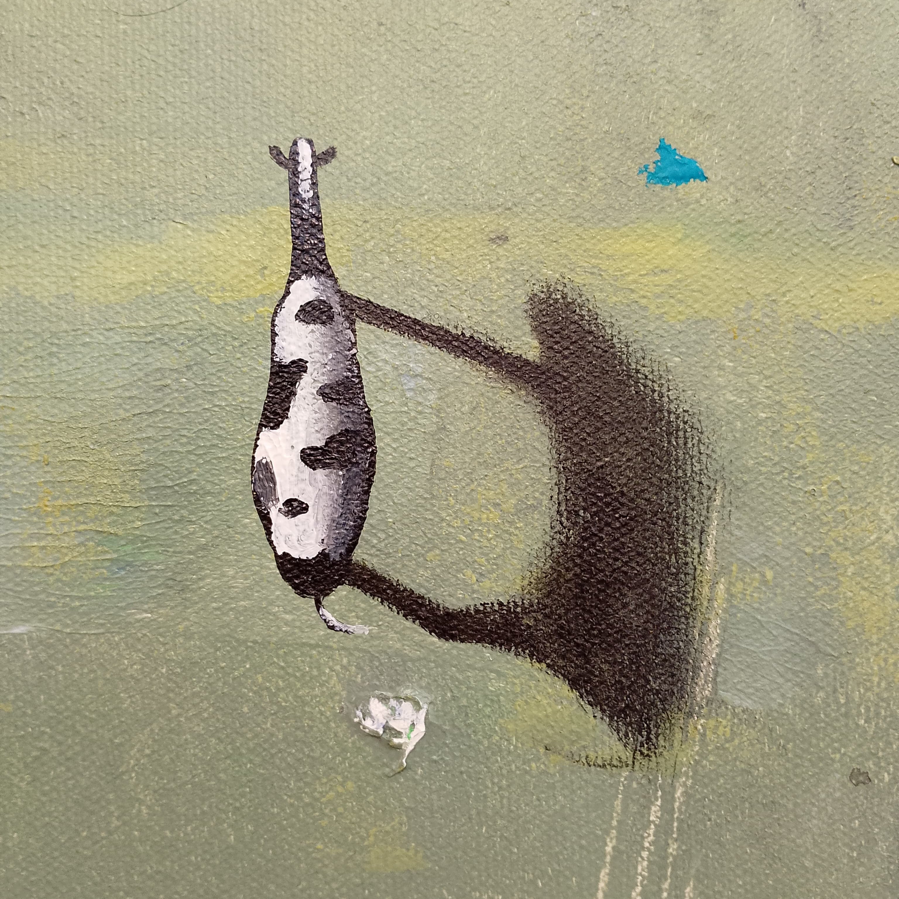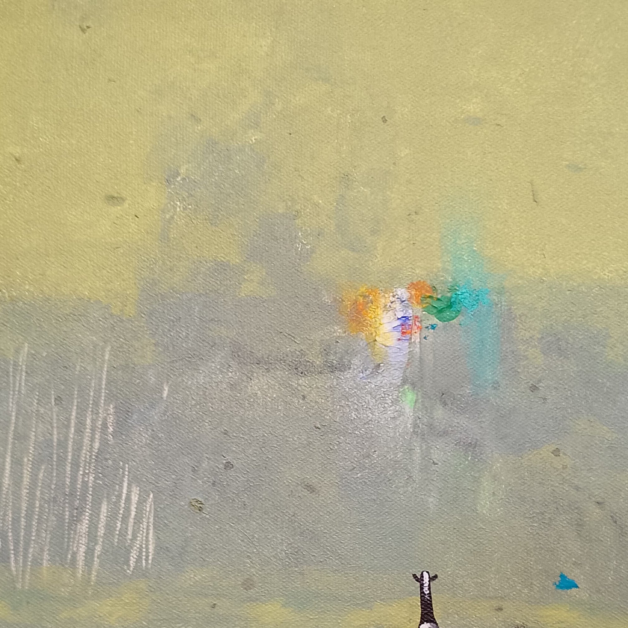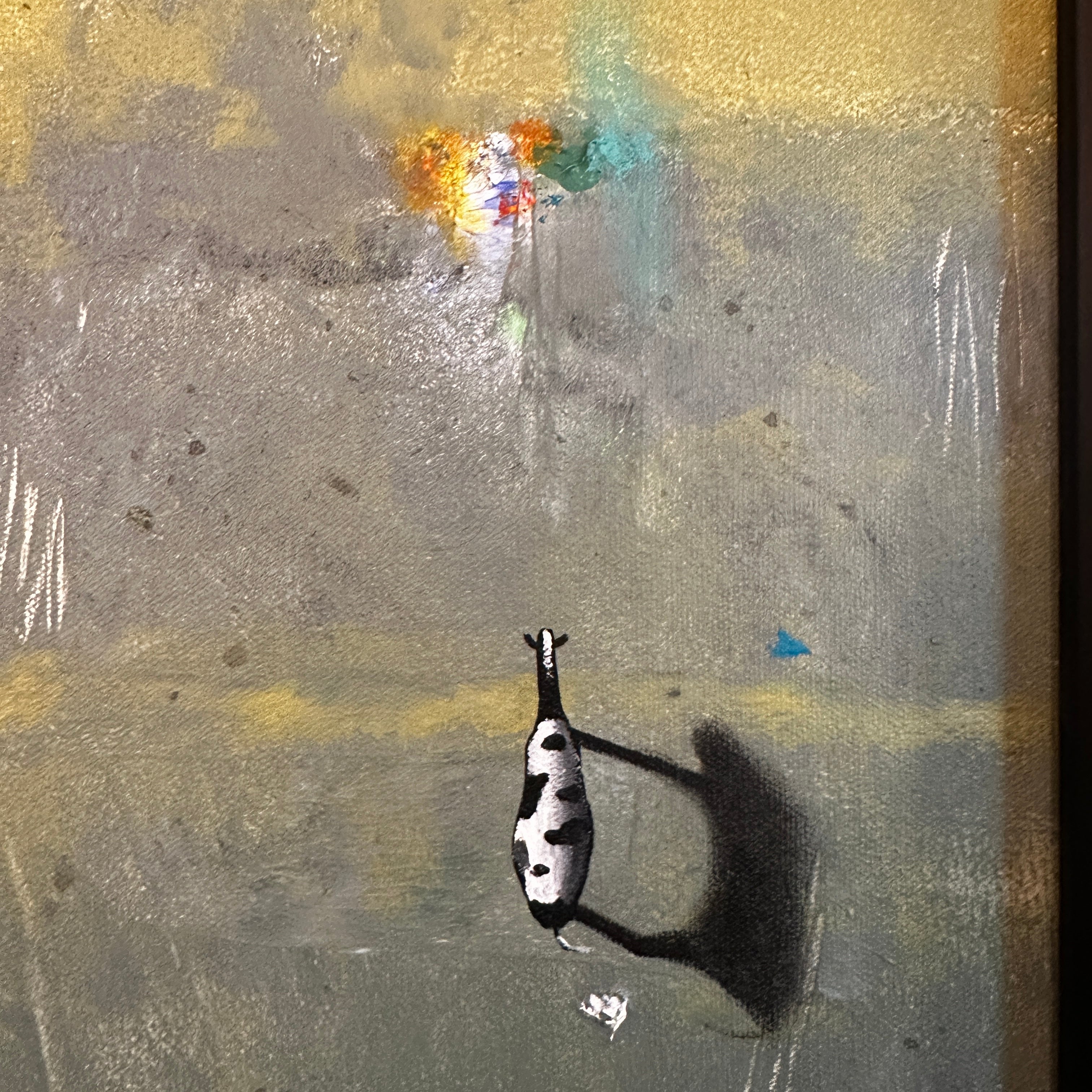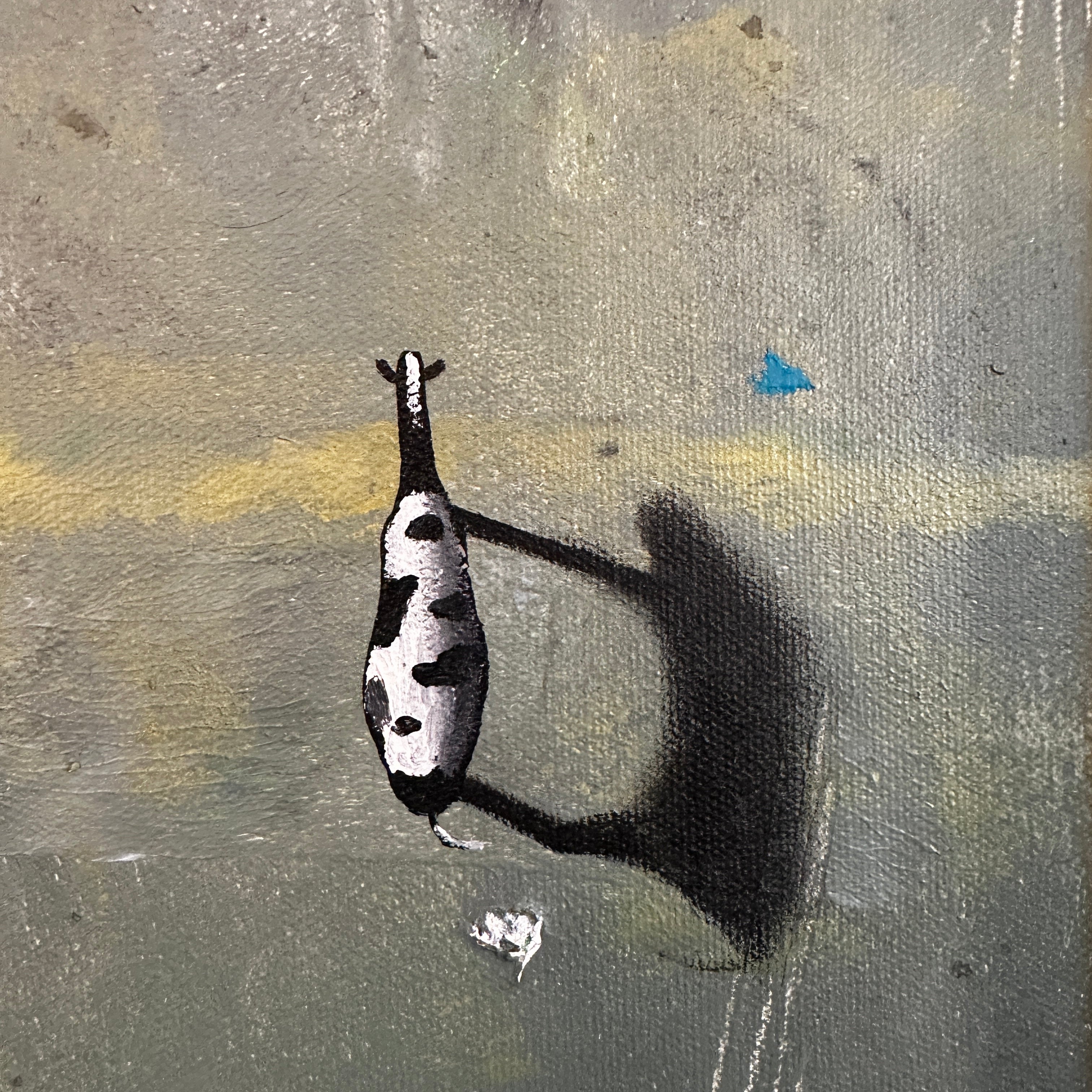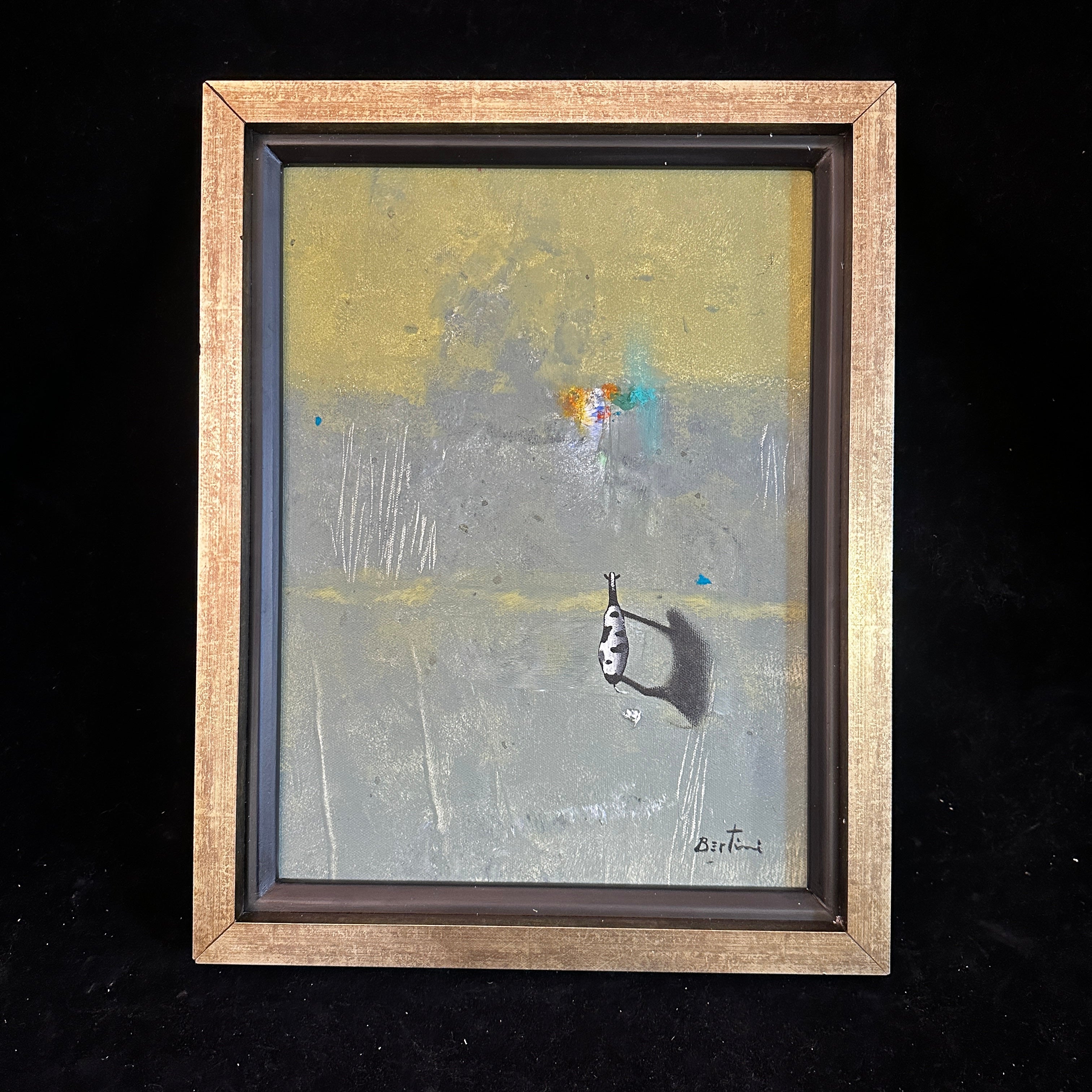 Óleo sobre cartón en pequeño formato de Giancarlo Bertini. El artista chileno utiliza la figura de la vaca -motivo recurrente en su obra- como un símbolo de la humanidad en búsqueda de un camino, migrando en un espacio sin límites.