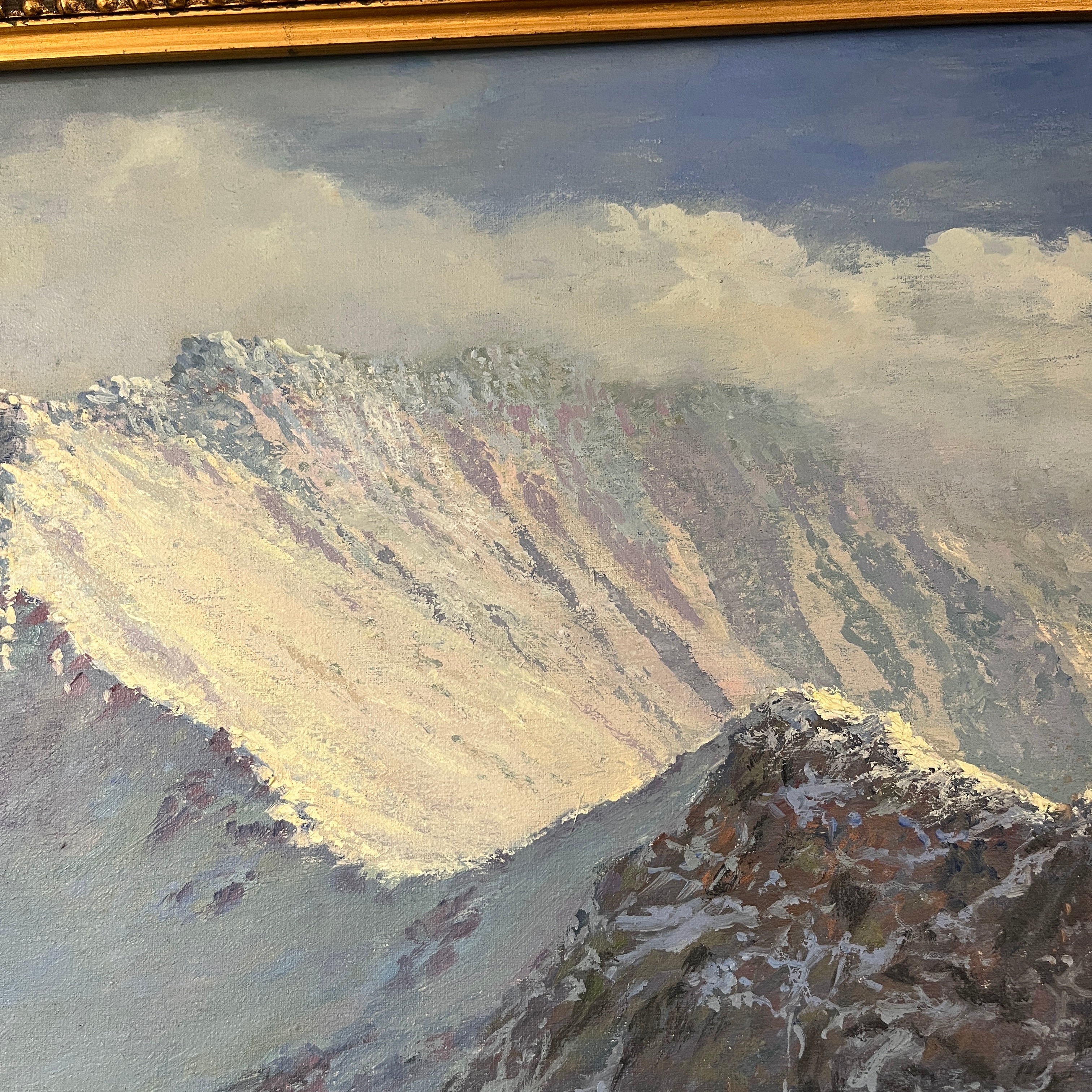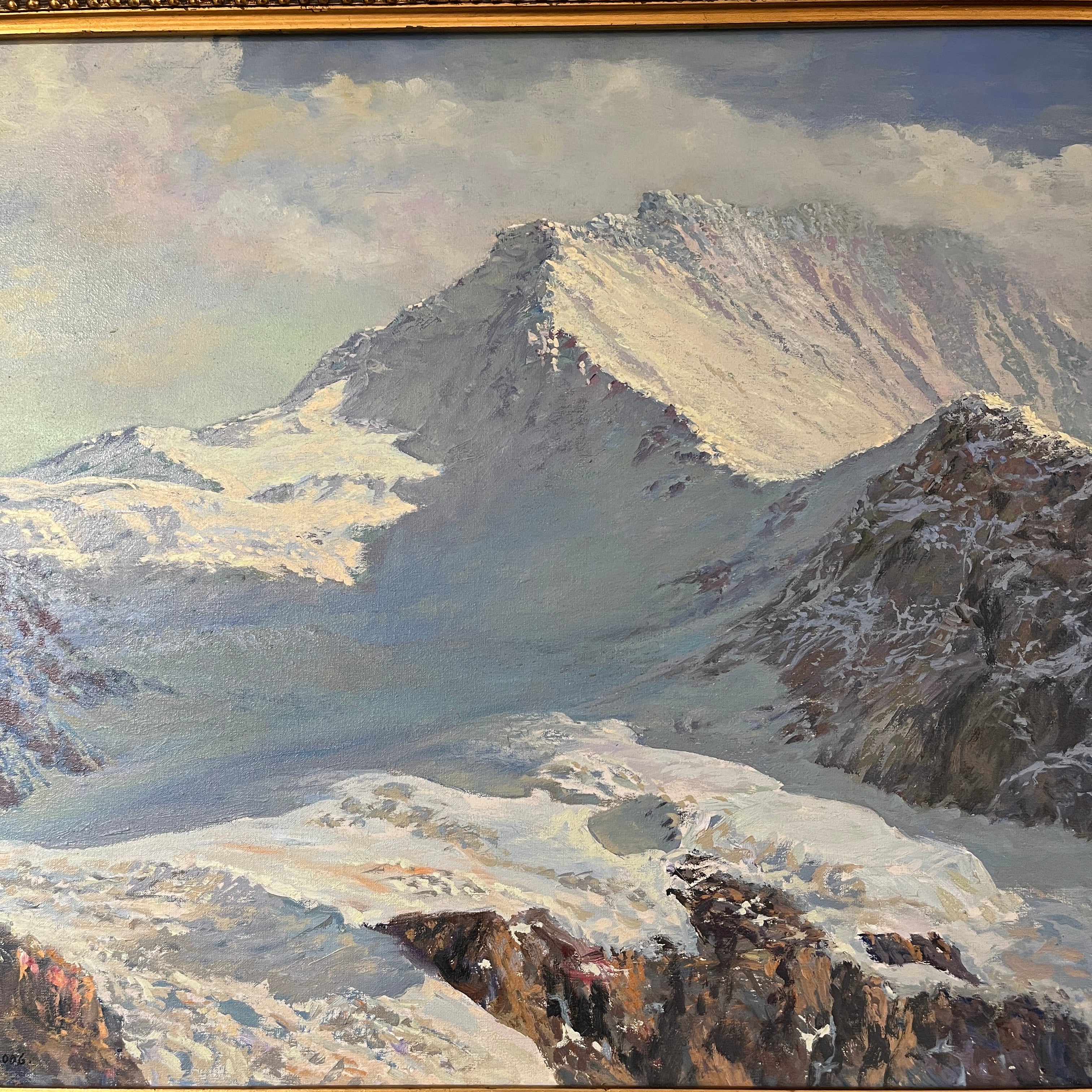 Especial óleo posiblemente de la Cordillera de los Andes. Lo especial de esta pintura radica en que lo que busca es prácticamente hacer un homenaje a la hermosa cordillera que nos acompaña. Podemos apreciar sus picos nevados y zonas rocosas y escarpadas. El paisaje es acompañado por un cielo azul cubierto de pomposas nubes. Si bien es un cuadro que en la firma data el año 2006, tiene las características pictóricas del estilo clásico de la pintura chilena