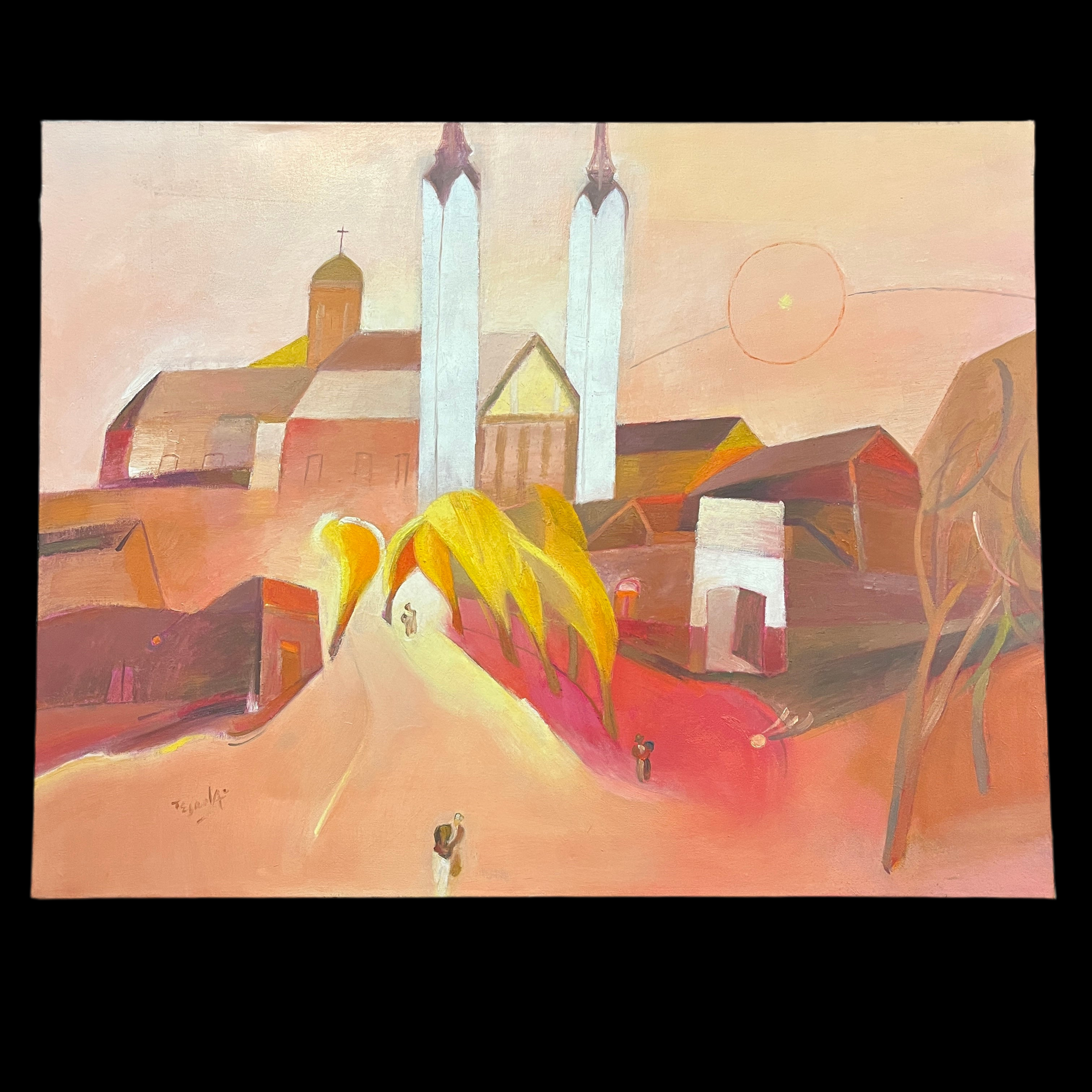 Precioso óleo del artista chileno Luís Tejada que nos presenta un paisaje rural con su camino central como queriendo invitarnos a transitarlo. Destaca la calidez de la paleta de colores lo que brinda por un lado tranquilidad, pero con unos ondeantes árboles en tono amarillo intenso, que nos piden que los miremos. También podemos encontrar pequeños personajes circulando en este pueblo que parece de fantasía.