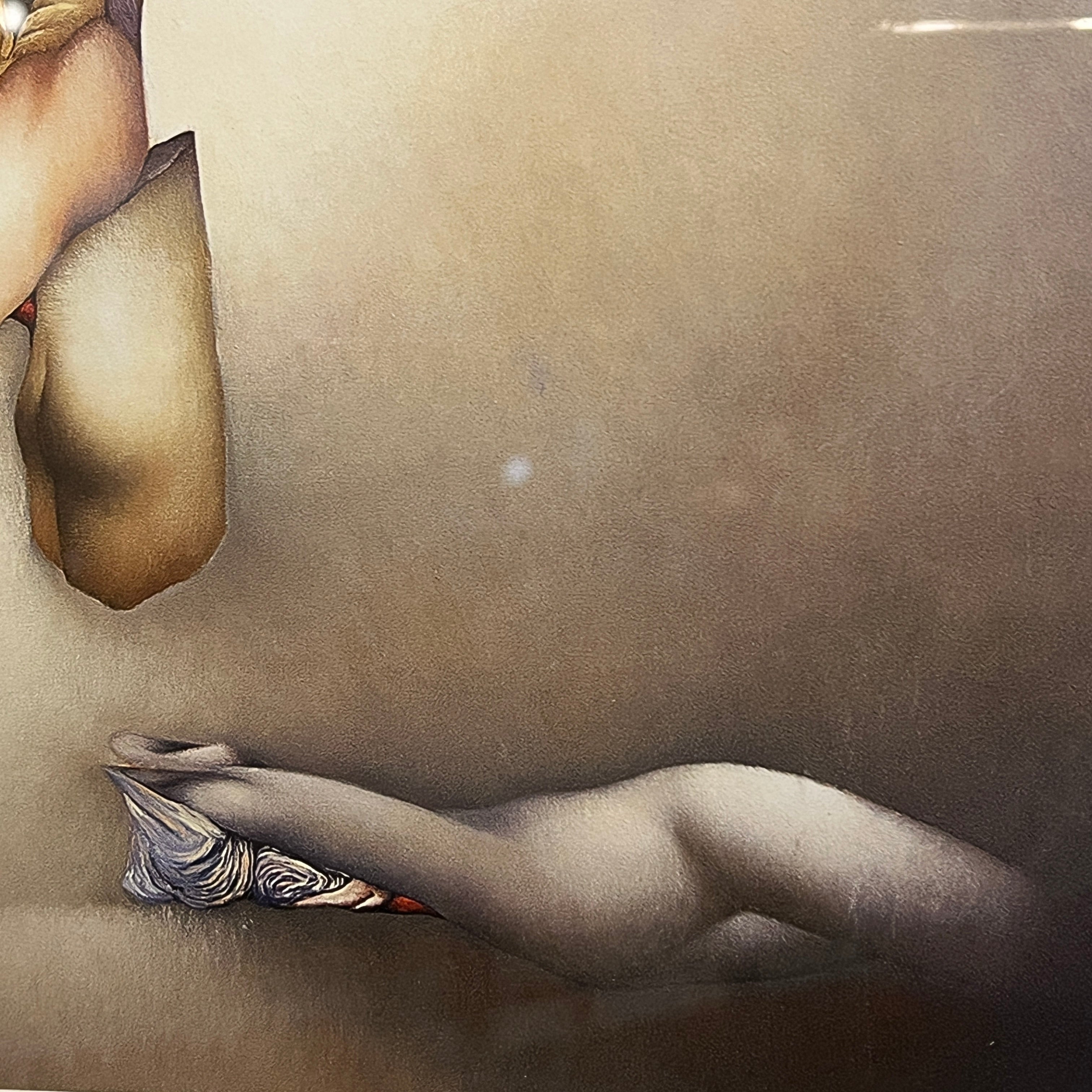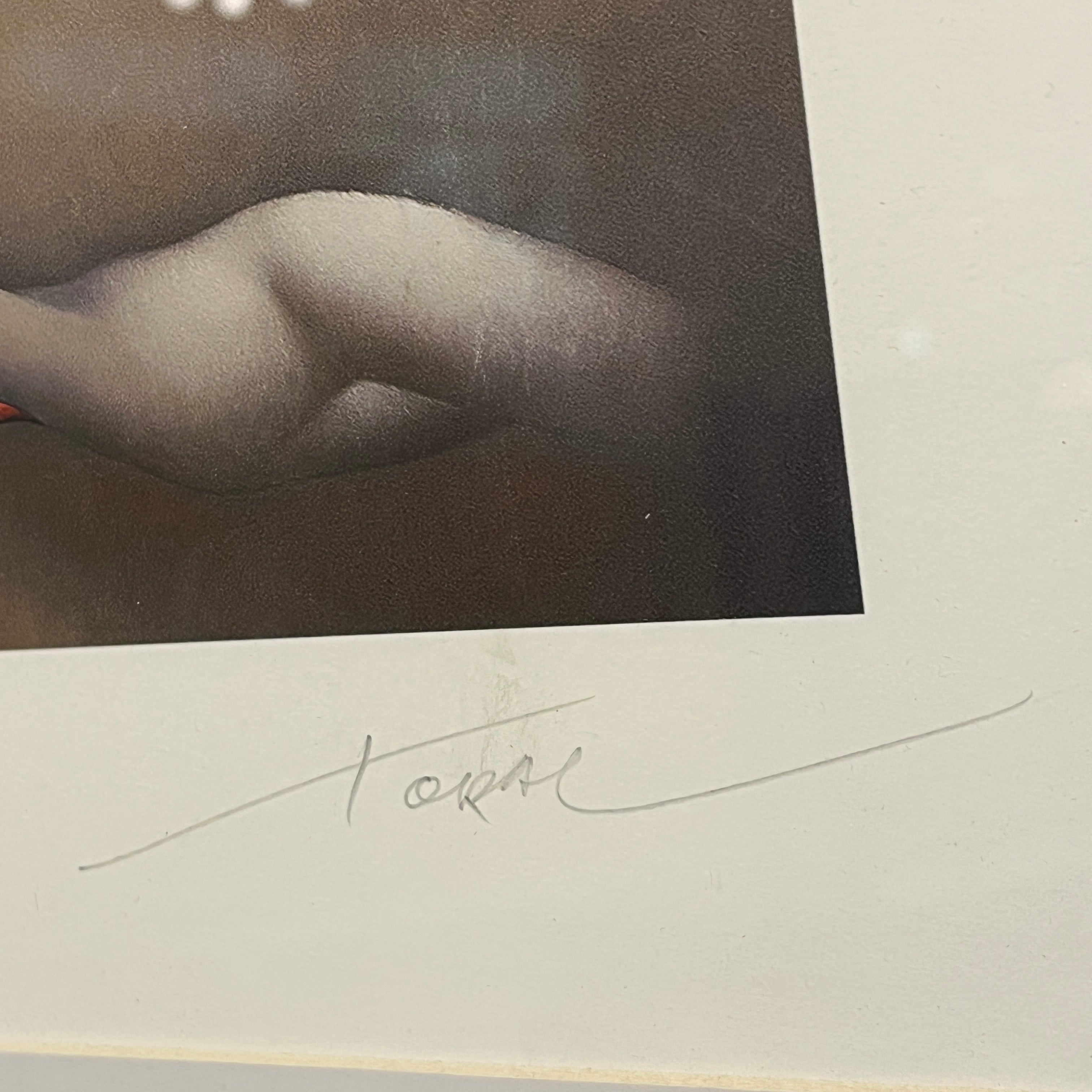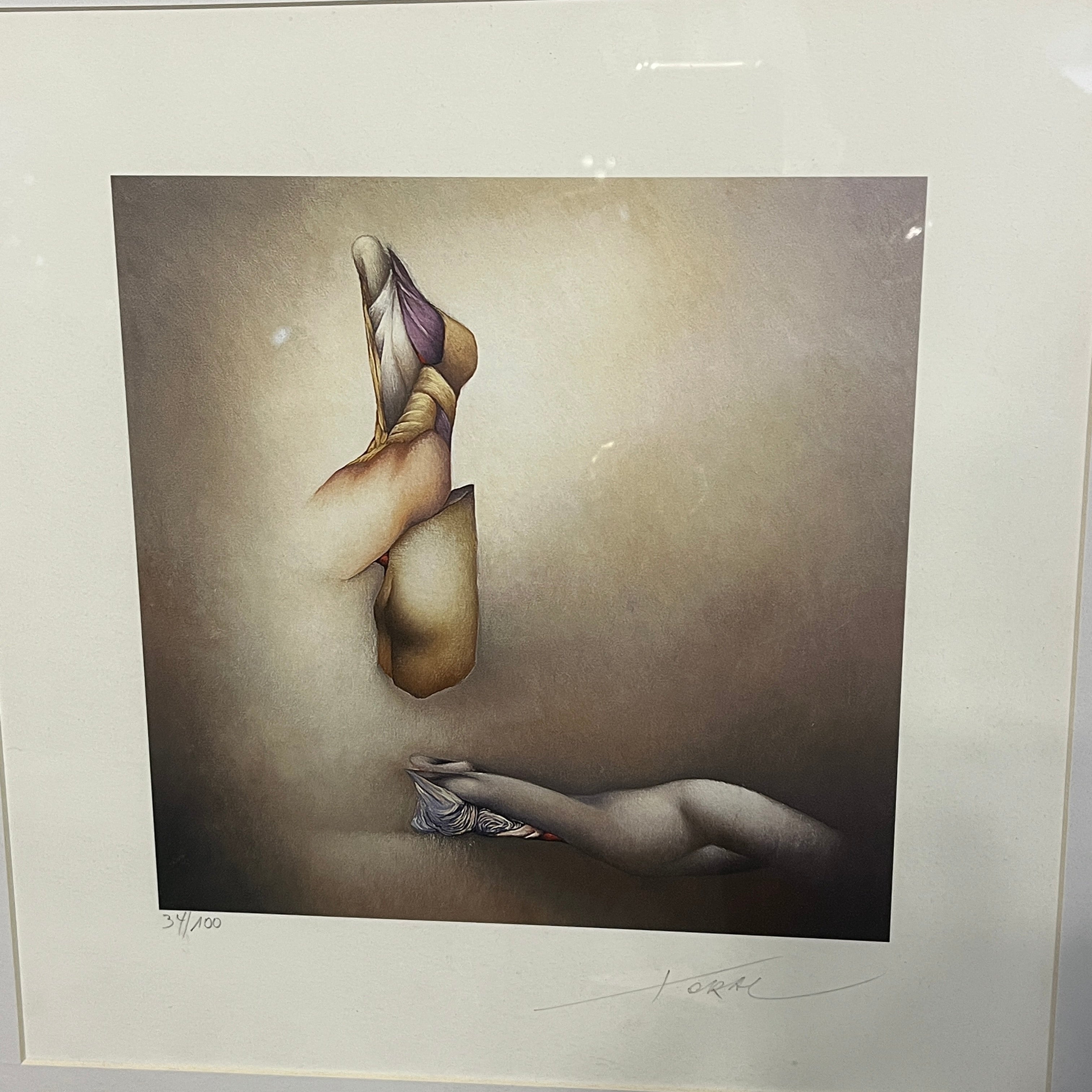 Grabado digital en técnica Gicleé sobre papel de algodón del reconocido artista chileno Mario Toral. La obra, formada y numerada con el ejemplar 31/100, representa dos cuerpos suspendidos en el espacio, a momentos sugiriendo y entrelazando siluetas humanas y minerales. La obra tiene un marco de madera terminada en dorado.