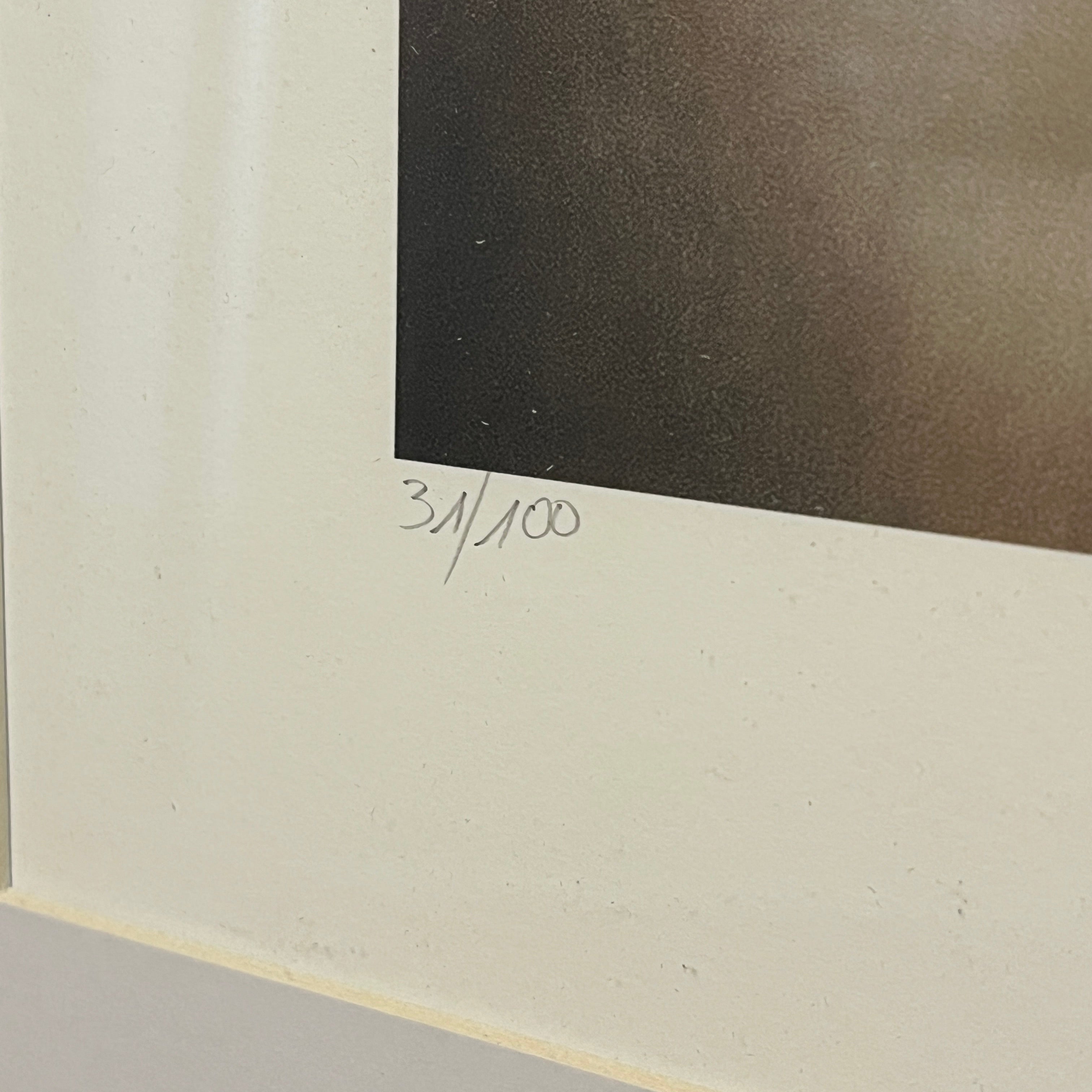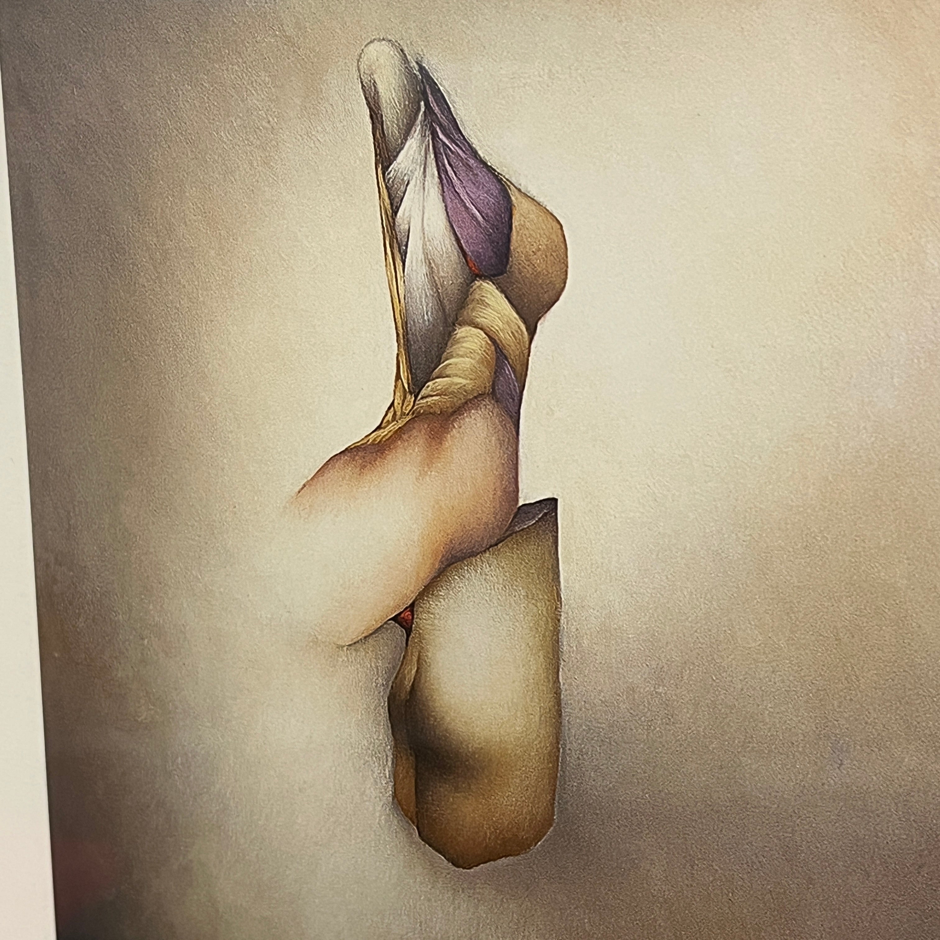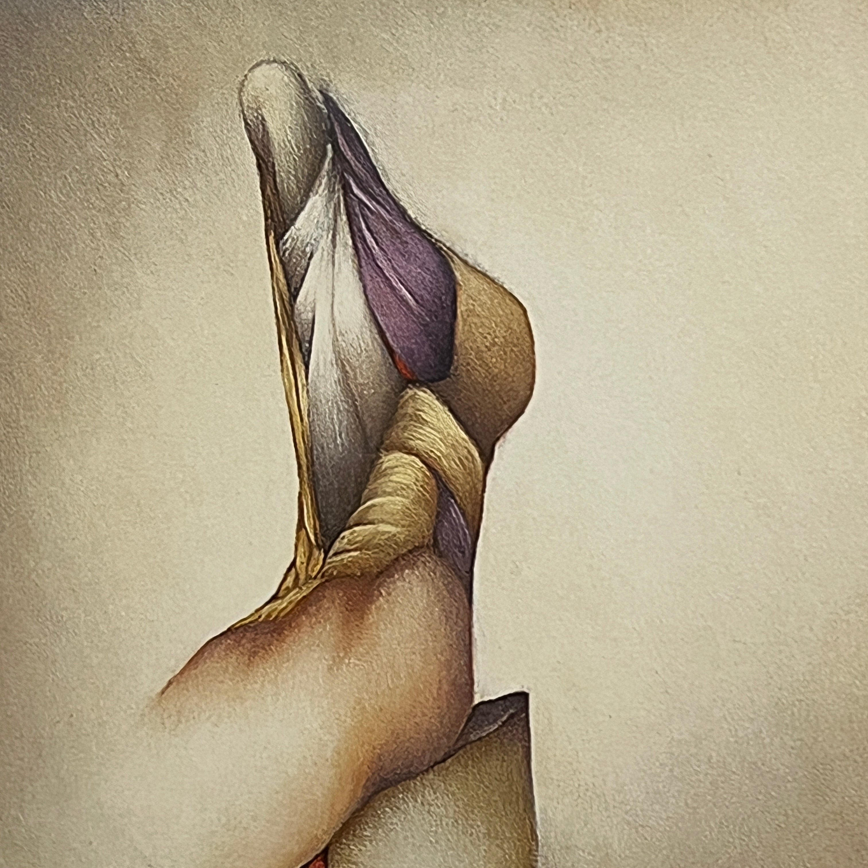 Grabado digital en técnica Gicleé sobre papel de algodón del reconocido artista chileno Mario Toral. La obra, formada y numerada con el ejemplar 31/100, representa dos cuerpos suspendidos en el espacio, a momentos sugiriendo y entrelazando siluetas humanas y minerales. La obra tiene un marco de madera terminada en dorado.