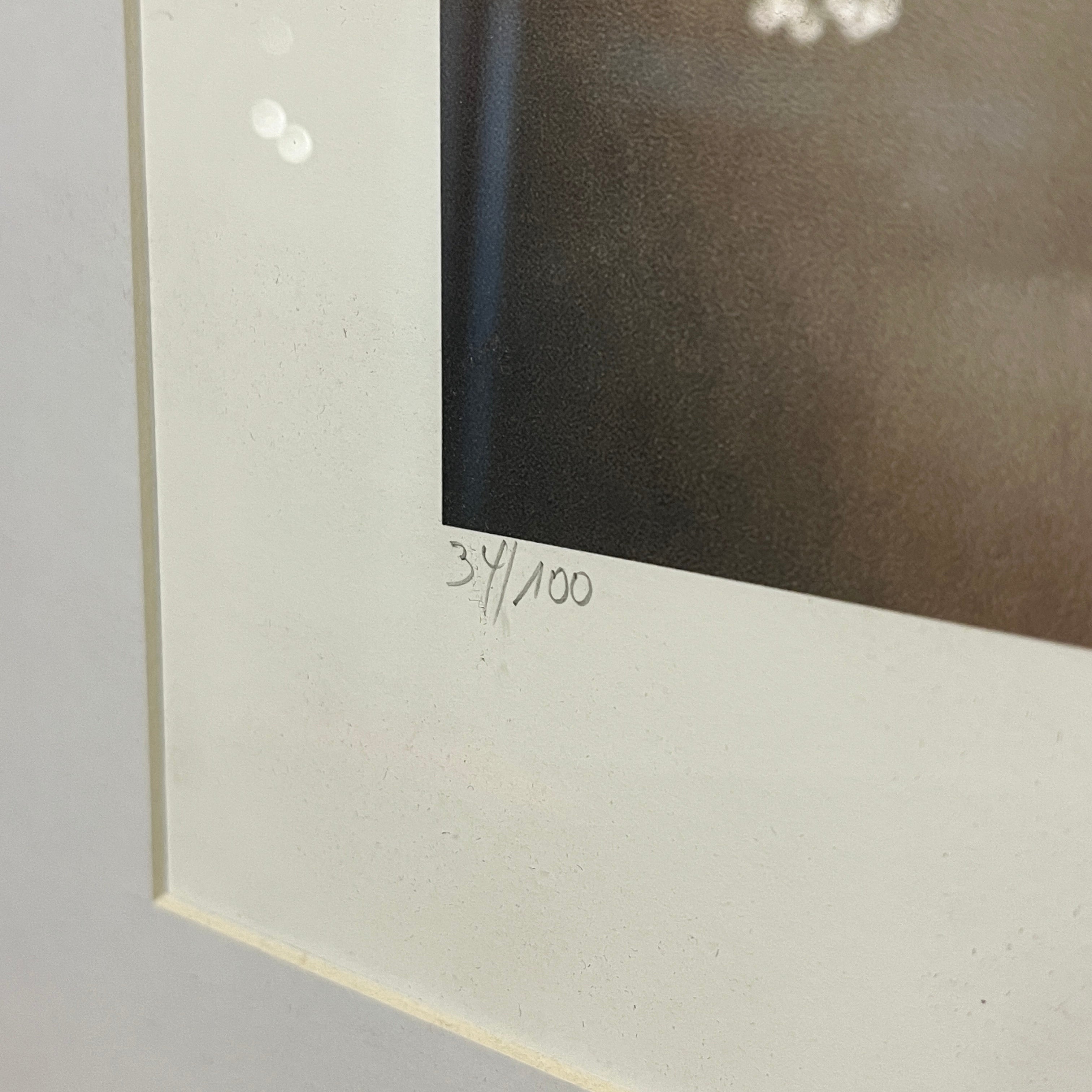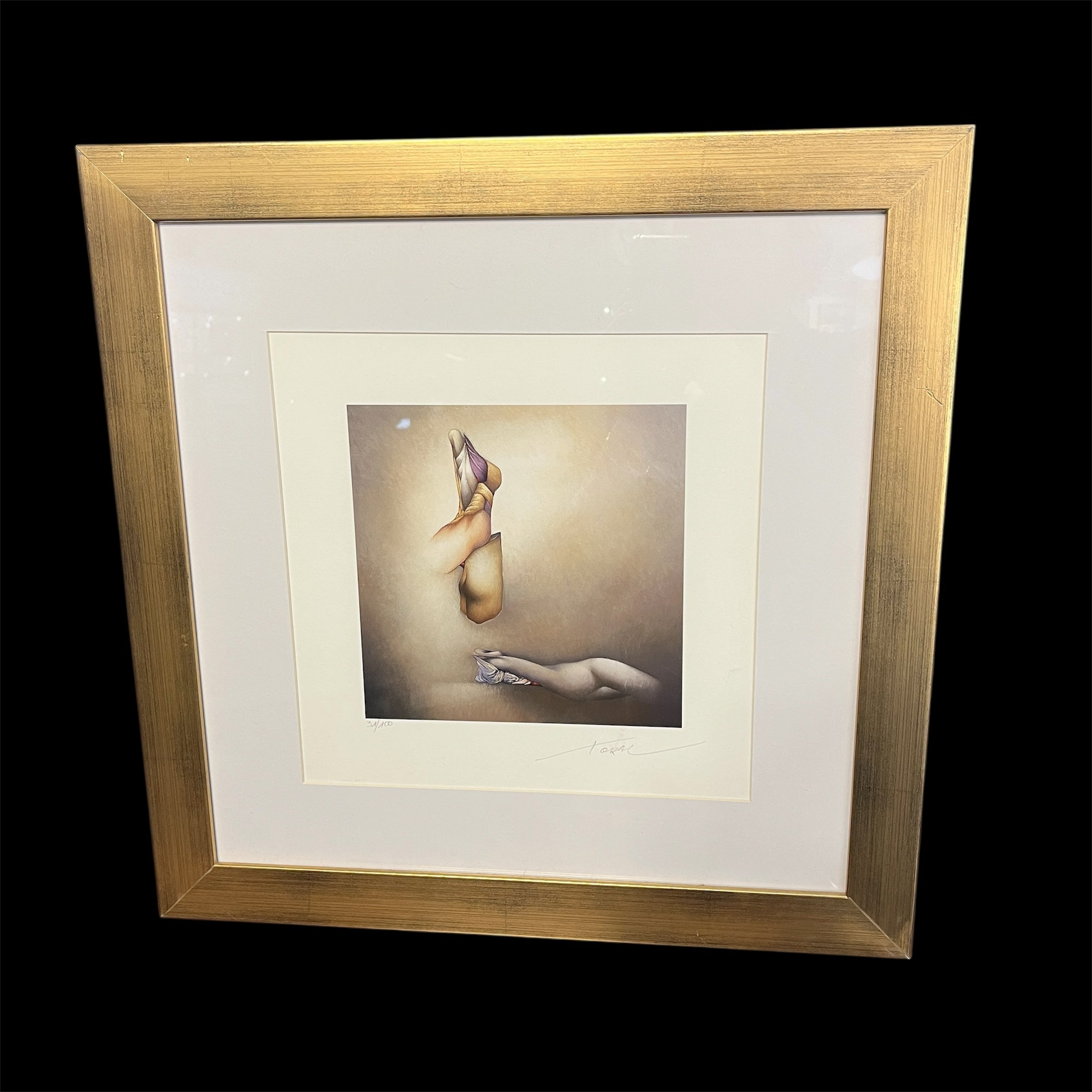 Grabado digital en técnica Gicleé sobre papel de algodón del reconocido artista chileno Mario Toral. La obra, formada y numerada con el ejemplar 34/100, representa dos cuerpos suspendidos en el espacio, a momentos sugiriendo y entrelazando siluetas humanas y minerales. La obra tiene un marco de madera terminada en dorado.