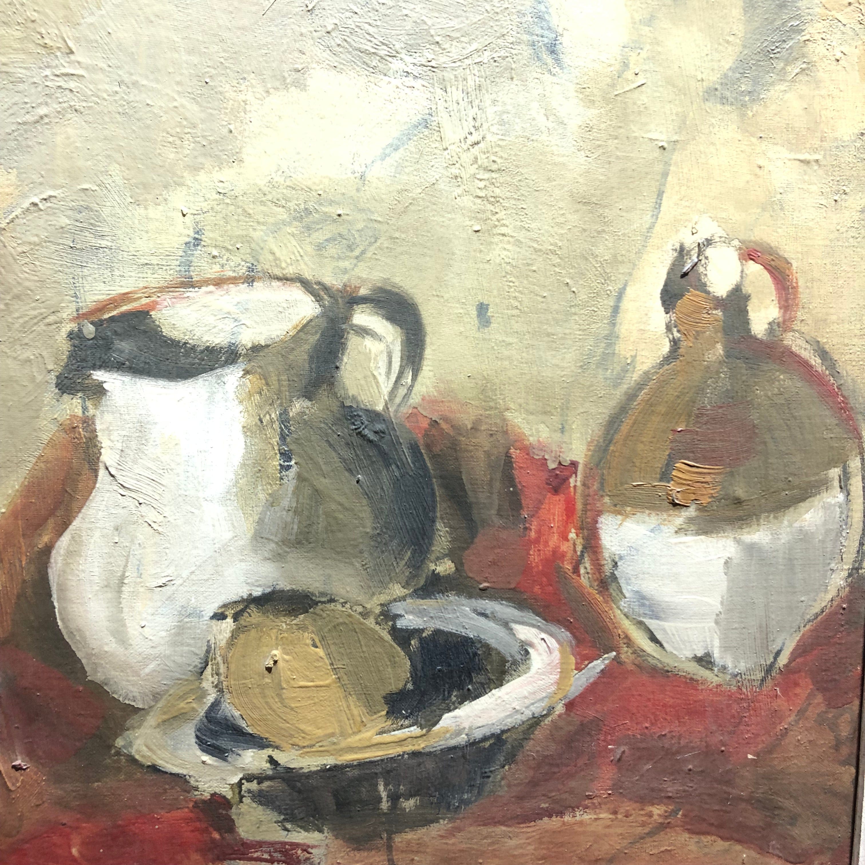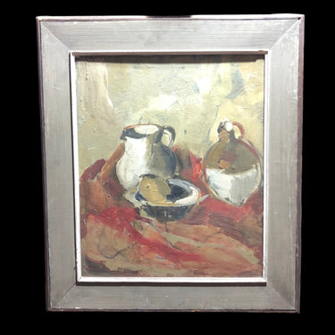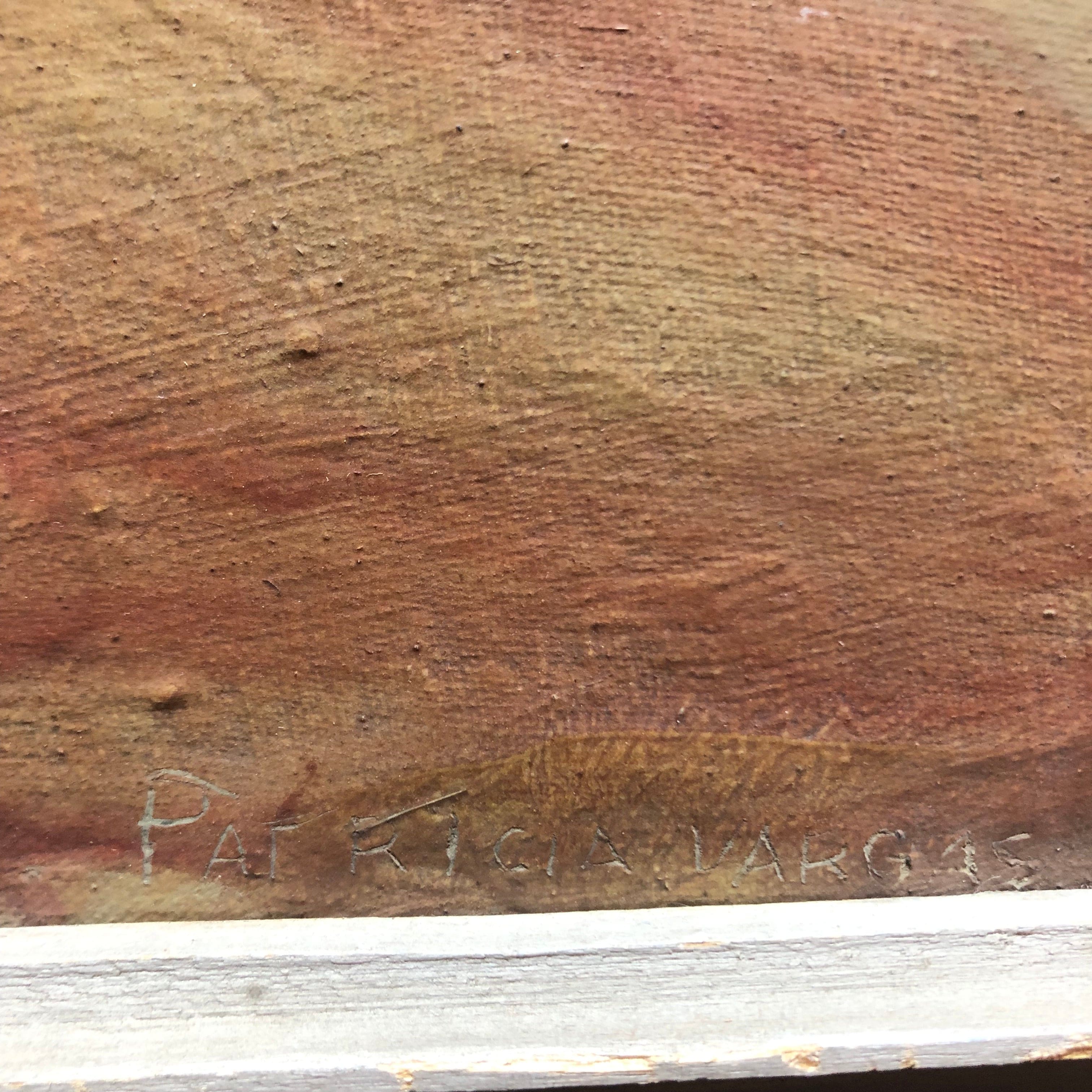 Hermoso oleo de la artista nacional Patricia Vargas (25 de diciembre de 1949) quien es una artista visual, dibujante, escultora. En esta obra vemos objetos de mesa sobre un mantel en tonos tierras. Marco de madera en tono gris y cafe.