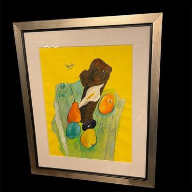 Óleo sobre papel del artista chileno Luis Tejada, representando un bodegón de frutas sobre un mantel en tonos verdes y azules, con un llamativo fondo amarillo. En el centro de la composición hay también una cala. La obra es una interpretación del artista de una temática tan tradicional en la historia del arte, como es el bodegón, dándole su característica impronta de color y geometría. Otro elemento interesante es la proyección de líneas desde el dibujo, sugiriendo una especie de boceto o estudio de perspectiva existente debajo de la pintura. La obra está enmarcada en madera, de diseño sobrio y terminación plateada.