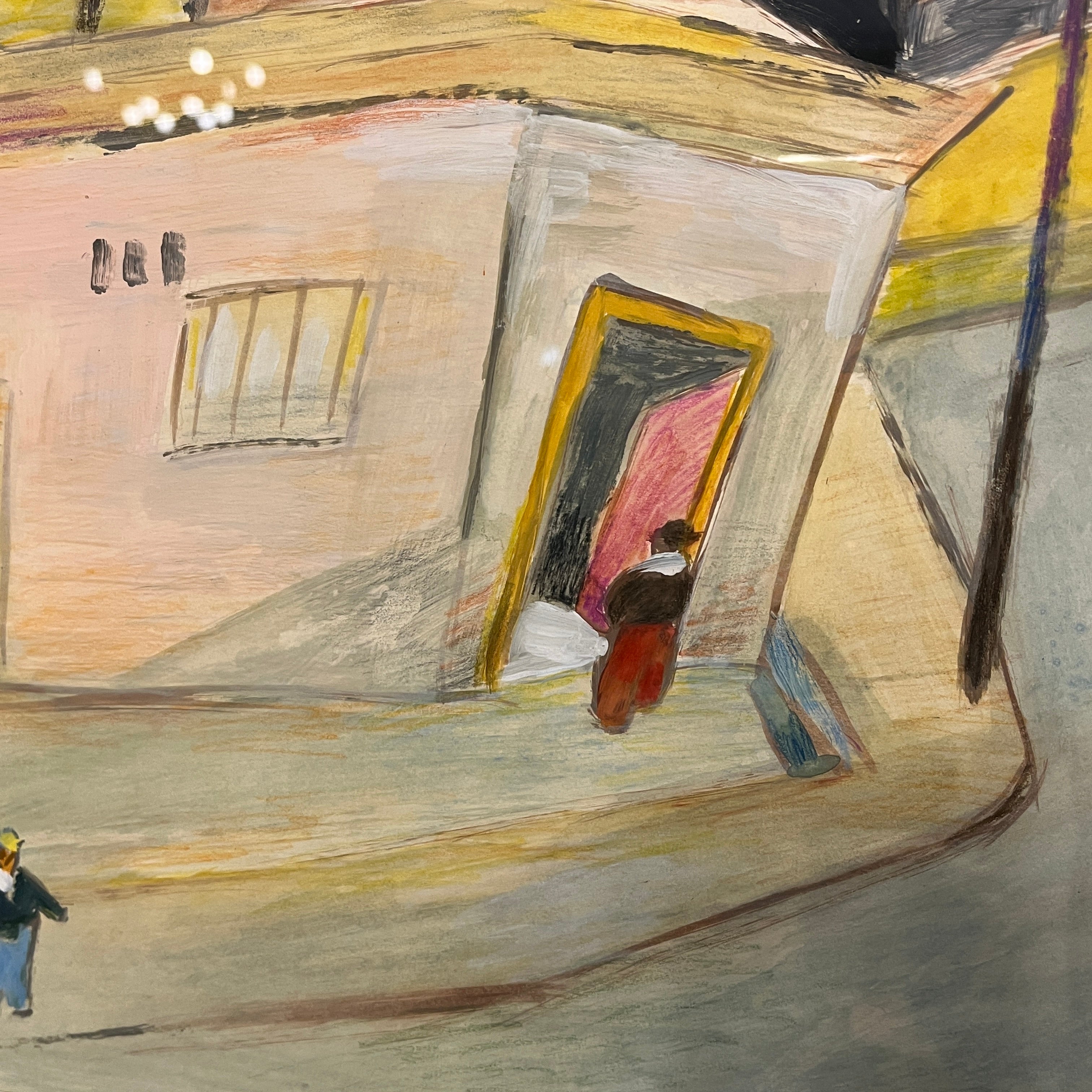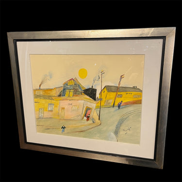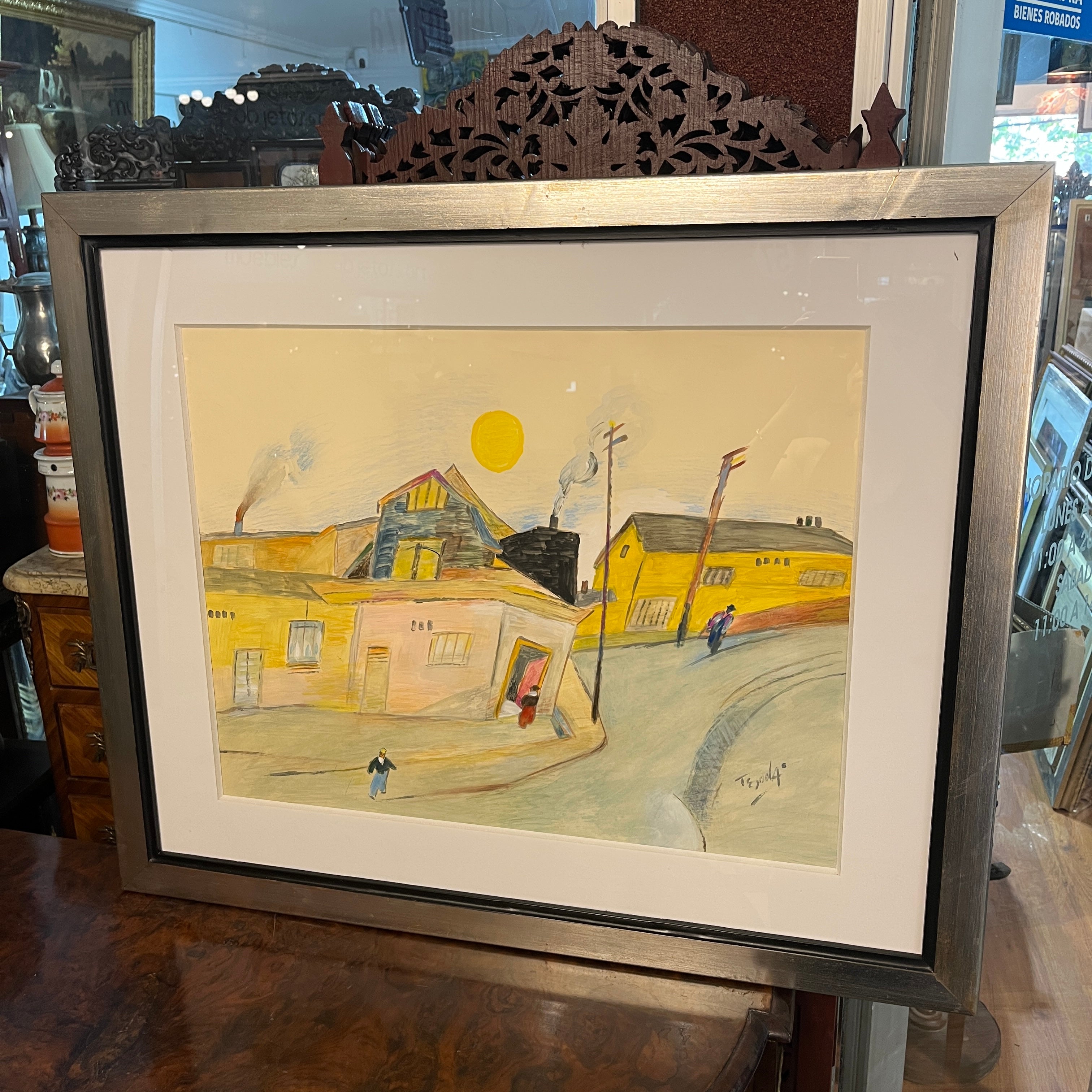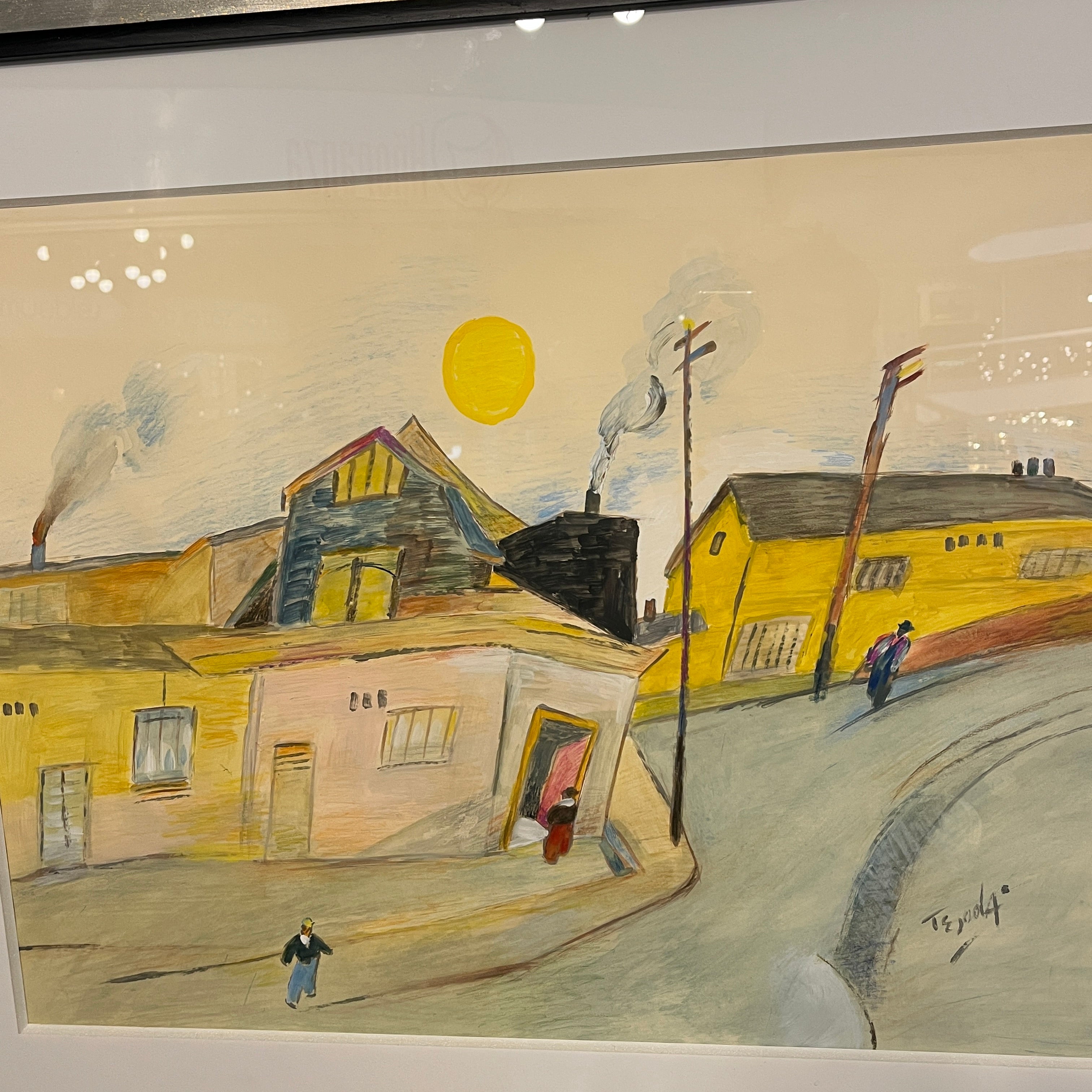 Óleo sobre papel del artista chileno Luis Tejada, representando un paisaje de casas, en donde el color amarillo prepondera en todos los elementos de la composición. El paisaje tiene una deconstrucción de las perspectivas, elemento reconocible en la obra del artista, dándole un aspecto geométrico al paisaje. Un elemento particular que resalta en la composición es un personaje entrando a una de estas casas a través de una puerta roja, que contrasta con el paisaje. La obra está enmarcada en madera de diseño sobrio, terminada en pintura plateada.
