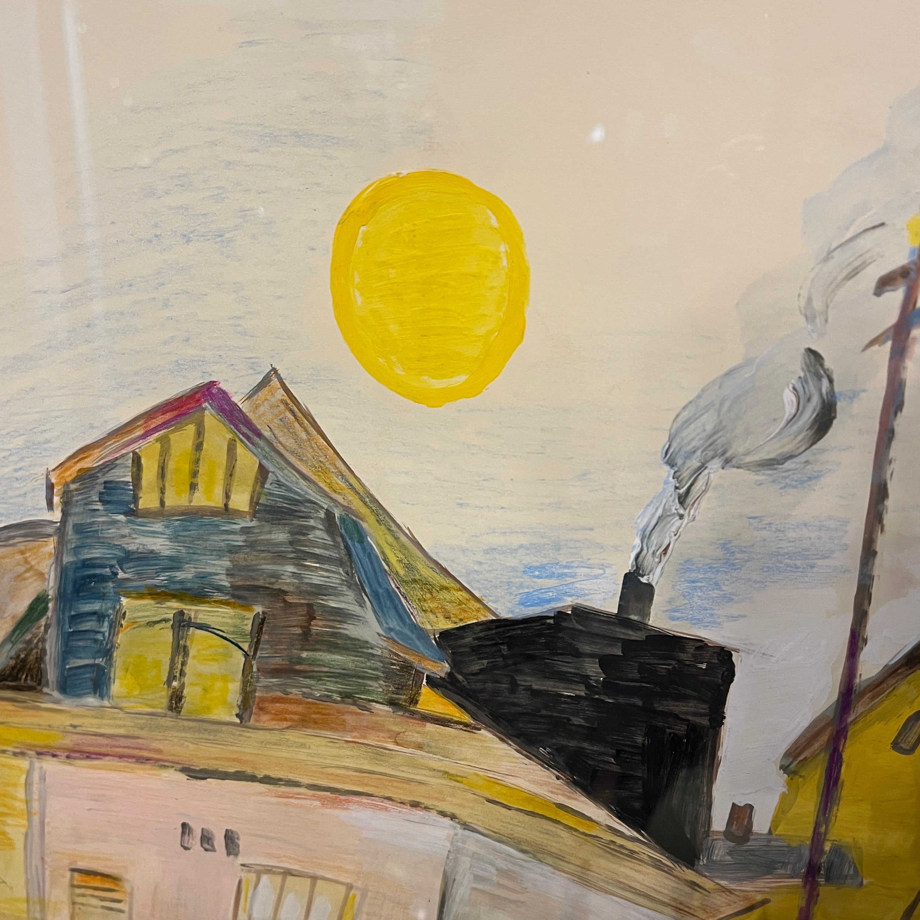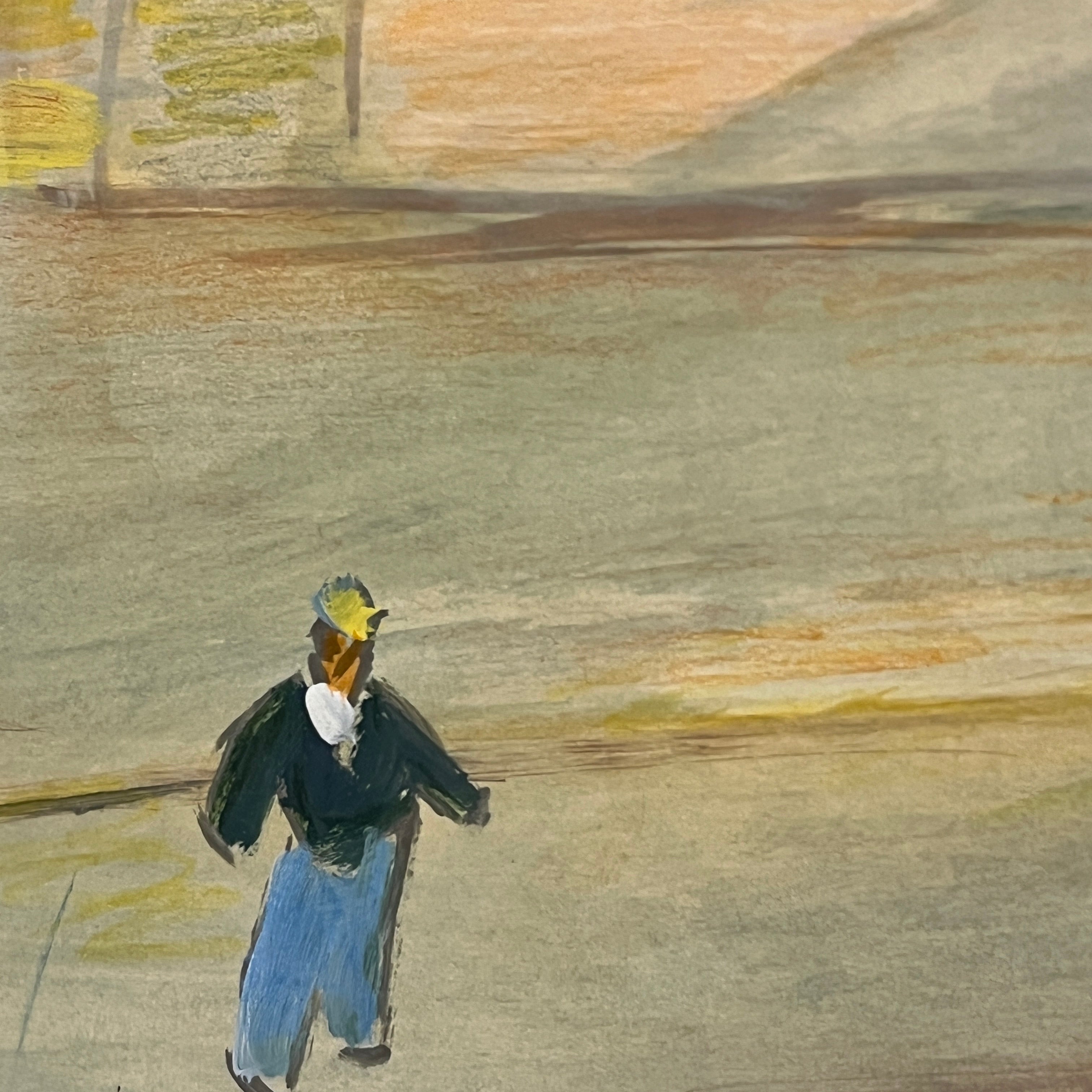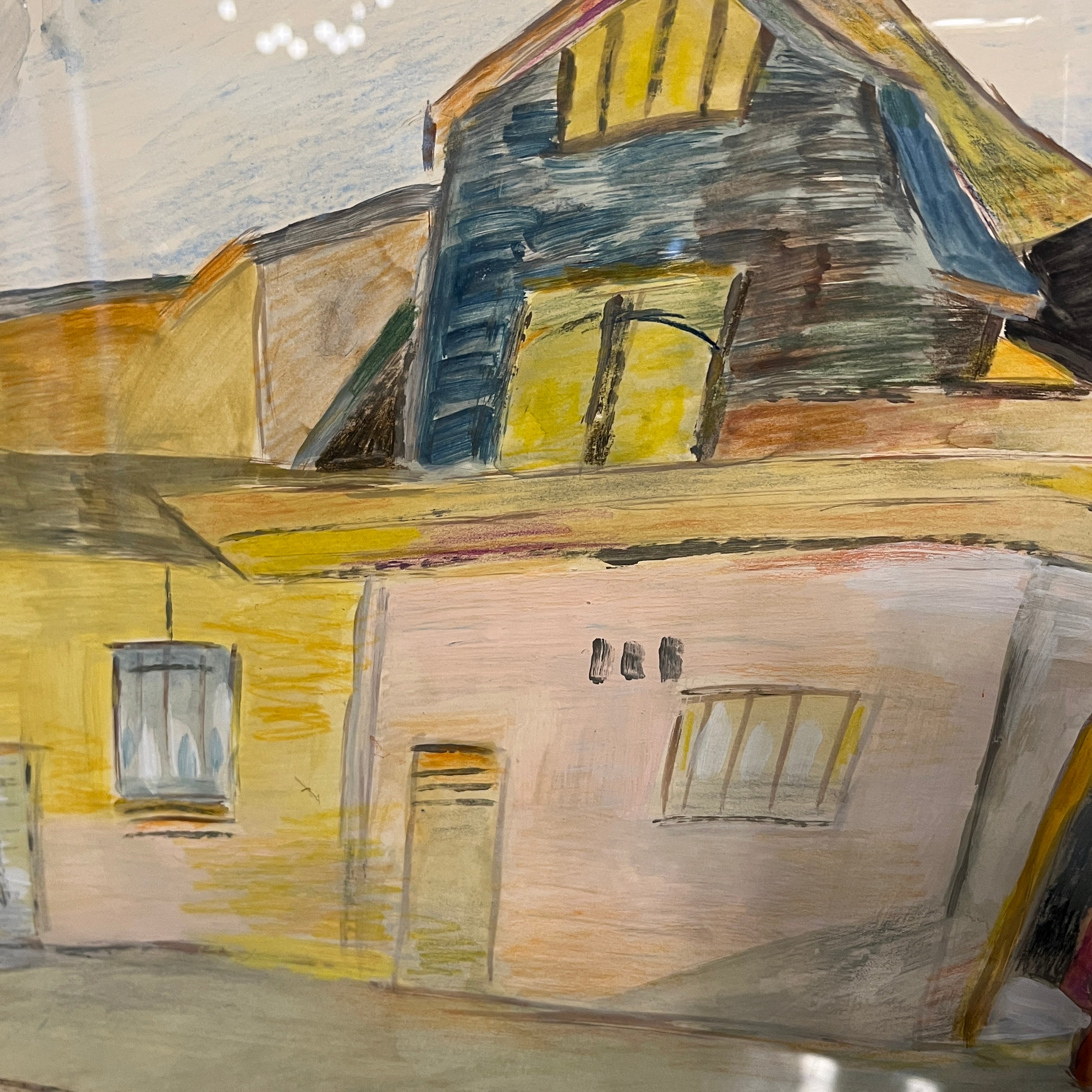 Óleo sobre papel del artista chileno Luis Tejada, representando un paisaje de casas, en donde el color amarillo prepondera en todos los elementos de la composición. El paisaje tiene una deconstrucción de las perspectivas, elemento reconocible en la obra del artista, dándole un aspecto geométrico al paisaje. Un elemento particular que resalta en la composición es un personaje entrando a una de estas casas a través de una puerta roja, que contrasta con el paisaje. La obra está enmarcada en madera de diseño sobrio, terminada en pintura plateada.