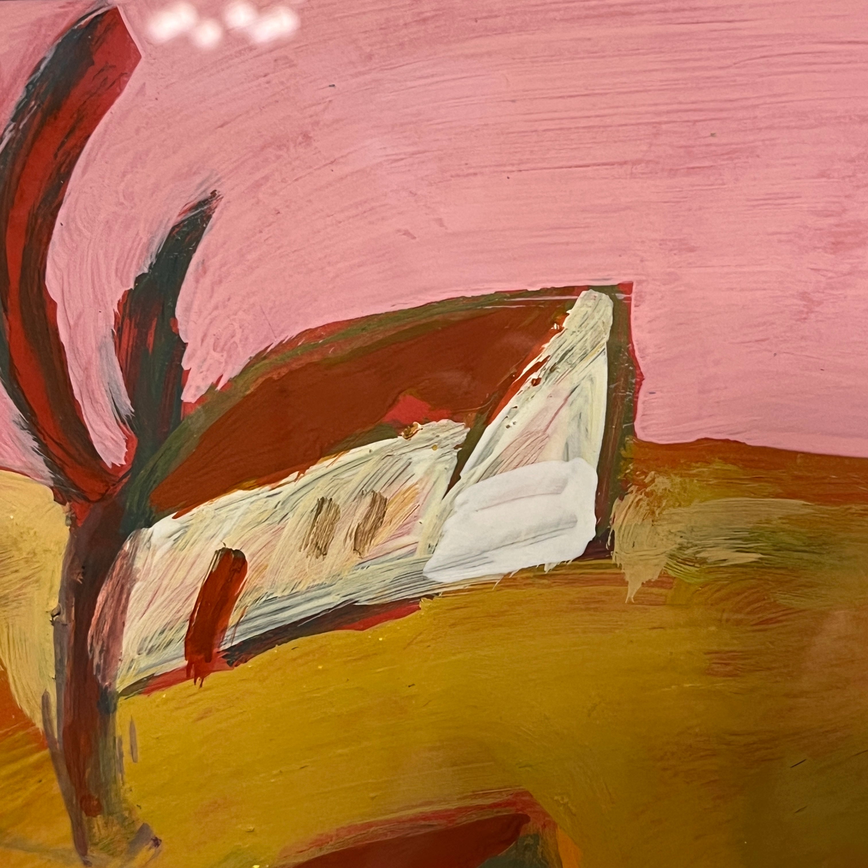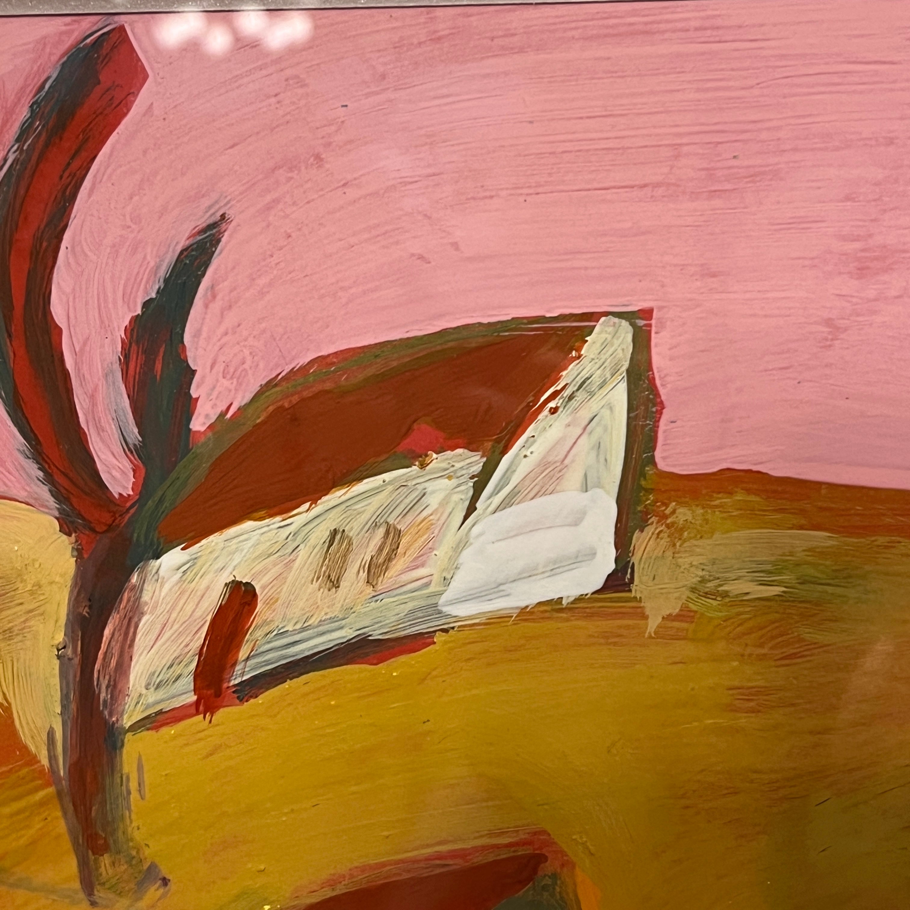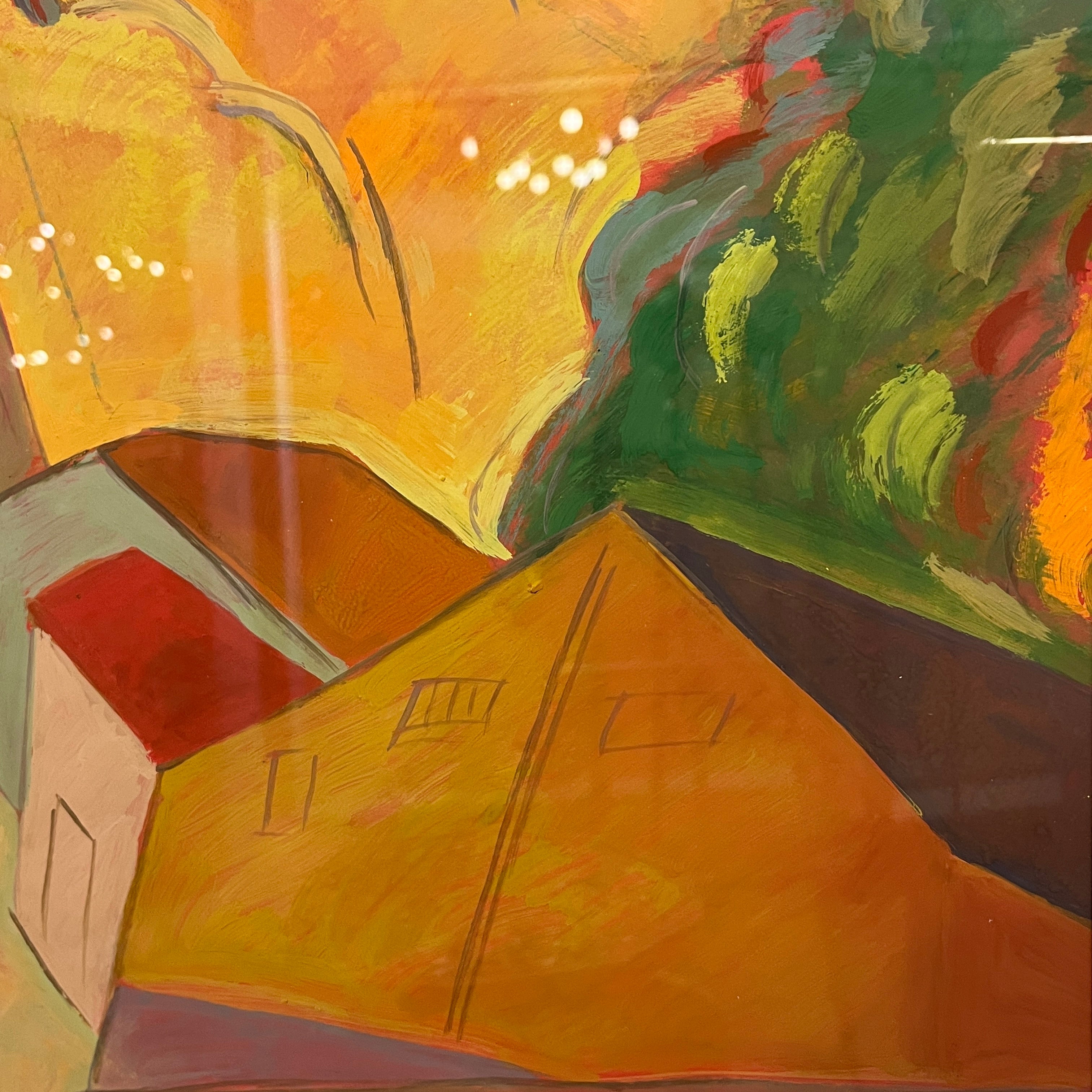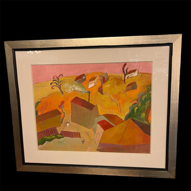 Óleo sobre papel del artista chileno Luis Tejada, representando un paisaje de casas en un territorio desértico, sugerido por los tonos anaranjados que protagonizan el cuadro. El paisaje tiene una deconstrucción de las perspectivas, elemento reconocible en la obra del artista, dándole un aspecto geométrico al paisaje. La obra está enmarcada en madera de diseño sobrio, terminada en pintura plateada.