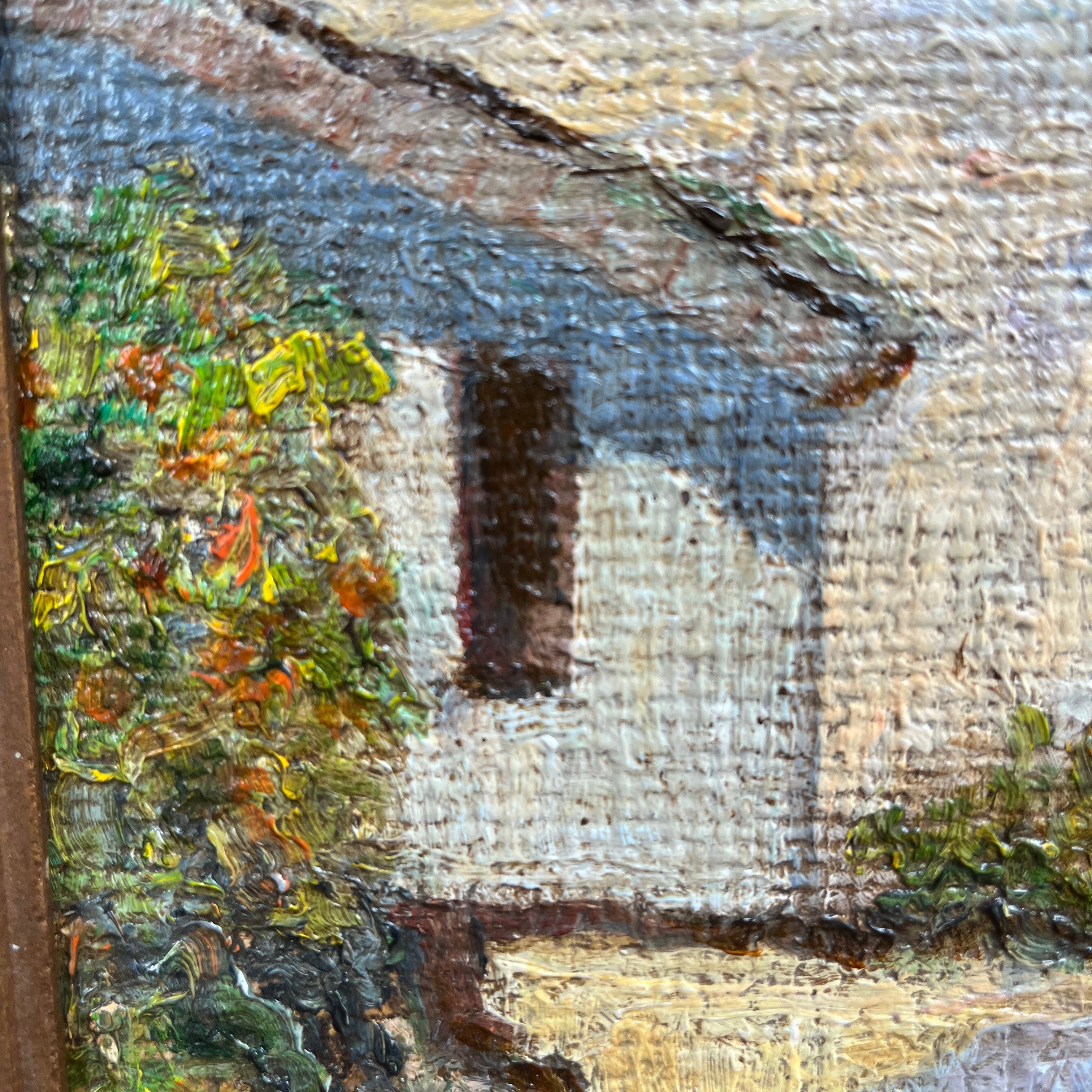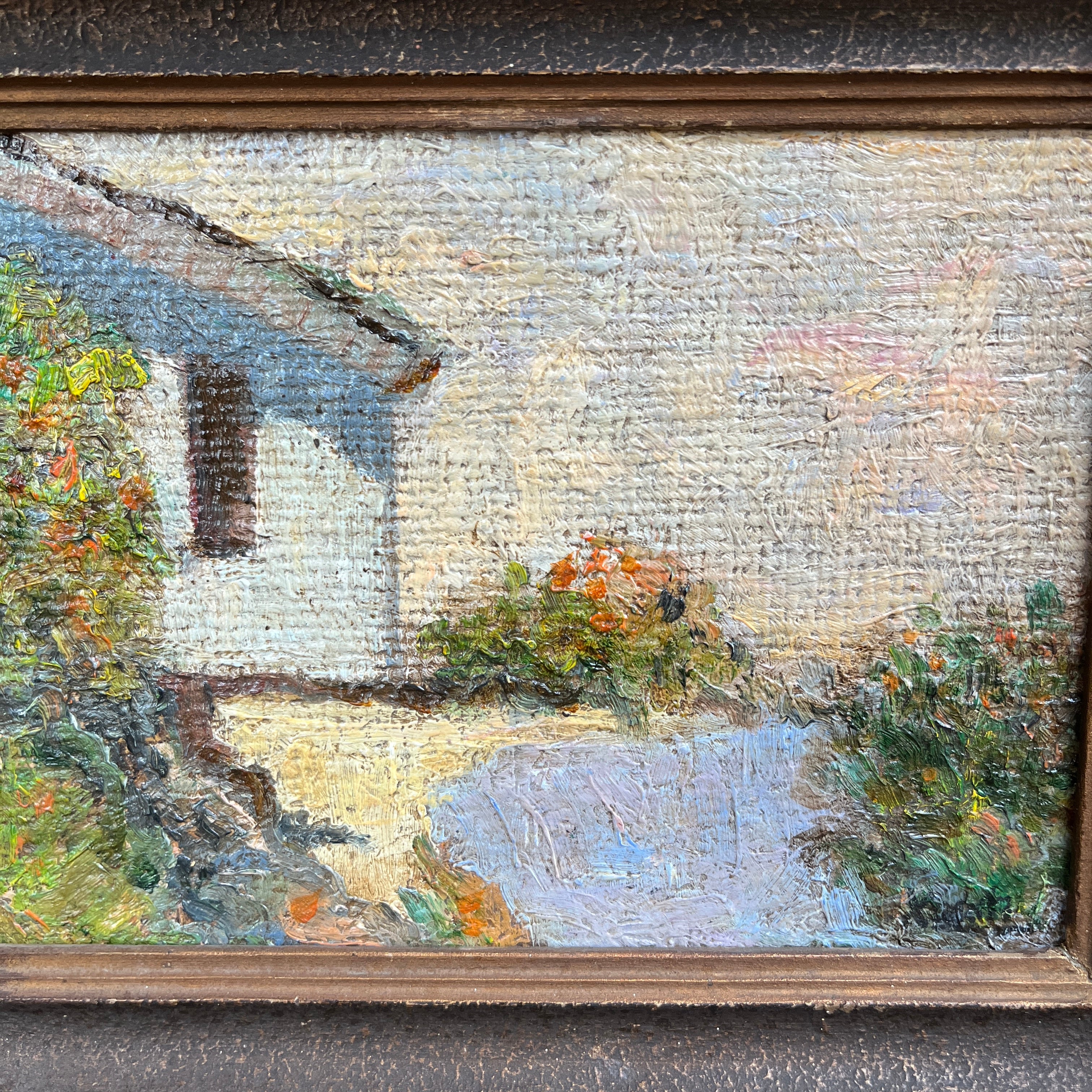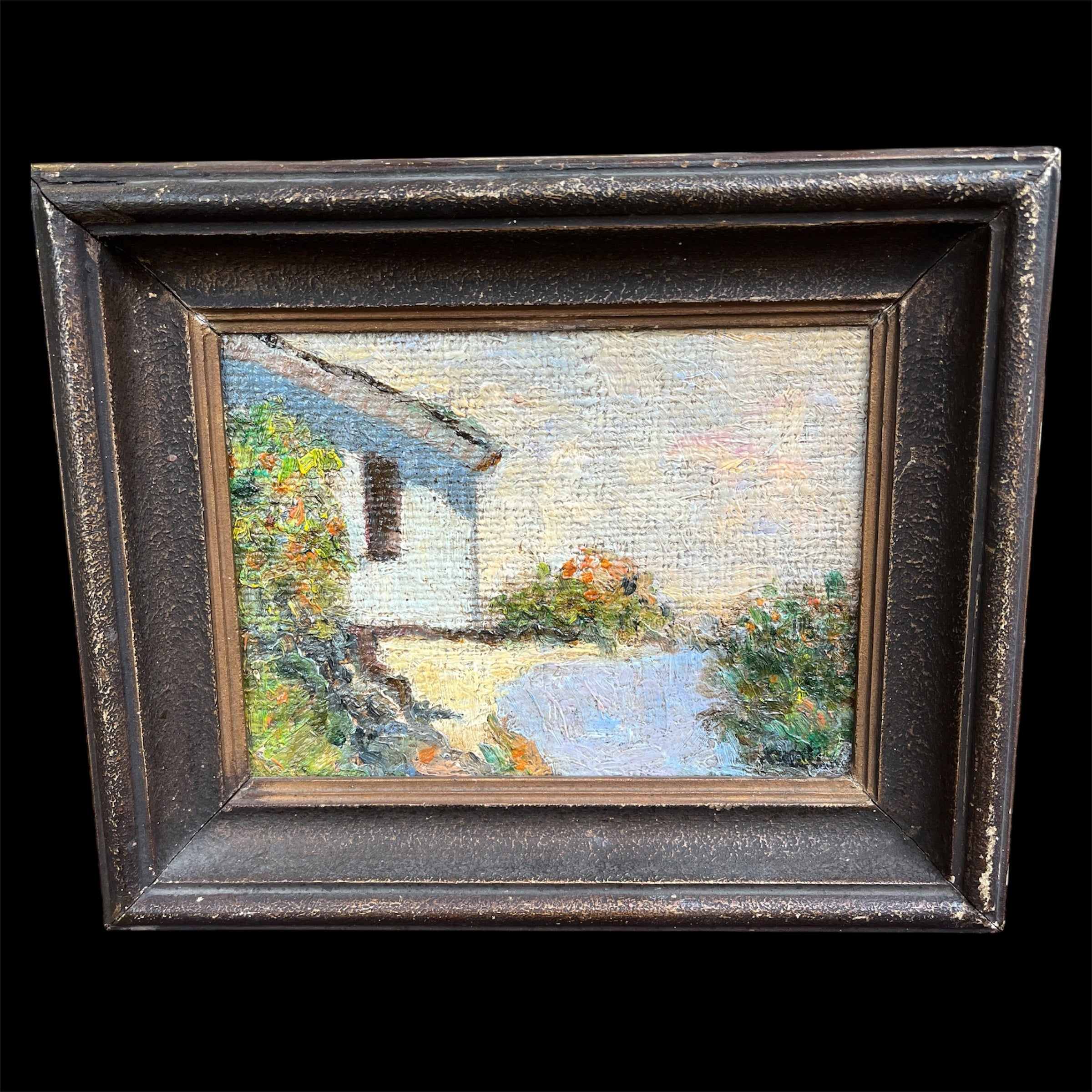 Óleo sobre madera de la reconocida artista chilena Ximena Cristo (1920-2022). La obra, de formato pequeño, representa un paisaje en el que se puede identificar una casa, algunos arbustos con flores y una playa. La pintora utiliza el formato pequeño para hacer un recorte muy sintético de cada uno de los elementos, que adquieren textura debido al soporte, pero también por los trazos expresivos que resaltan el óleo. La pintura está enmarcada en madera terminada en un ocre oscuro.