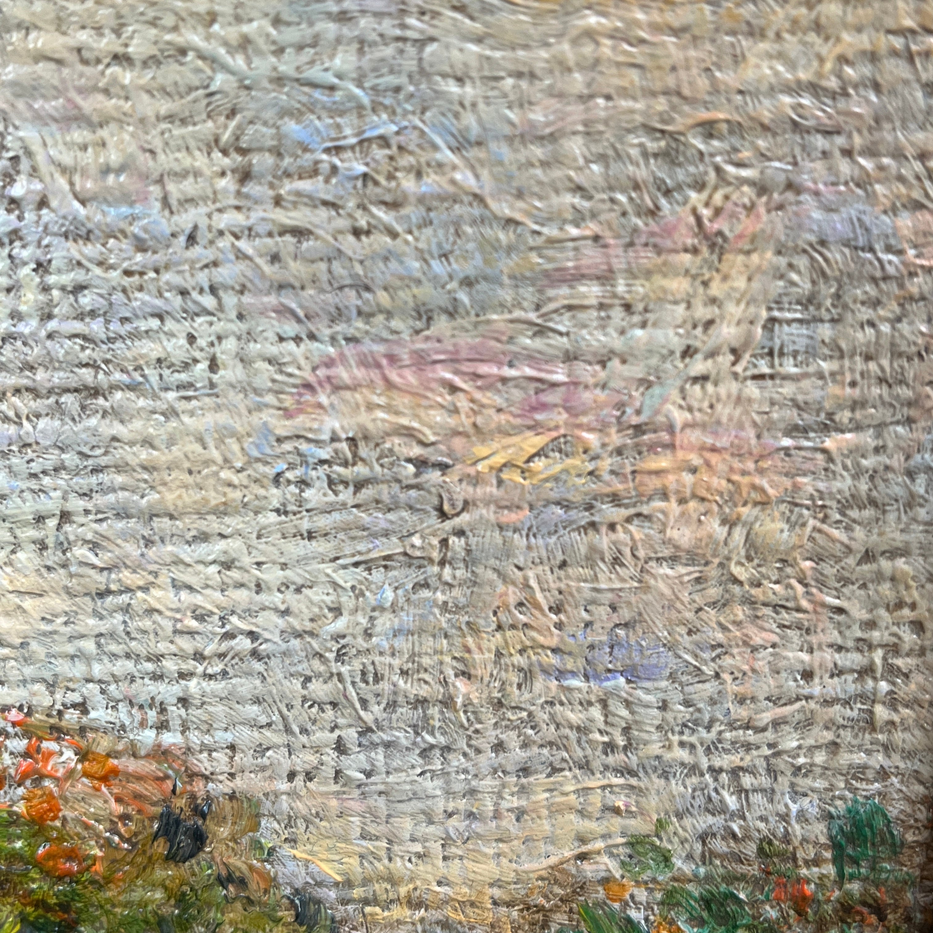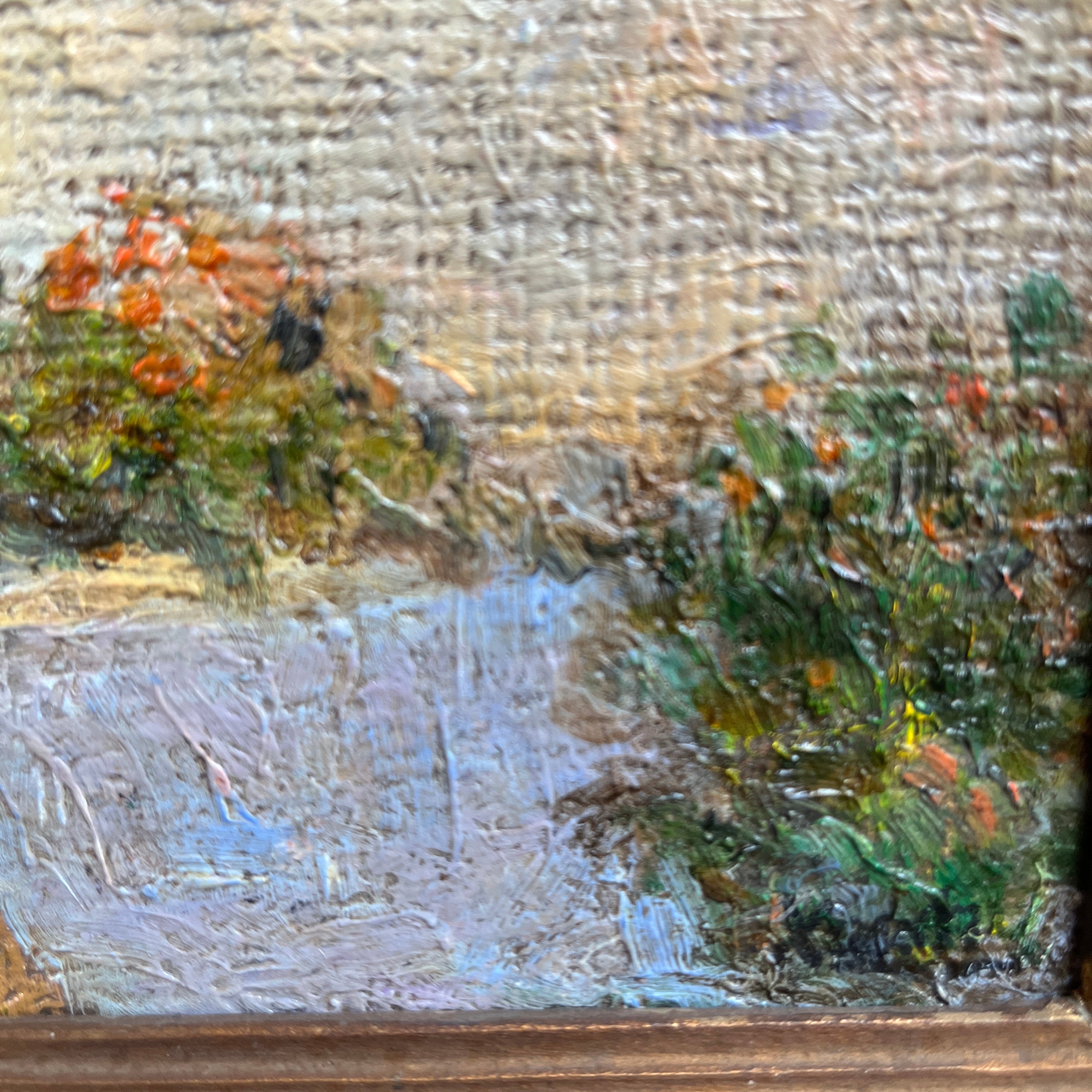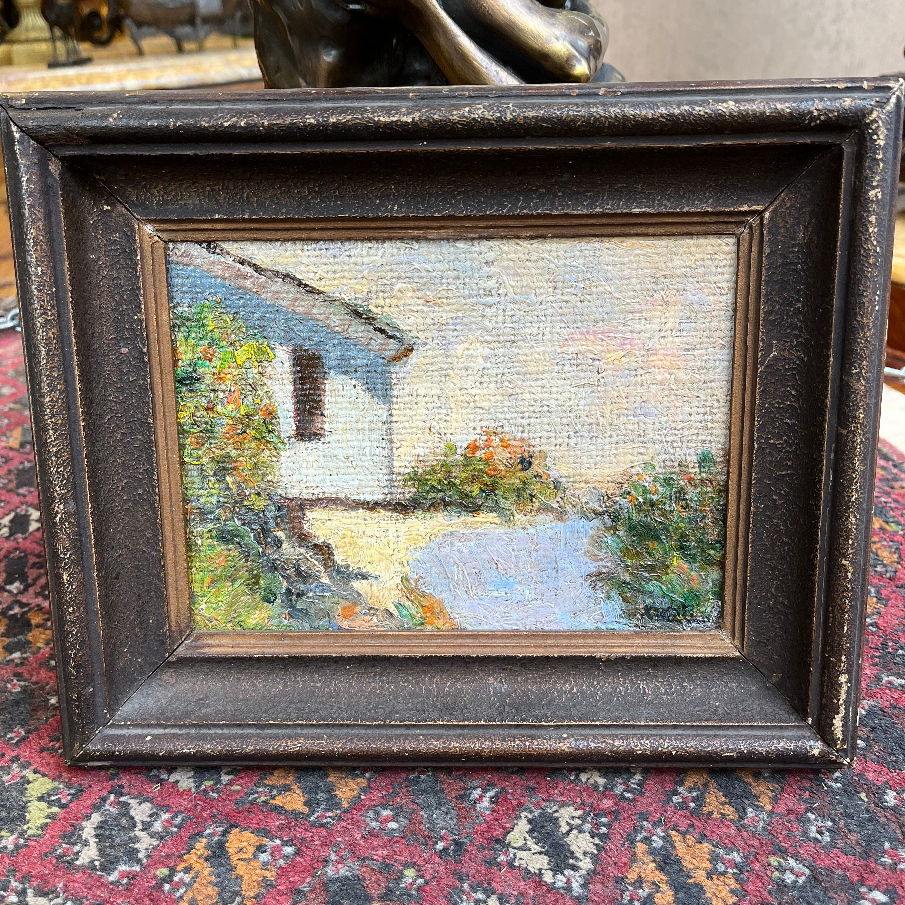 Óleo sobre madera de la reconocida artista chilena Ximena Cristo (1920-2022). La obra, de formato pequeño, representa un paisaje en el que se puede identificar una casa, algunos arbustos con flores y una playa. La pintora utiliza el formato pequeño para hacer un recorte muy sintético de cada uno de los elementos, que adquieren textura debido al soporte, pero también por los trazos expresivos que resaltan el óleo. La pintura está enmarcada en madera terminada en un ocre oscuro.