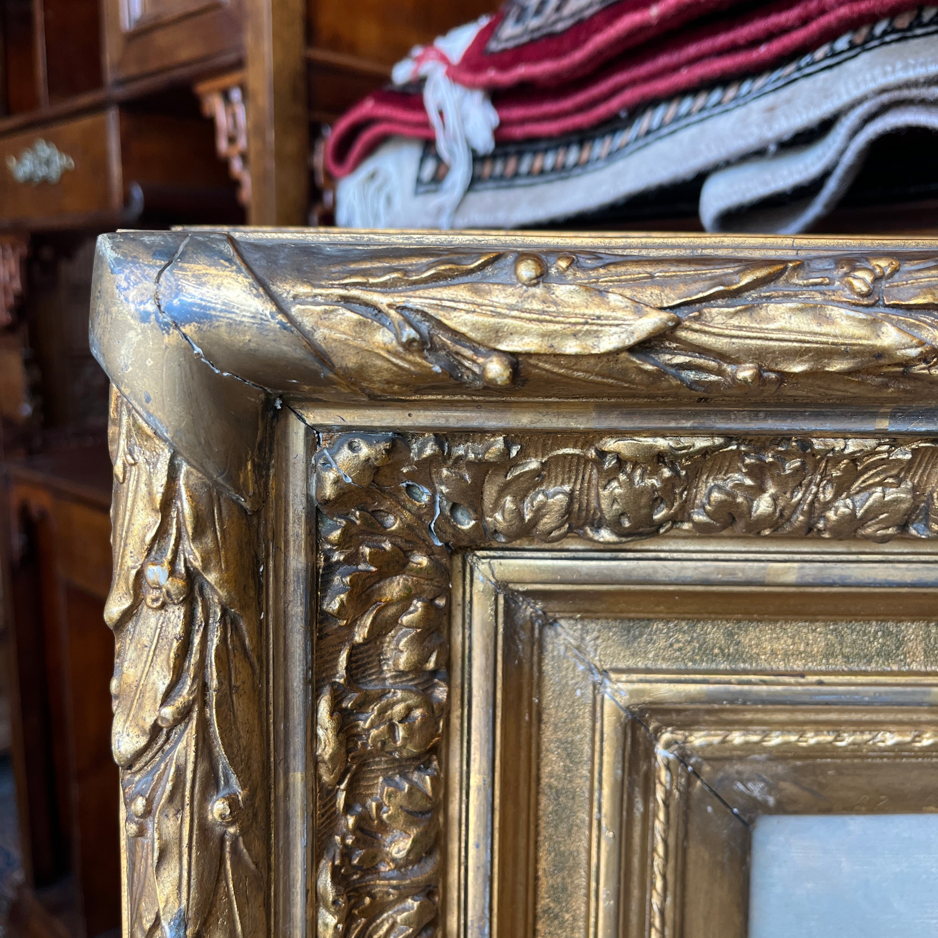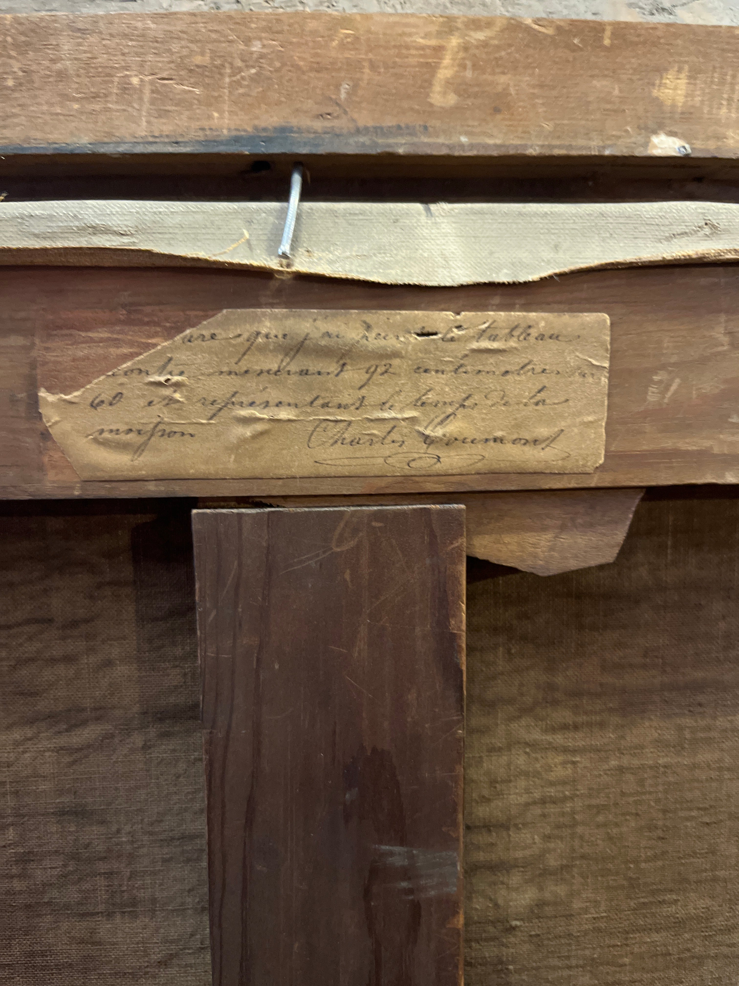 Óleo sobre tela de Charles Coumont (1822-1889), pintor de origen belga, que retrata una escena rural bañada por la luz de una tarde calurosa. En primer plano, dos hombres cargan paja sobre una carreta tirada por dos caballos, en pleno esfuerzo agrícola. Alrededor, se distinguen cuatro caballos, integrados armónicamente en un paisaje seco, salpicado de cerros al fondo. El cielo, cubierto de nubes meticulosamente detalladas, aporta profundidad y dinamismo a esta composición que capta con maestría la esencia del trabajo en el campo.