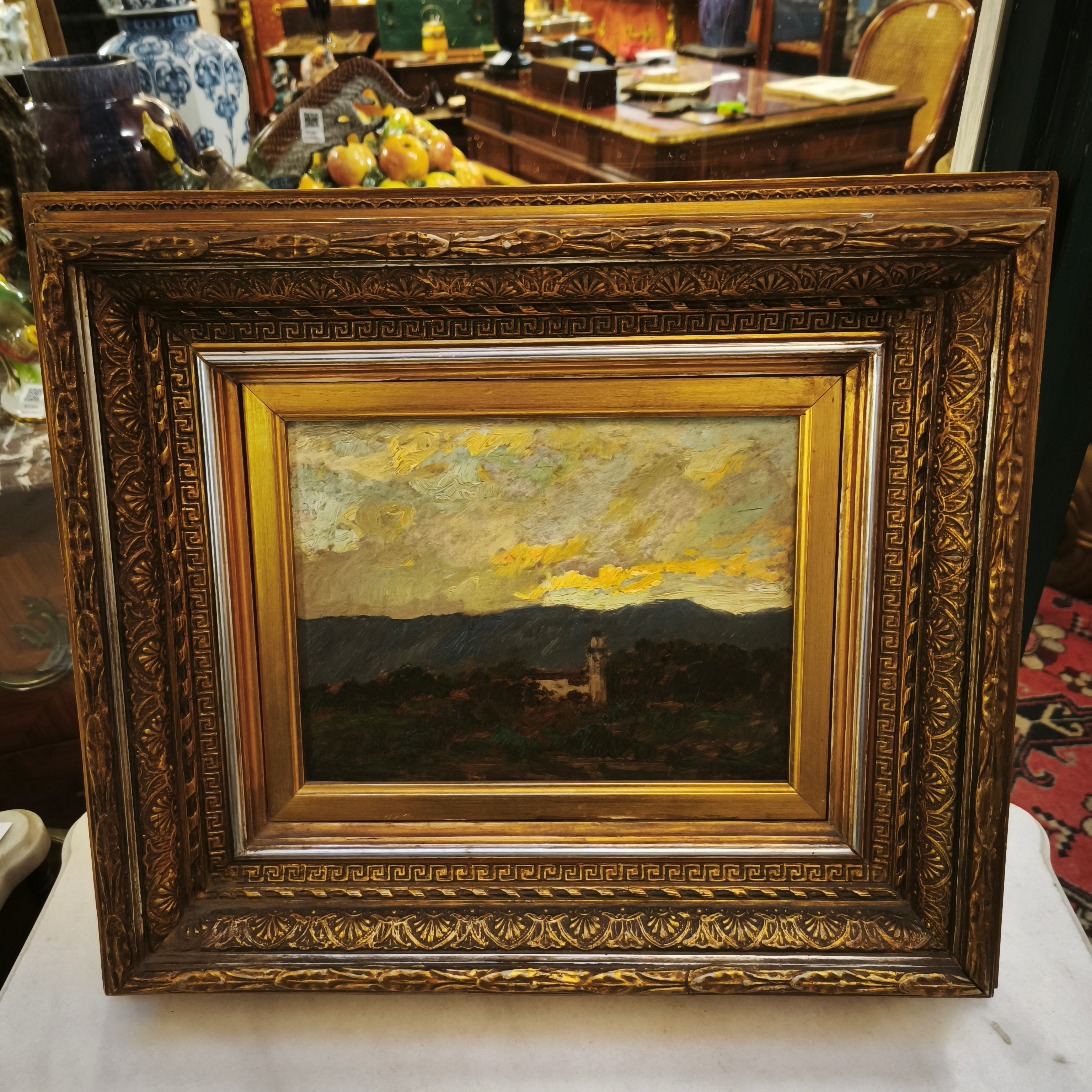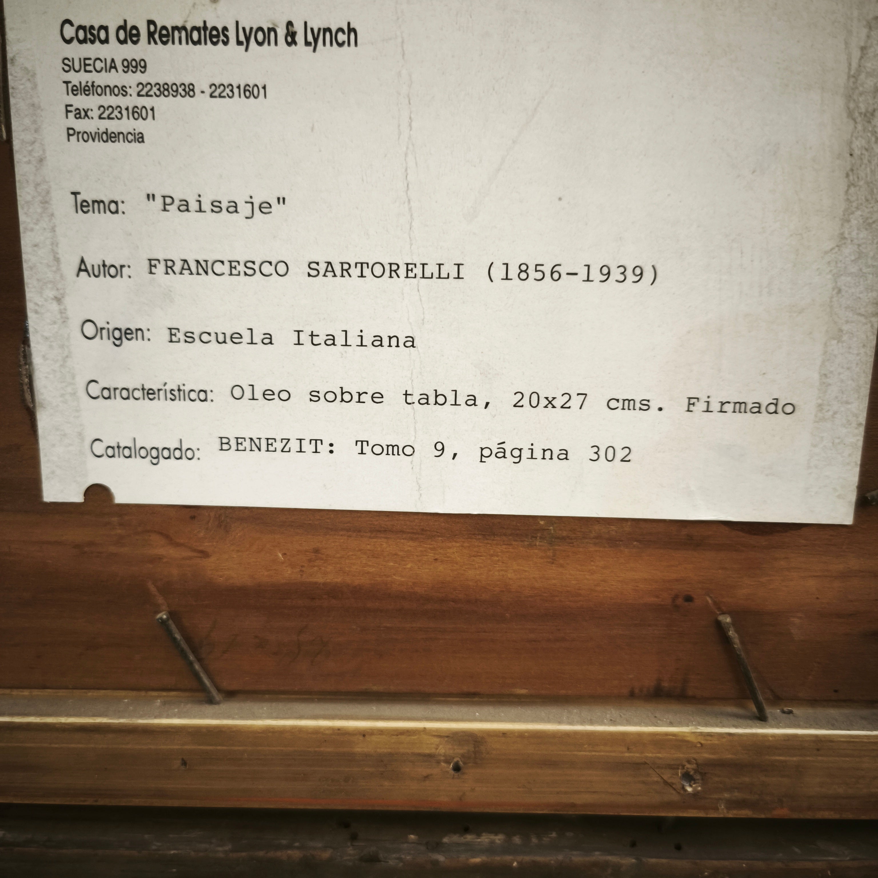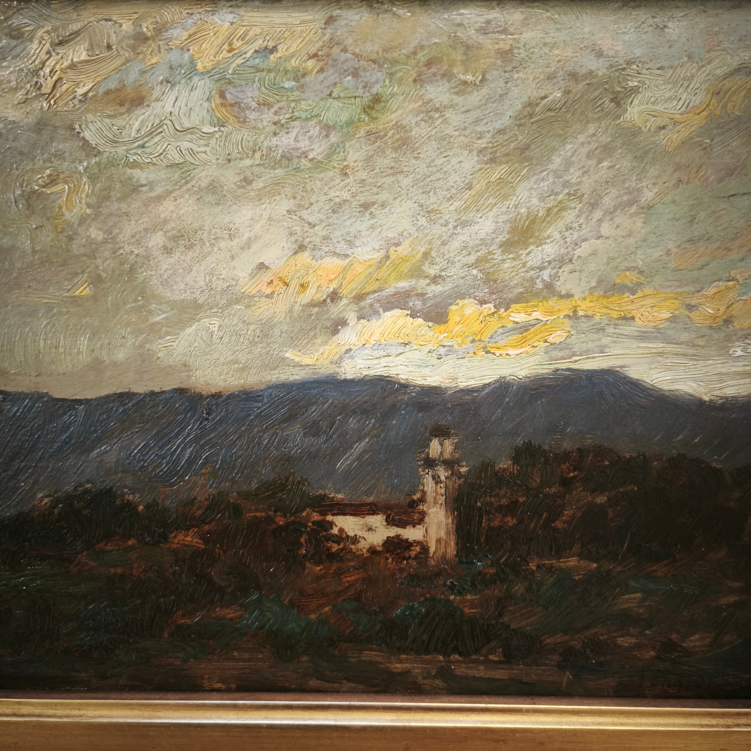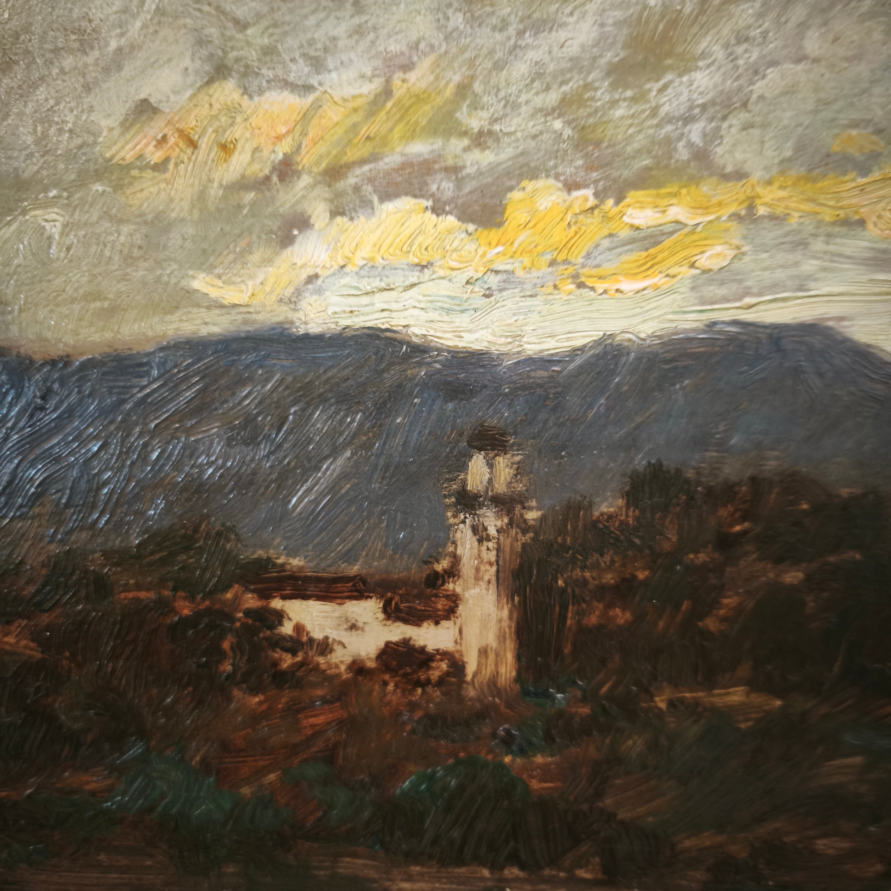 Óleo sobre madera del artista Francisco Santorelli (1856 - 1939), parte de la escuela italiana, representando un bellísimo paisaje expresivo en sus trazos y que prodice un efecto degradé en su composición, desde un cielo con mucha luz a un paisaje más oscuro y terrozo, en el que resalta una casa o iglesia gris como figura central.