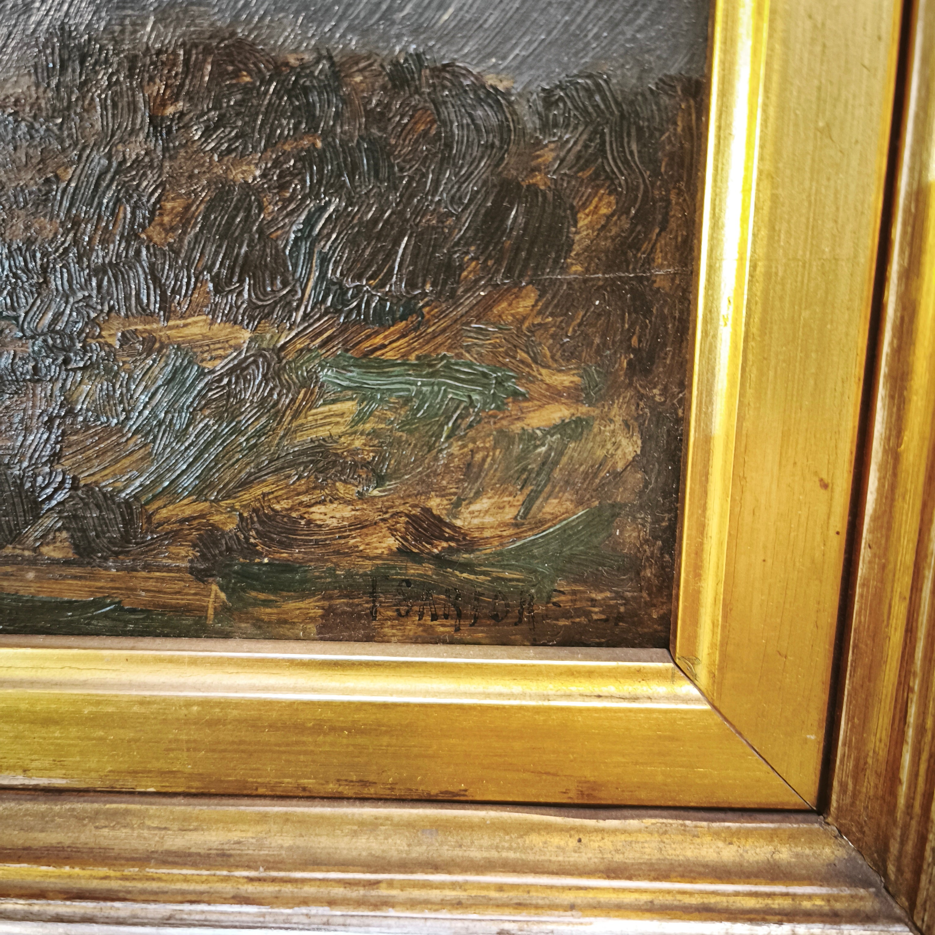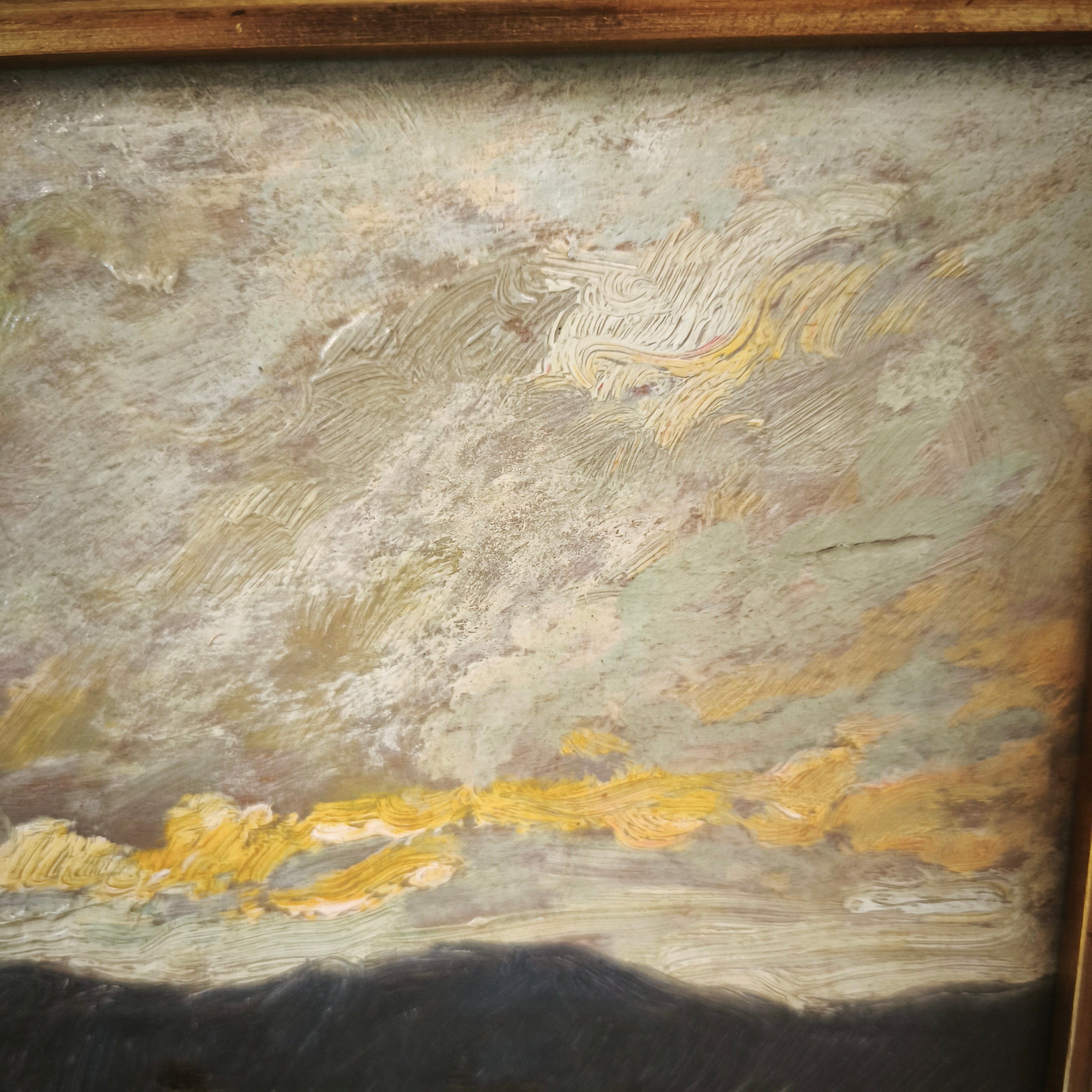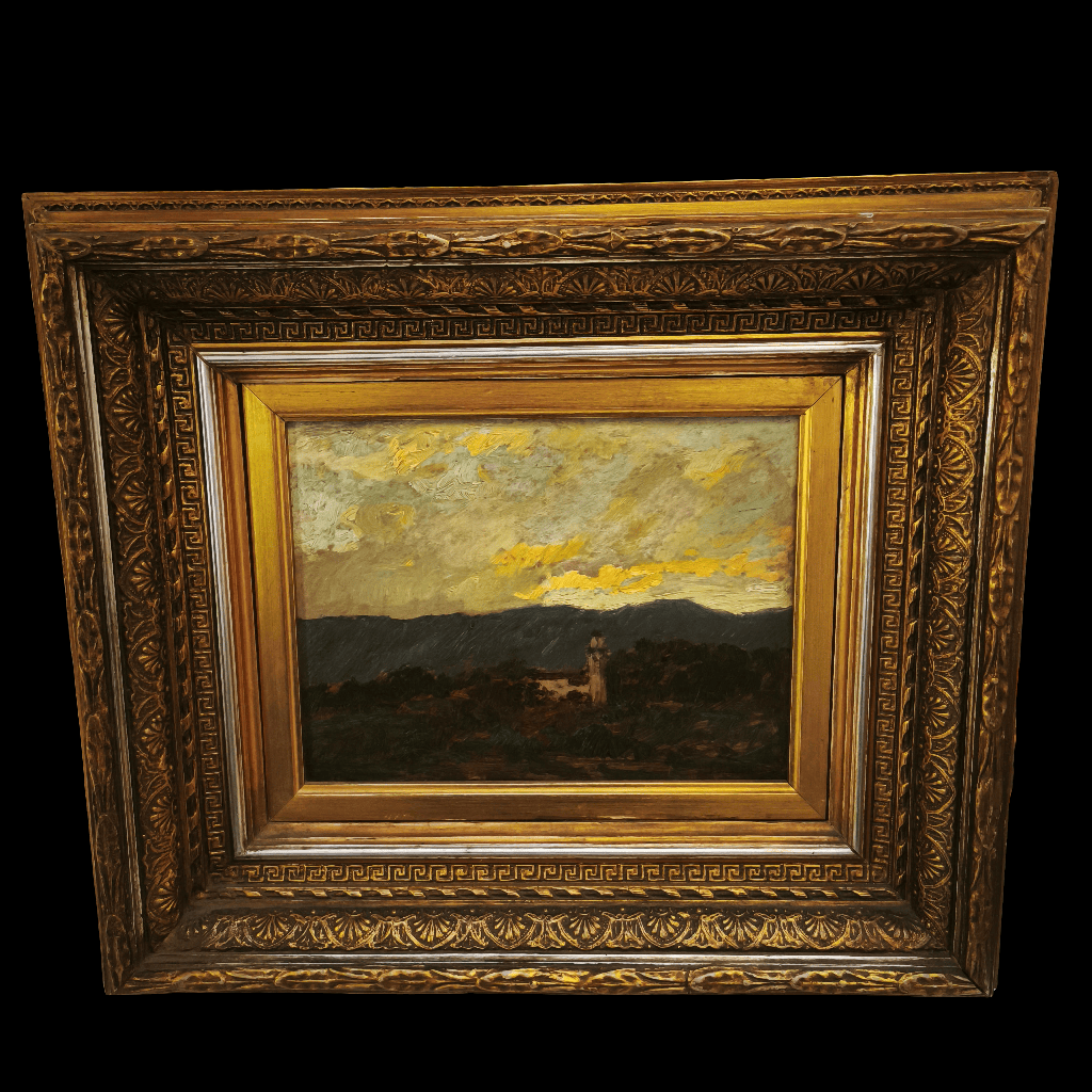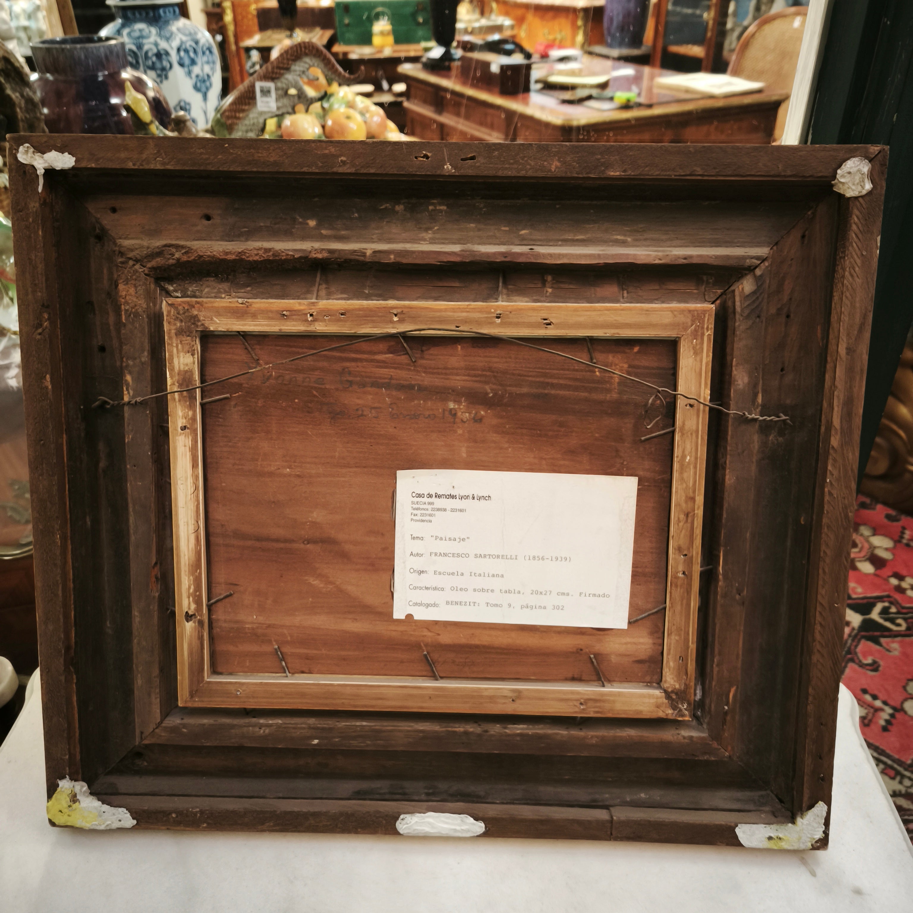 Óleo sobre madera del artista Francisco Santorelli (1856 - 1939), parte de la escuela italiana, representando un bellísimo paisaje expresivo en sus trazos y que prodice un efecto degradé en su composición, desde un cielo con mucha luz a un paisaje más oscuro y terrozo, en el que resalta una casa o iglesia gris como figura central.
