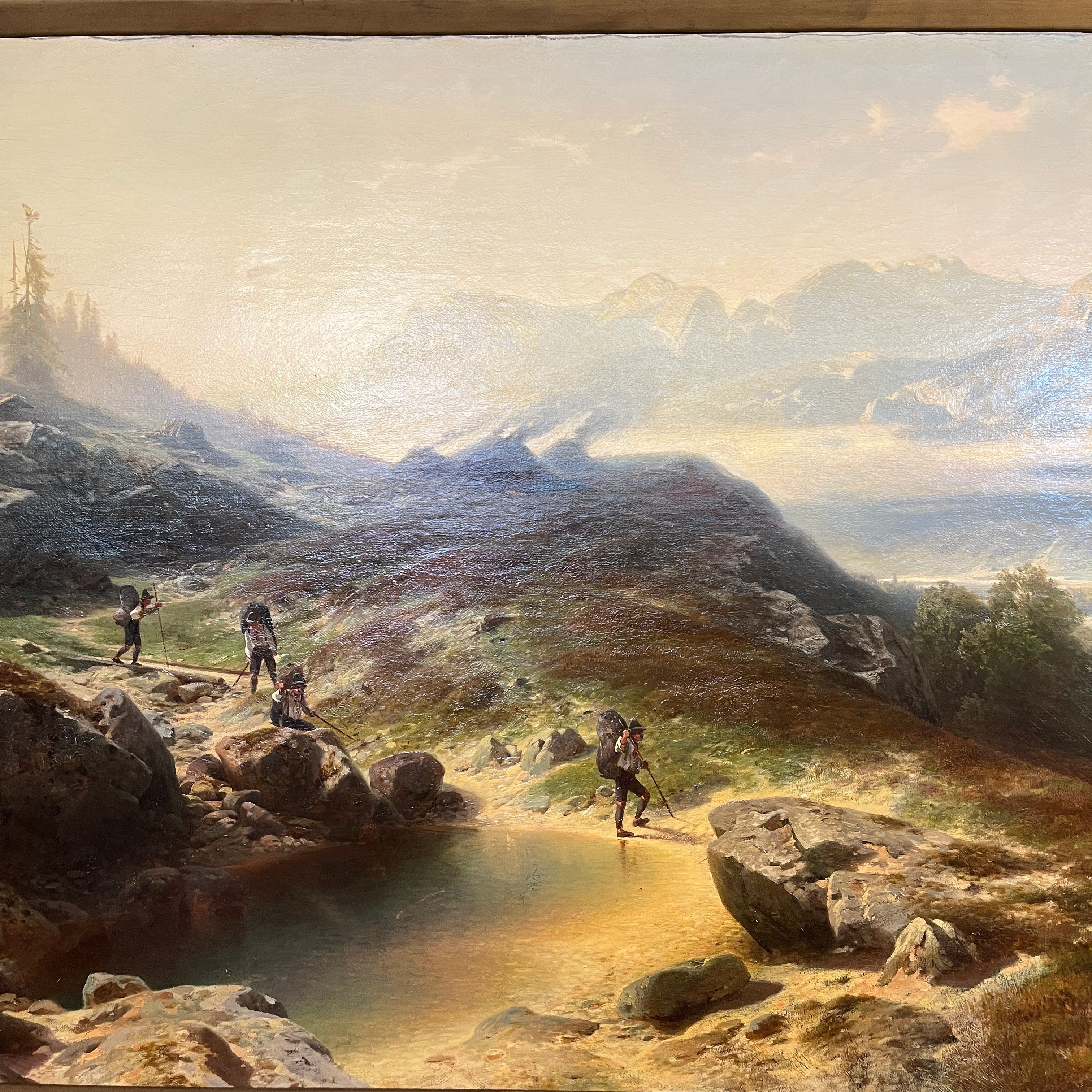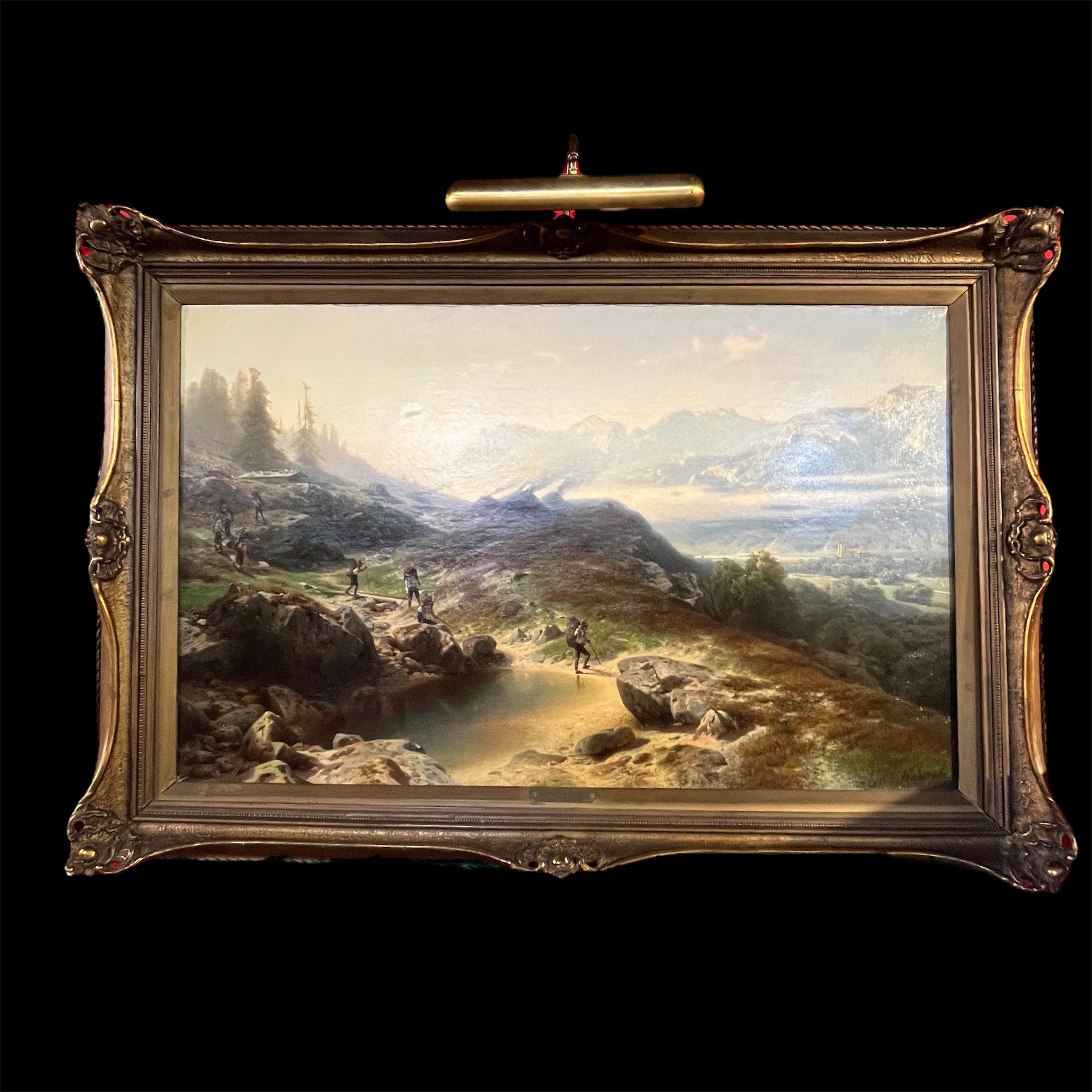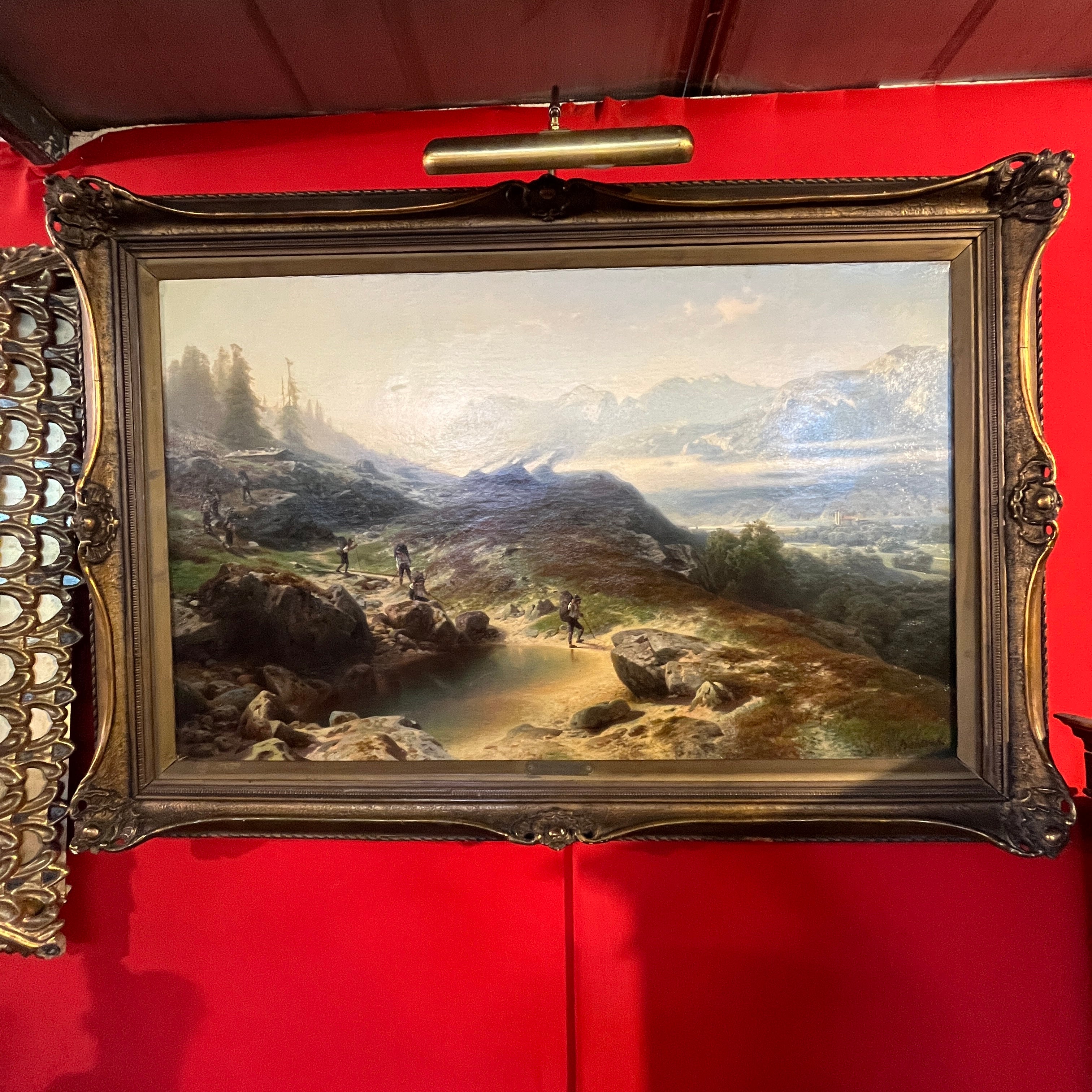 Óleo sobre tela europeo, pintado por el artista polaco Otto Van Kamecke (1826-1899), representando un gran paisaje titulado ‘Weimar’. Este título alude a la tradicional ciudad alemana, llamada la “joya cultural”, de gran importancia en términos literarios y filosóficos, durante finales del siglo XVIII y principios de s. XIX . La obra muestra un paisaje montañoso con algunos peregrinos caminando por las montañas en dirección a la ciudad. El paisaje representa en detalle el tipo de territorio por el cual el pintor se hizo reconocido, como eran los paisajes montañosos de Suiza y Bavaria. La obra está enmarcada en madera tallada con decorados en relieve en sus esquinas y pintado de elegante dorado. Además el marco cuenta con una placa con el nombre del artista y una lámpara en sus esquinas parte superior para iluminar la obra.