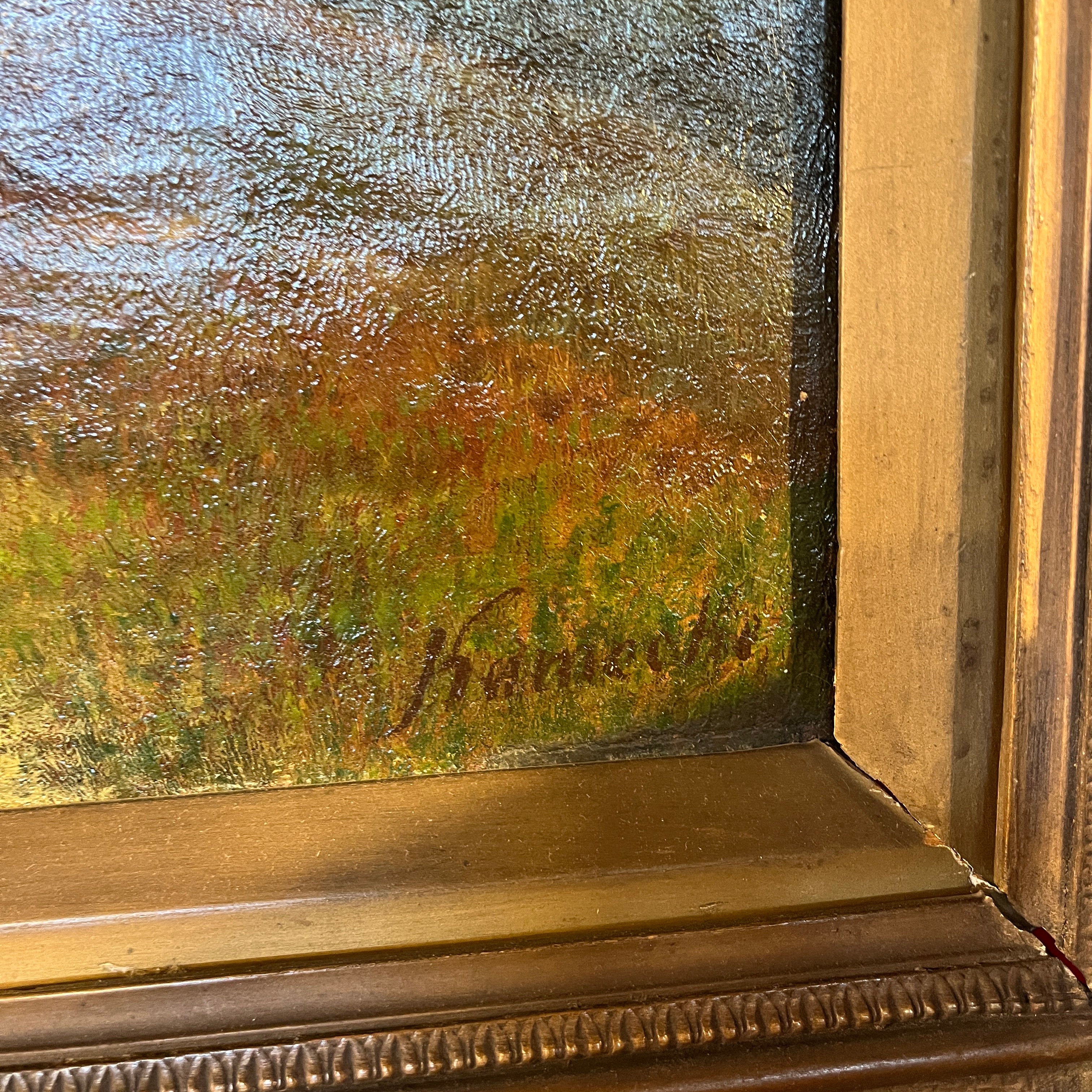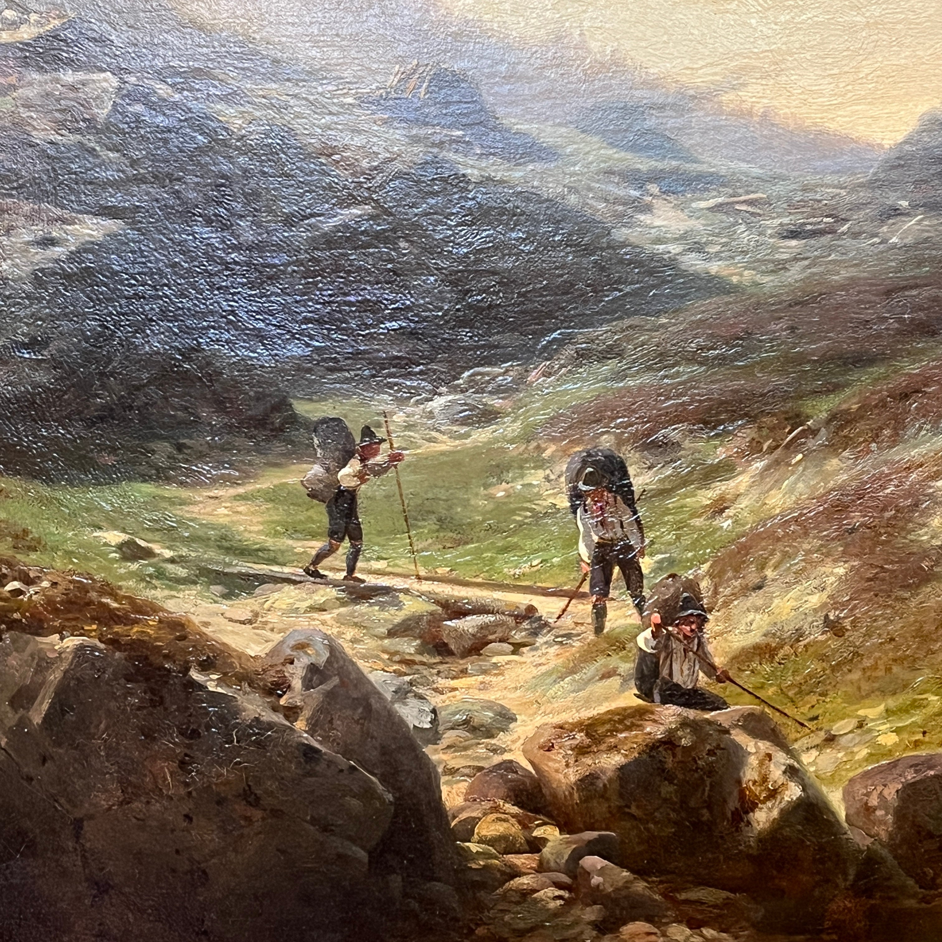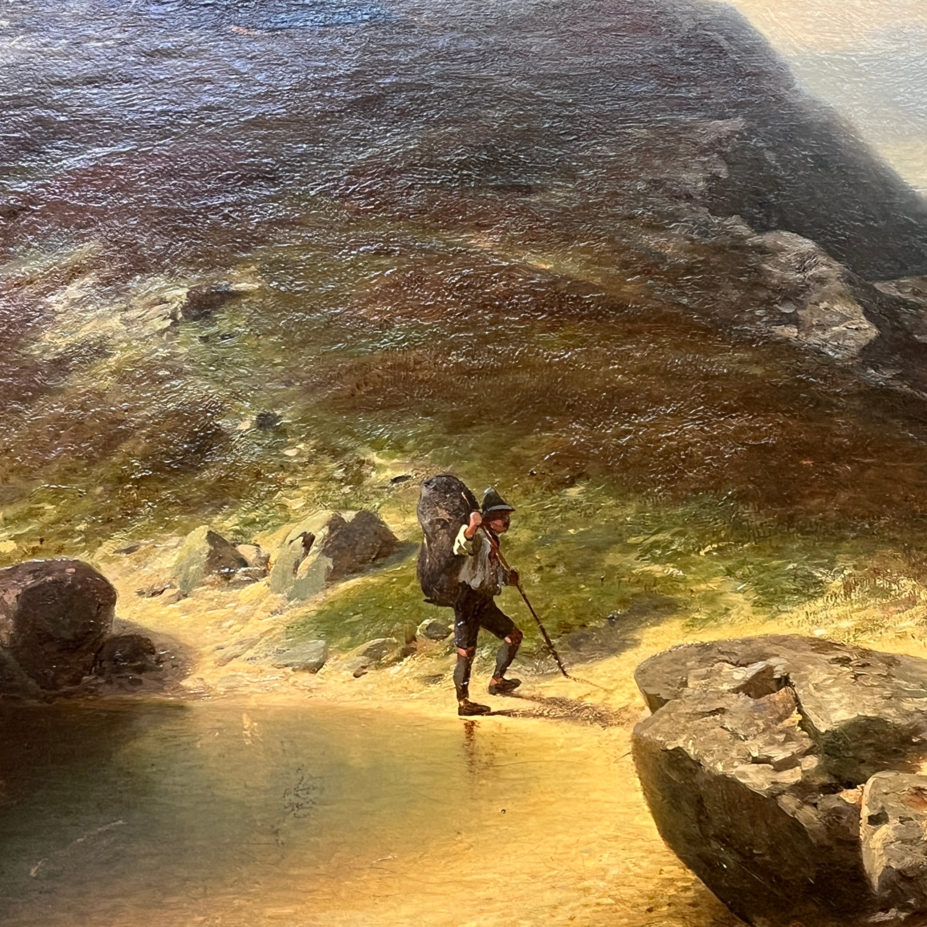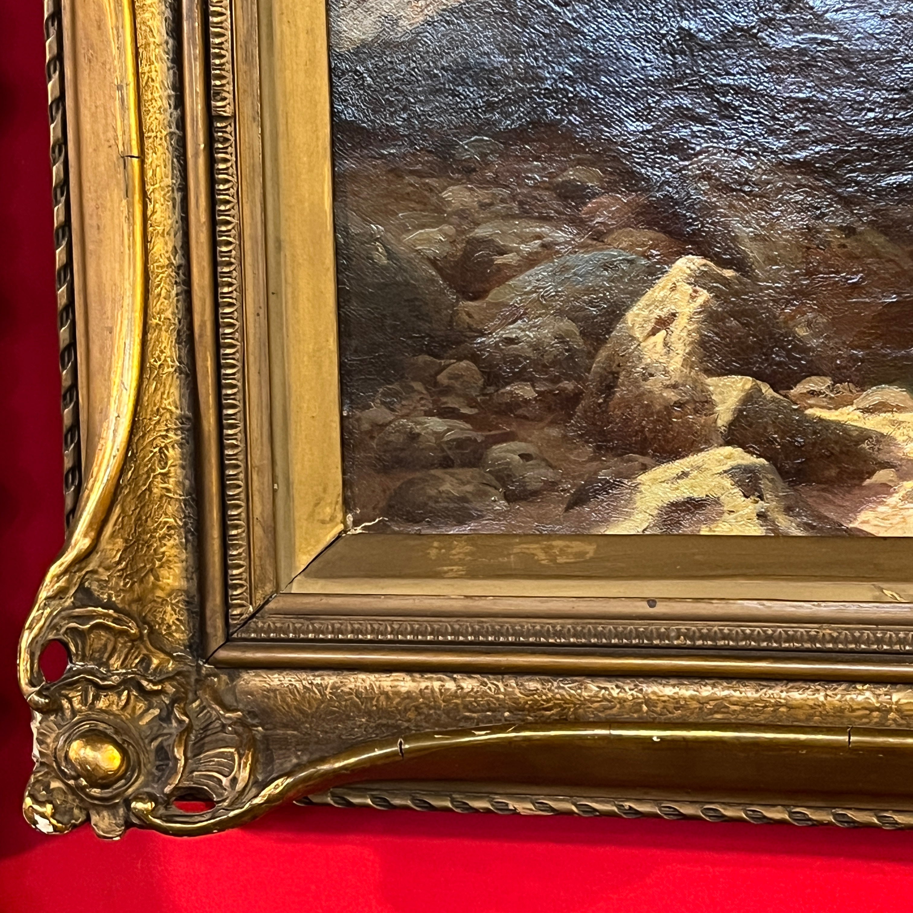 Óleo sobre tela europeo, pintado por el artista polaco Otto Van Kamecke (1826-1899), representando un gran paisaje titulado ‘Weimar’. Este título alude a la tradicional ciudad alemana, llamada la “joya cultural”, de gran importancia en términos literarios y filosóficos, durante finales del siglo XVIII y principios de s. XIX . La obra muestra un paisaje montañoso con algunos peregrinos caminando por las montañas en dirección a la ciudad. El paisaje representa en detalle el tipo de territorio por el cual el pintor se hizo reconocido, como eran los paisajes montañosos de Suiza y Bavaria. La obra está enmarcada en madera tallada con decorados en relieve en sus esquinas y pintado de elegante dorado. Además el marco cuenta con una placa con el nombre del artista y una lámpara en sus esquinas parte superior para iluminar la obra.