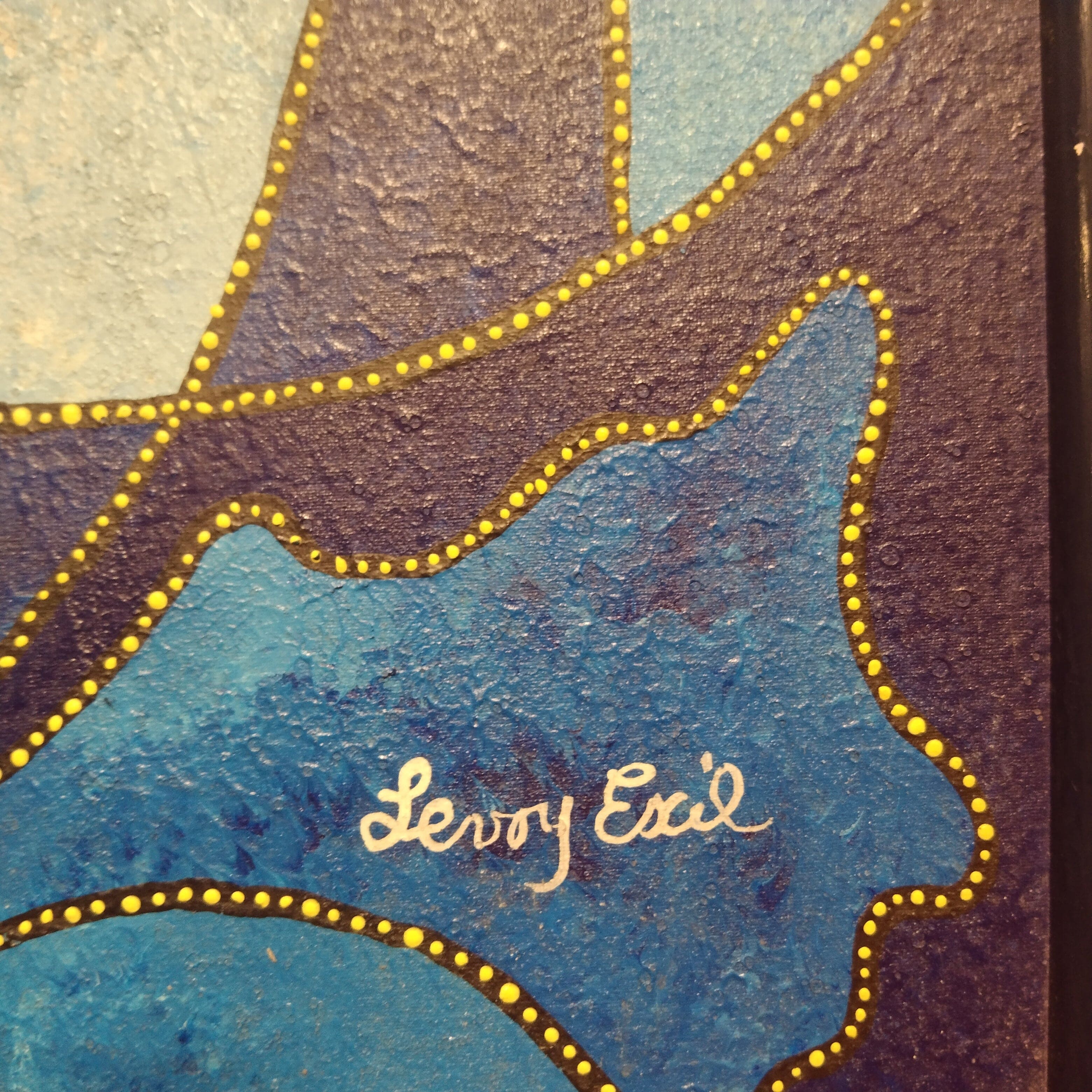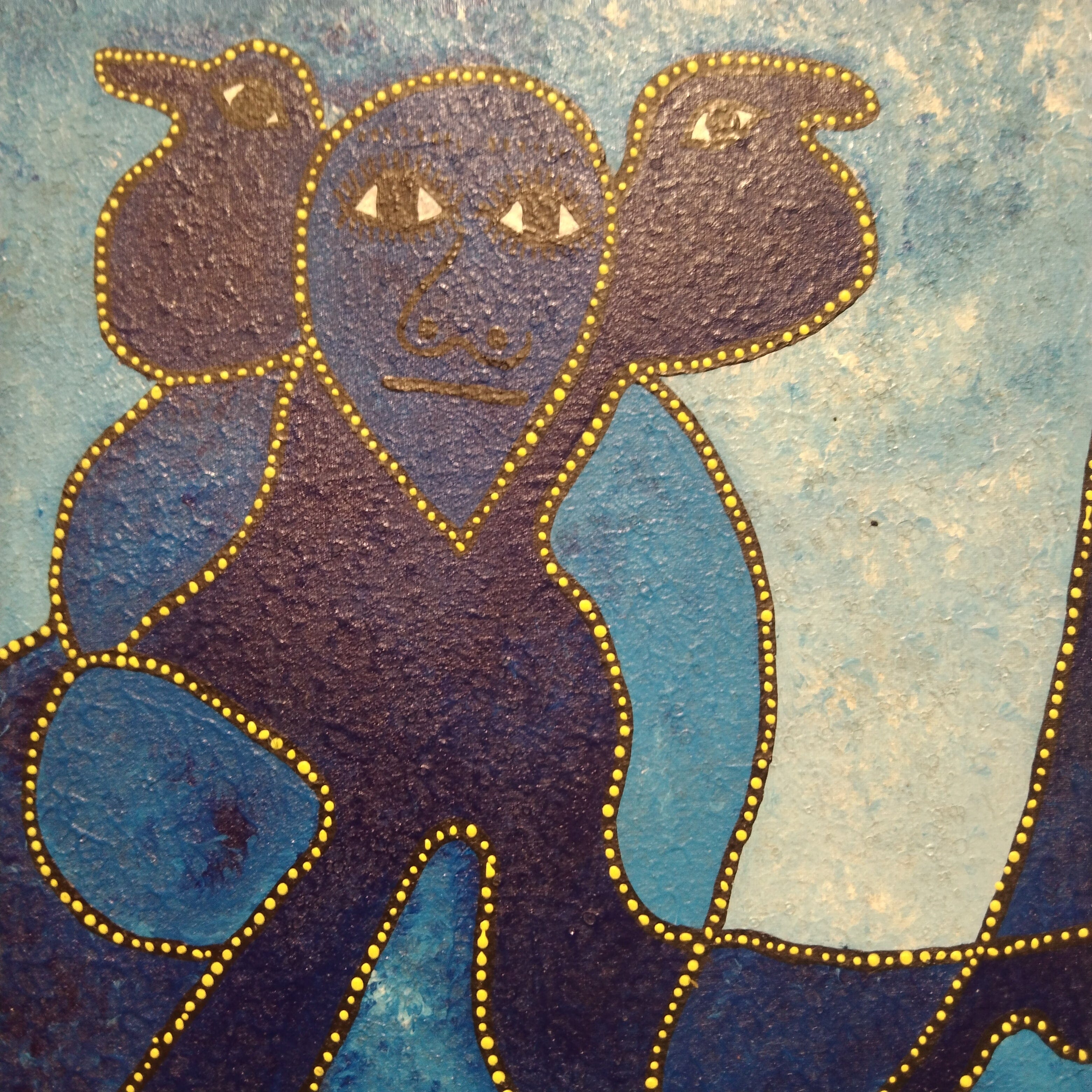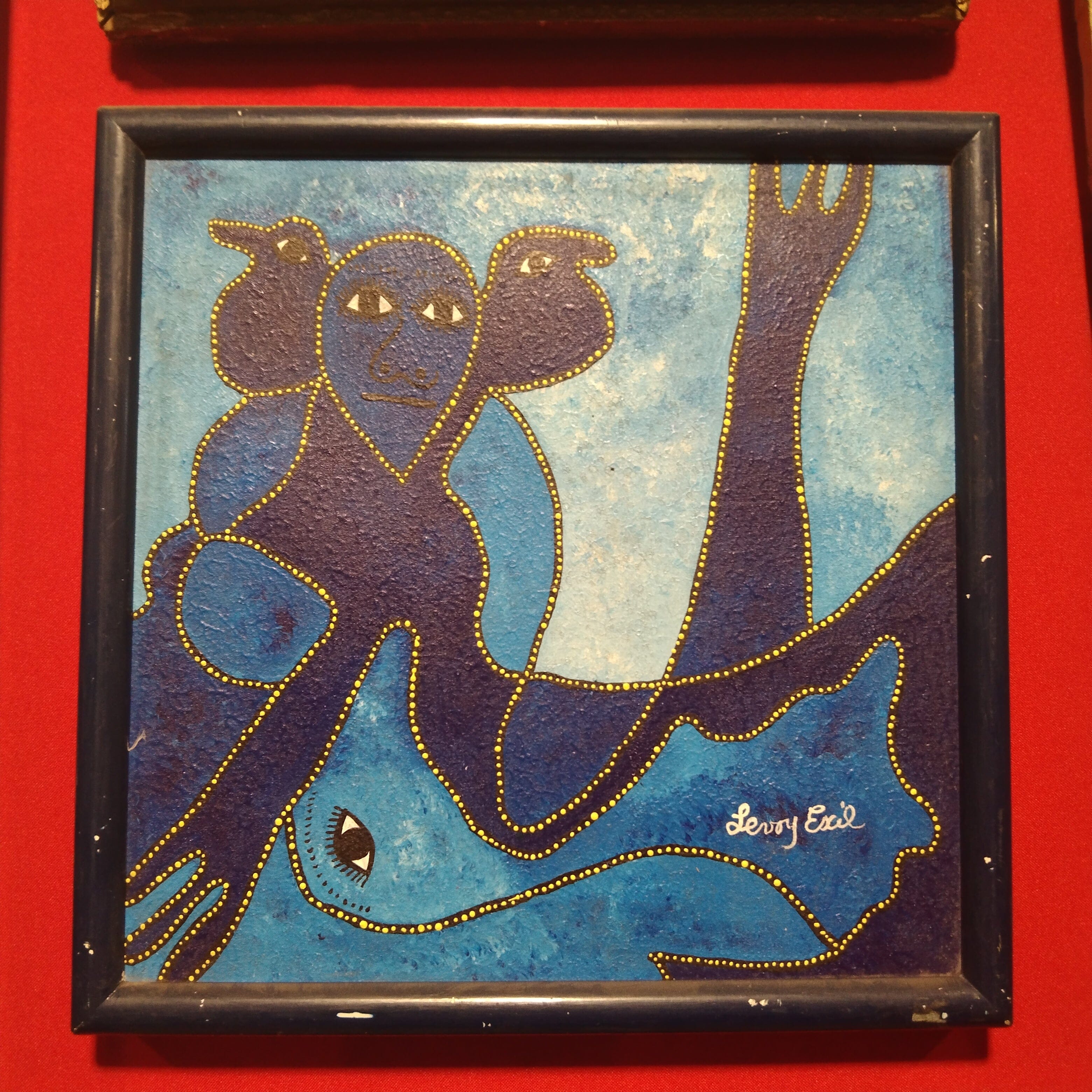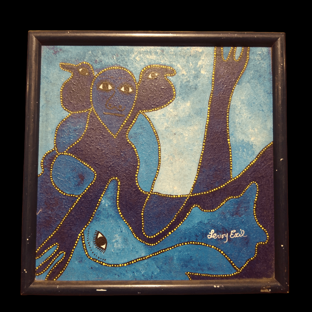Óleo sobre tela del artista haitiano Levoy Exil, que hace aparecer rostros y figuras de pájaros a través de un juego de superposición de fomigueas en tonos azules. Las siluetas son detalladas con puntos amarillos, dábdole luz a la pieza. La obra tiene un marco sescillo de madera negra que se funde con la obra, haciendo resaltar su contenido.