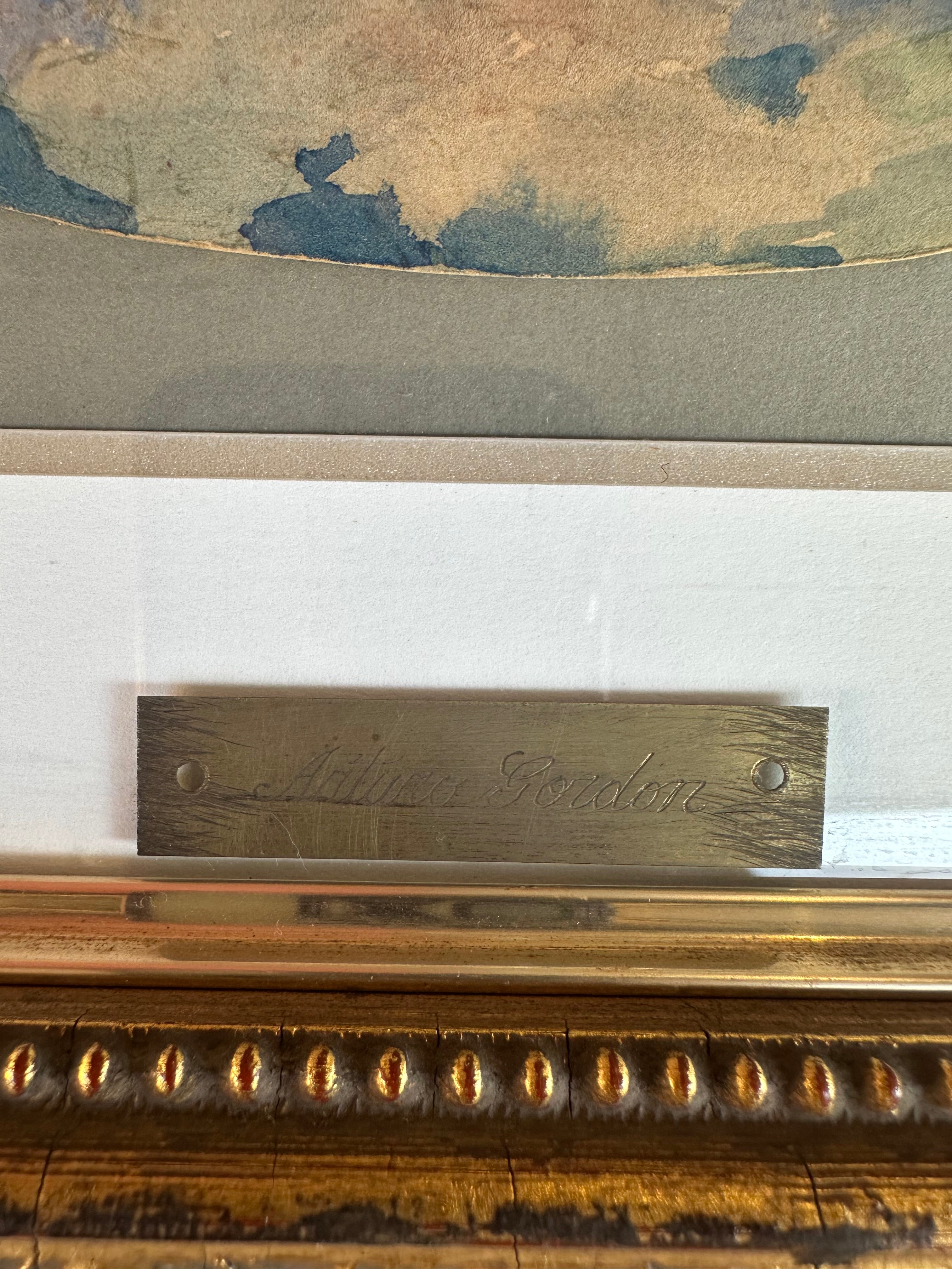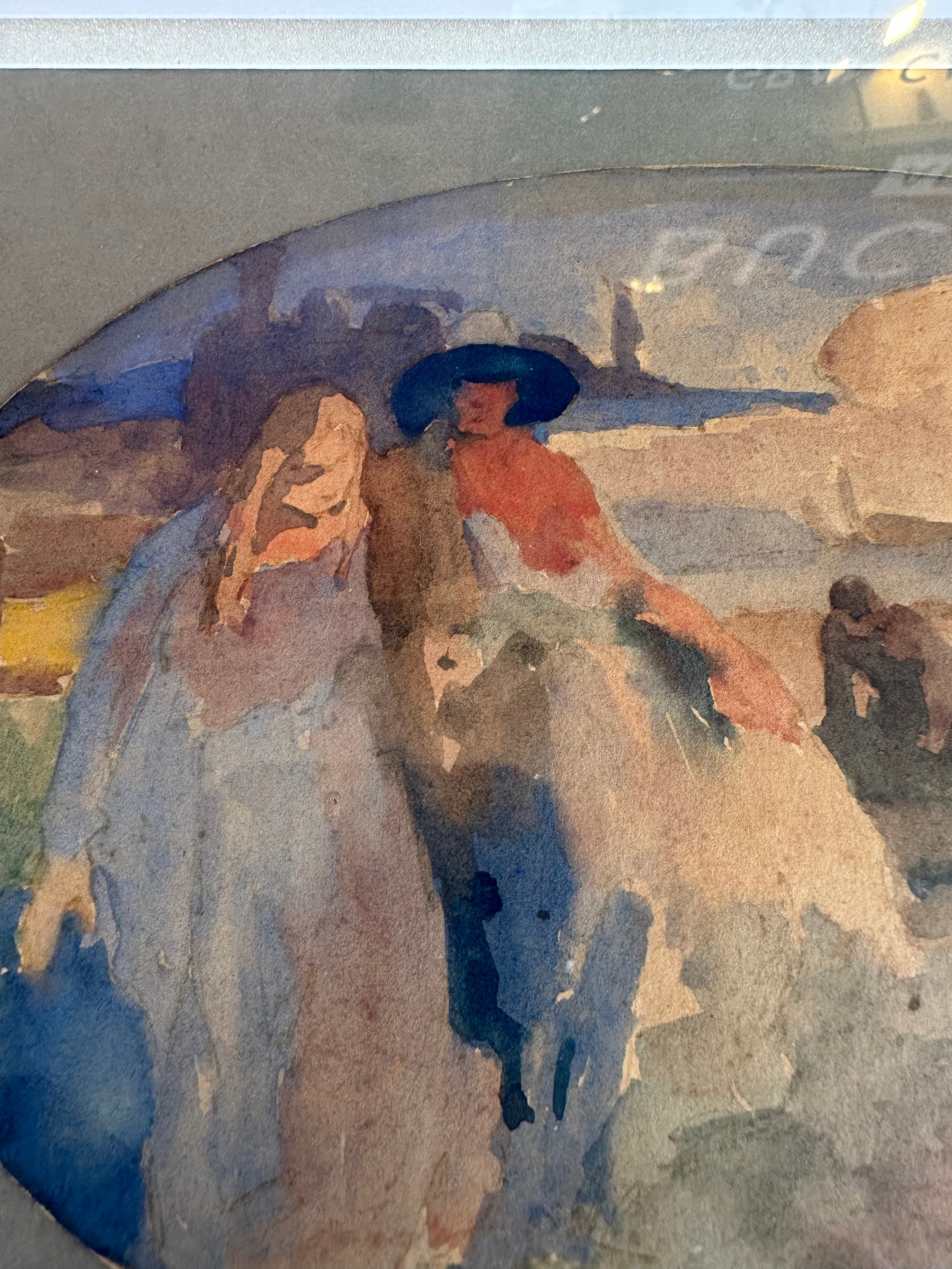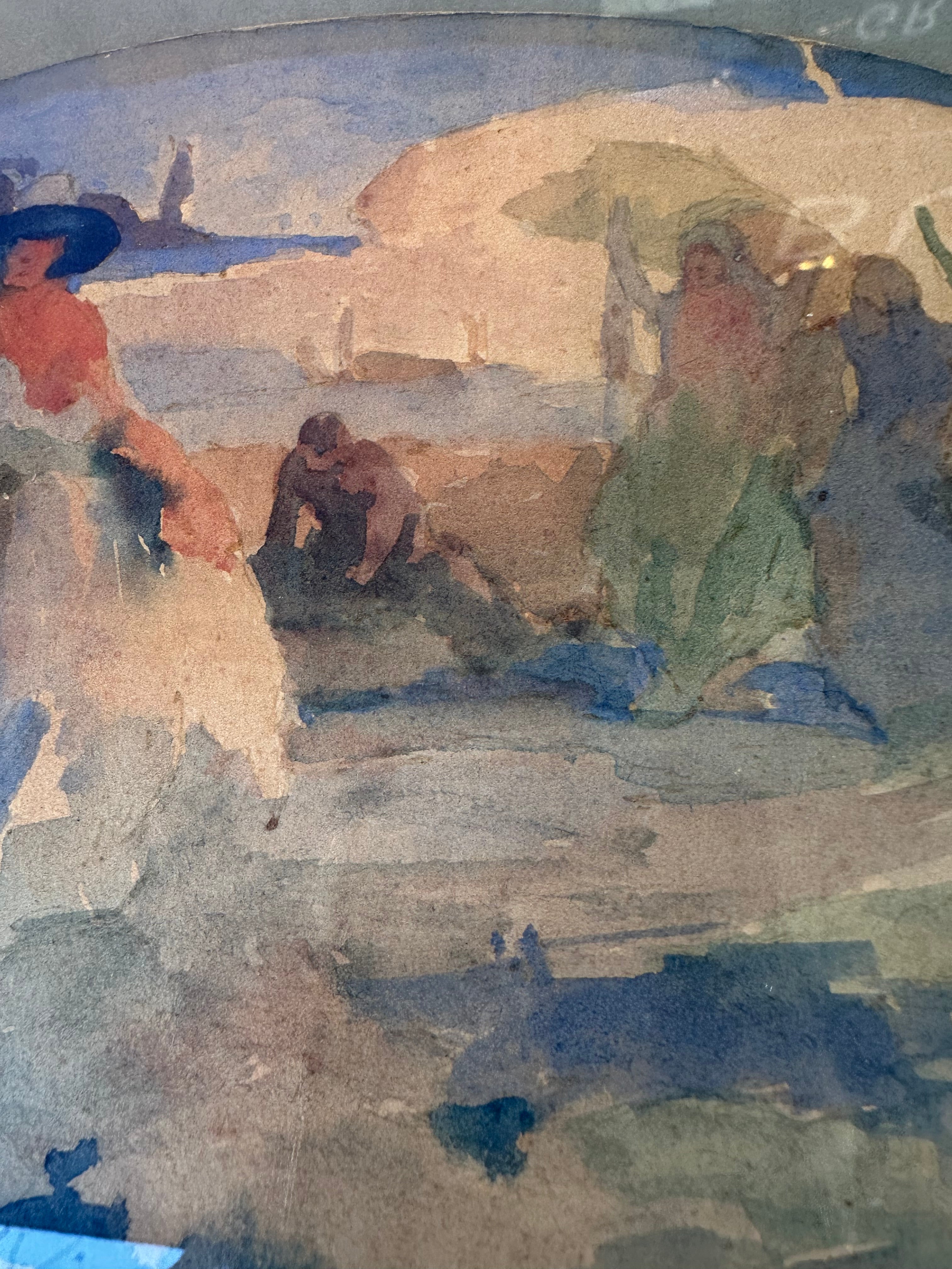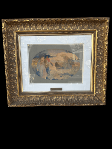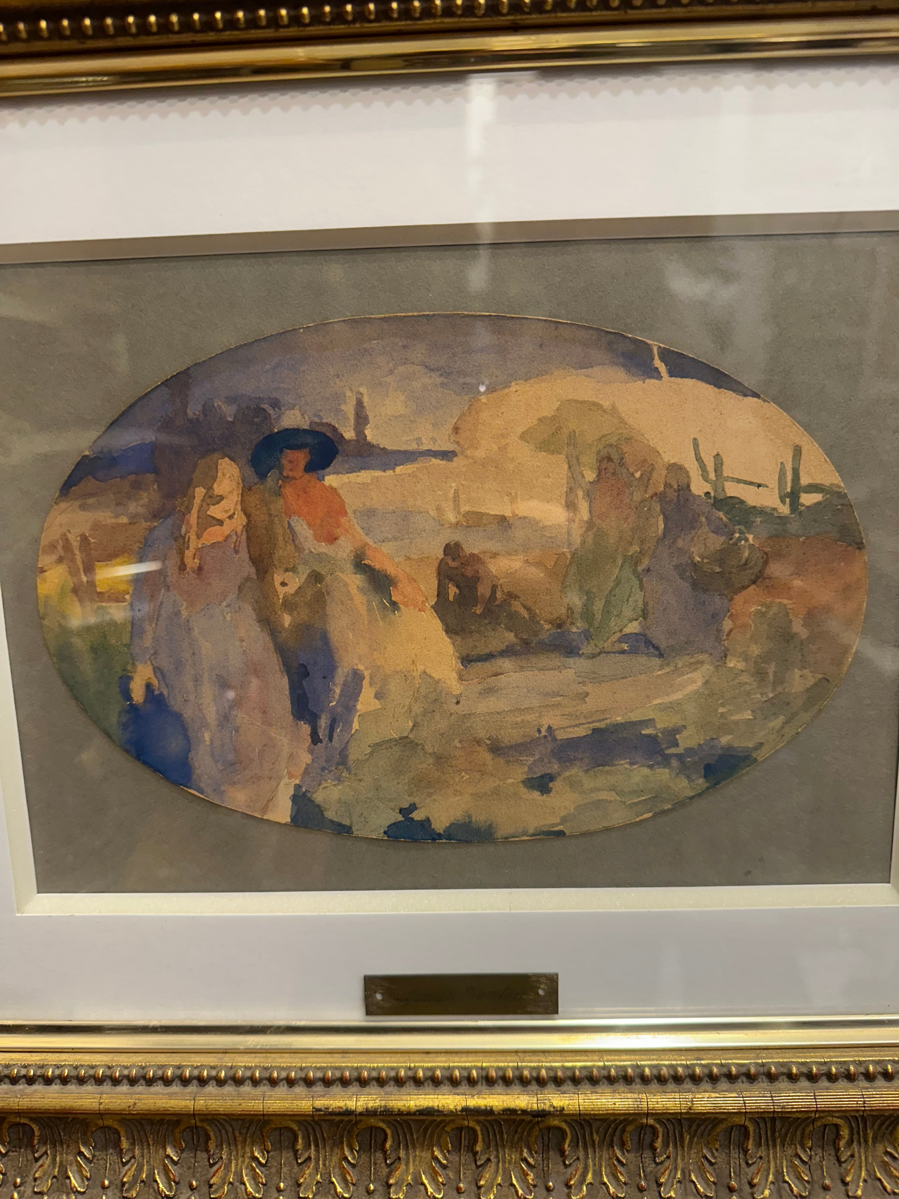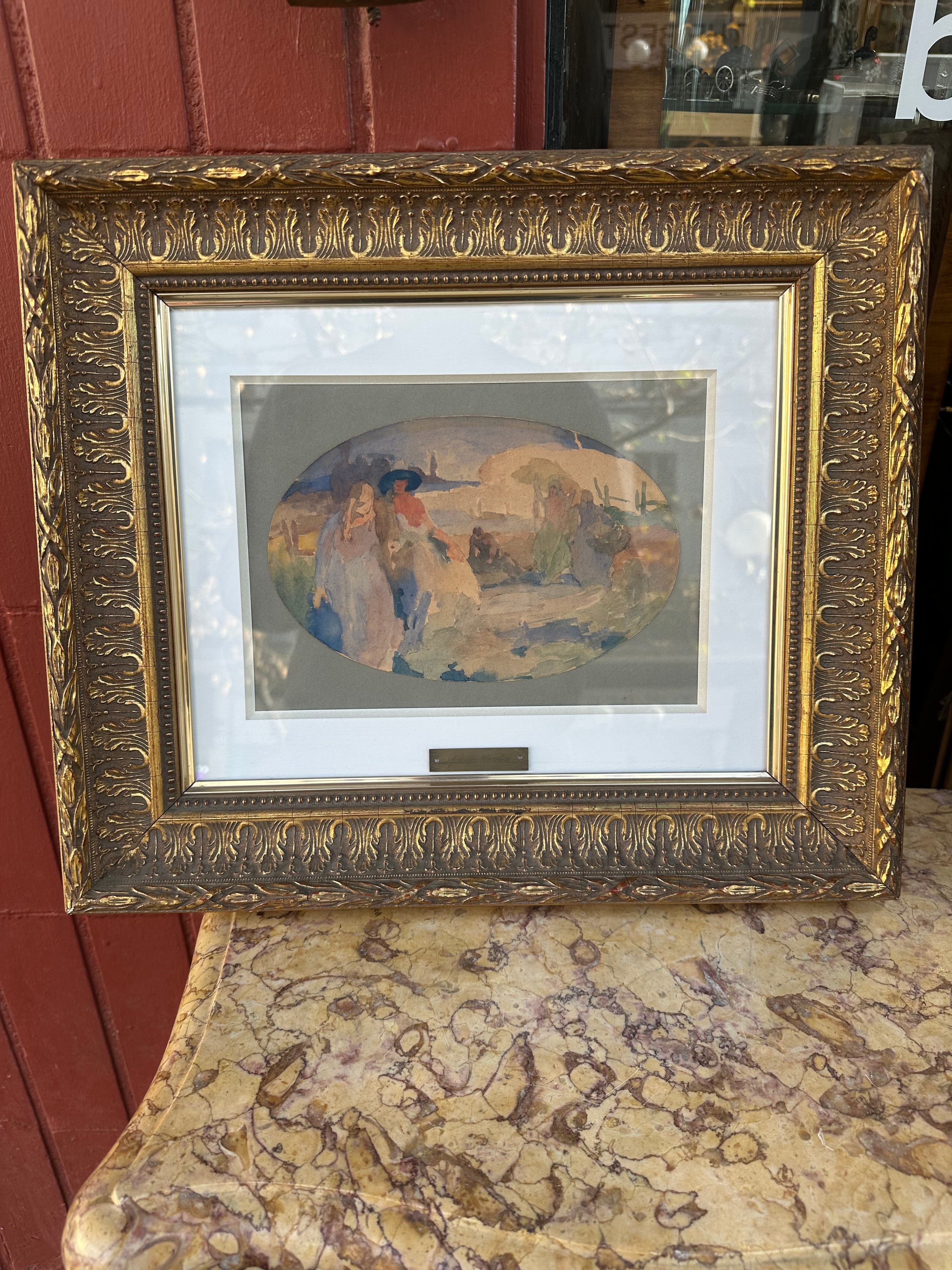 Acuarela sobre papel de color café, del reconocido artista chileno Arturo Gordon (1883 - 1944), representando una escena campestre con varios personajes, entre ellos un burro. Los trazos, que se preocupan del color y la silueta, hacen que sea una obra que requiere detenerse y contemplar para ir leyendo las formas y luego las demás capas más figurativas y narrativas de la composición. La obra tiene un elegante marco de madera tallada en relieves y pintada de dorado.