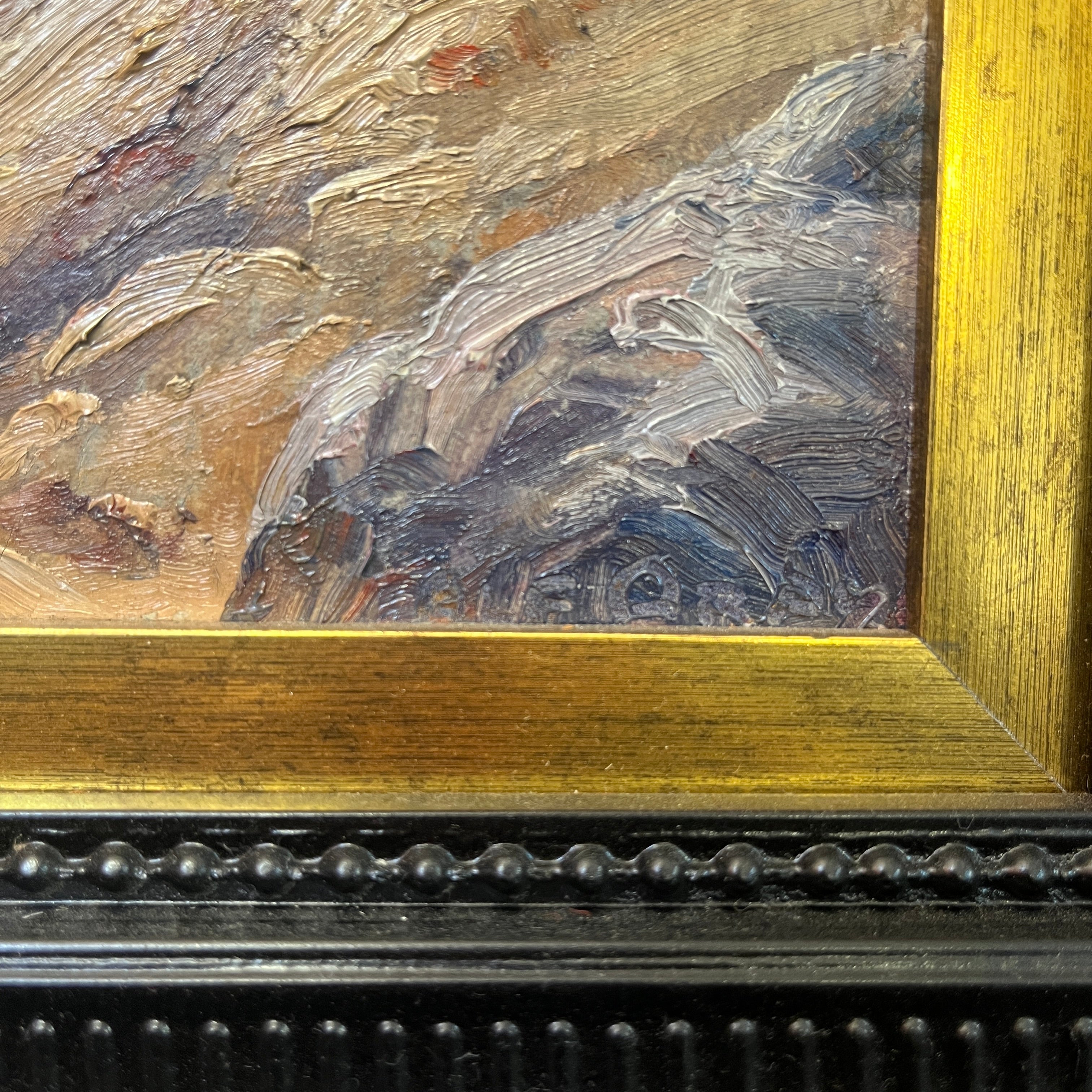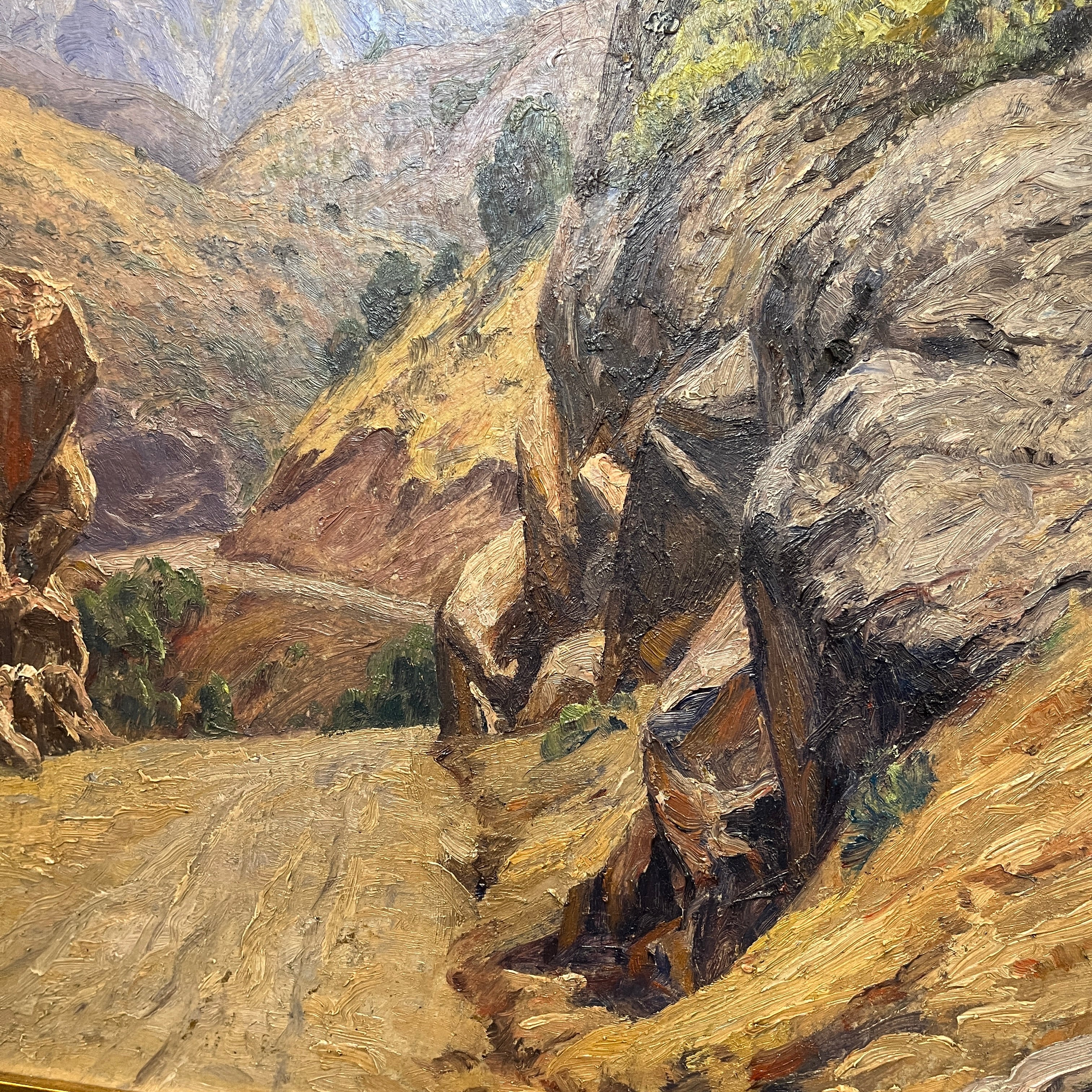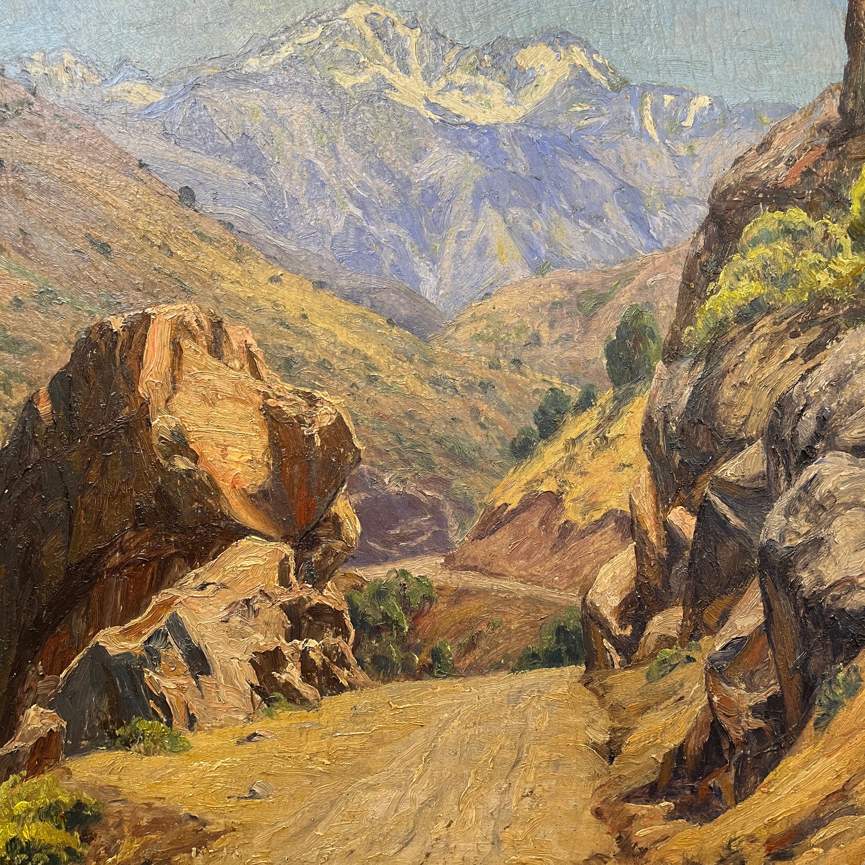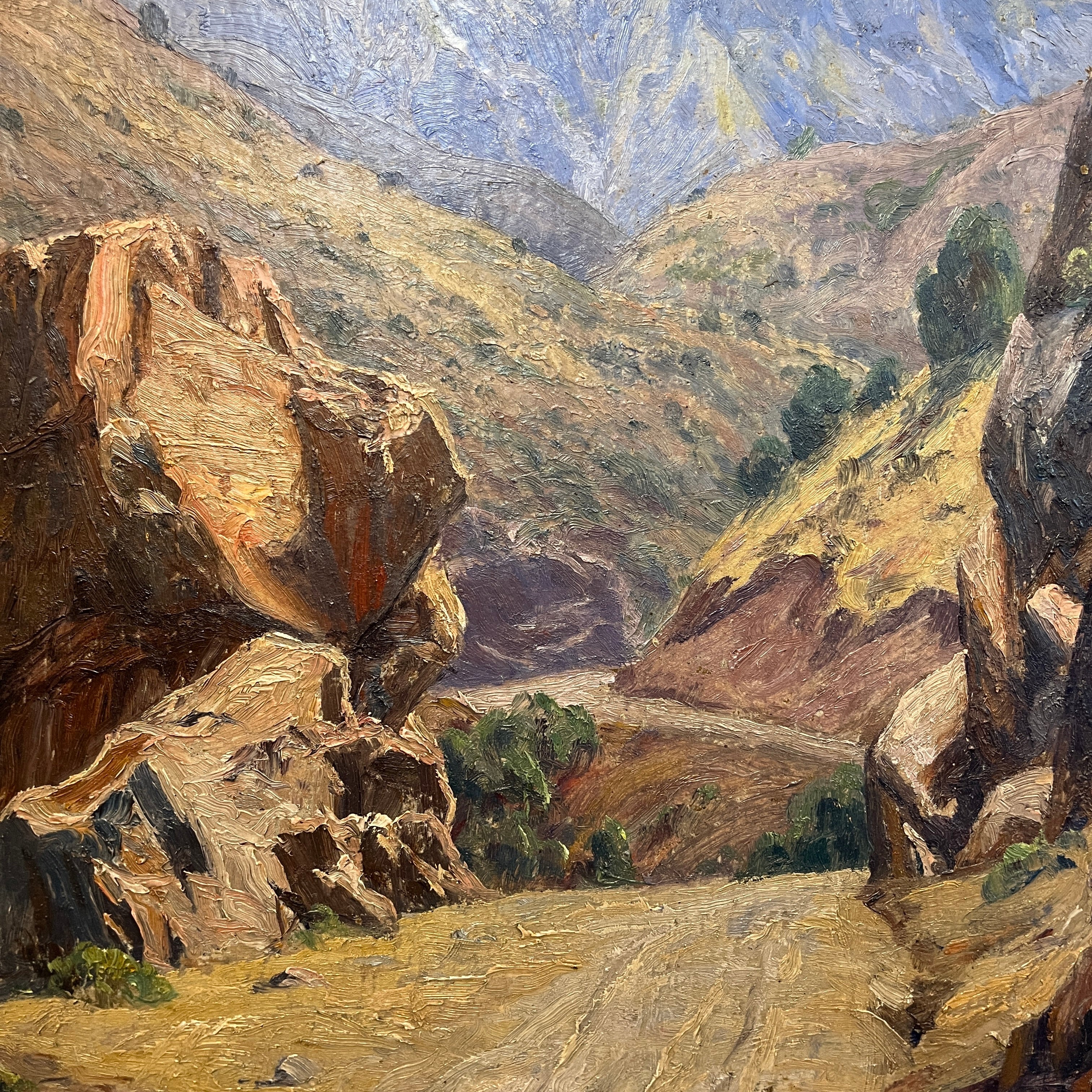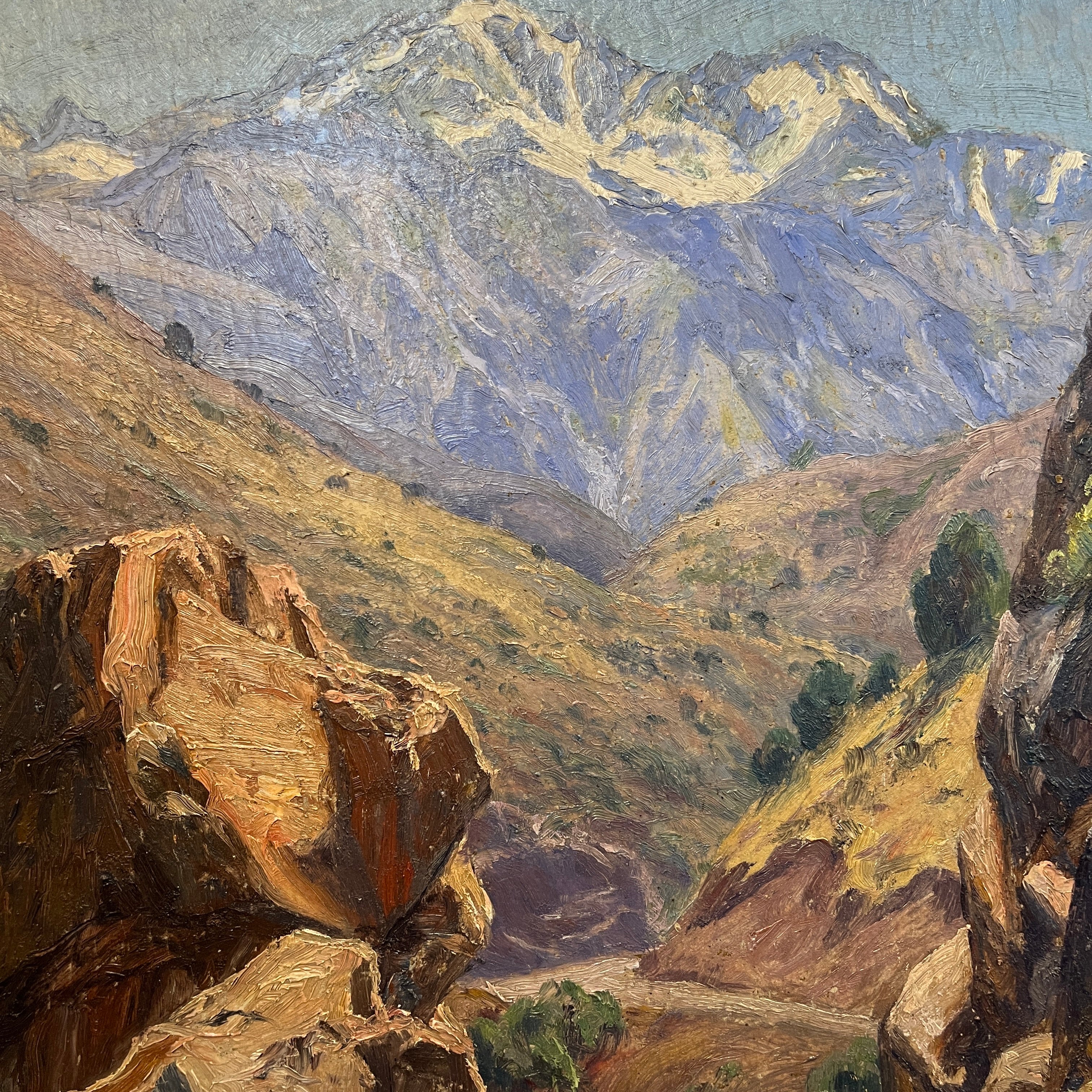 En este bellísimo óleo del clásico artista chileno Alfredo Araya (1893–1954) vemos un paisaje cordillerano propio de nuestro país. A juzgar por el paisaje rocoso y los tonos cafés predominantes, podemos suponer que correspondería a la zona norte-central de chile. La composición de los colores y la textura realista, entregan la sensación de estar dentro de la pintura.