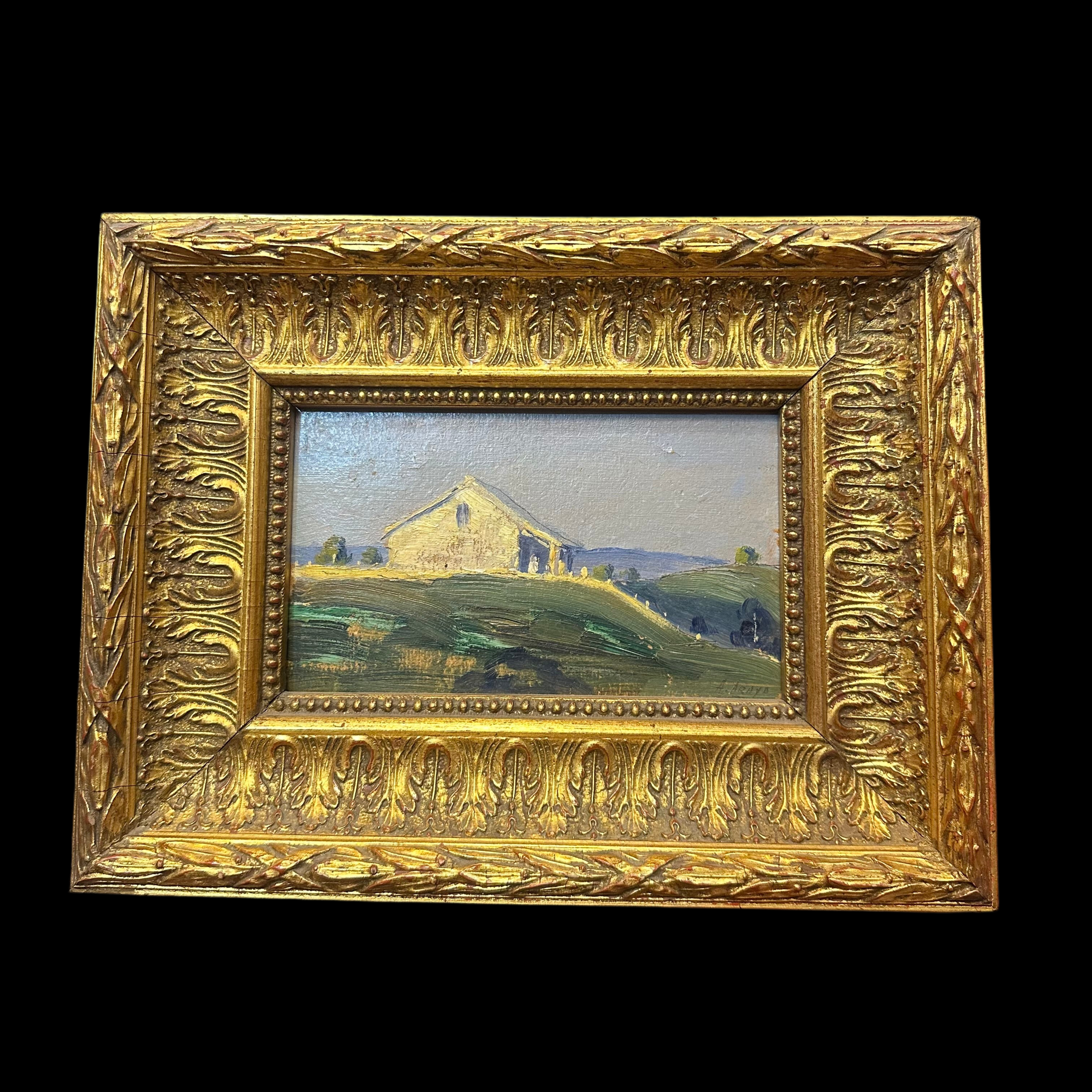 Hermoso óleo sobre madera del auto chileno Alfredo Araya, que representa un paisaje con una casa en una pradera. En la pintura se observan tonos azules y verdes que contrastan con la casa. La obra está enmarcada en madera tallada en finos relieves, acabado en tonos dorados.
