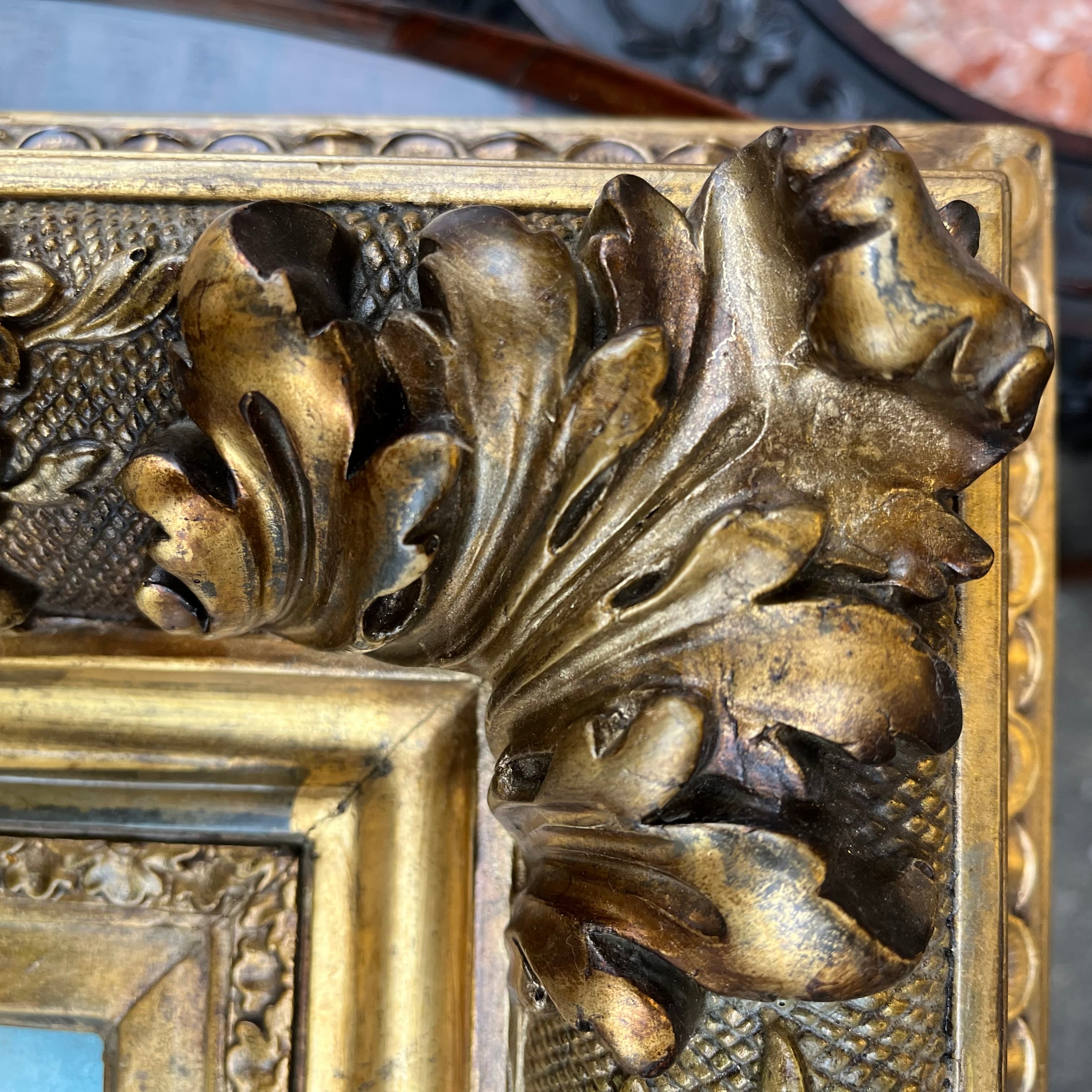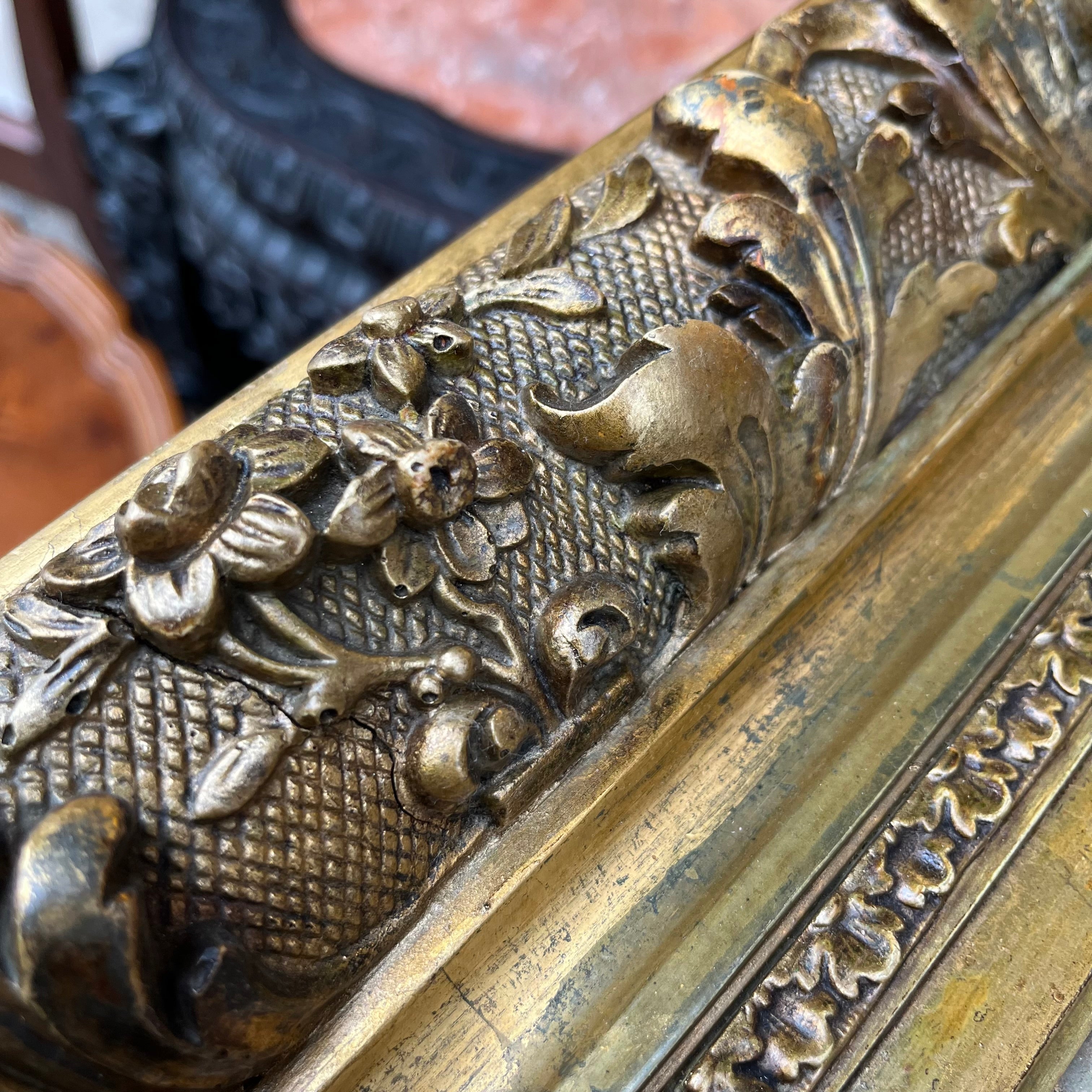 Óleo sobre madera del artista español Alonso Pérez (1881 - 1914), representando a una dama sentada en un jardín, mirando hacia el frente, junto a un caballero. El parece estar diciéndole algo, pero ella no lo mira, sino que mantiene su pose. La escena está detalladamente pintada, capturando con delicadeza no solo las texturas de los encajes y vuelos de su vestido, los dobleces de las telas y los gestos de los personajes, sino que las texturas del paisaje y el cielo. La obra tiene un grandioso marco de madera tallada en relieves, terminada en una elegante pintura dorada.