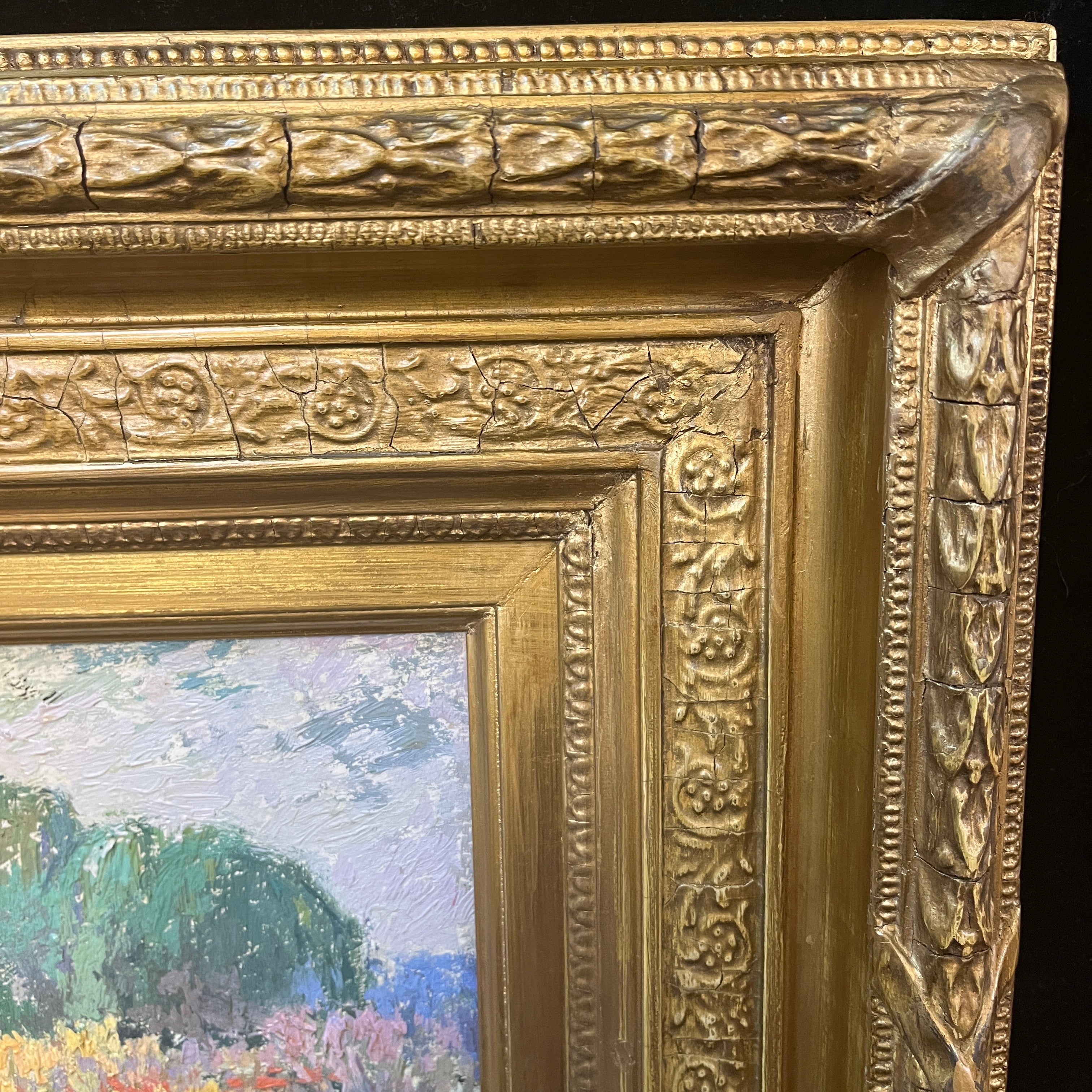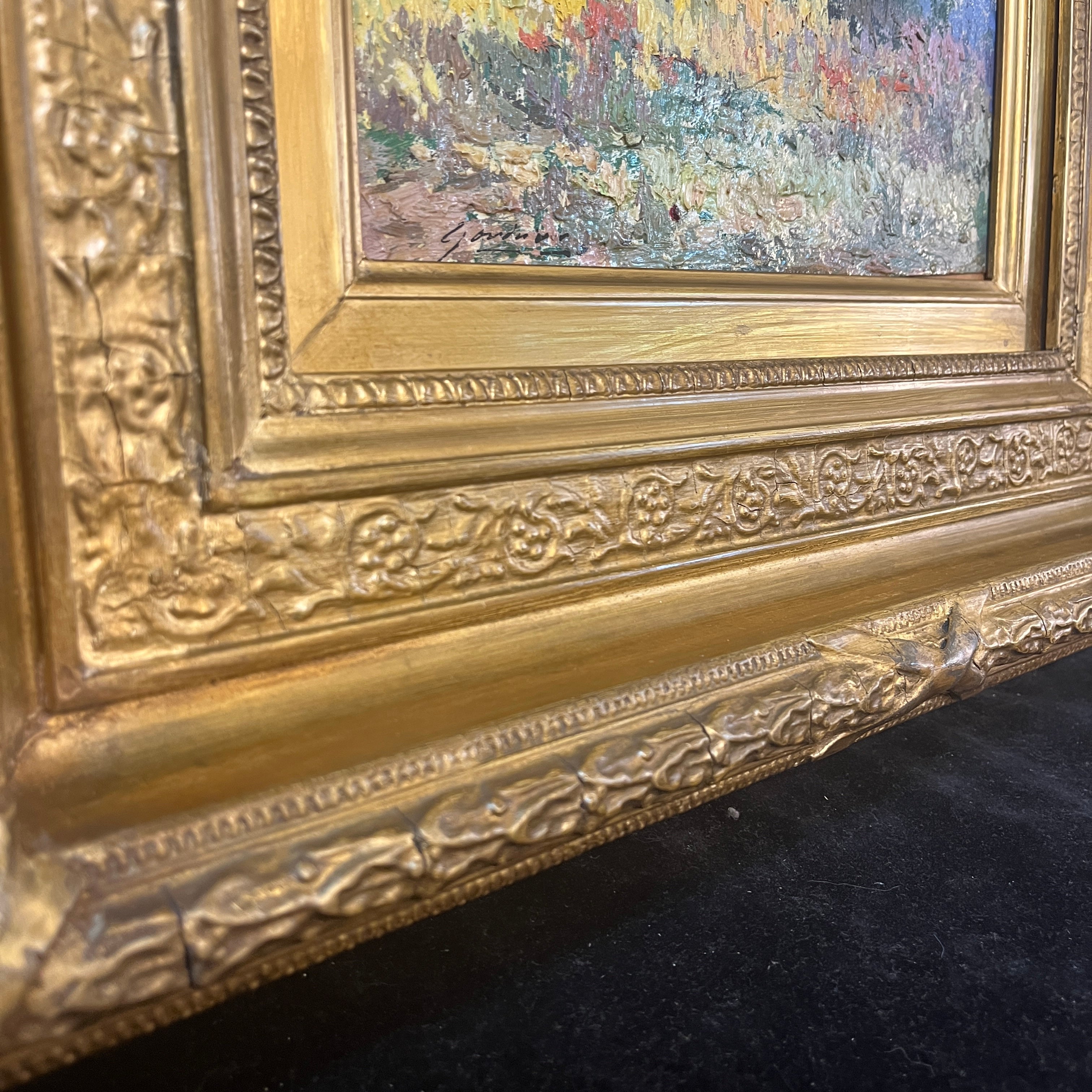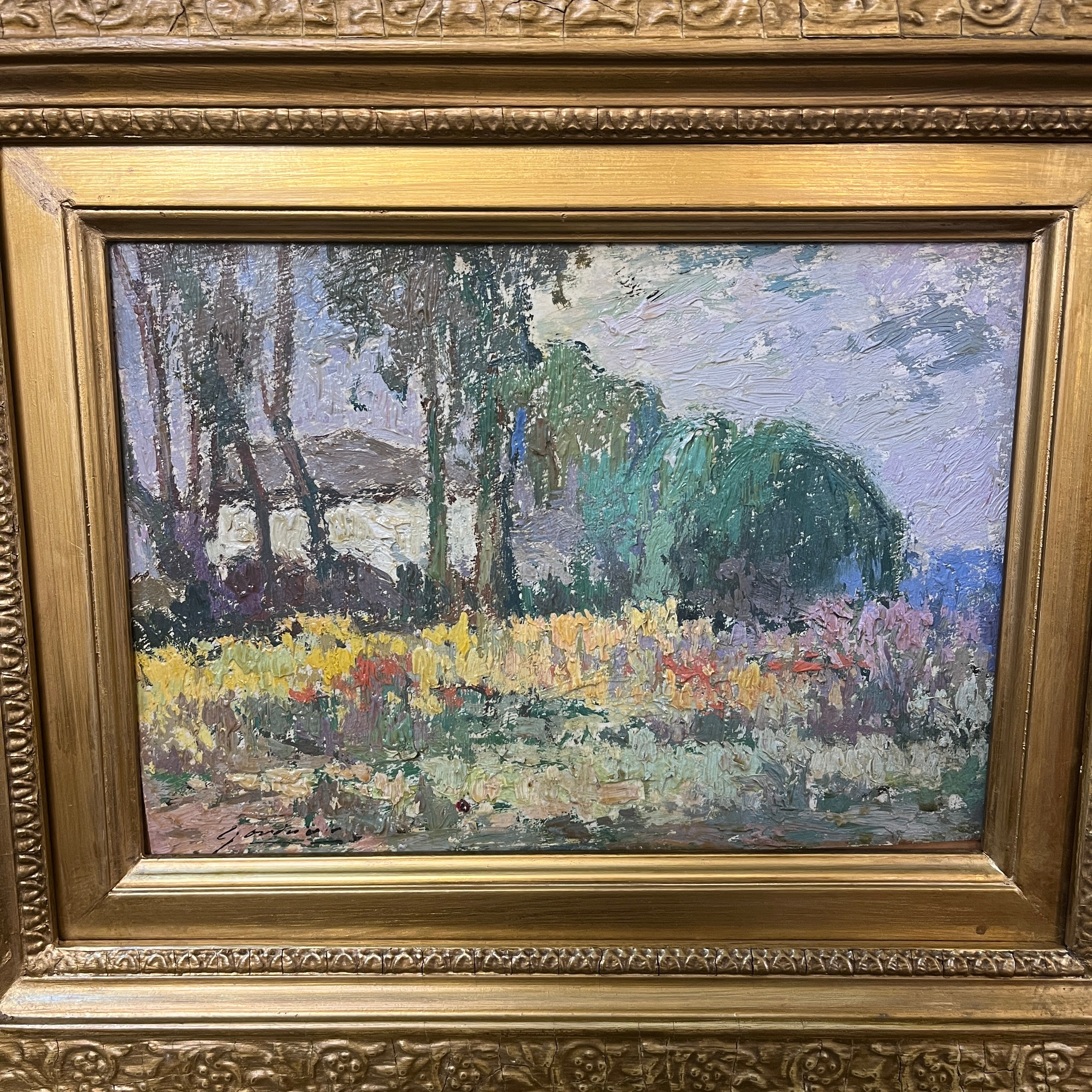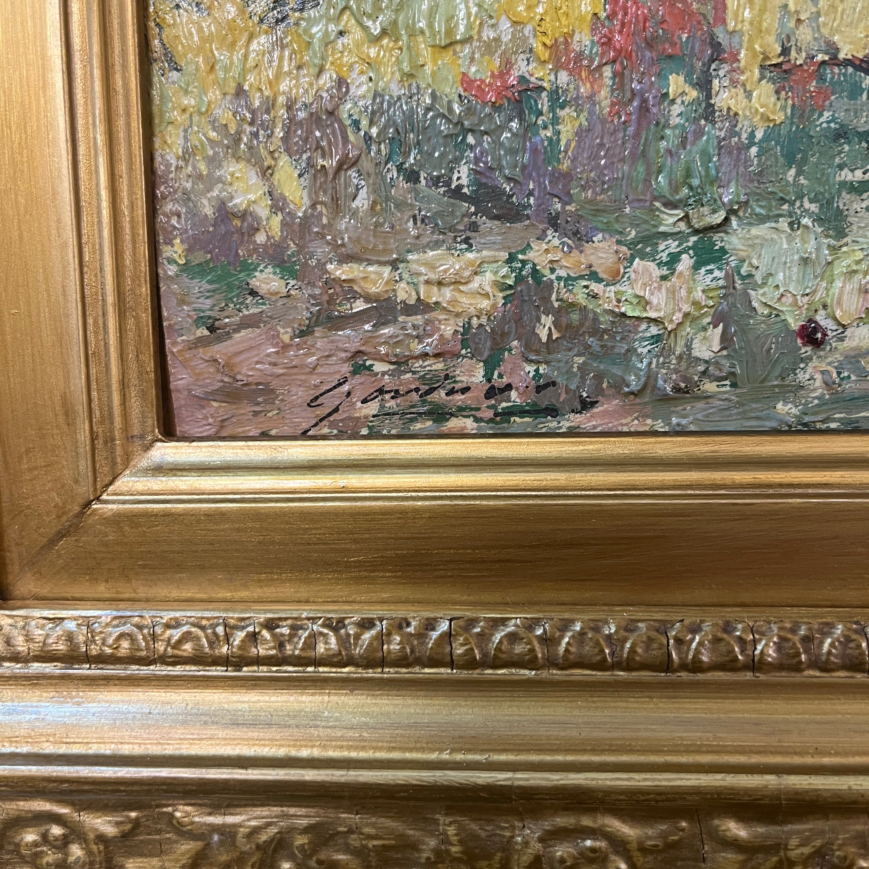 Óleo sobre cartón del artista chileno Arturo Gordon, representando un bello y tranquilo paisaje. . La obra está enmarcada en un marco de madera pintado negro con algunos desgastes y la obra está protegida con vidrio.