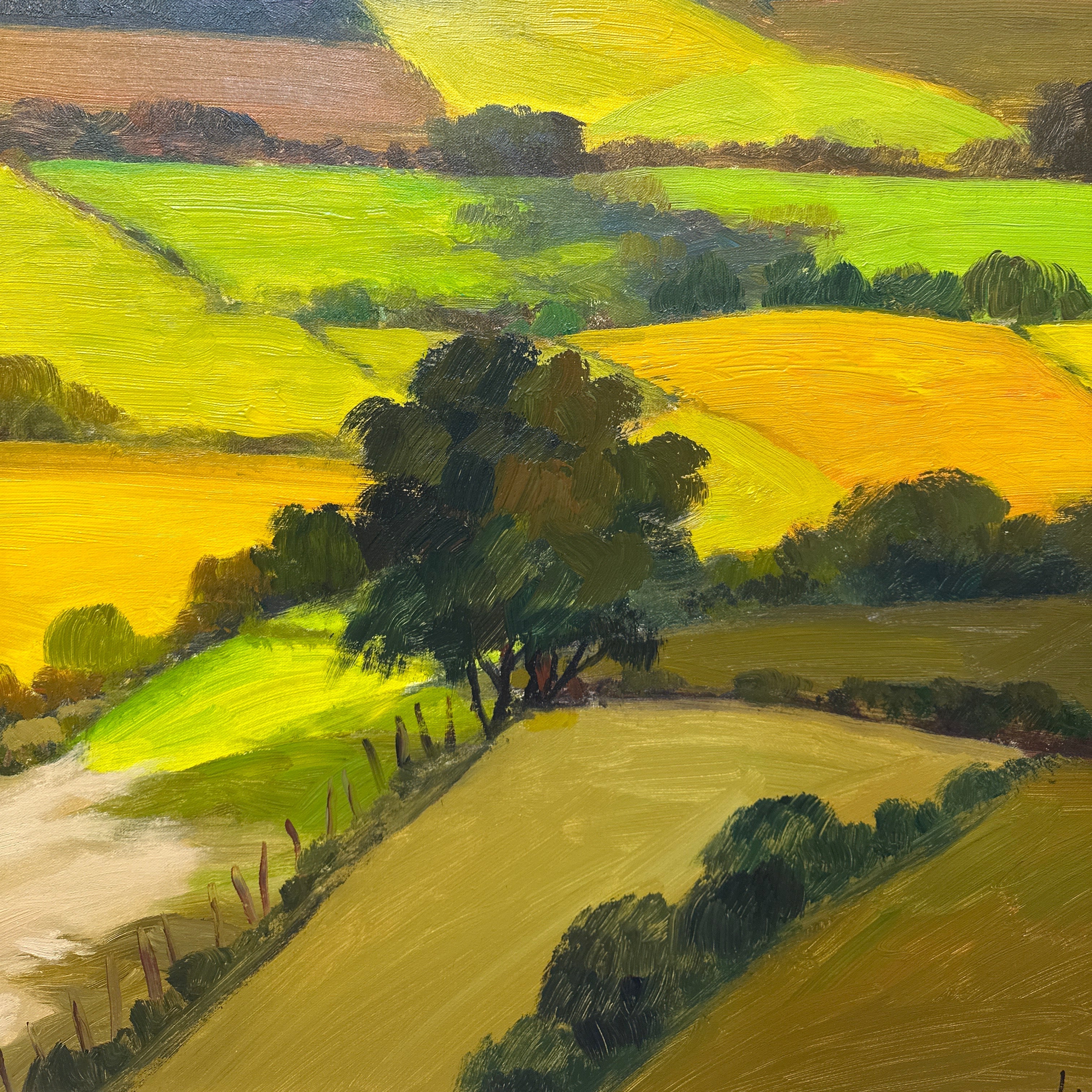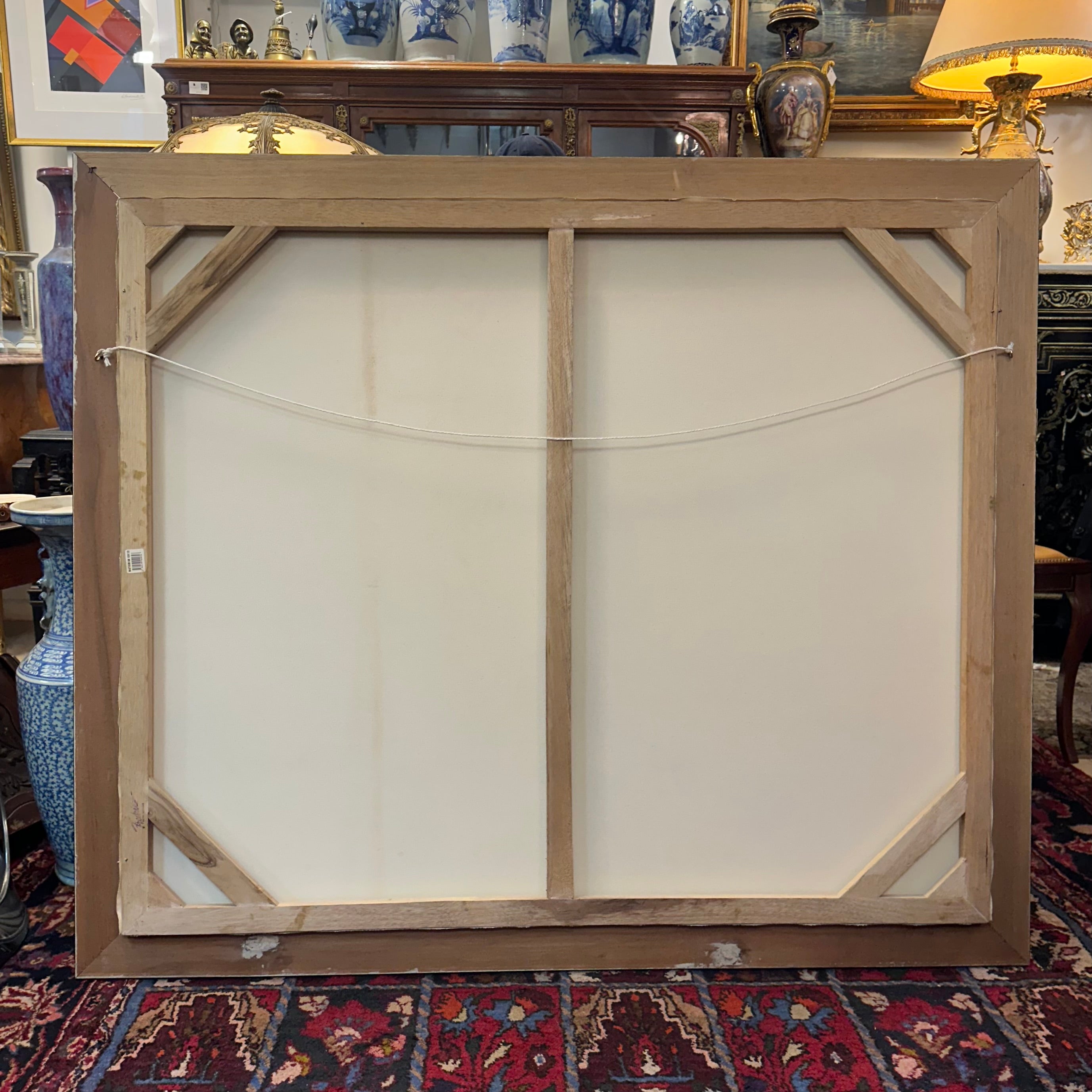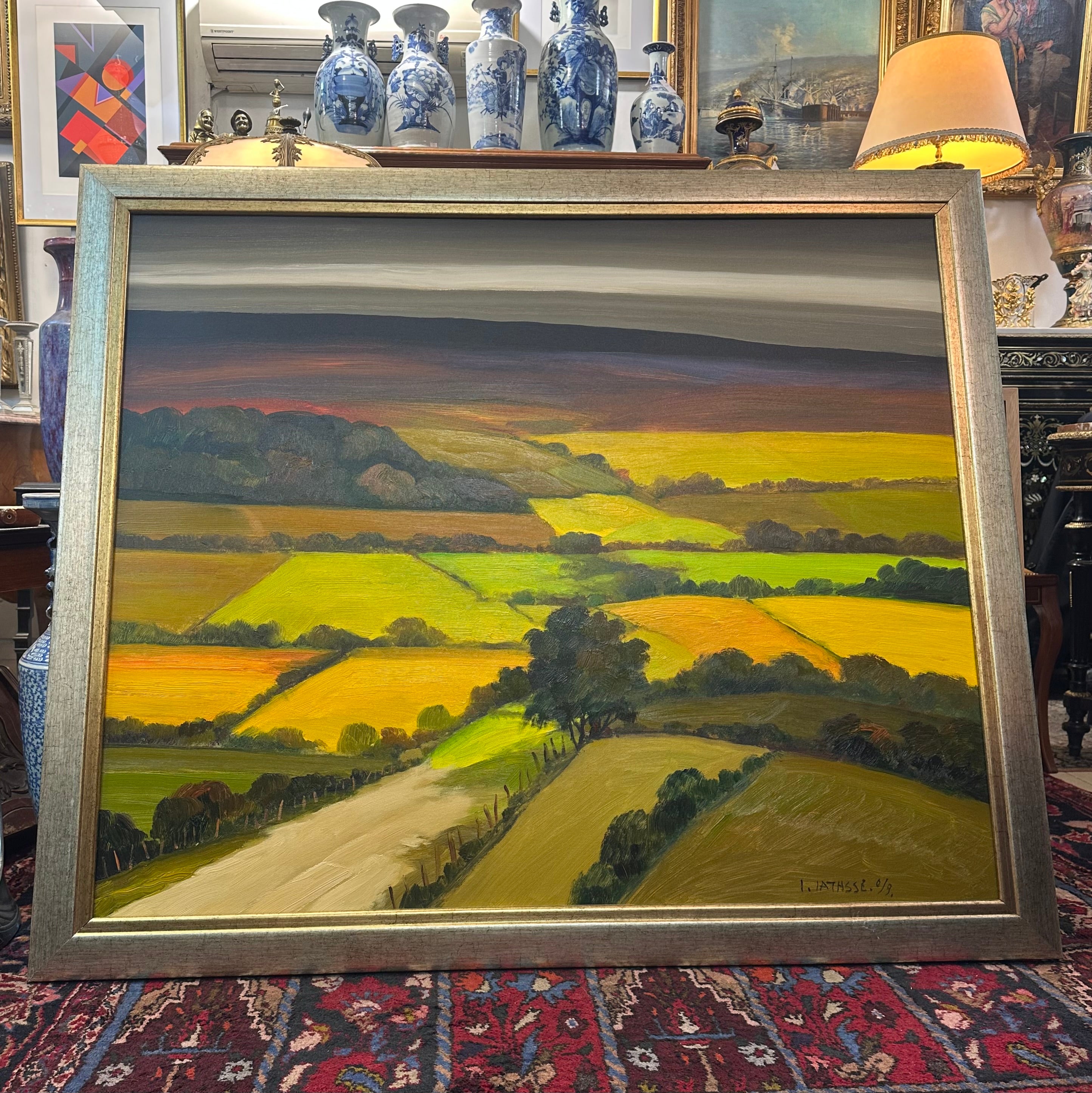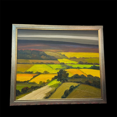 Óleo del artista chileno Carlos Catasse. En la pintura se aprecia un paisaje campestre en tonos cálidos, acompañado por un marco de madera pintado plateado y dorado con detalles de estilo envejecido.