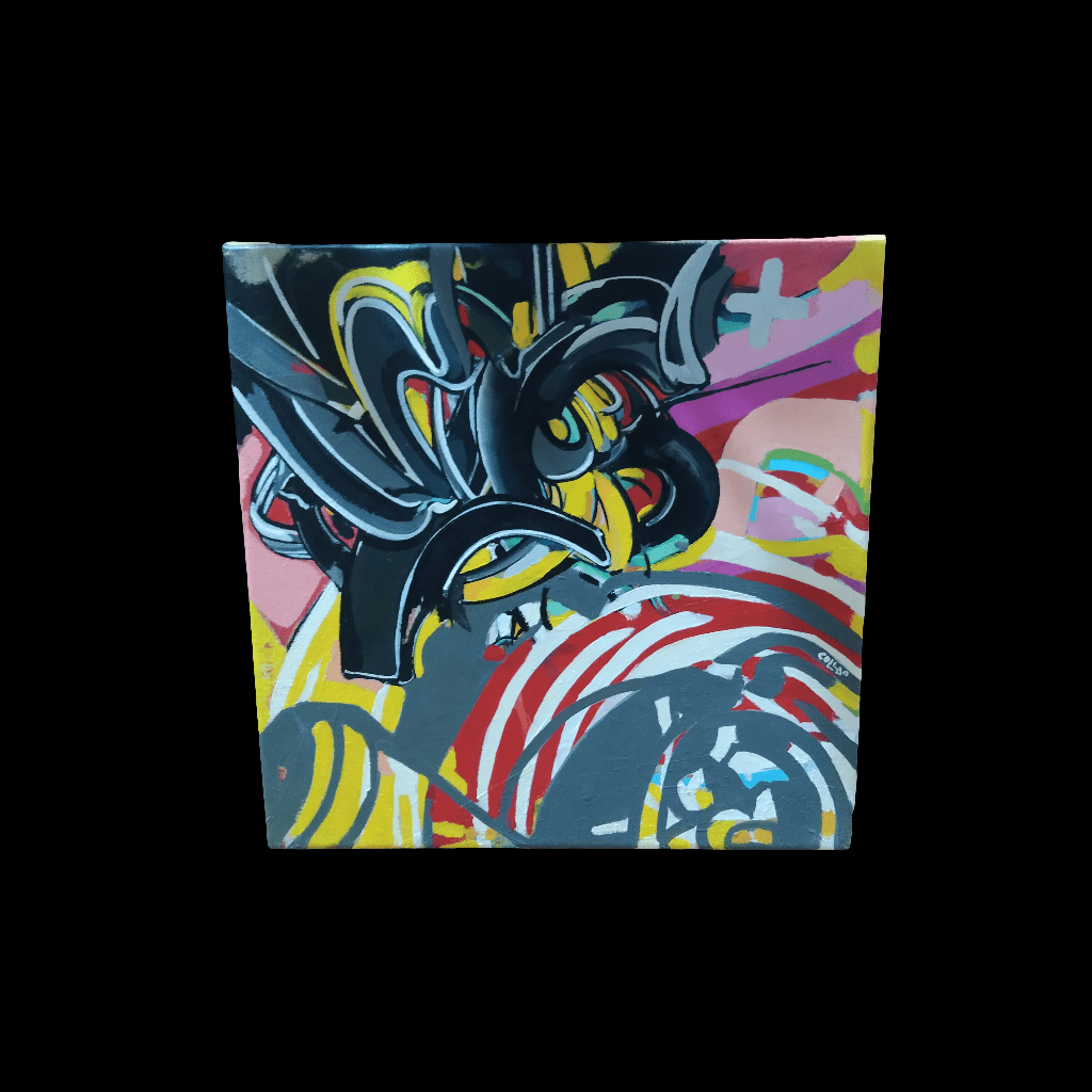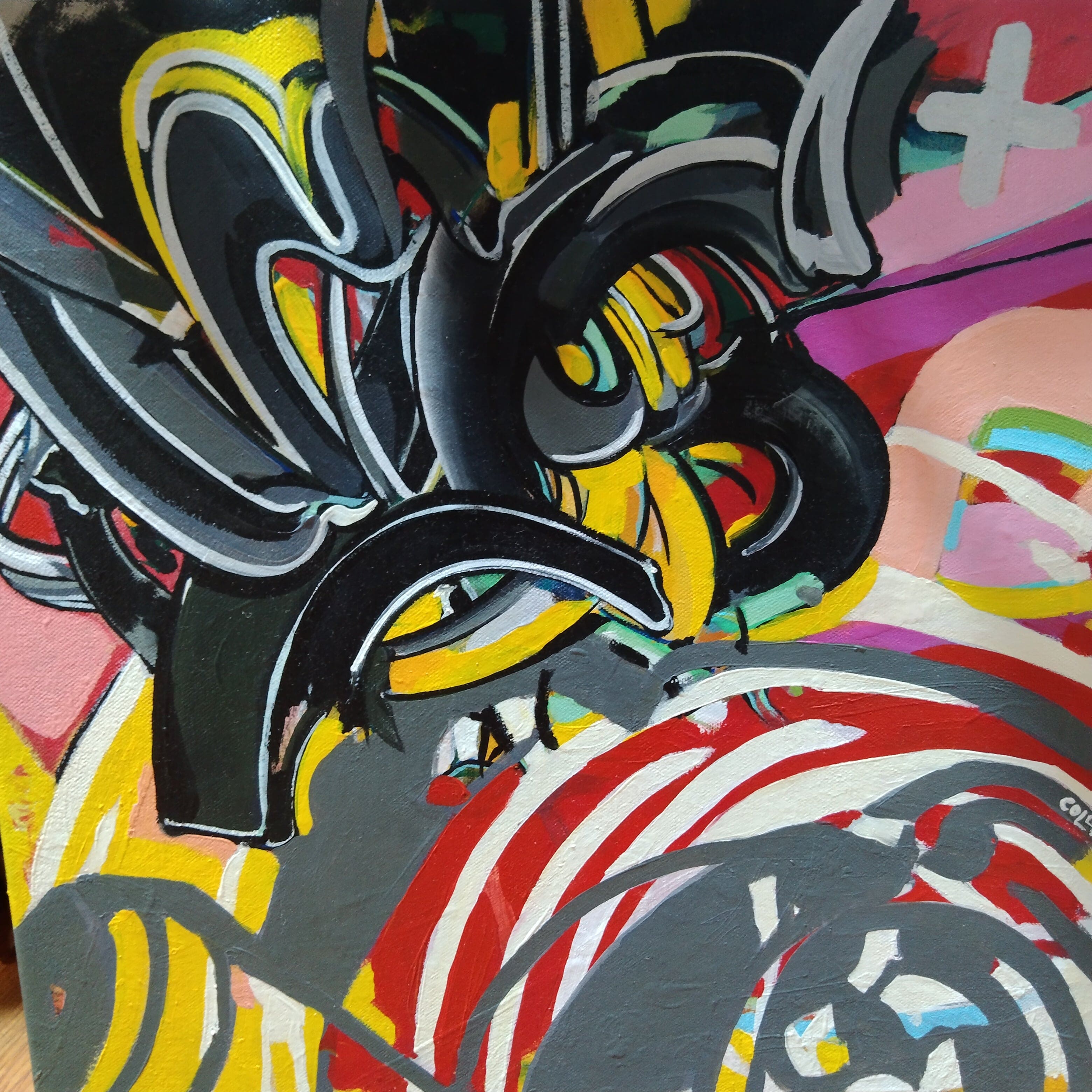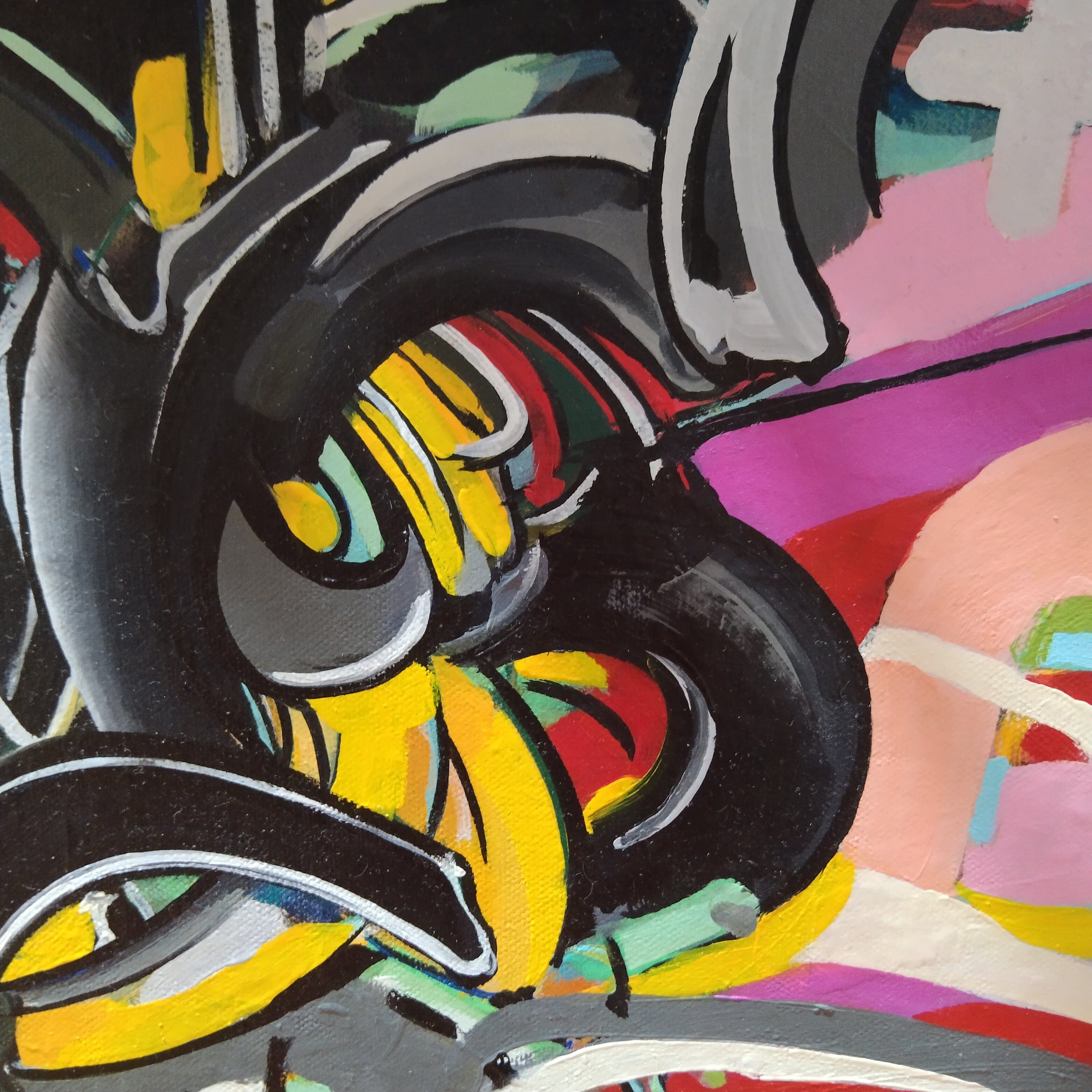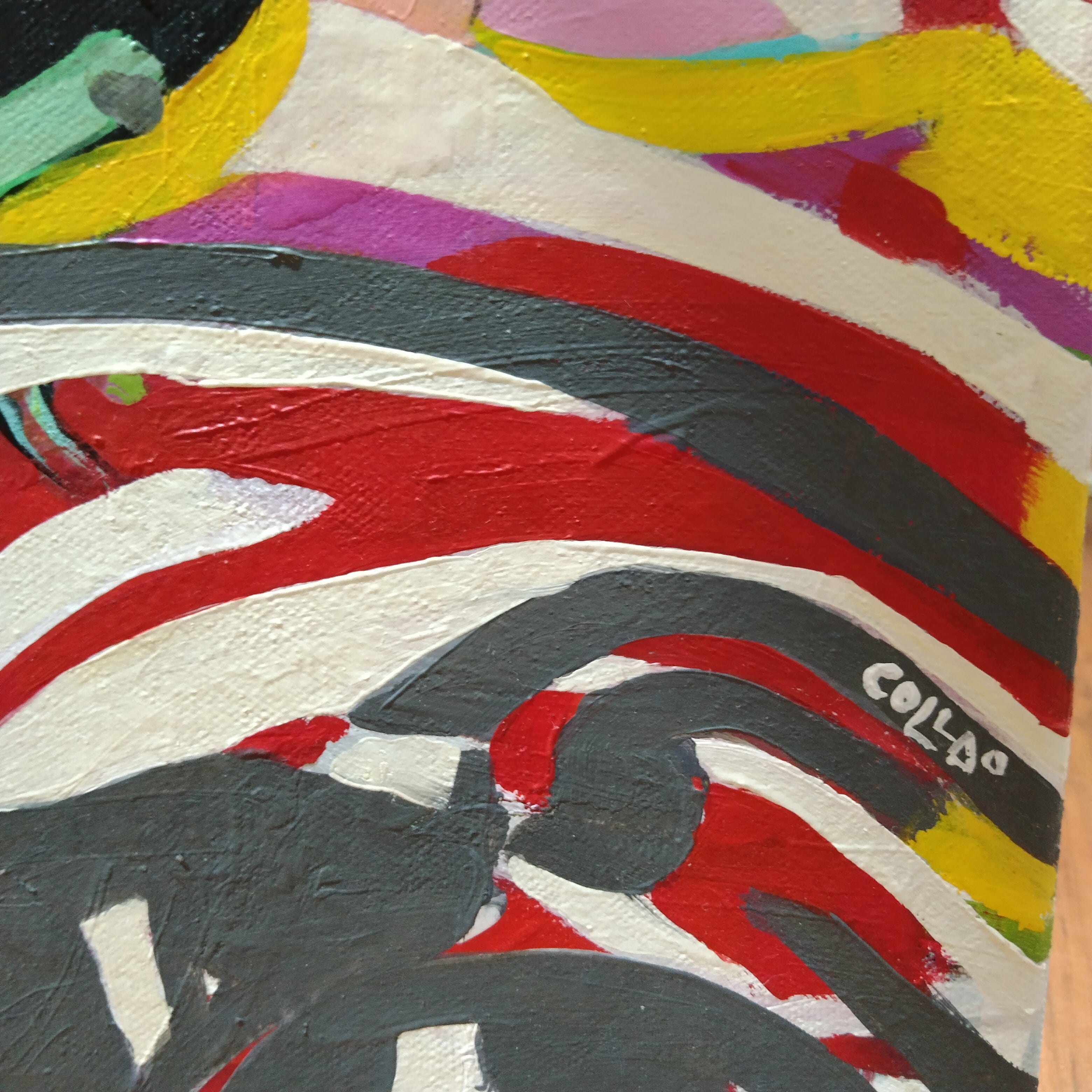 Óleo sobre tela de la artista chilena Claudia Collao en el que superpone distintos trazos curvos, de diferentes colores, haciendo una composición abstracta muy única y reconocible en el trabajo de la artista.