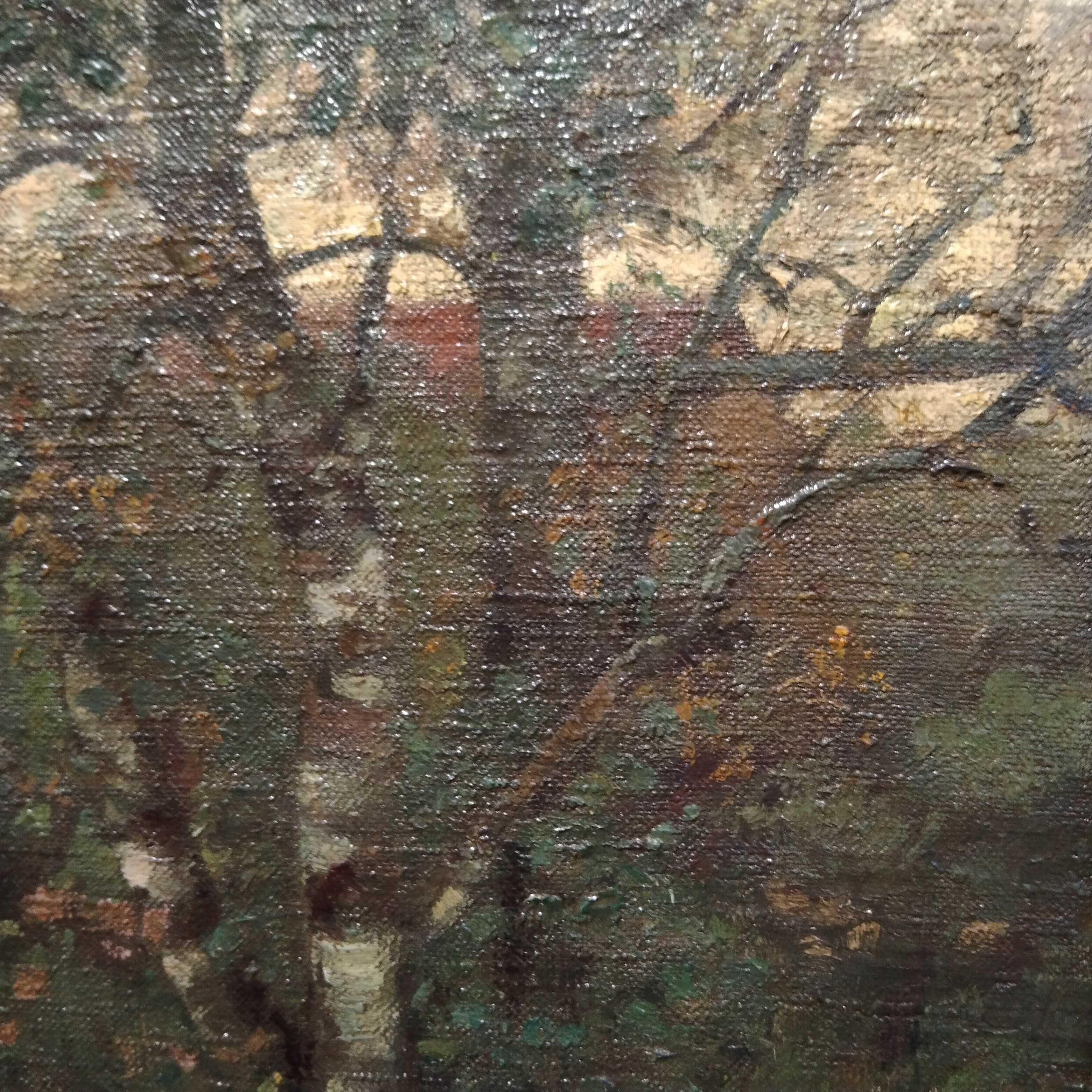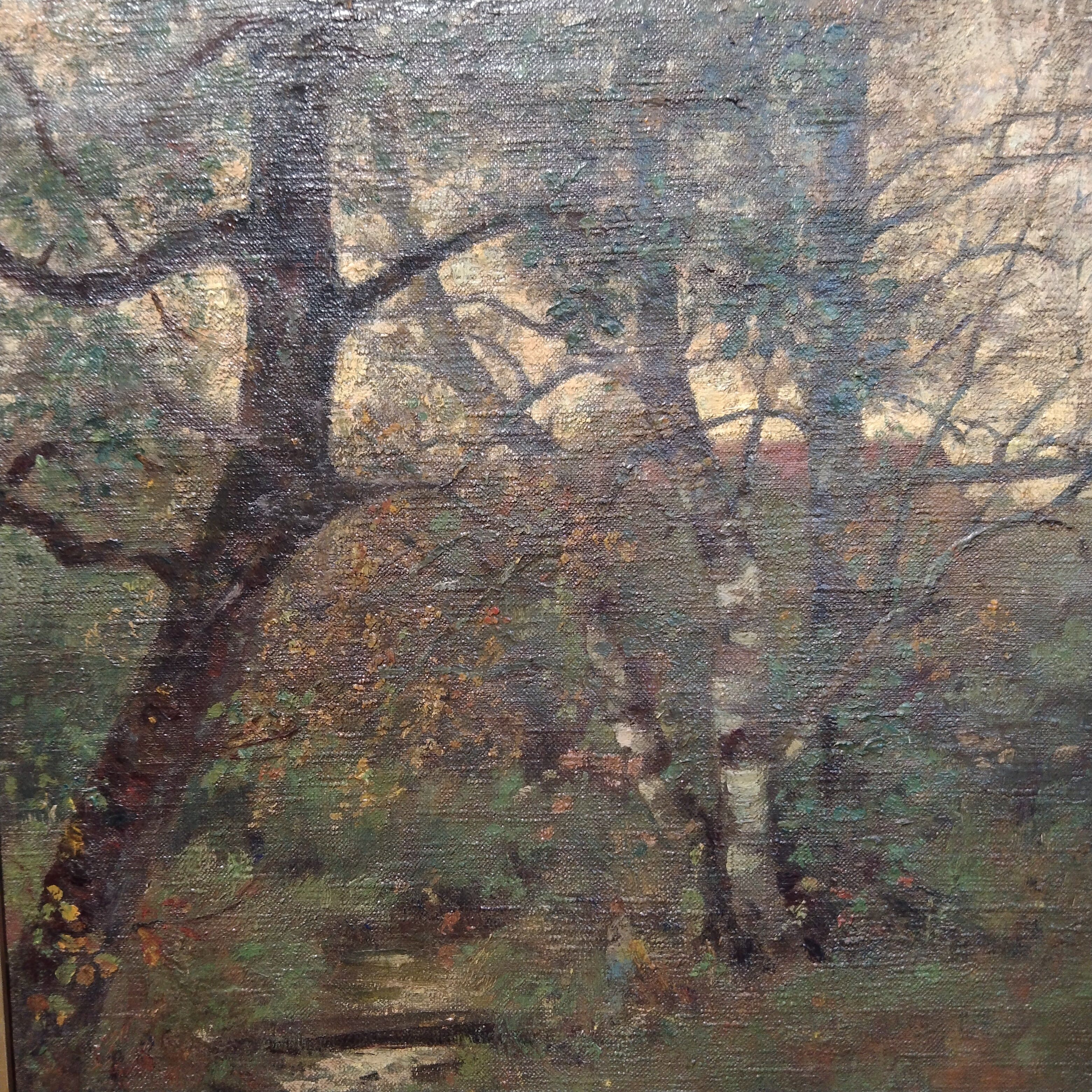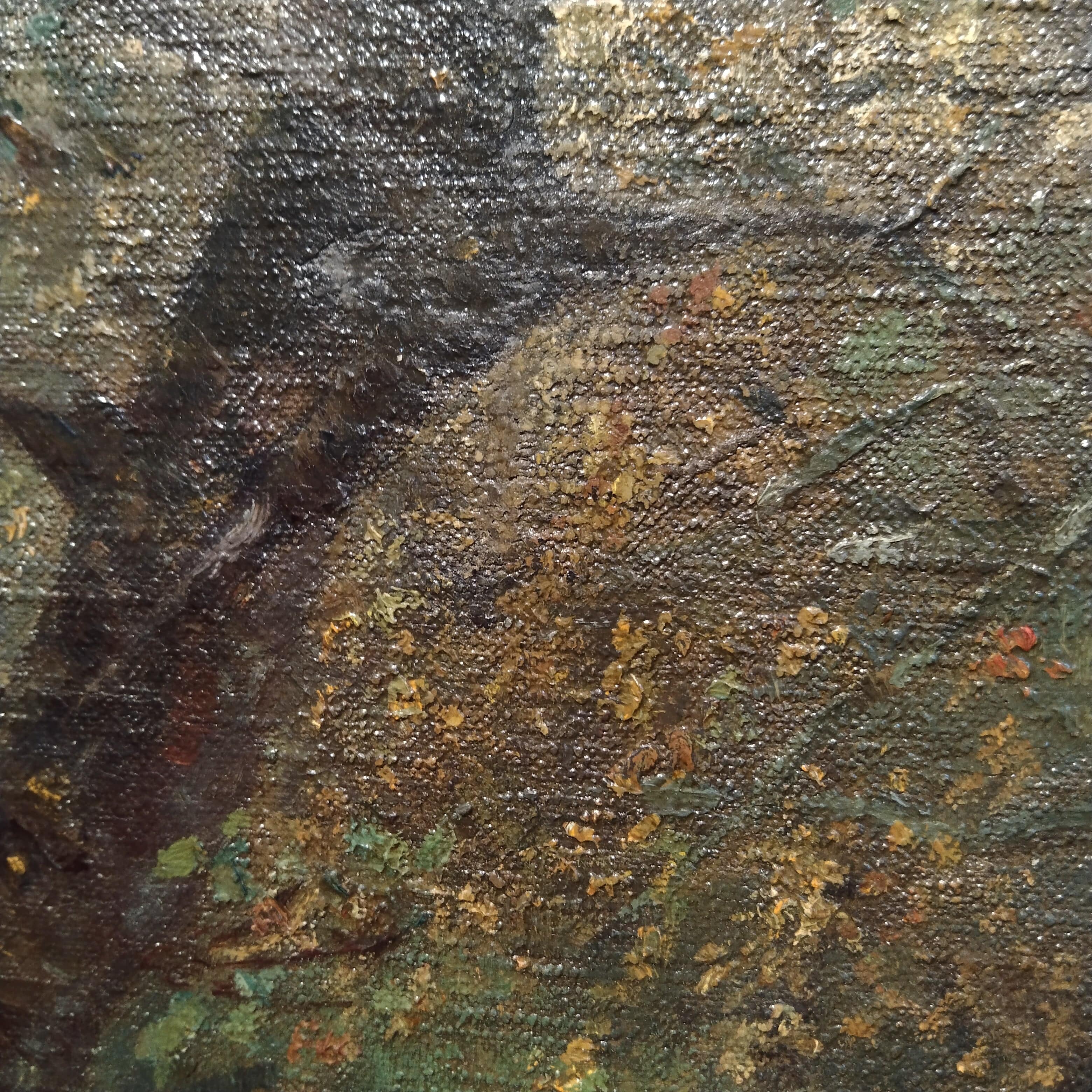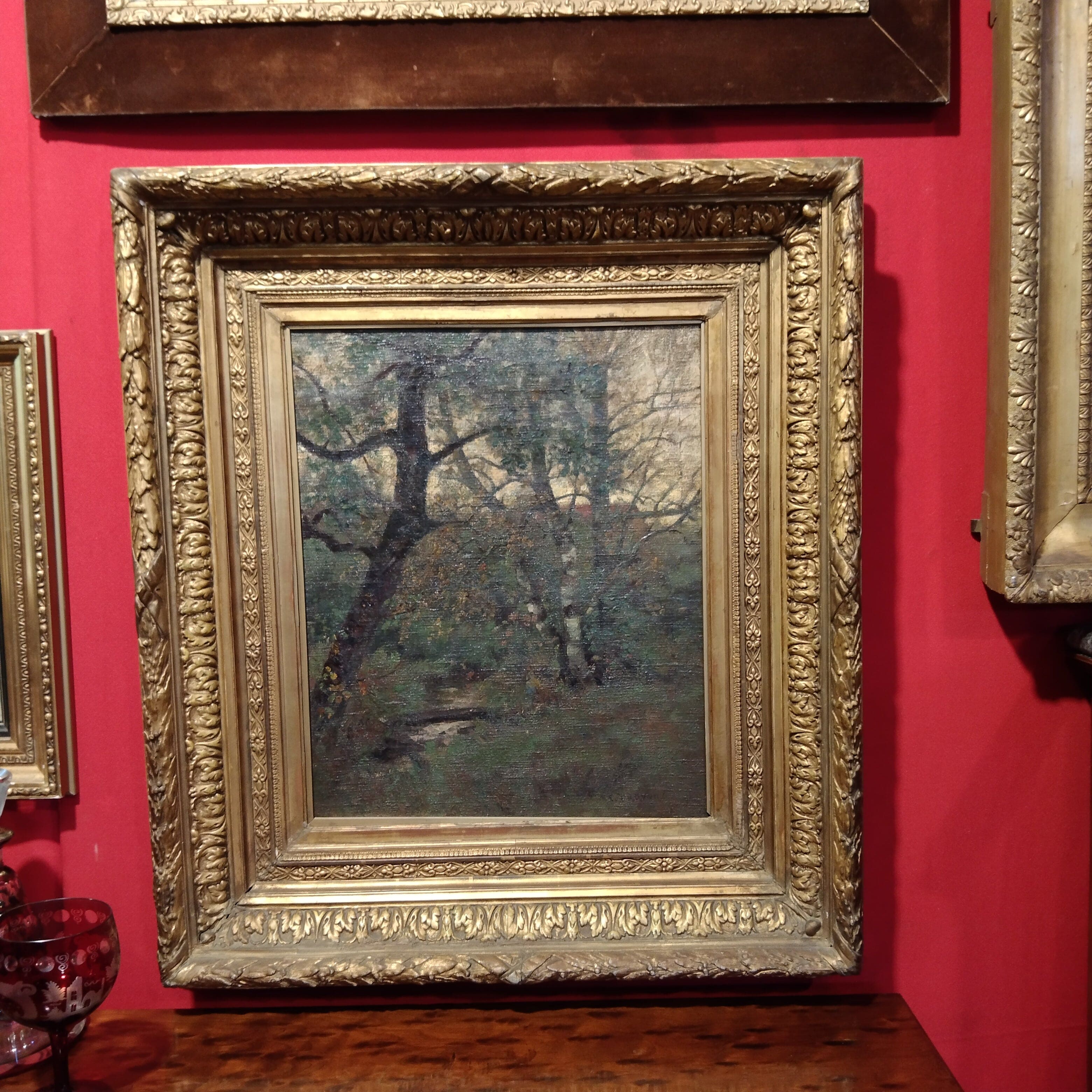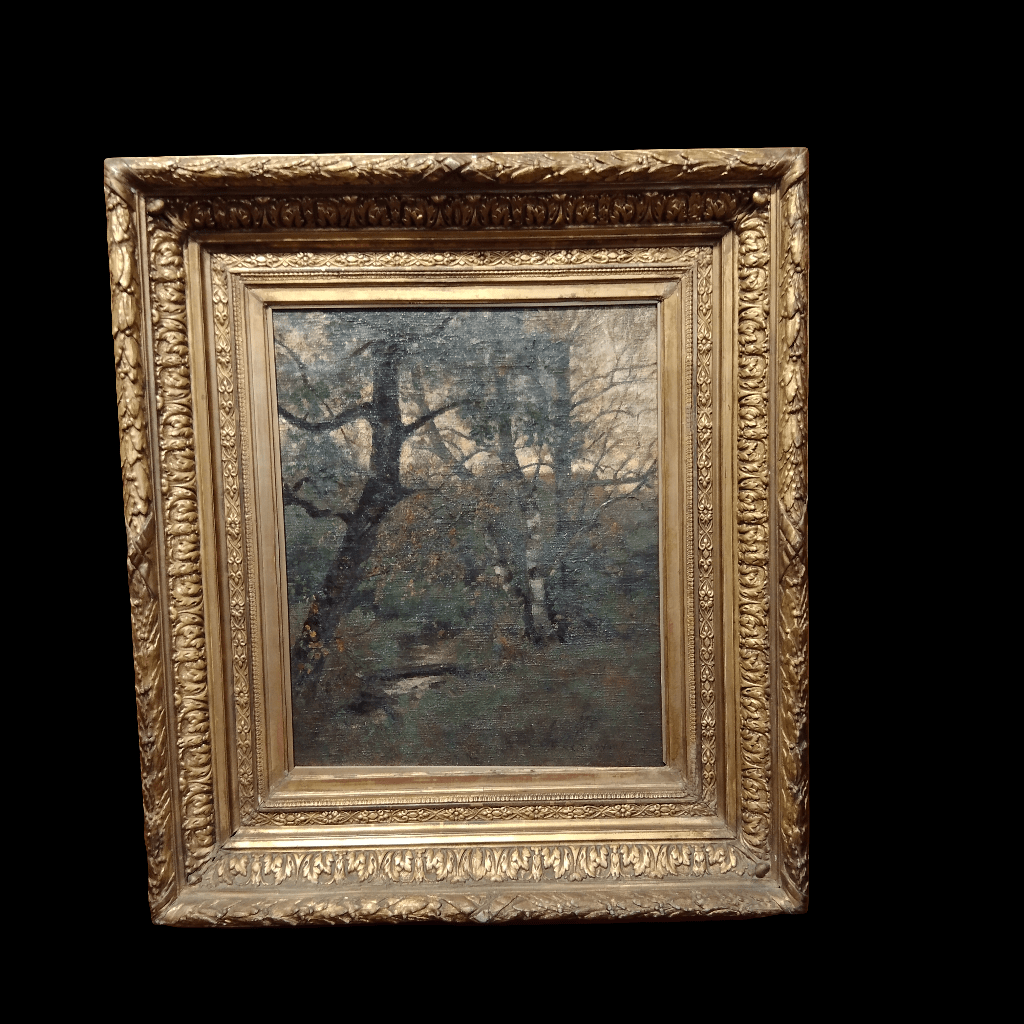 Óleo sobre tela del artista Constante Troyon, perteneciente a la Escuela Francesa s.XIX, retratando un bosque lleno de texturas y con un delicado y muy bien ejecutado trabajo de luz, con colores del atardecer. La obra tiene un espectacular marco de madera tallada antigua, pintada en dorado.