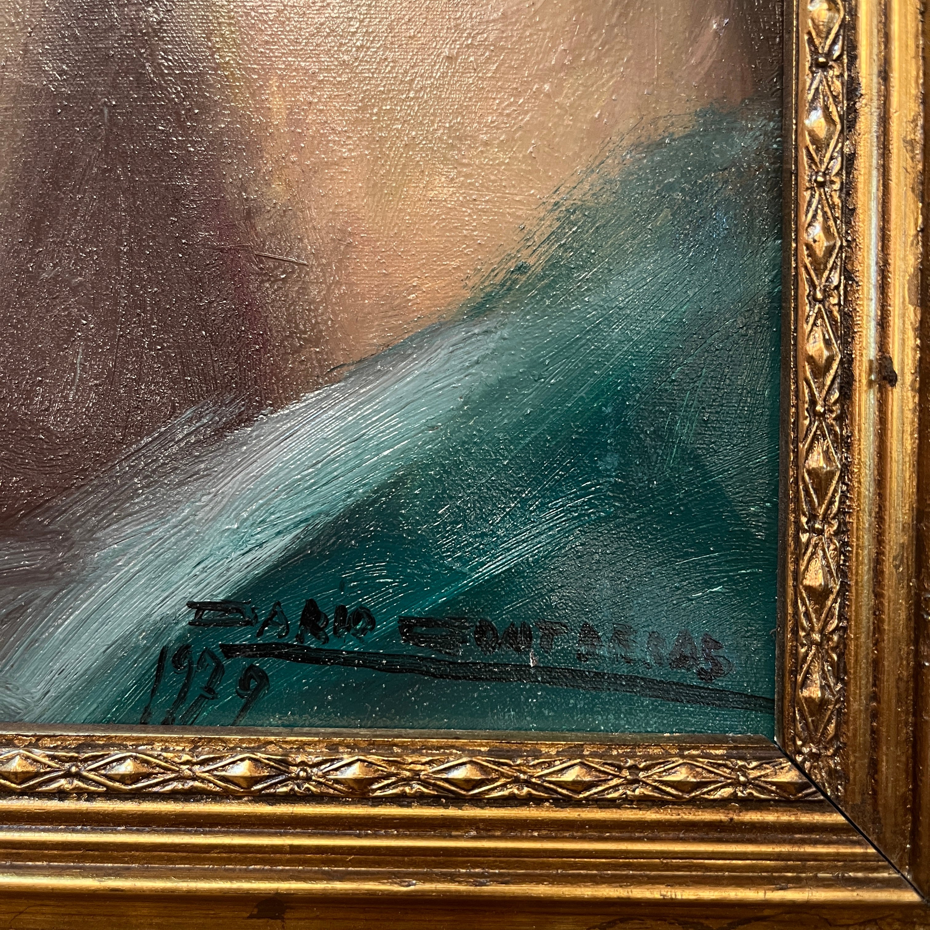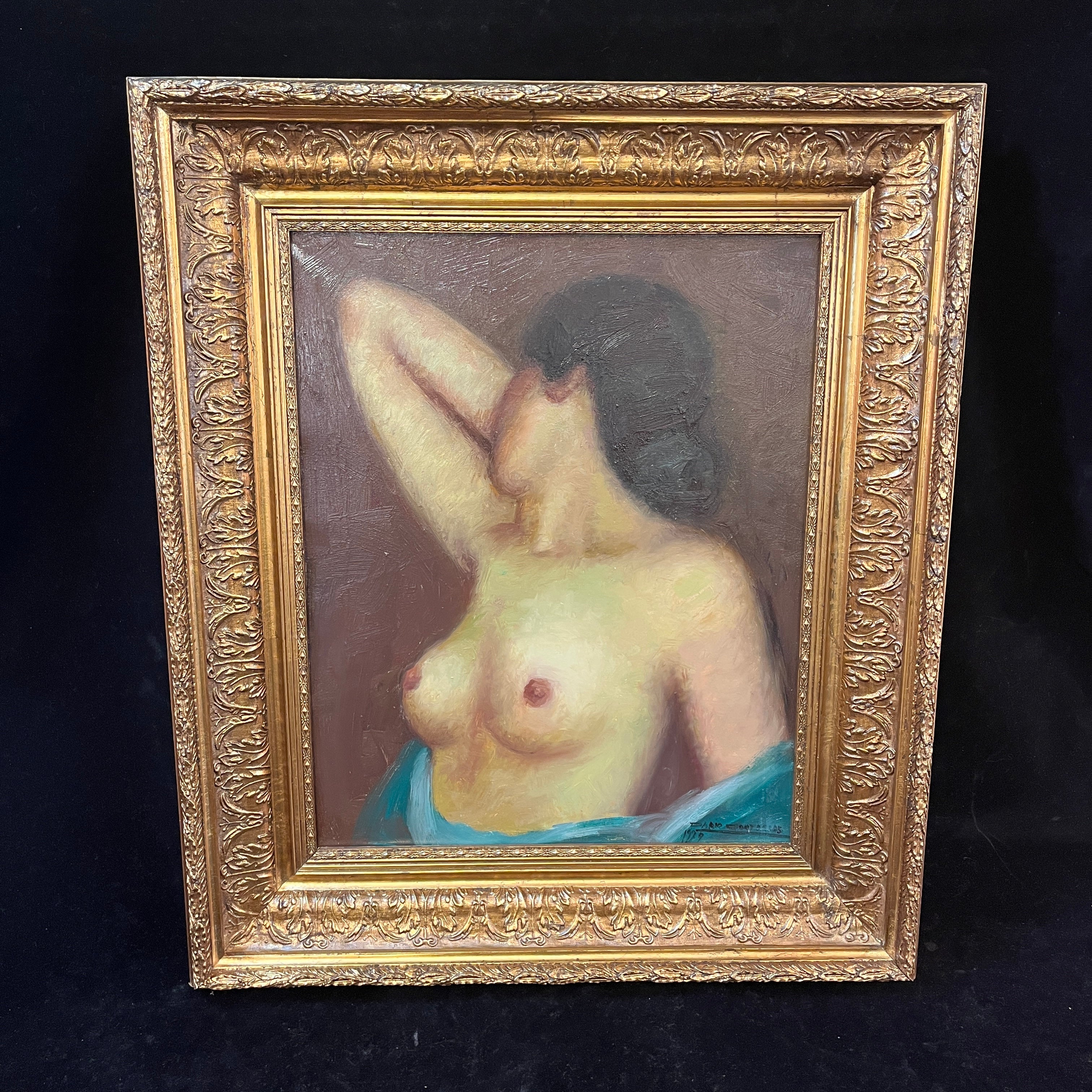 Bello y enigmático trabajo del artista de origen chileno Darío Contreras, representando a una mujer a torso desnudo. La obra cuenta con un marco tallado pintado en dorado y está firmada y fechada por el mismo autor.