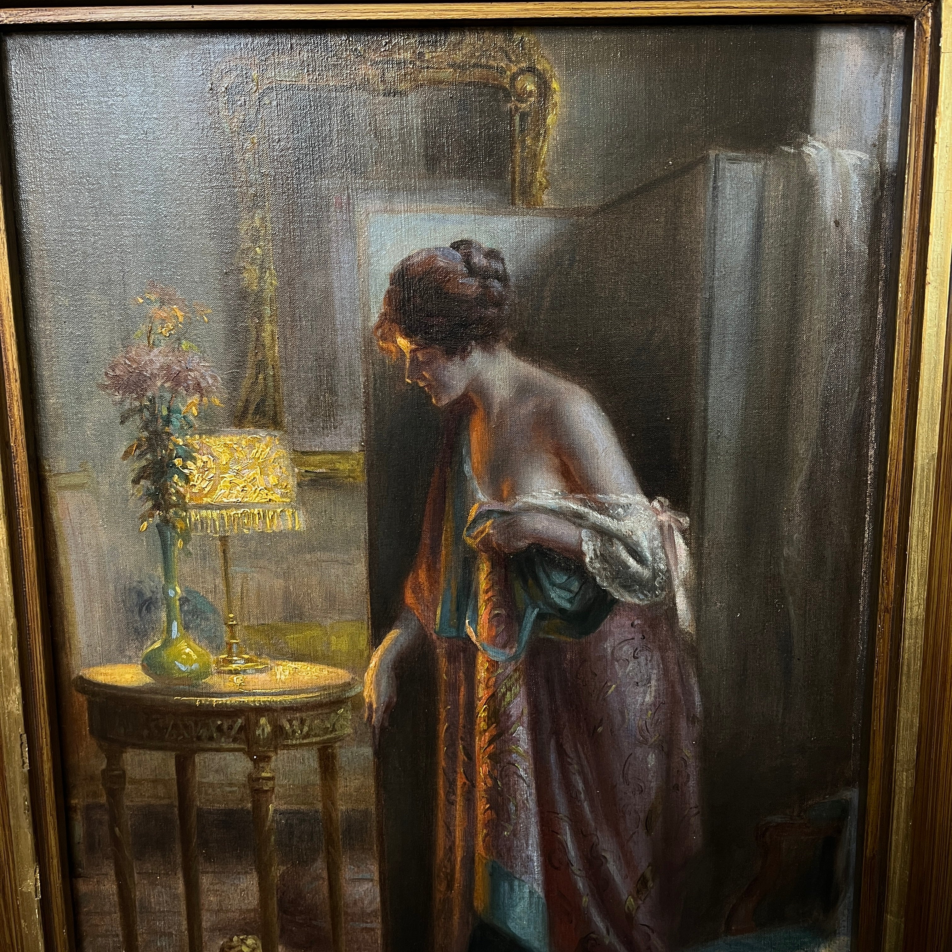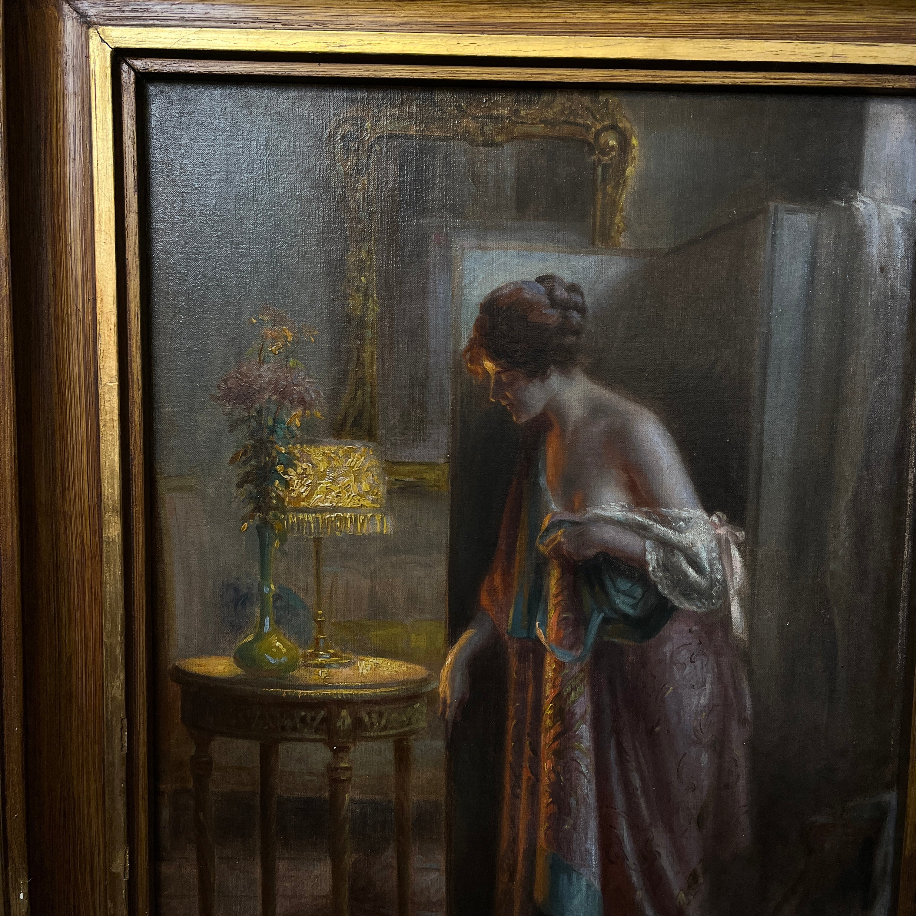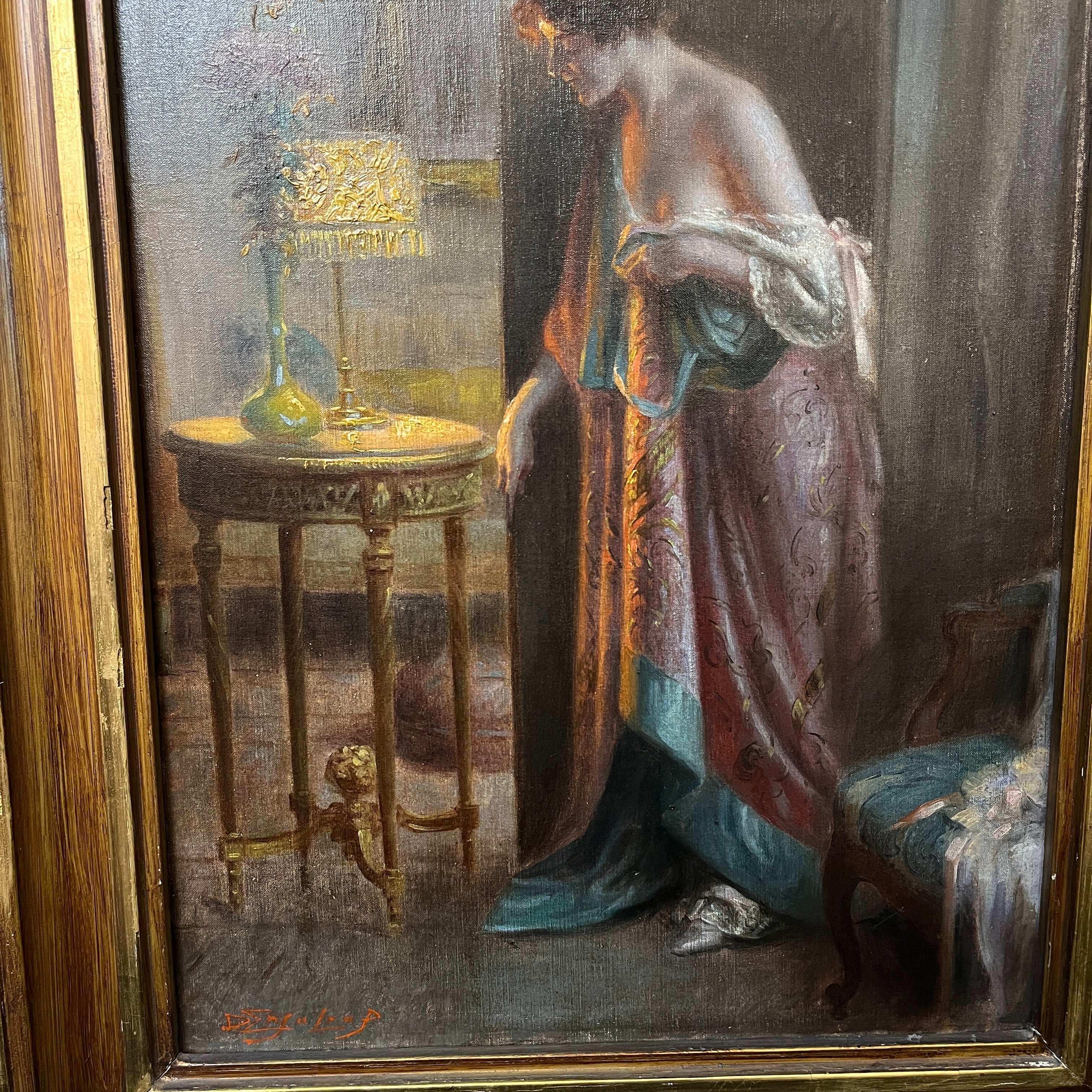 Hermoso óleo sobre tela del reconocido pintor francés Delphin Enjolras, maestro en capturar la luz y la atmósfera en escenas de interior. La obra retrata a una mujer que, con delicadeza, se acerca a una mesita de noche para encender o apagar una lámpara, en lo que parece ser un momento íntimo al levantarse de la cama. La cálida iluminación de la lámpara baña suavemente la escena, generando un juego sutil de luces y sombras que transmite serenidad, calidez y una profunda sensación de intimidad.